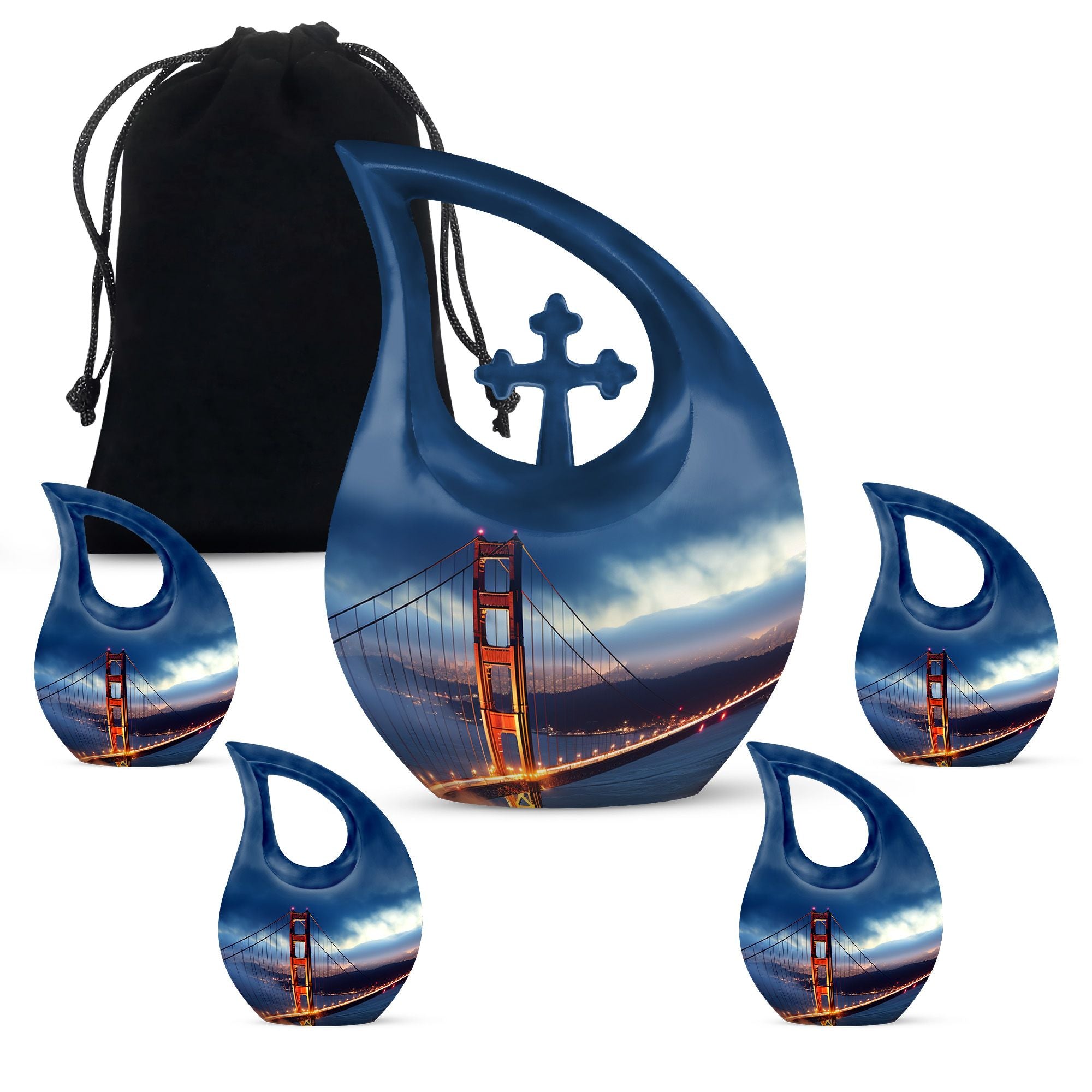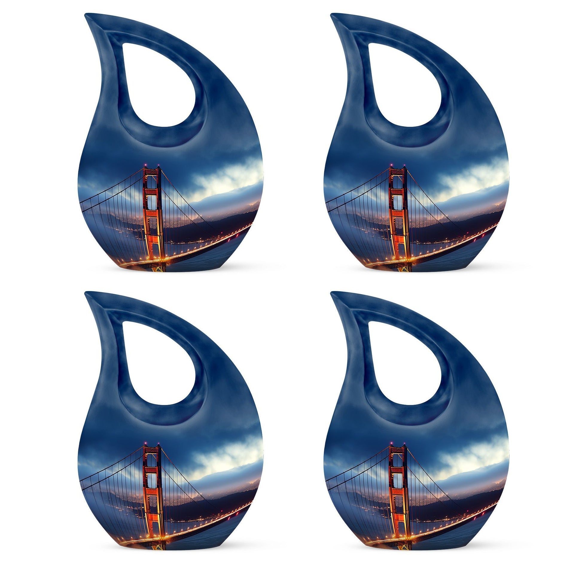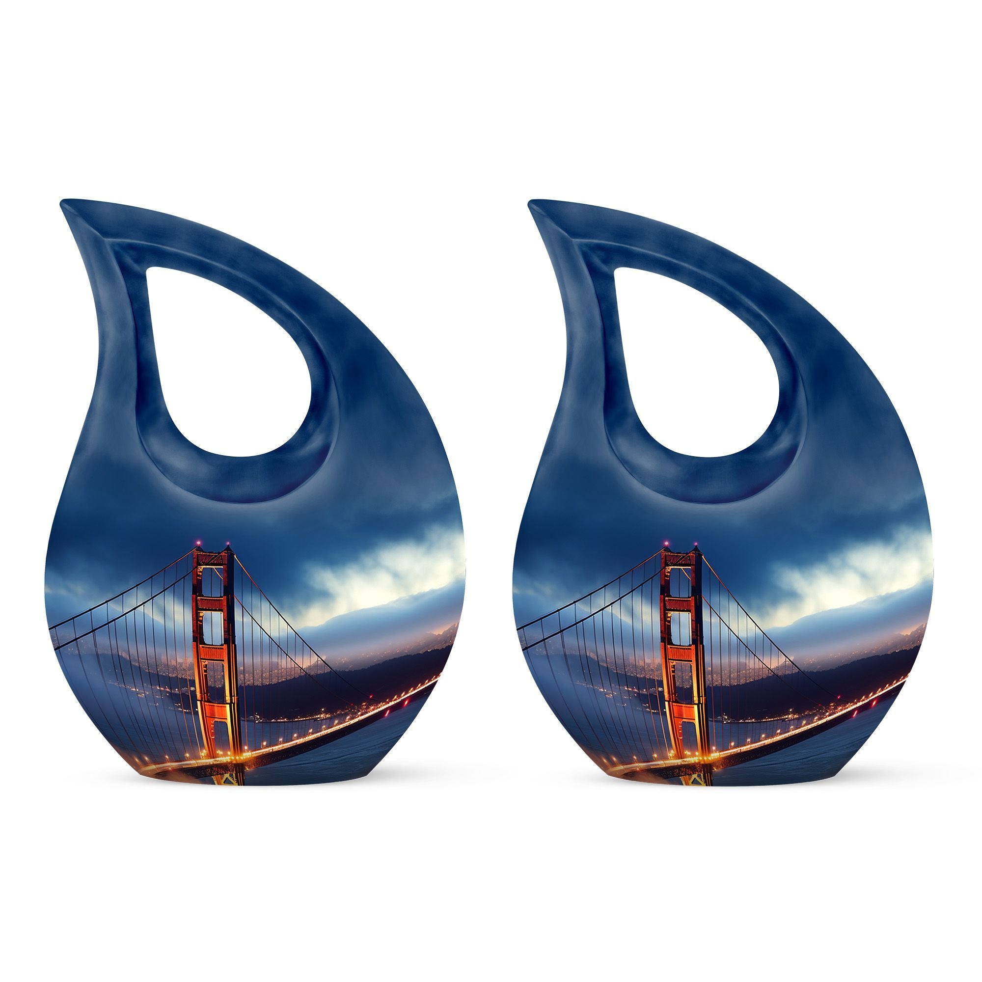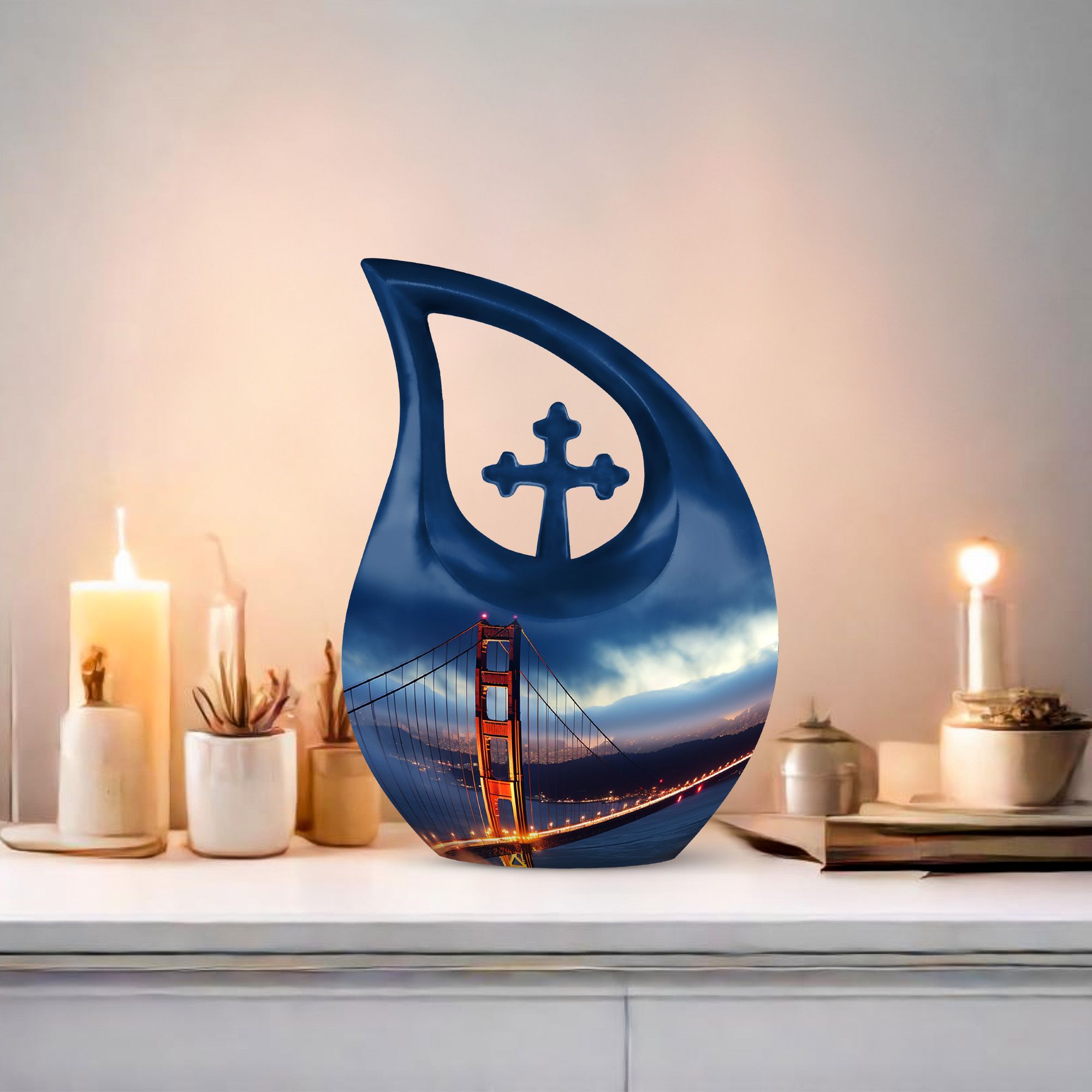Experience the sacred connection between love and lasting memories with our Golden Gate Bridge Urn. This 10-inch sized personalized urn, crafted exquisitely with aluminium, has an impressive capacity of holding up to 200 cubic inches of ashes. This unique product, which weighs around 3.3 pounds, exhibits a 'Cross Drop' motif, a theme carefully chosen to resonate with the iconic Golden Gate Bridge. The customization feature allows you to personalize these large urns with engraved names, infusing a touch of intense emotion, making them also an ideal pick for personalized urns for human ashes or pet urns for ashes. Each meticulously crafted urn also comes with a velvet pouch, providing a safe and elegant containment for the precious remains. When you're considering memorial urns, let this distinguished product embody your cherished memories. Uncommonly original and dignified, our tailor-made urns have been carefully designed to serve as a worthy tribute for your loved ones.