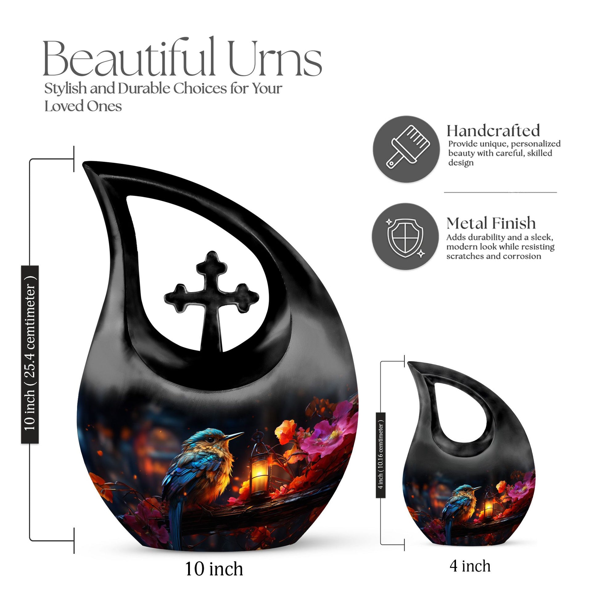 Crafted from durable aluminium, this 10 inch urn blends elegance with strength. The serene lantern artwork and delicate bird imagery symbolize guidance, peace, and eternal presence—making it ideal for families seeking large urn human ashes, a thoughtful large decorative urn for human ashes, or classic cremation urns for women. The secure screw-top lid protects ashes safely, while its gentle colors and lantern glow theme make it equally fitting for memorial spaces honoring men, pairing naturally with cremation urns for men, adult urns for human ashes men, or funeral urns for adult ashes men. It also coordinates beautifully with urn for ashes for women small, mini urn for ashes for women, keepsake urns for women, and mini small urns for men.