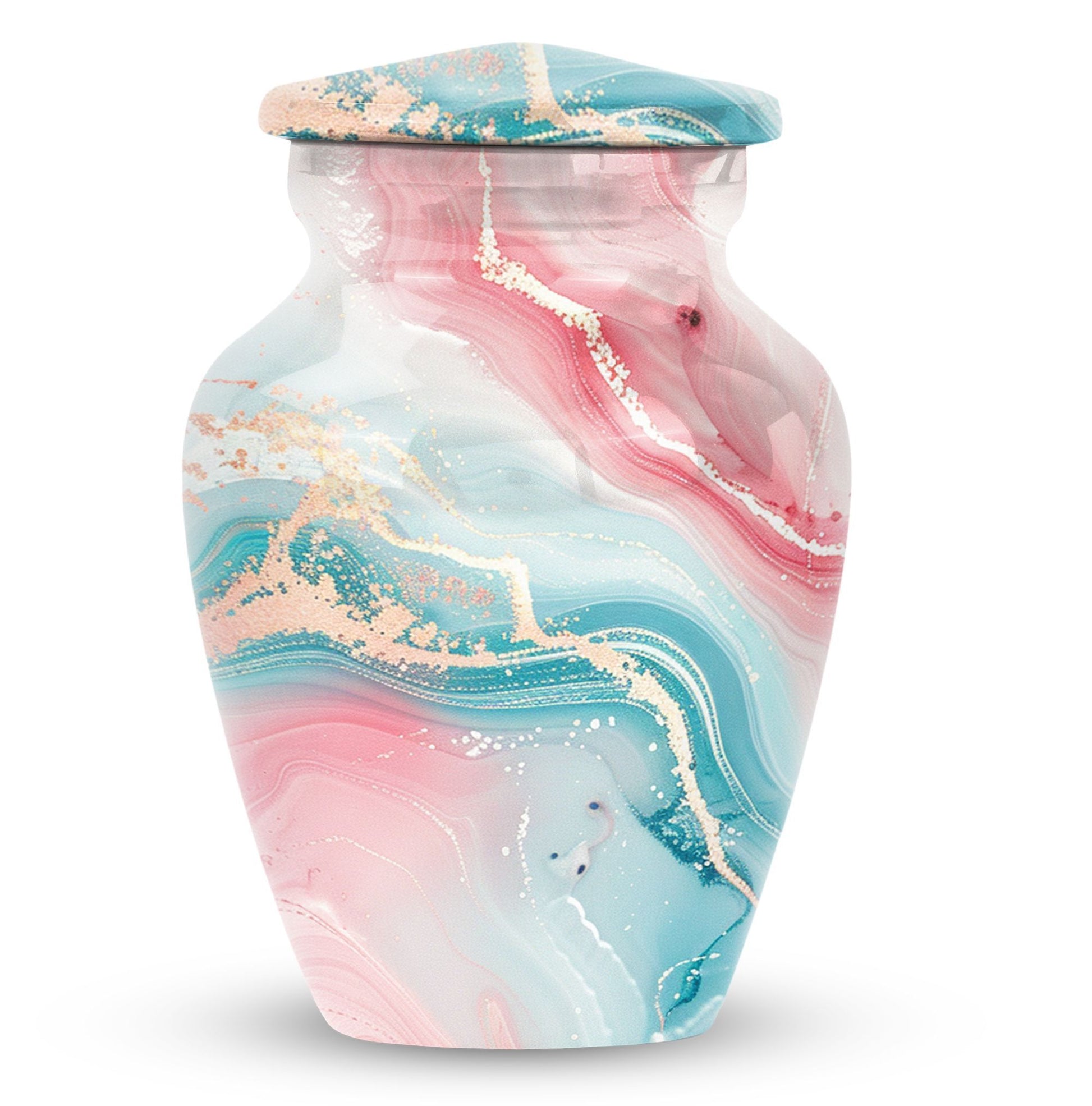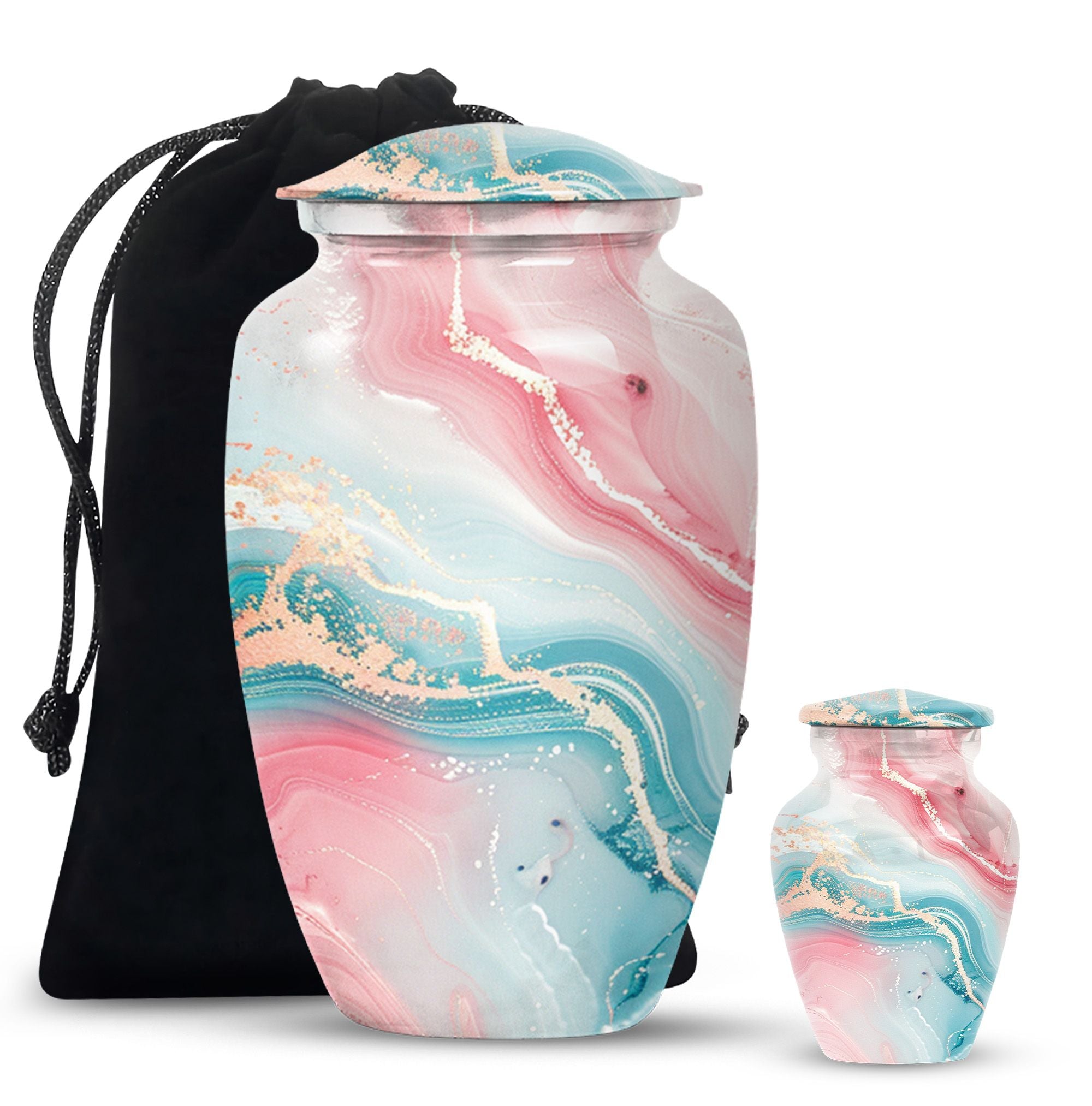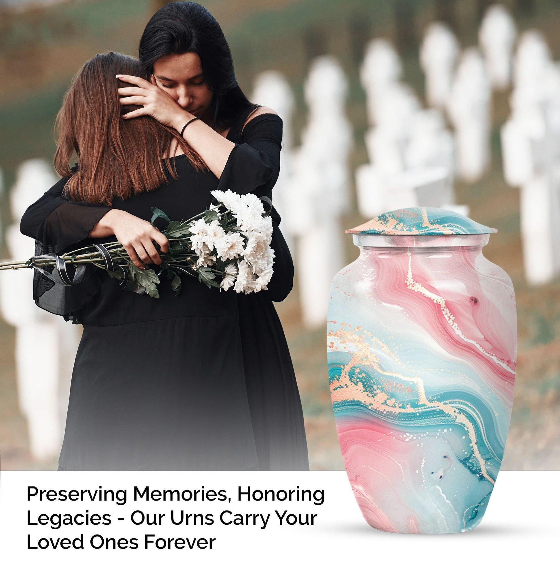 Experience a meaningful and heartfelt connection with our Abstract Urn, which plays a vital role in memorial ceremonies due to its expressive theme and meticulous construction. As a large urn, it comes in 10 inches in height with a weight of 3.3 pounds and a capacity of 200 cubic inches, adequate for an adult man's ashes. It's made from high-quality and sturdy aluminium material enhancing its durability for longer safekeeping of your loved one's ashes. Our cremation urn offers personalization; you can engrave names on it adding a personal touch. The urn comes with a luxurious velvet pouch for containment and respectful preservation of ashes. The captivating abstraction of this urn allows for nuanced reflection on life's transience. Incorporating terms such as 'urns for cremation ashes', 'funeral urns for human ashes adult man', and 'metal urns for adult human ashes', our urn stands as an emblem of innovative and modern urns for human ashes. Please note that this product does not include design customization.