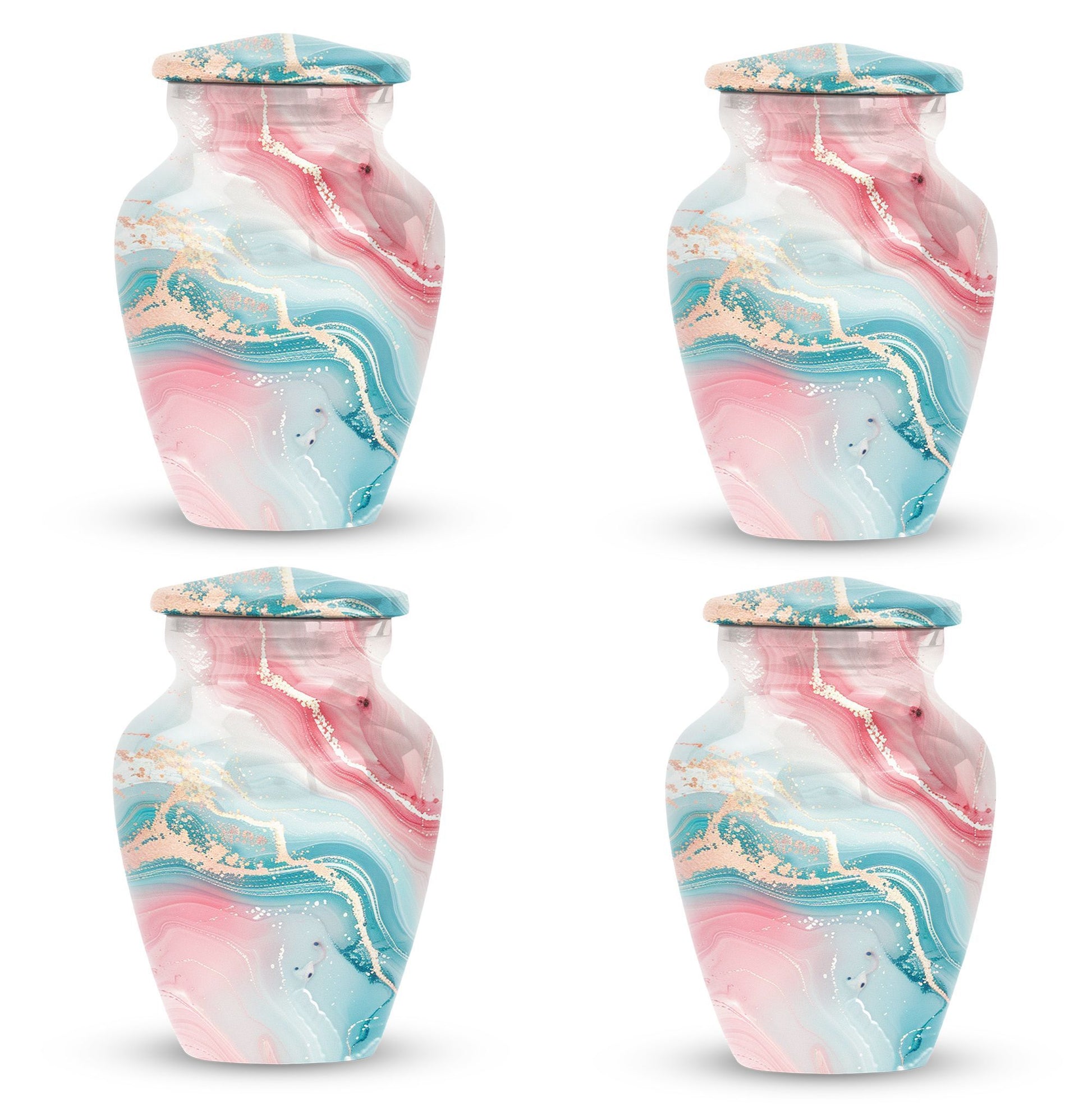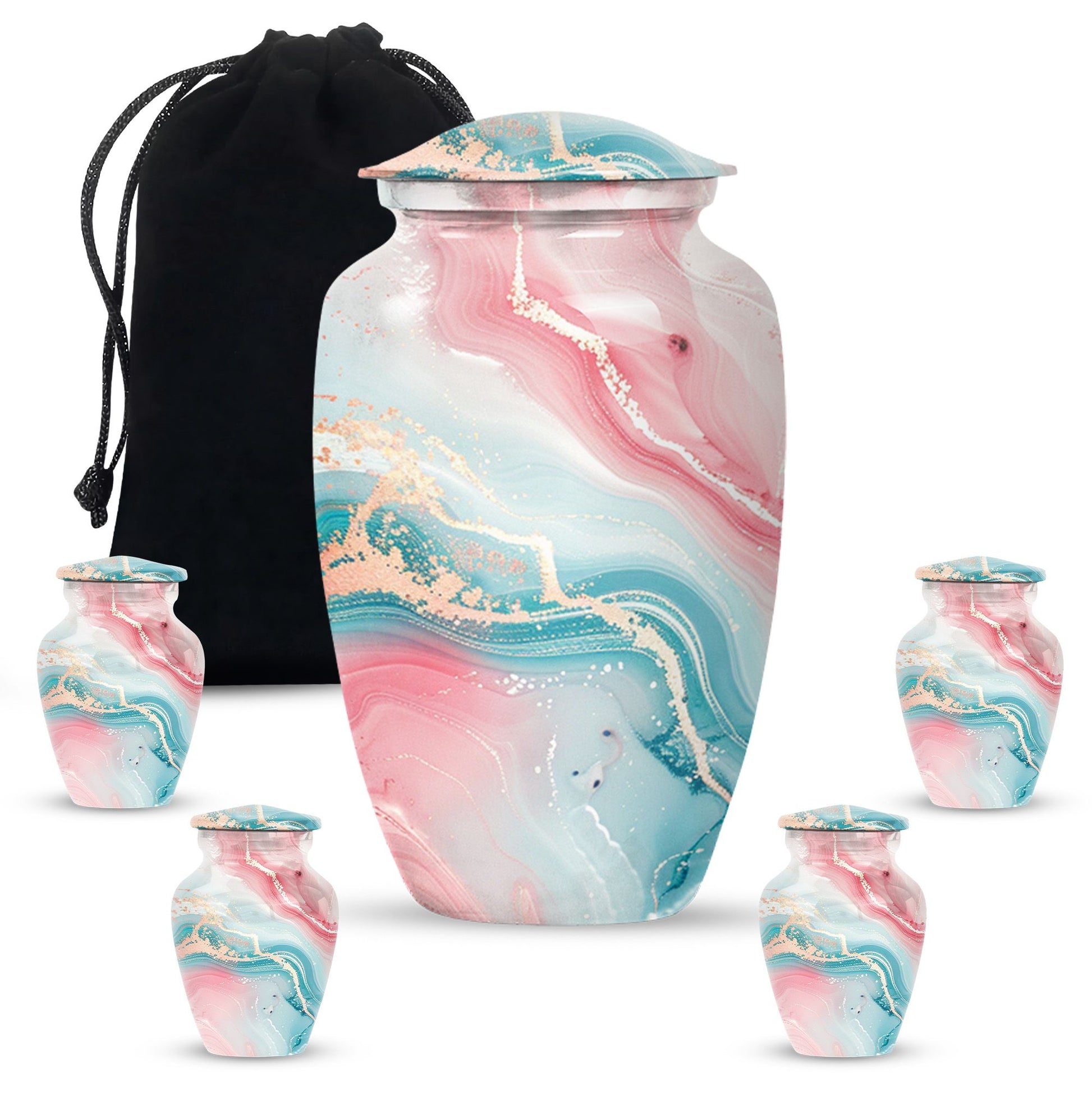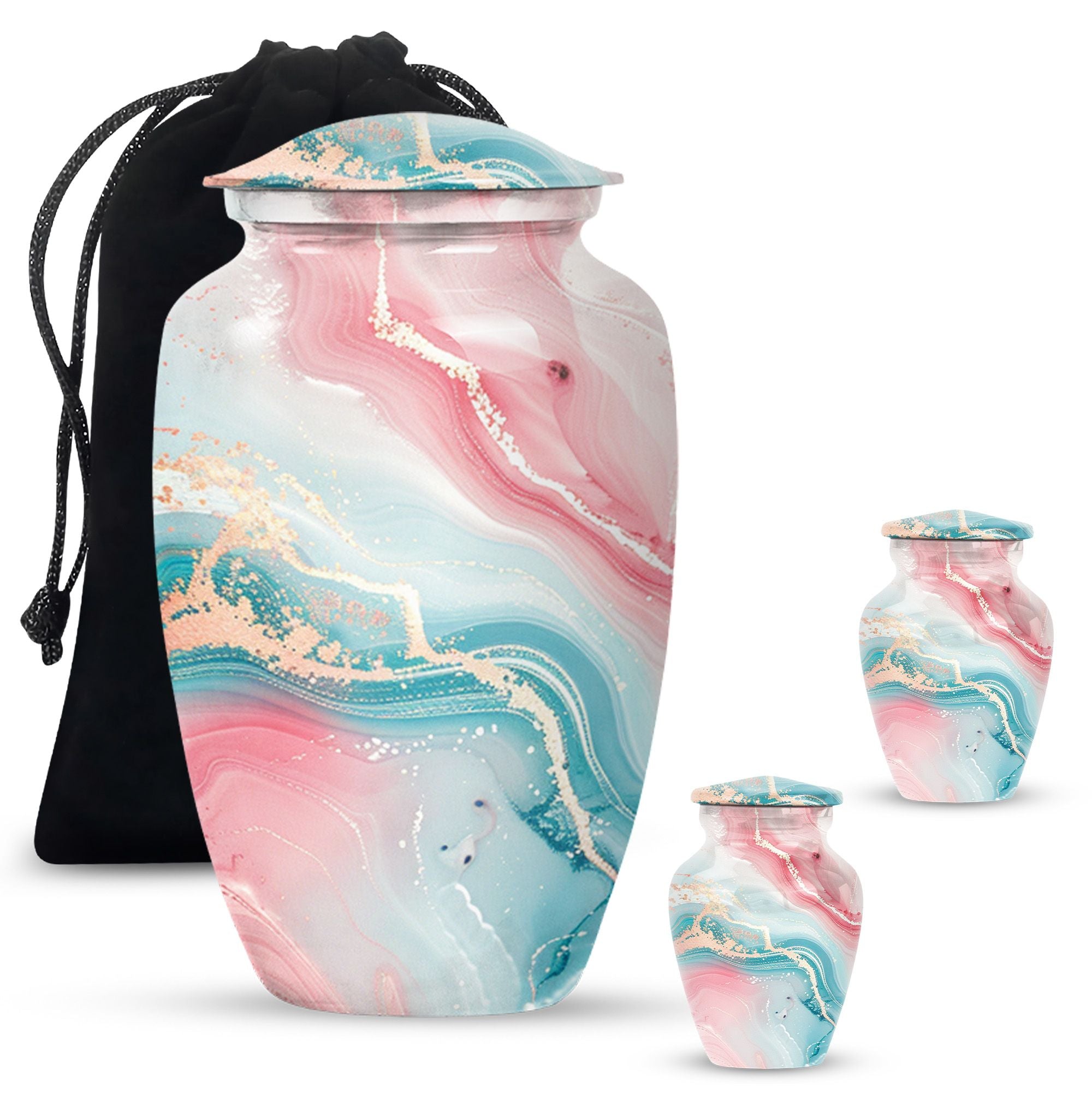Experience a meaningful and heartfelt connection with our Abstract Urn, which plays a vital role in memorial ceremonies due to its expressive theme and meticulous construction. As a large urn, it comes in 10 inches in height with a weight of 3.3 pounds and a capacity of 200 cubic inches, adequate for an adult man's ashes. It's made from high-quality and sturdy aluminium material enhancing its durability for longer safekeeping of your loved one's ashes. Our cremation urn offers personalization; you can engrave names on it adding a personal touch. The urn comes with a luxurious velvet pouch for containment and respectful preservation of ashes. The captivating abstraction of this urn allows for nuanced reflection on life's transience. Incorporating terms such as 'urns for cremation ashes', 'funeral urns for human ashes adult man', and 'metal urns for adult human ashes', our urn stands as an emblem of innovative and modern urns for human ashes. Please note that this product does not include design customization.