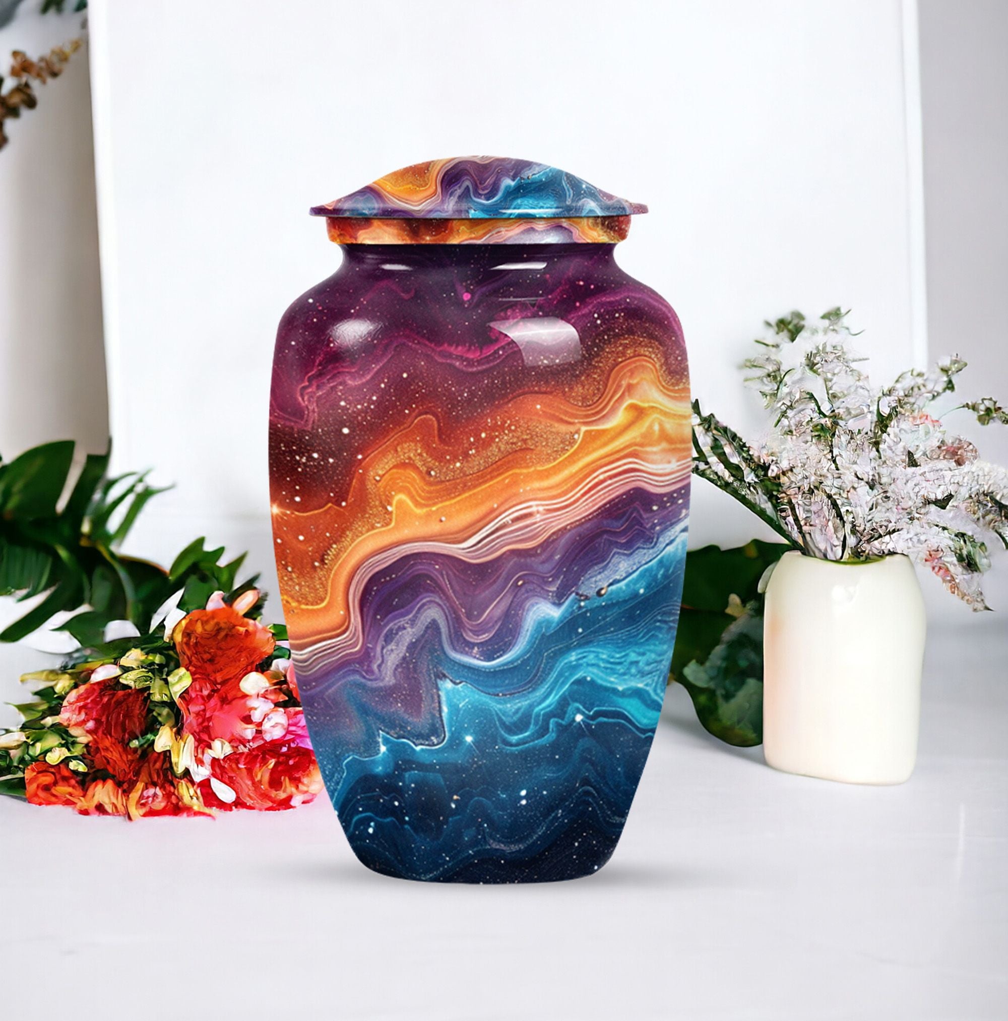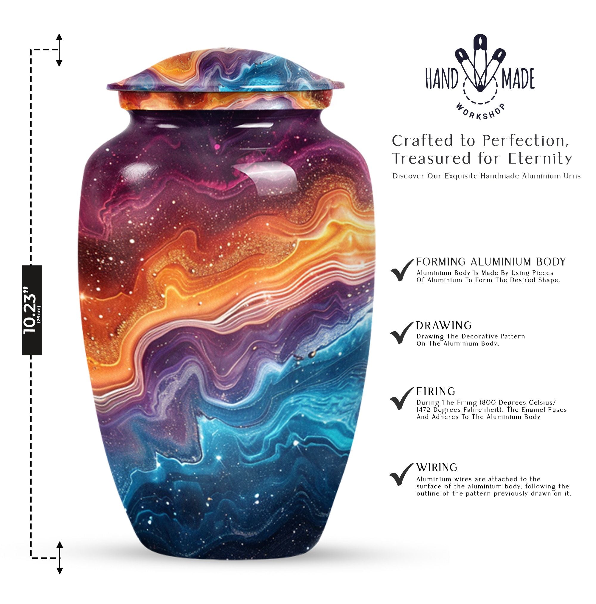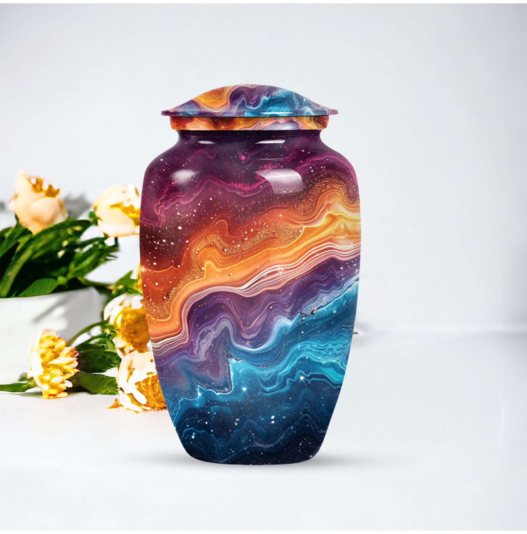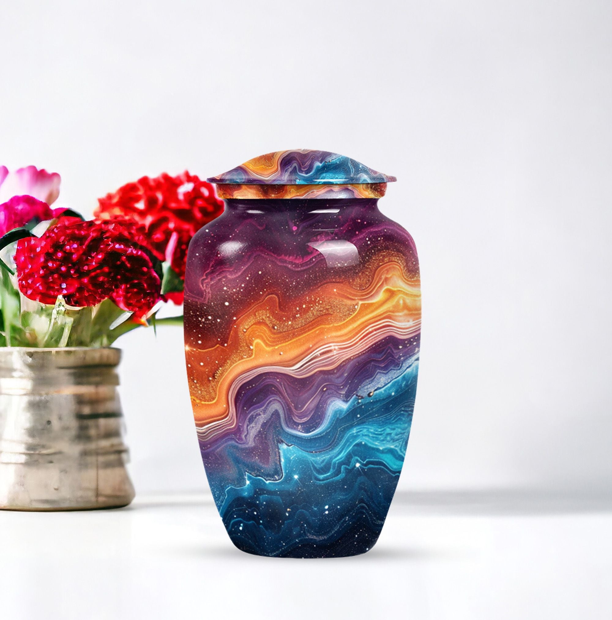 This Abstract Urn is not just an urn for cremation ashes, but a beautiful piece of art that reflects the individual's unique personality. With its 10-inch size offering a 200 cubic inch capacity, it can easily serve as a burial urn for cremation ashes or a memorial urn that can stand as a significant decorative element. The Classic Urn adds finesse to its abstract theme while staying durable with its primary material—Aluminium. It notably weighs 3.3 pounds and has a dimension of 10 inches in height. Along with the urn, you receive a velvet pouch specifically designed for the containment of ashes. This large urn carries features offering personalization, allowing you to engrave names onto the enchanting surface. A multipurpose urn with space for a photo frame makes it truly one-of-a-kind and a fitting tribute for those cherished. Its abstract yet timeless design stands as a poignant reminder of the rich tapestry of life.