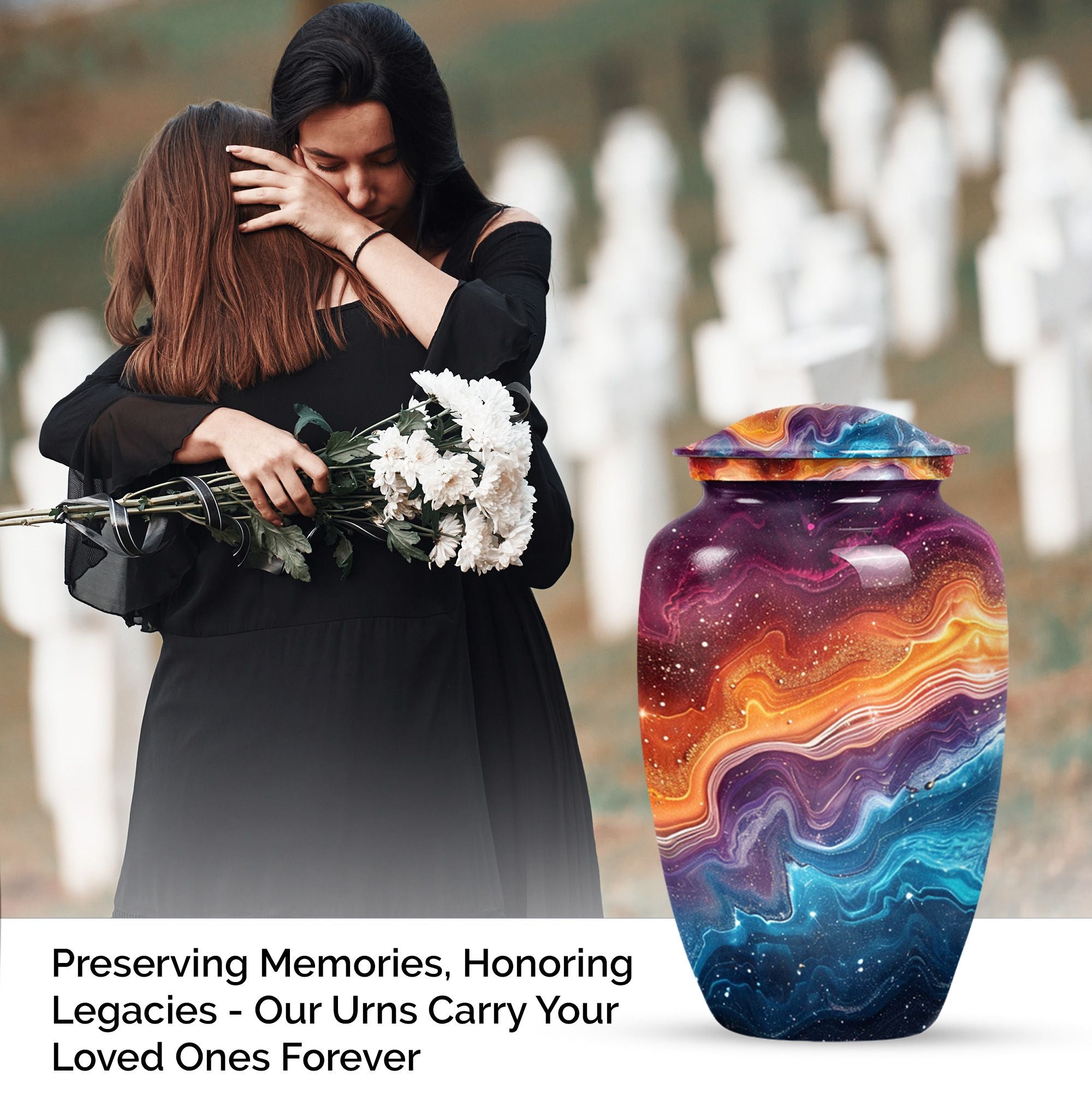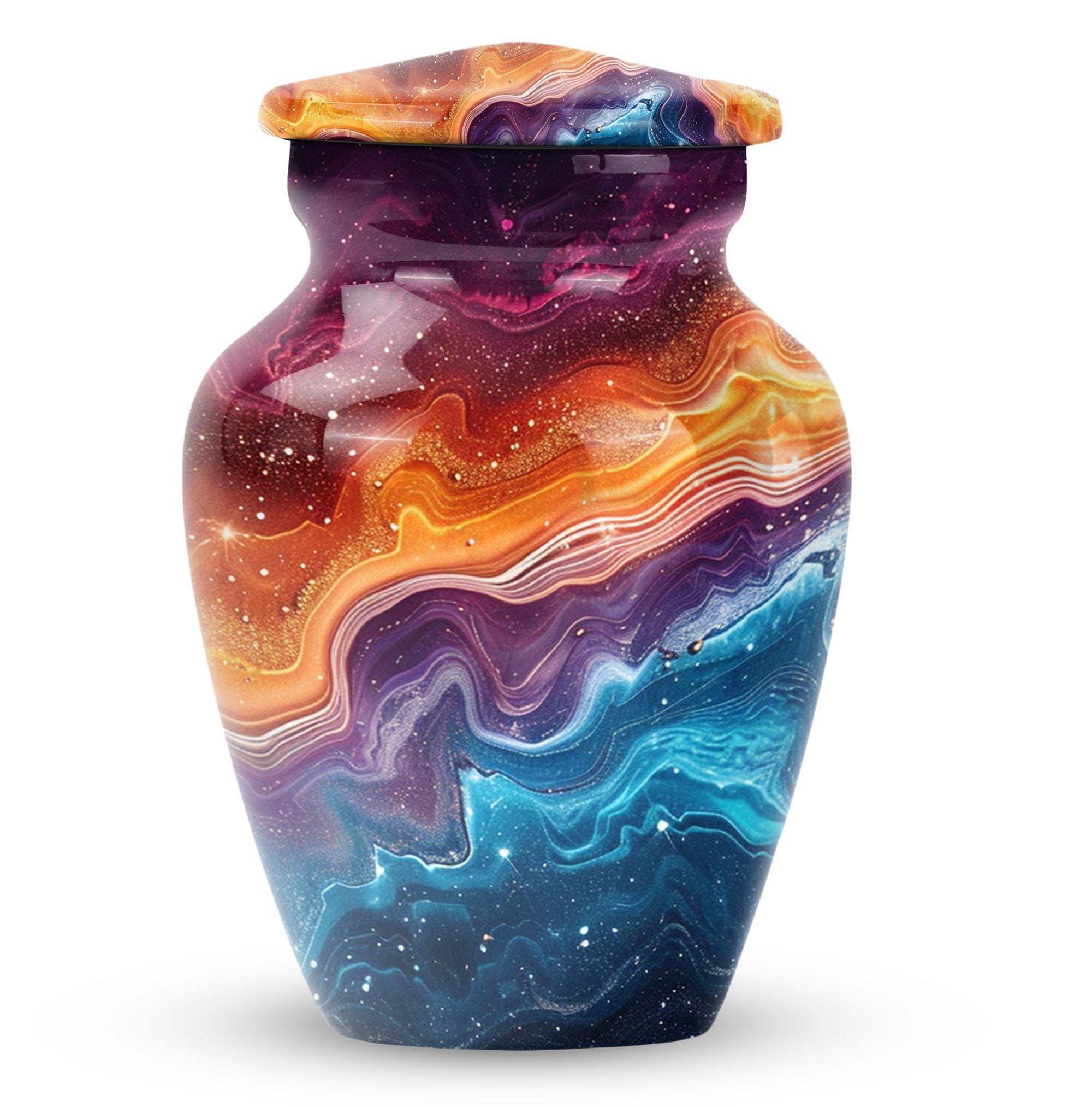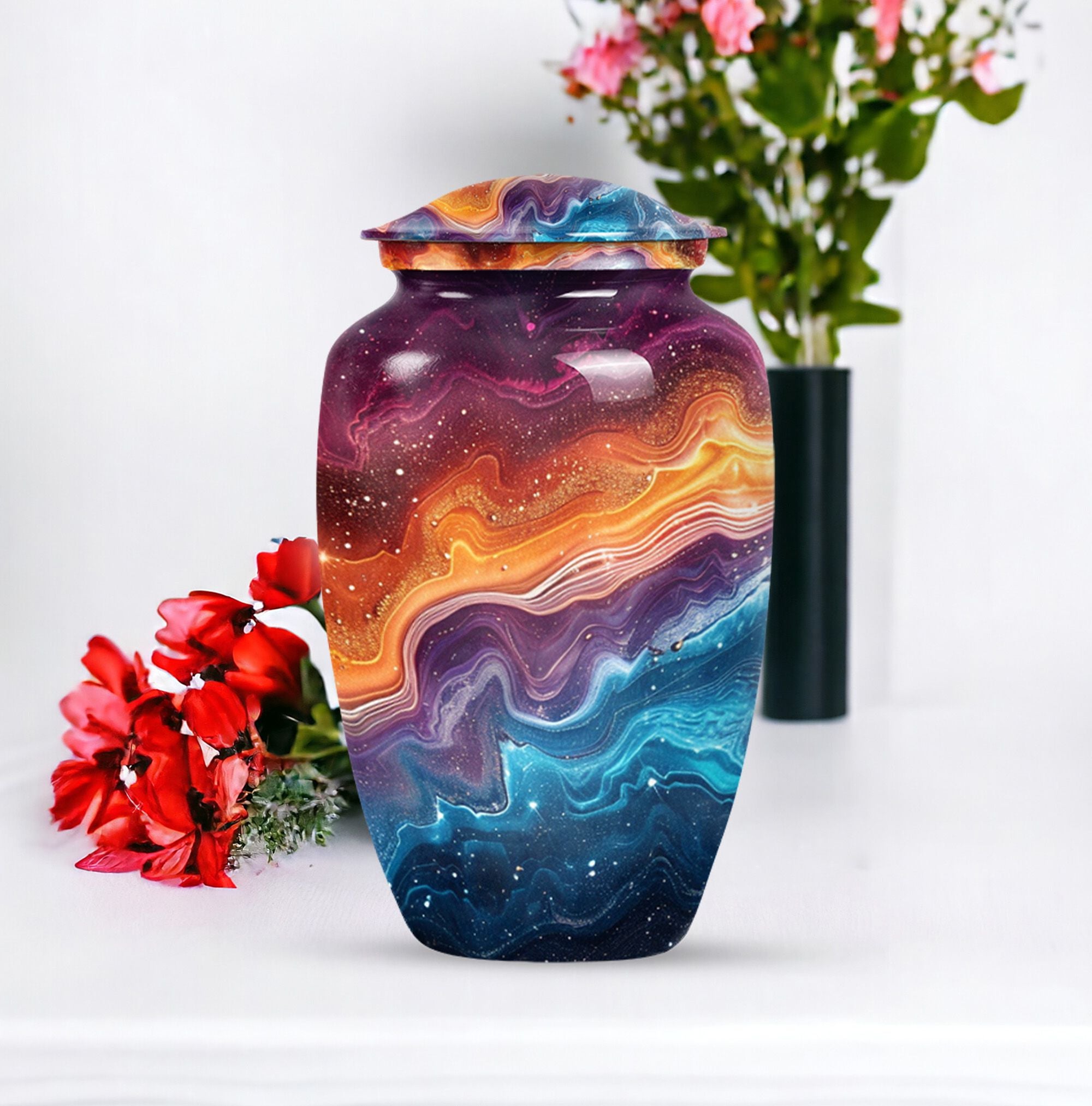 This Abstract Urn is not just an urn for cremation ashes, but a beautiful piece of art that reflects the individual's unique personality. With its 10-inch size offering a 200 cubic inch capacity, it can easily serve as a burial urn for cremation ashes or a memorial urn that can stand as a significant decorative element. The Classic Urn adds finesse to its abstract theme while staying durable with its primary material—Aluminium. It notably weighs 3.3 pounds and has a dimension of 10 inches in height. Along with the urn, you receive a velvet pouch specifically designed for the containment of ashes. This large urn carries features offering personalization, allowing you to engrave names onto the enchanting surface. A multipurpose urn with space for a photo frame makes it truly one-of-a-kind and a fitting tribute for those cherished. Its abstract yet timeless design stands as a poignant reminder of the rich tapestry of life.