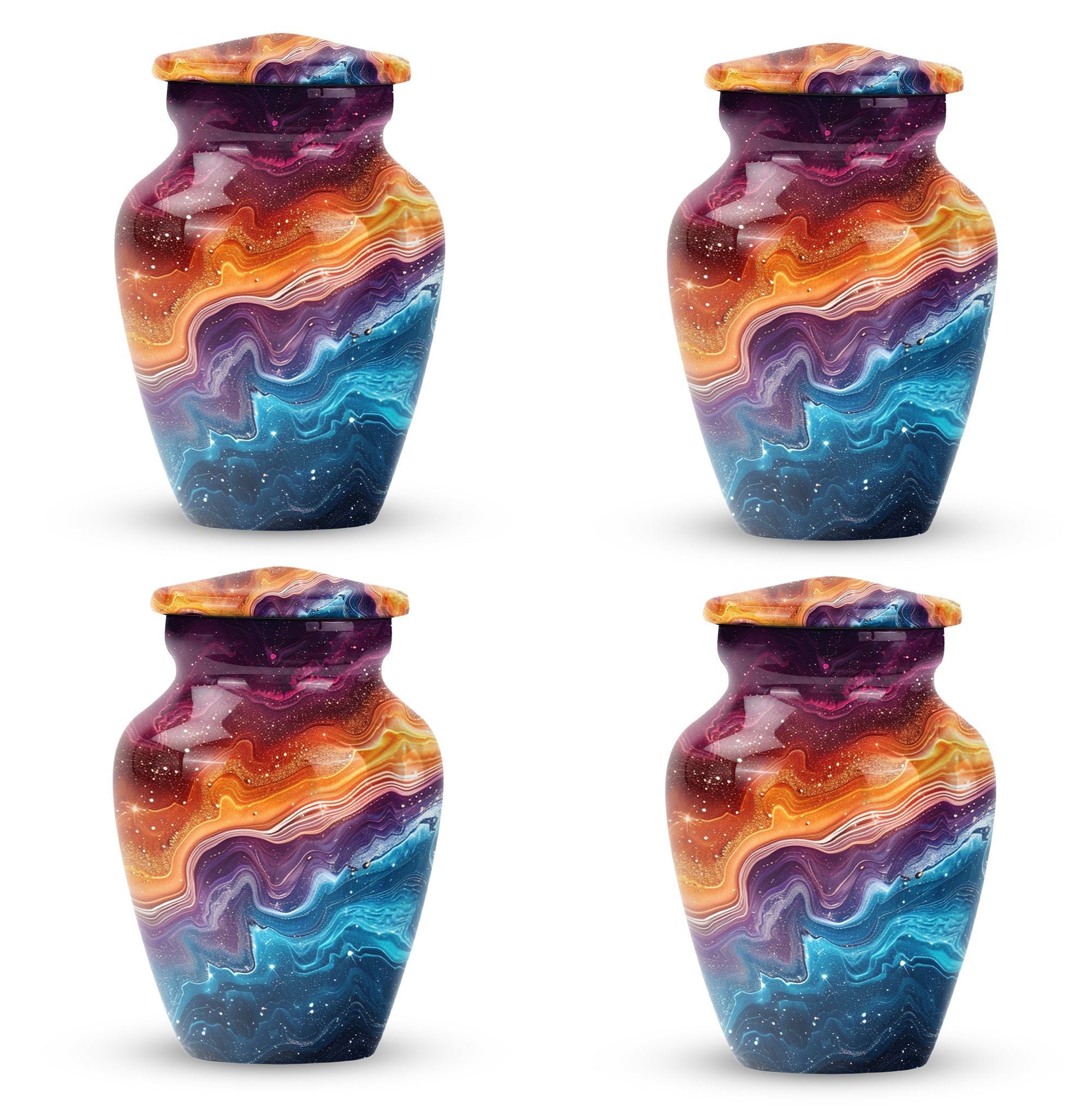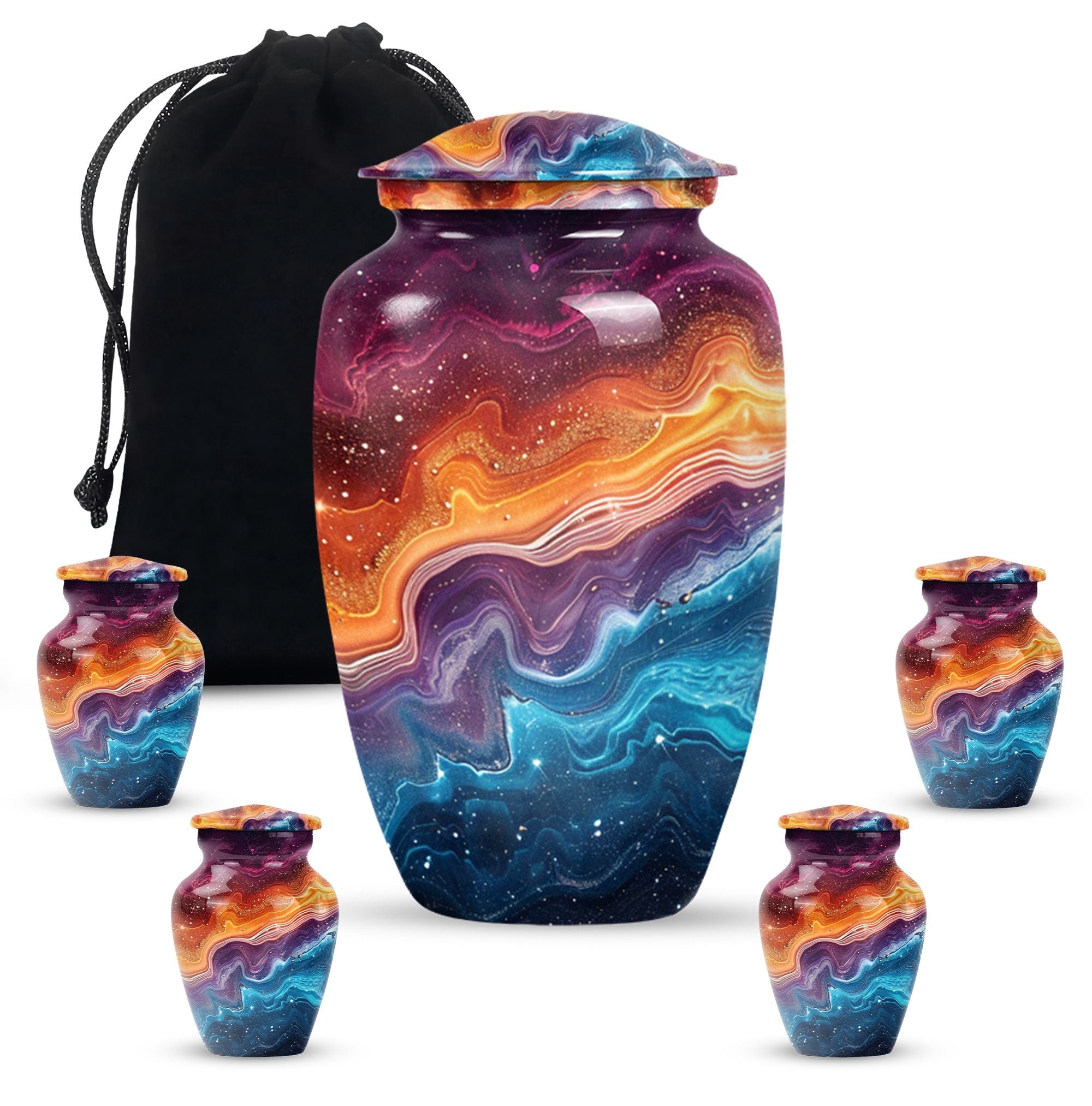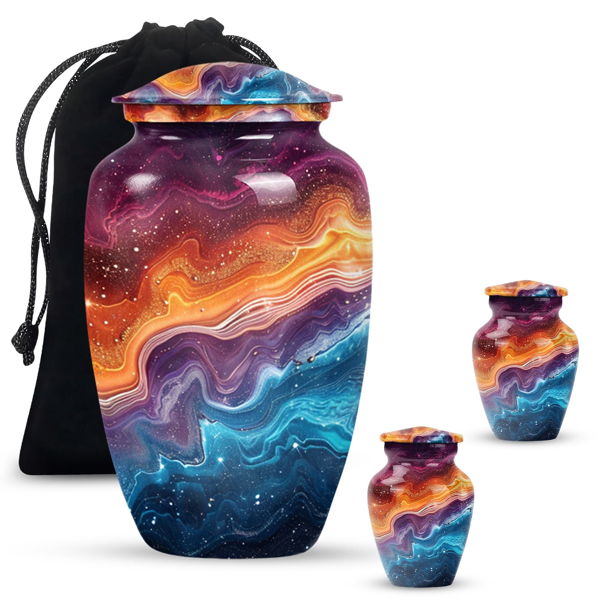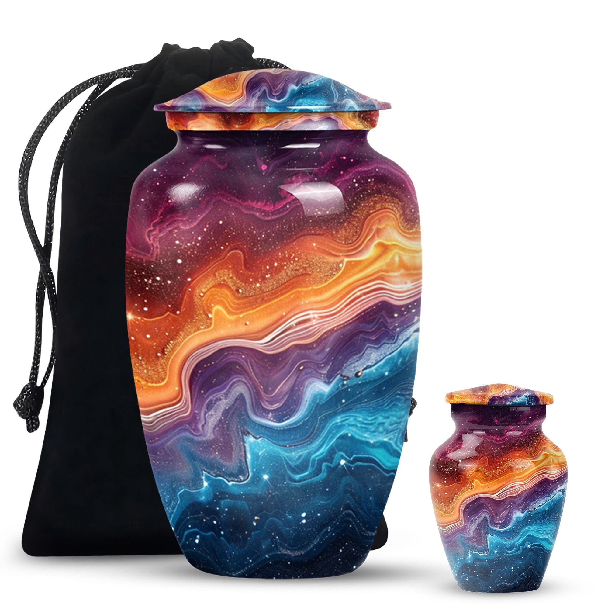 This Abstract Urn is not just an urn for cremation ashes, but a beautiful piece of art that reflects the individual's unique personality. With its 10-inch size offering a 200 cubic inch capacity, it can easily serve as a burial urn for cremation ashes or a memorial urn that can stand as a significant decorative element. The Classic Urn adds finesse to its abstract theme while staying durable with its primary material—Aluminium. It notably weighs 3.3 pounds and has a dimension of 10 inches in height. Along with the urn, you receive a velvet pouch specifically designed for the containment of ashes. This large urn carries features offering personalization, allowing you to engrave names onto the enchanting surface. A multipurpose urn with space for a photo frame makes it truly one-of-a-kind and a fitting tribute for those cherished. Its abstract yet timeless design stands as a poignant reminder of the rich tapestry of life.