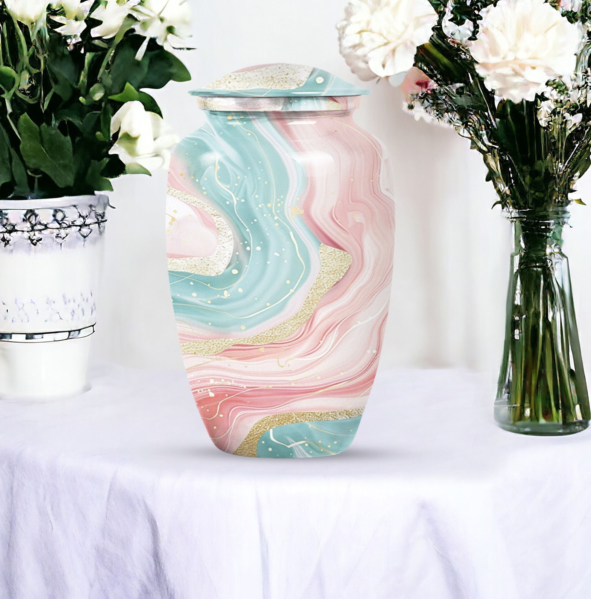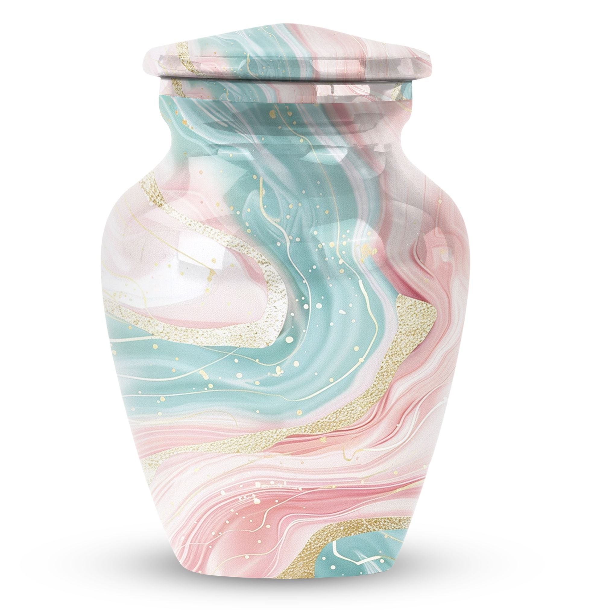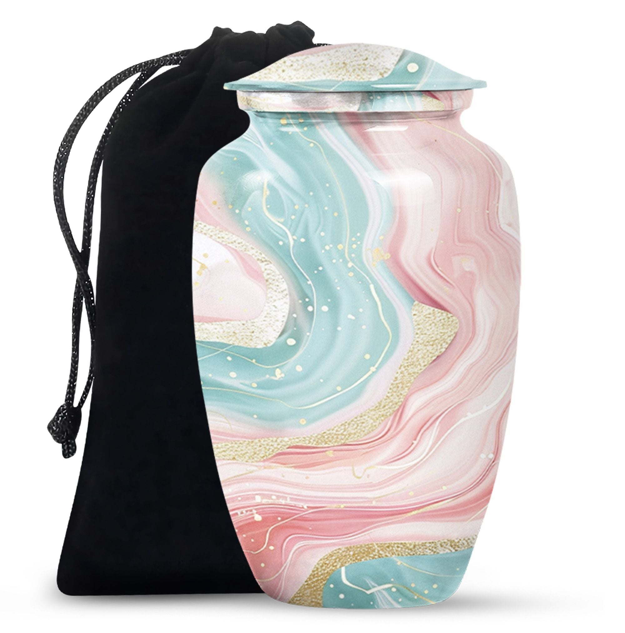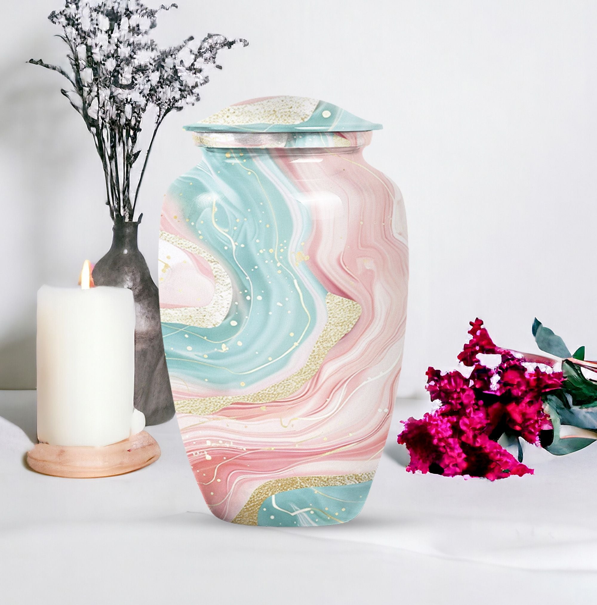 Immerse yourself into the realm of tranquillity with our Abstract Urn, an impeccable selection from our collection of cremation funeral urns. This 10-inch classic urn effortlessly marries aesthetic pleasure with functionality. Crafted from robust and quality aluminium, this large urn has a weight of just 3.3 pounds. Despite its lightweight which enhances its portability, it has an astounding capacity of 200 cubic inches. With this, it perfectly houses your loved ones' ashes, subtly honouring their memory. This cremation urn comes with a velvet pouch for containment and gentle hand-carry of the ashes. For a more personalized approach and remembrance, avail our customization feature to engrave names. It's refreshing abstract theme sets it apart. Note: Abstract Urn excluded from keywords 'Funeral decorative urns' and 'urns for ashes', those are just suggestions for search optimization.
