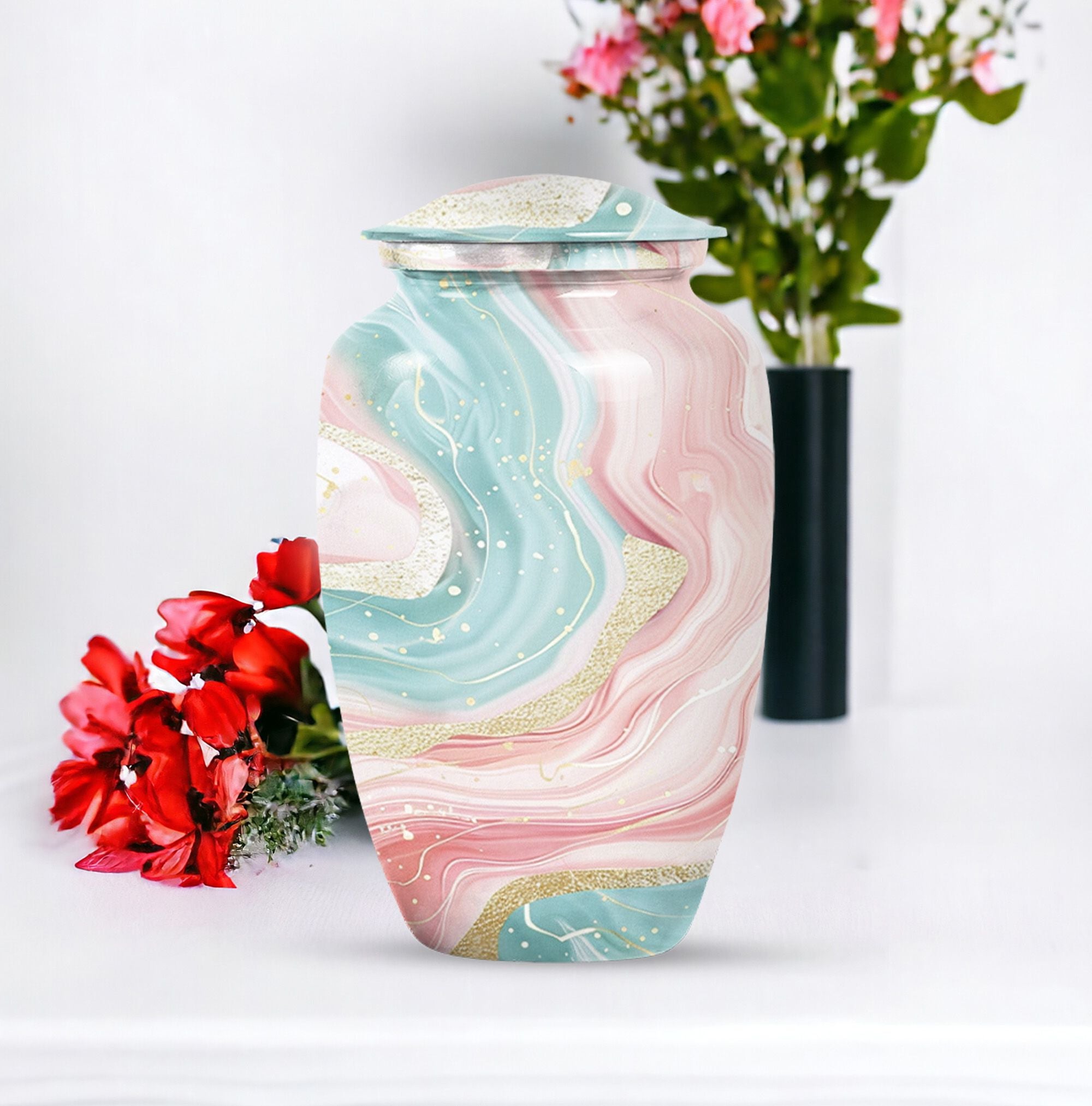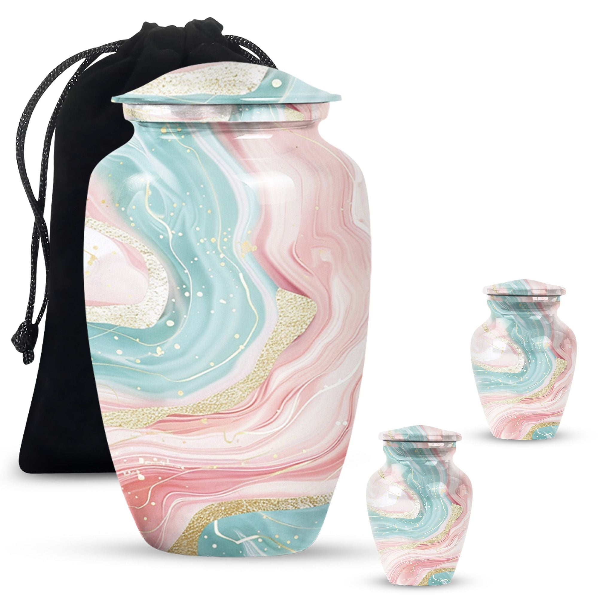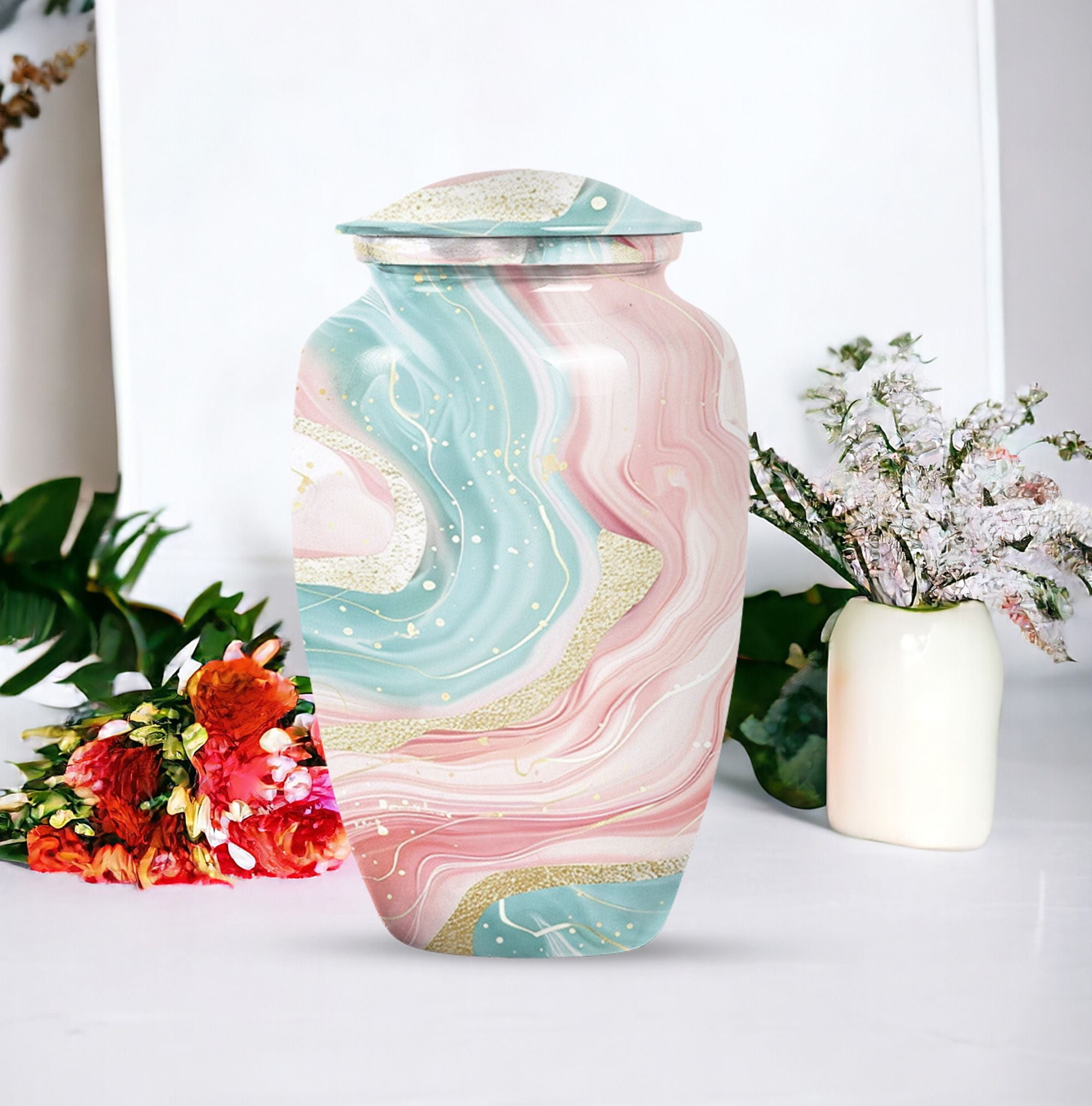 Immerse yourself into the realm of tranquillity with our Abstract Urn, an impeccable selection from our collection of cremation funeral urns. This 10-inch classic urn effortlessly marries aesthetic pleasure with functionality. Crafted from robust and quality aluminium, this large urn has a weight of just 3.3 pounds. Despite its lightweight which enhances its portability, it has an astounding capacity of 200 cubic inches. With this, it perfectly houses your loved ones' ashes, subtly honouring their memory. This cremation urn comes with a velvet pouch for containment and gentle hand-carry of the ashes. For a more personalized approach and remembrance, avail our customization feature to engrave names. It's refreshing abstract theme sets it apart. Note: Abstract Urn excluded from keywords 'Funeral decorative urns' and 'urns for ashes', those are just suggestions for search optimization.