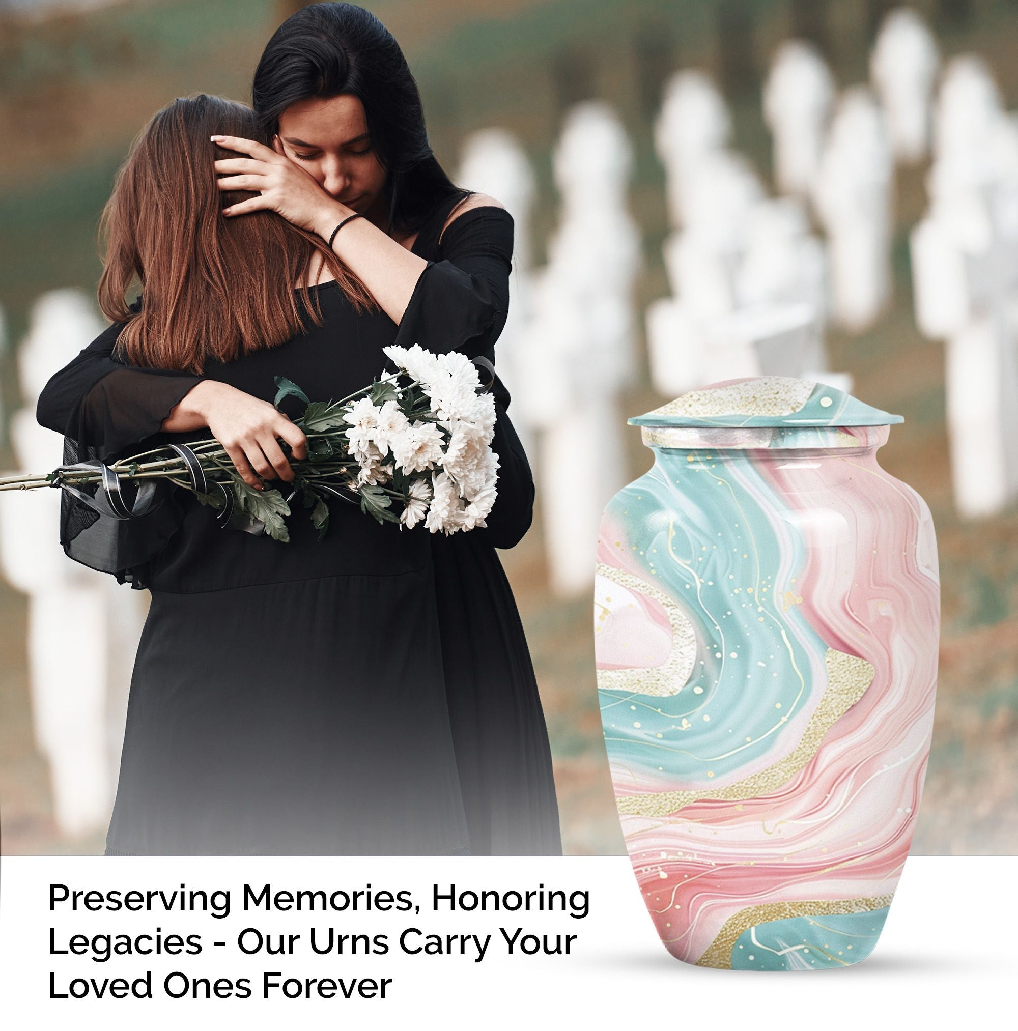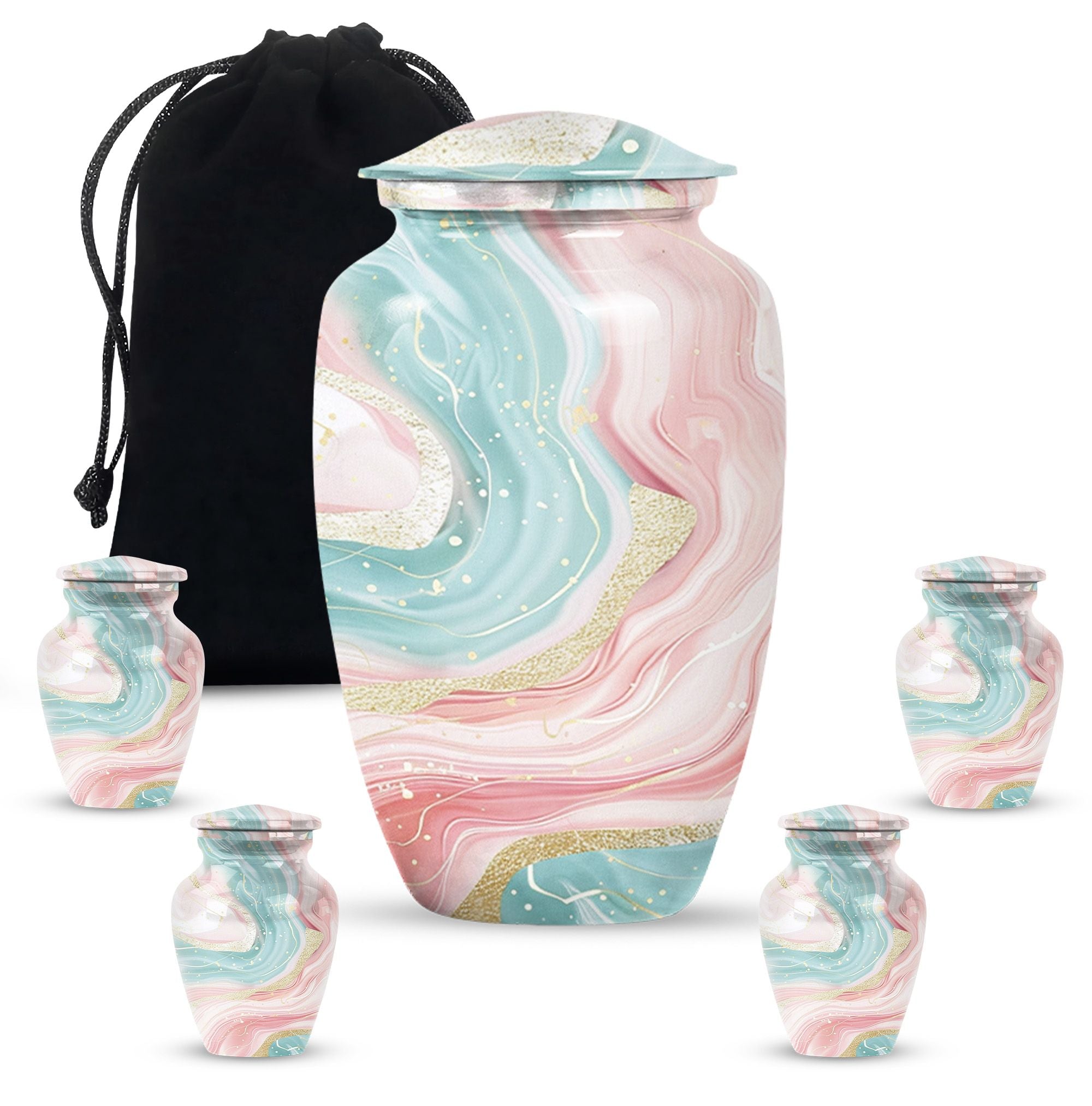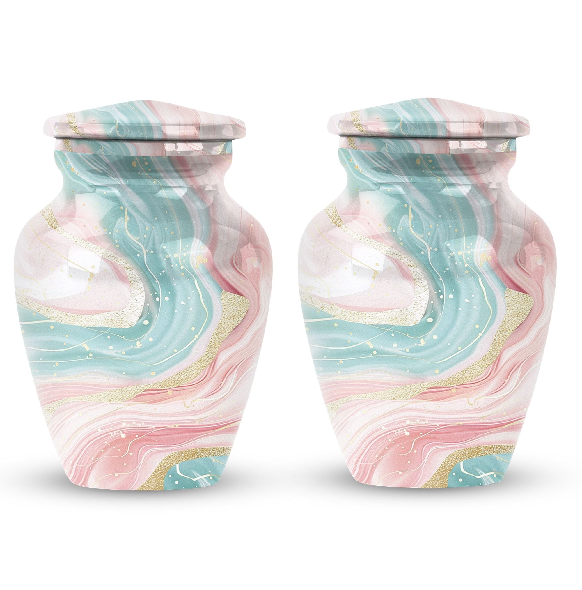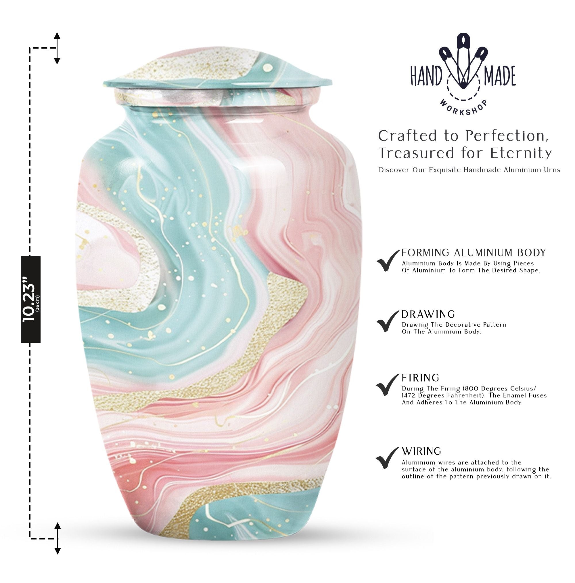 Immerse yourself into the realm of tranquillity with our Abstract Urn, an impeccable selection from our collection of cremation funeral urns. This 10-inch classic urn effortlessly marries aesthetic pleasure with functionality. Crafted from robust and quality aluminium, this large urn has a weight of just 3.3 pounds. Despite its lightweight which enhances its portability, it has an astounding capacity of 200 cubic inches. With this, it perfectly houses your loved ones' ashes, subtly honouring their memory. This cremation urn comes with a velvet pouch for containment and gentle hand-carry of the ashes. For a more personalized approach and remembrance, avail our customization feature to engrave names. It's refreshing abstract theme sets it apart. Note: Abstract Urn excluded from keywords 'Funeral decorative urns' and 'urns for ashes', those are just suggestions for search optimization.