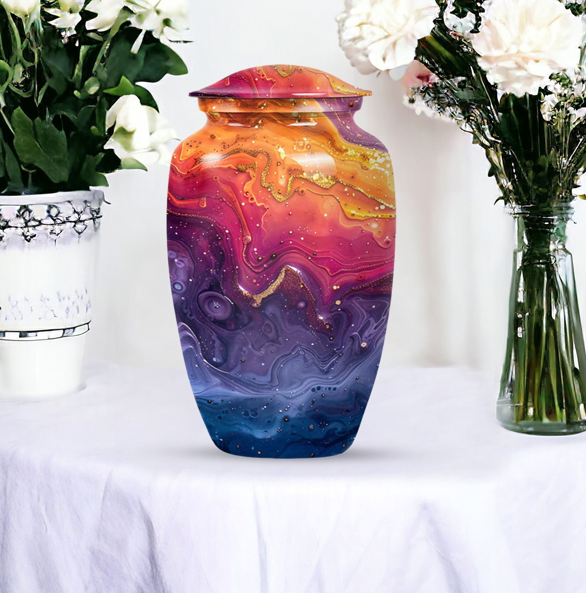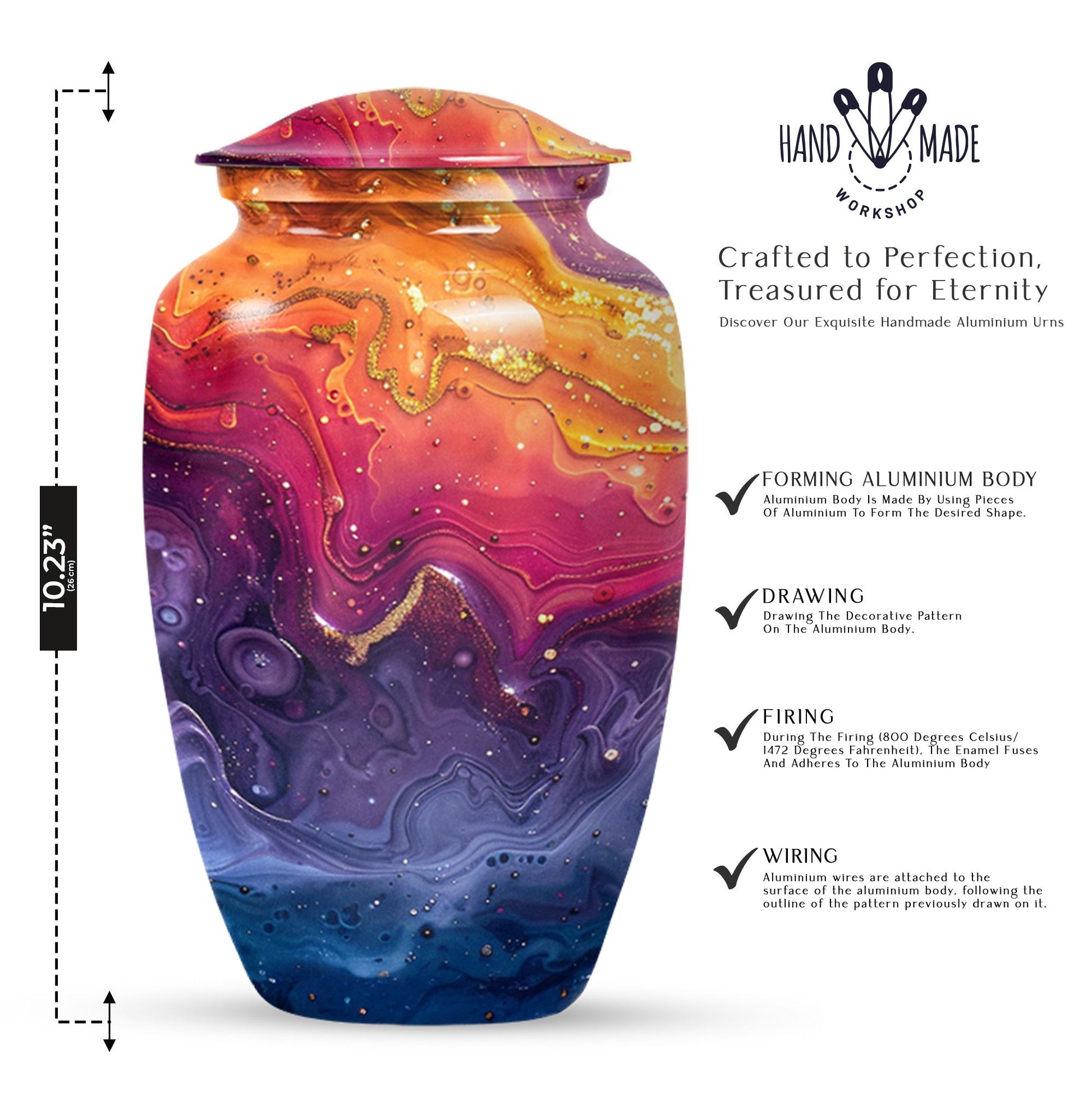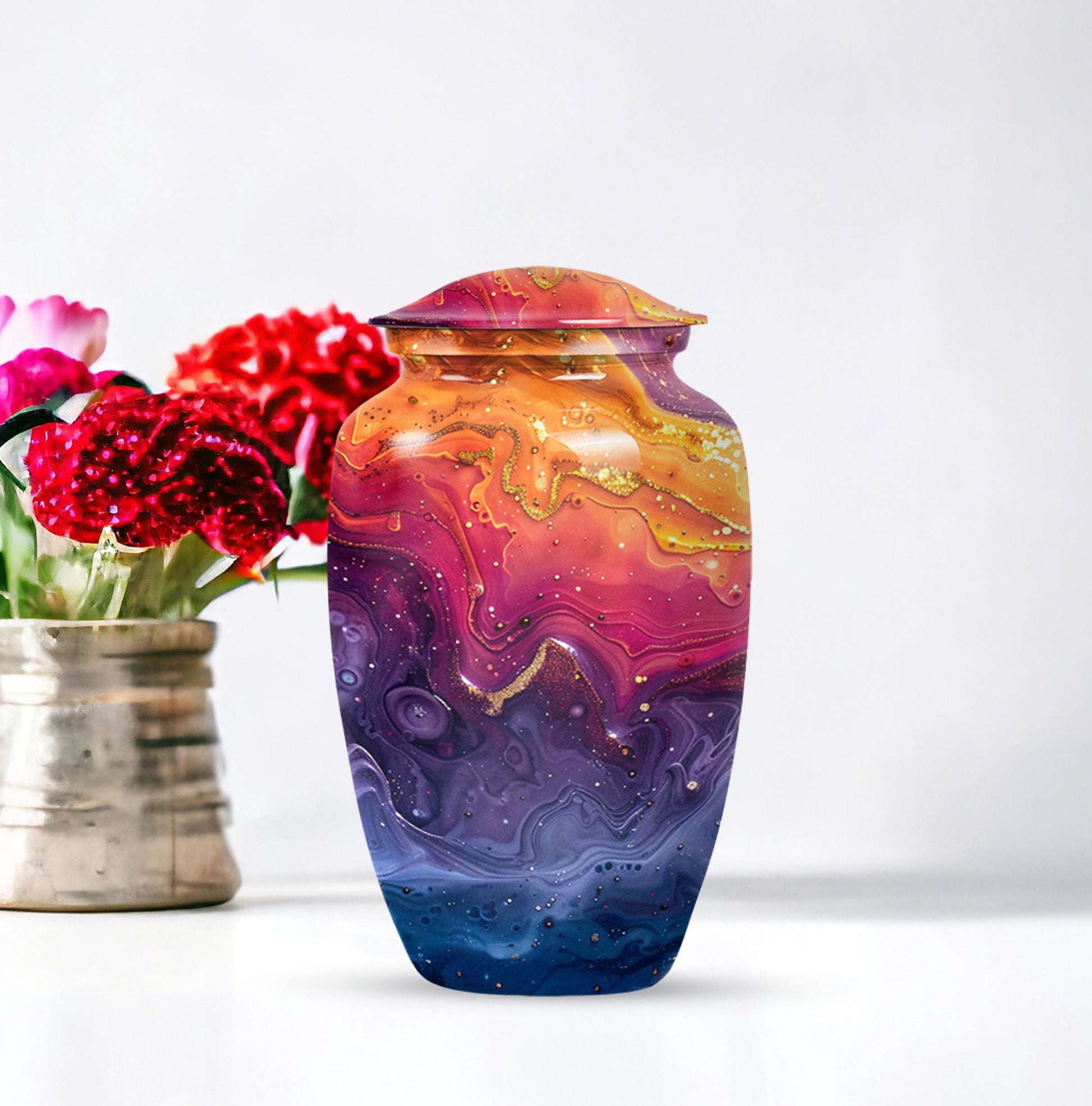 Experience reverence and respect with our Abstract Urn, a remarkable choice meant to honor your departed loved ones. Sized at 10 inches, this cremation urn for human ashes resonates an alluring theme of Abstract, reviving the cherished memories of the deceased. Fabricated from superior grade aluminium, the urn can hold 200 cubic inches of ash, which makes it an ideal choice of large urns for ashes. Weighing 3.3 pounds, this commemorative piece ensures a robust, long-lasting tribute to your loved one. A thoughtful consideration is the inclusion of a velvet pouch which aids in the dignified containment of ashes. For a personal touch, we offer the option to engrave names on the urn. Searching for 'cremation urns for men' or 'funeral urns for women', will manifest this 'classic urn' style - an embodiment of respect, love, and remembrance.