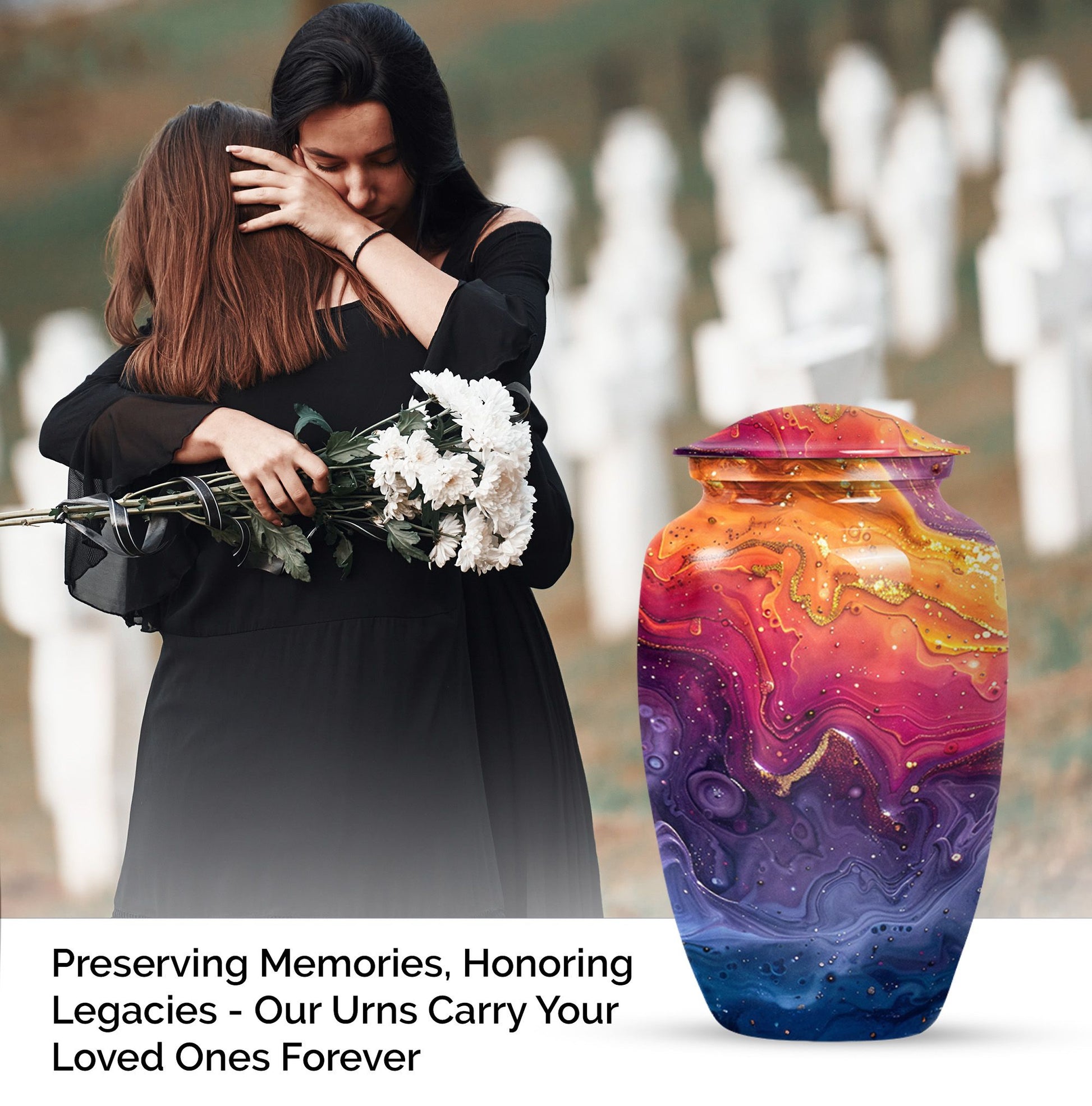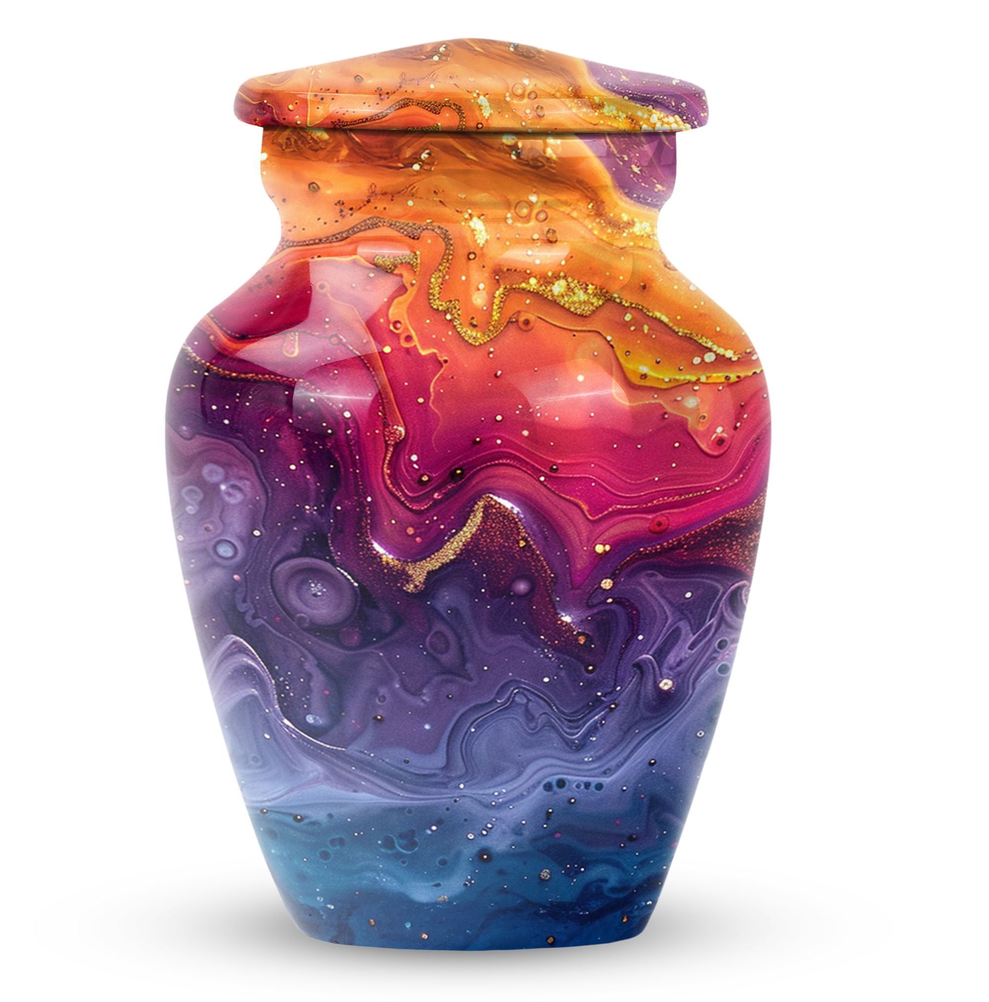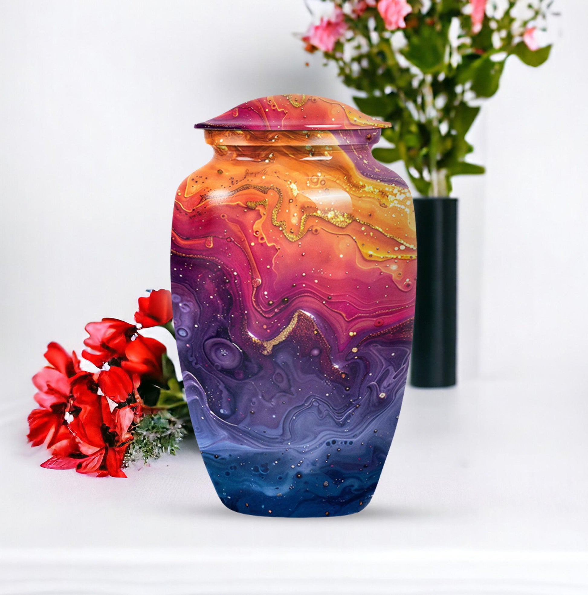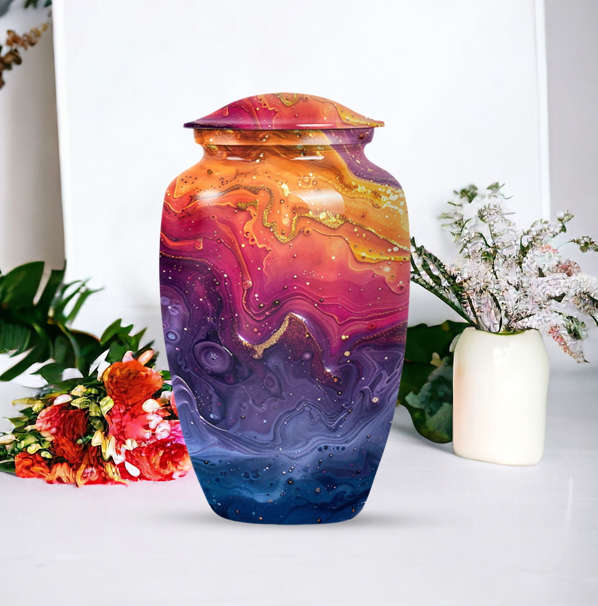 Experience reverence and respect with our Abstract Urn, a remarkable choice meant to honor your departed loved ones. Sized at 10 inches, this cremation urn for human ashes resonates an alluring theme of Abstract, reviving the cherished memories of the deceased. Fabricated from superior grade aluminium, the urn can hold 200 cubic inches of ash, which makes it an ideal choice of large urns for ashes. Weighing 3.3 pounds, this commemorative piece ensures a robust, long-lasting tribute to your loved one. A thoughtful consideration is the inclusion of a velvet pouch which aids in the dignified containment of ashes. For a personal touch, we offer the option to engrave names on the urn. Searching for 'cremation urns for men' or 'funeral urns for women', will manifest this 'classic urn' style - an embodiment of respect, love, and remembrance.