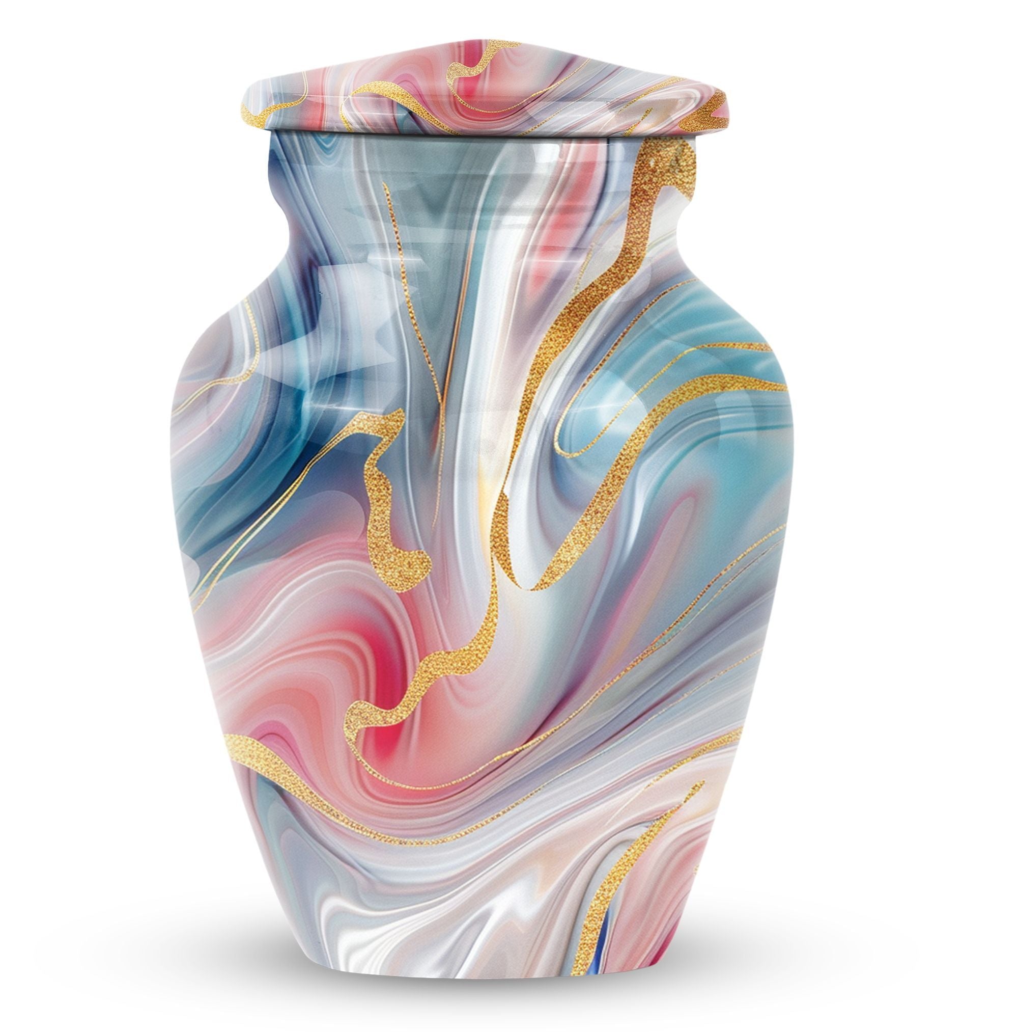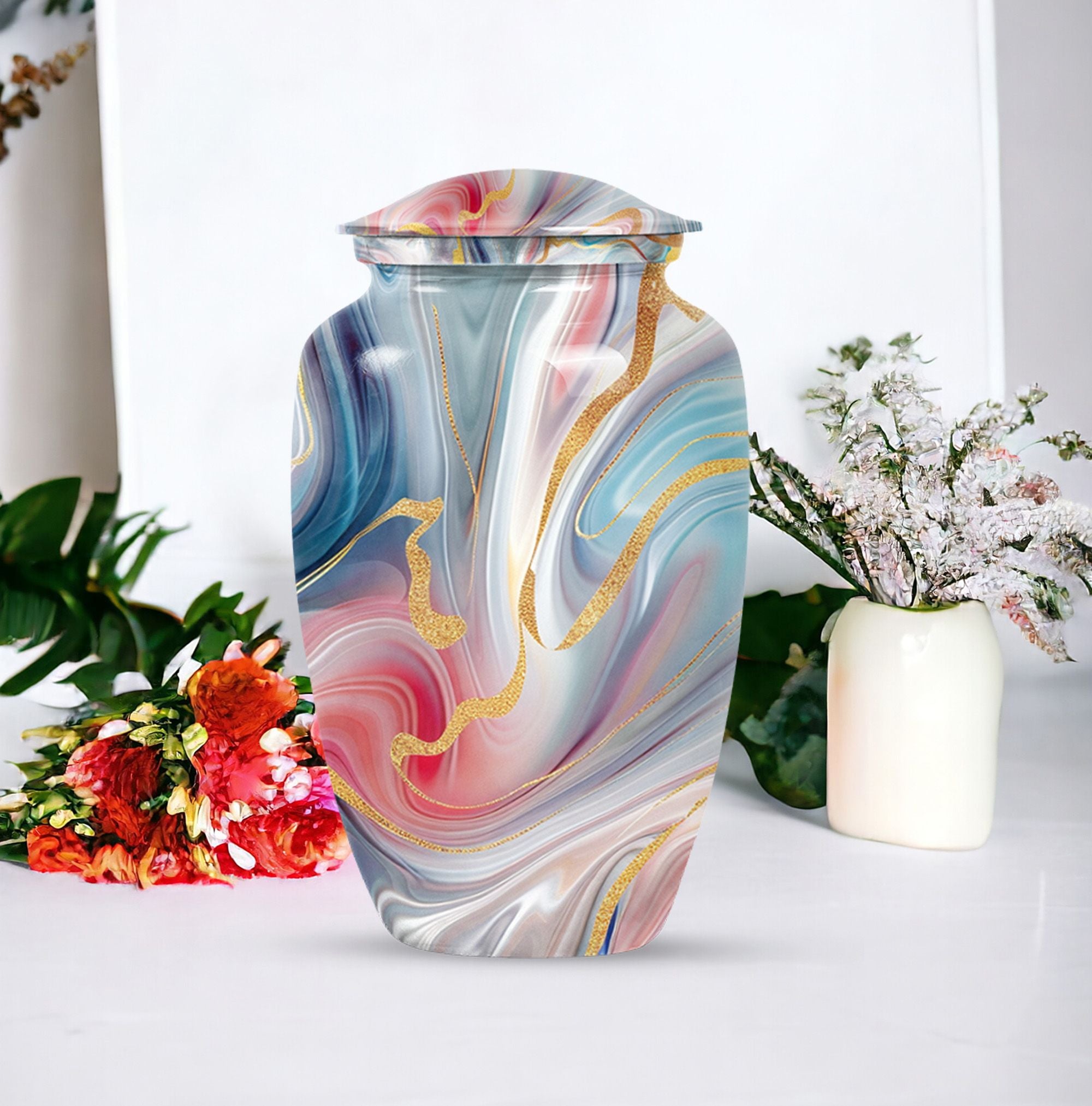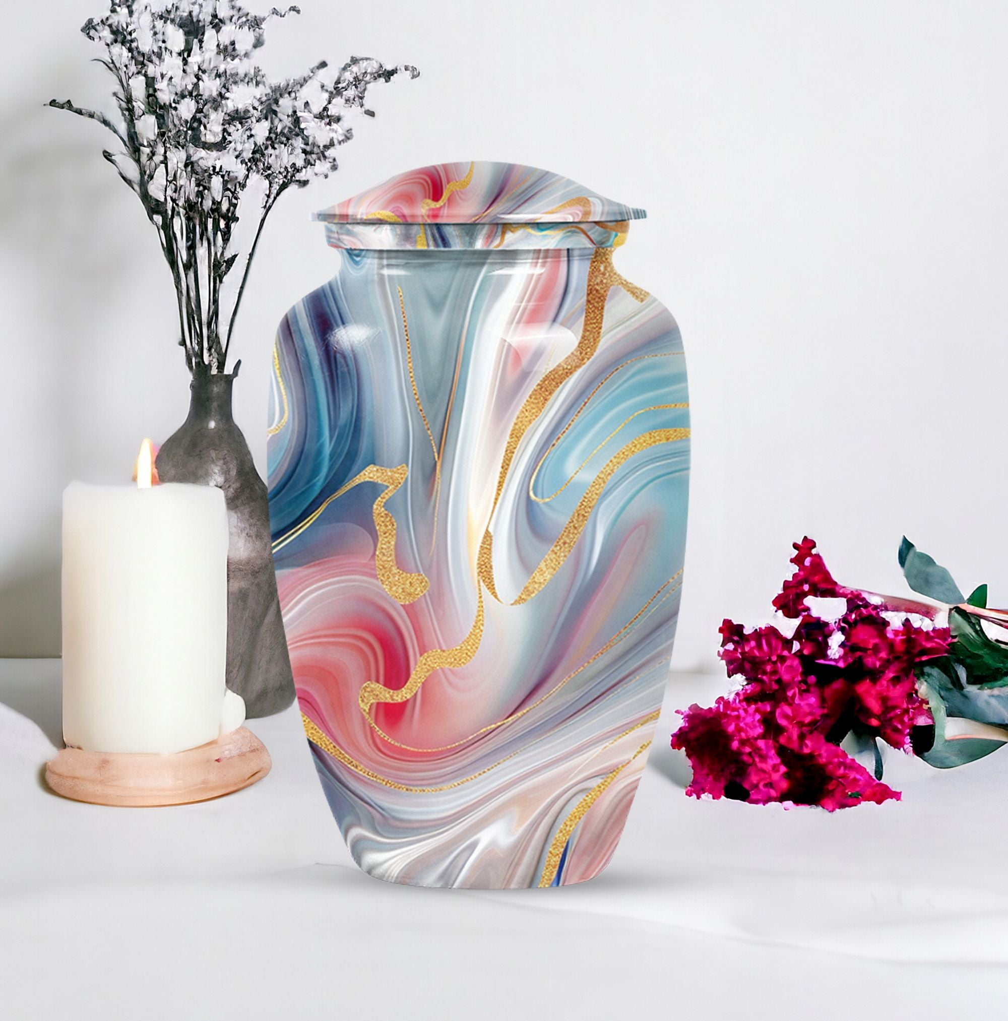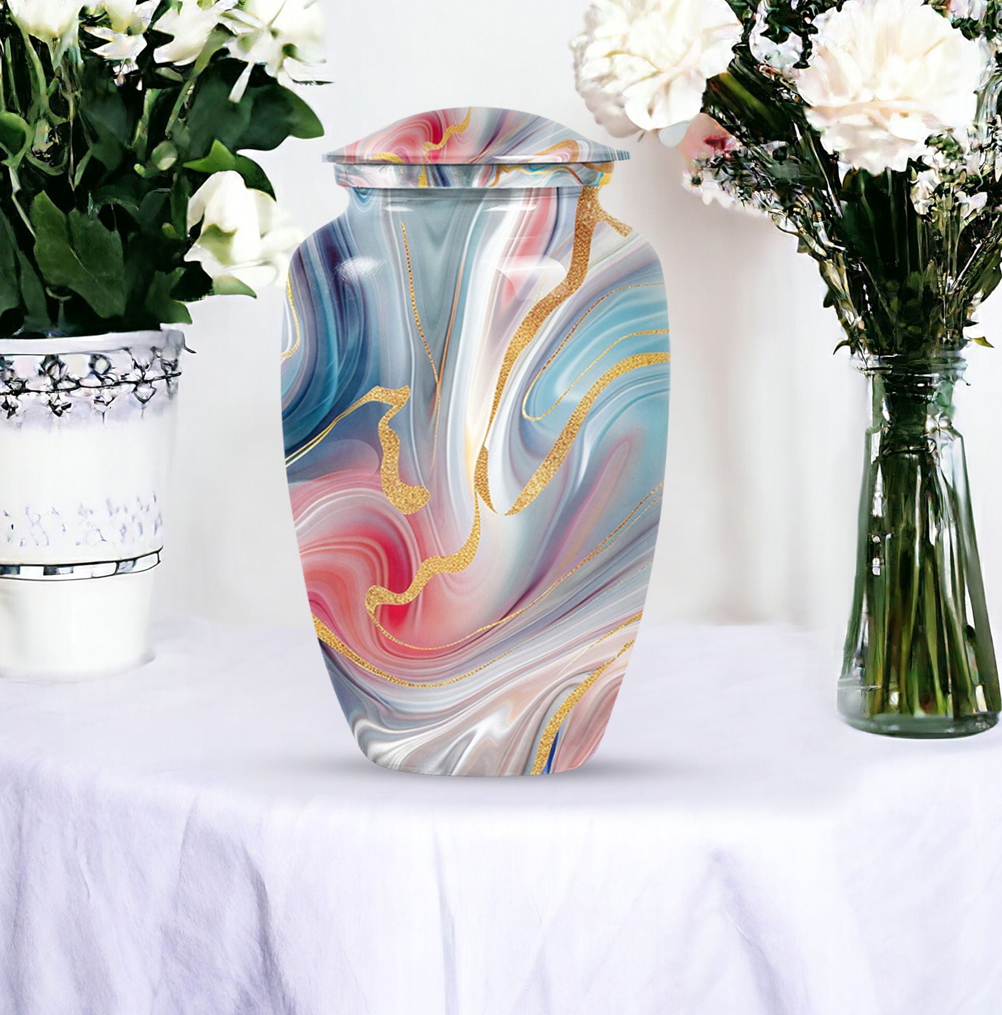 Discover a timeless tribute to a loved one with our stunning Abstract Urn, a thoughtful way to celebrate a life well-lived. Meticulously crafted from robust aluminium, this large urn rests at 10 inches in height, comfortably containing up to 200 cubic inches of cremains with a weight of 3.3 pounds. The Abstract Urn comes with a serene velvet pouch, providing a dignified containment for cremation ashes awaiting burial. Specially designed for adult human ashes, our cremation urns bring a delicate balance between elegance and remembrance. As a special addition, we provide the opportunity to personalize this urn with engraved names for that extra touch of fond memory. Not only is our Abstract Urn a reverent piece for memorial ceremonies, its classic aesthetic ensures a solemn yet beautiful commemoration of your loved one's journey. Our selection embodies thoughtful respect for the cycle of life, making it a heartfelt choice in burial urns for cremation ashes.