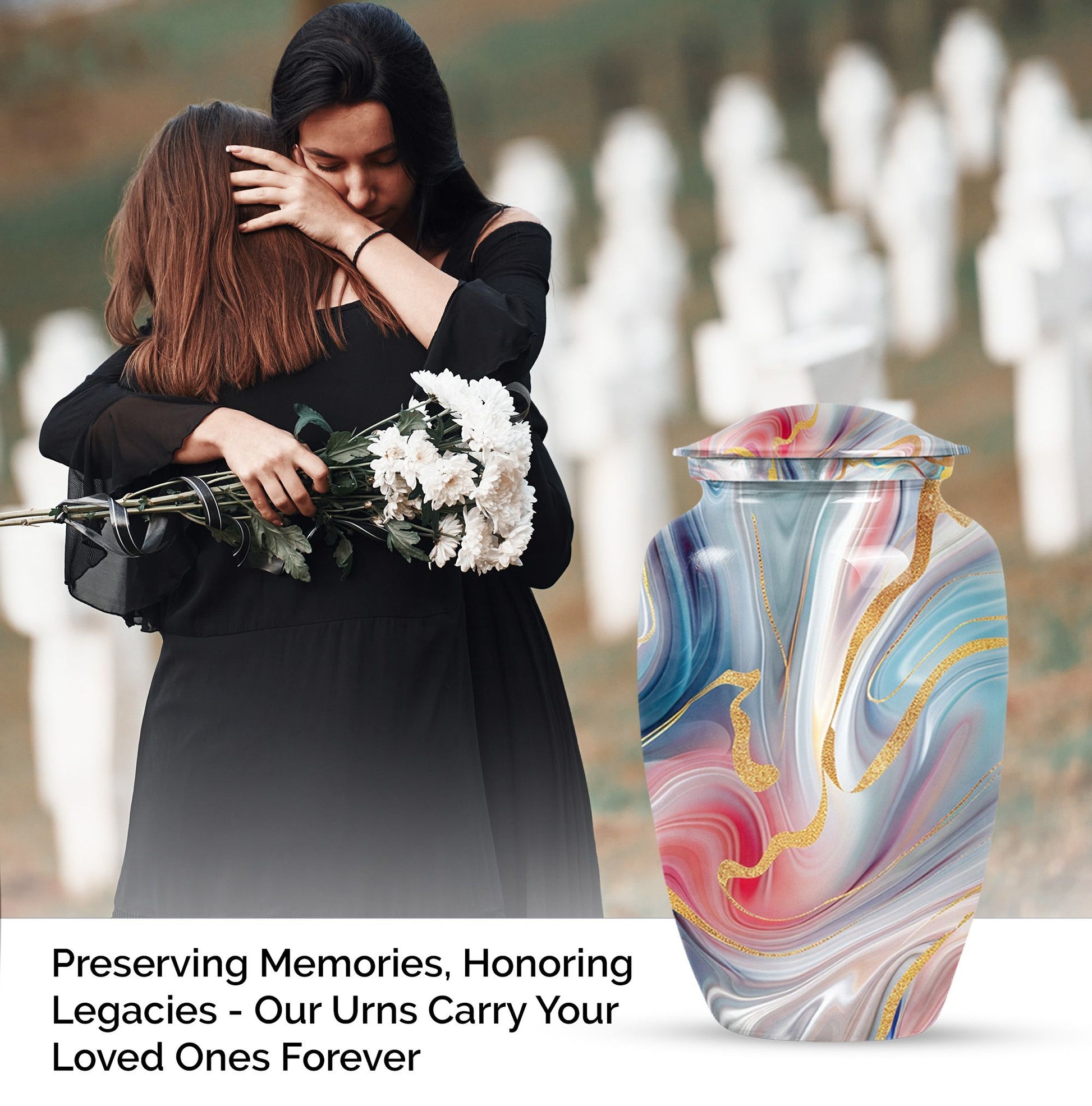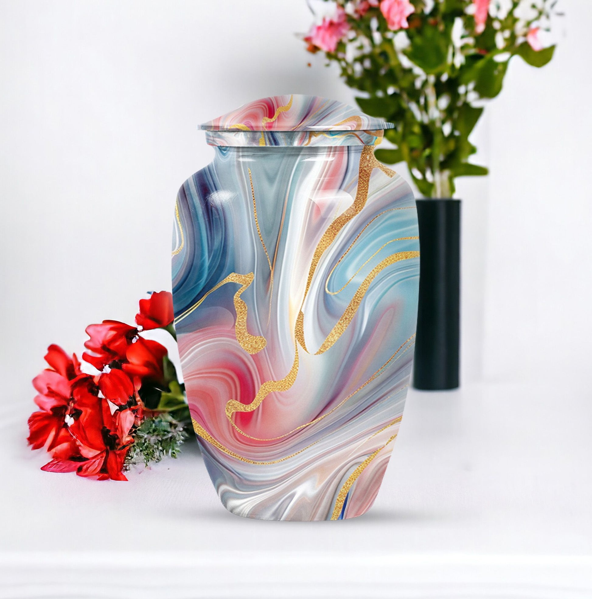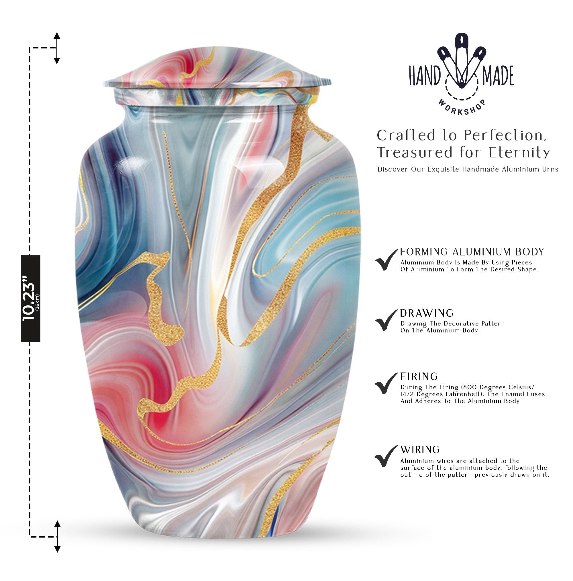 Discover a timeless tribute to a loved one with our stunning Abstract Urn, a thoughtful way to celebrate a life well-lived. Meticulously crafted from robust aluminium, this large urn rests at 10 inches in height, comfortably containing up to 200 cubic inches of cremains with a weight of 3.3 pounds. The Abstract Urn comes with a serene velvet pouch, providing a dignified containment for cremation ashes awaiting burial. Specially designed for adult human ashes, our cremation urns bring a delicate balance between elegance and remembrance. As a special addition, we provide the opportunity to personalize this urn with engraved names for that extra touch of fond memory. Not only is our Abstract Urn a reverent piece for memorial ceremonies, its classic aesthetic ensures a solemn yet beautiful commemoration of your loved one's journey. Our selection embodies thoughtful respect for the cycle of life, making it a heartfelt choice in burial urns for cremation ashes.