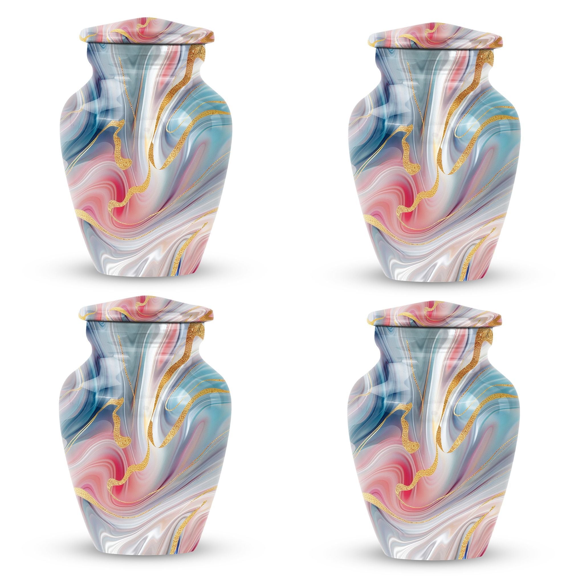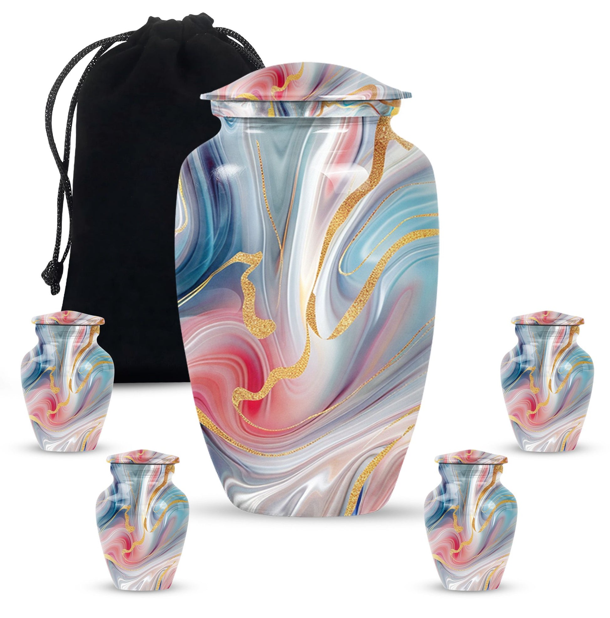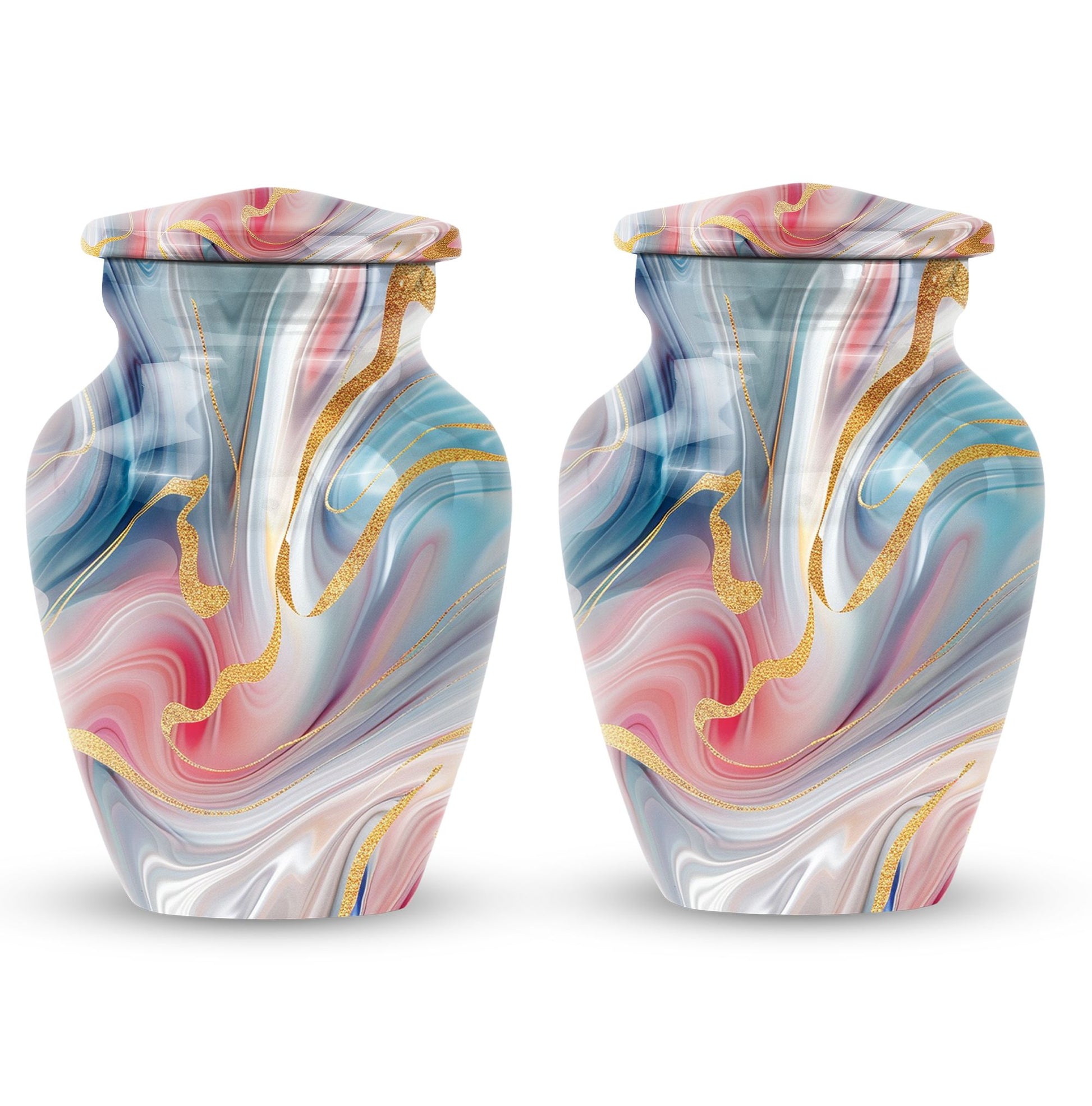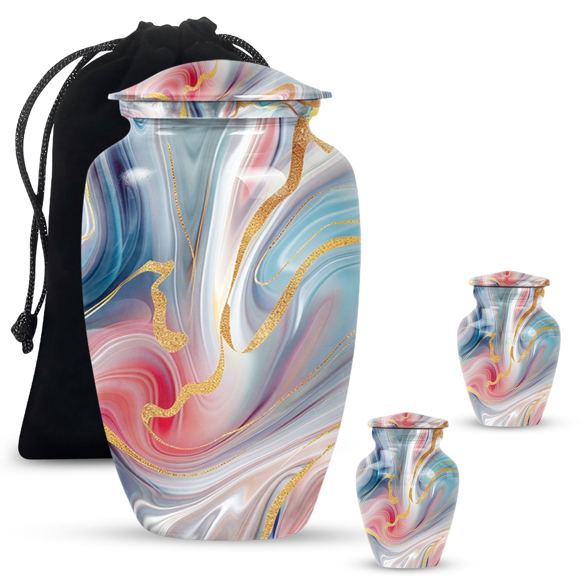 Discover a timeless tribute to a loved one with our stunning Abstract Urn, a thoughtful way to celebrate a life well-lived. Meticulously crafted from robust aluminium, this large urn rests at 10 inches in height, comfortably containing up to 200 cubic inches of cremains with a weight of 3.3 pounds. The Abstract Urn comes with a serene velvet pouch, providing a dignified containment for cremation ashes awaiting burial. Specially designed for adult human ashes, our cremation urns bring a delicate balance between elegance and remembrance. As a special addition, we provide the opportunity to personalize this urn with engraved names for that extra touch of fond memory. Not only is our Abstract Urn a reverent piece for memorial ceremonies, its classic aesthetic ensures a solemn yet beautiful commemoration of your loved one's journey. Our selection embodies thoughtful respect for the cycle of life, making it a heartfelt choice in burial urns for cremation ashes.