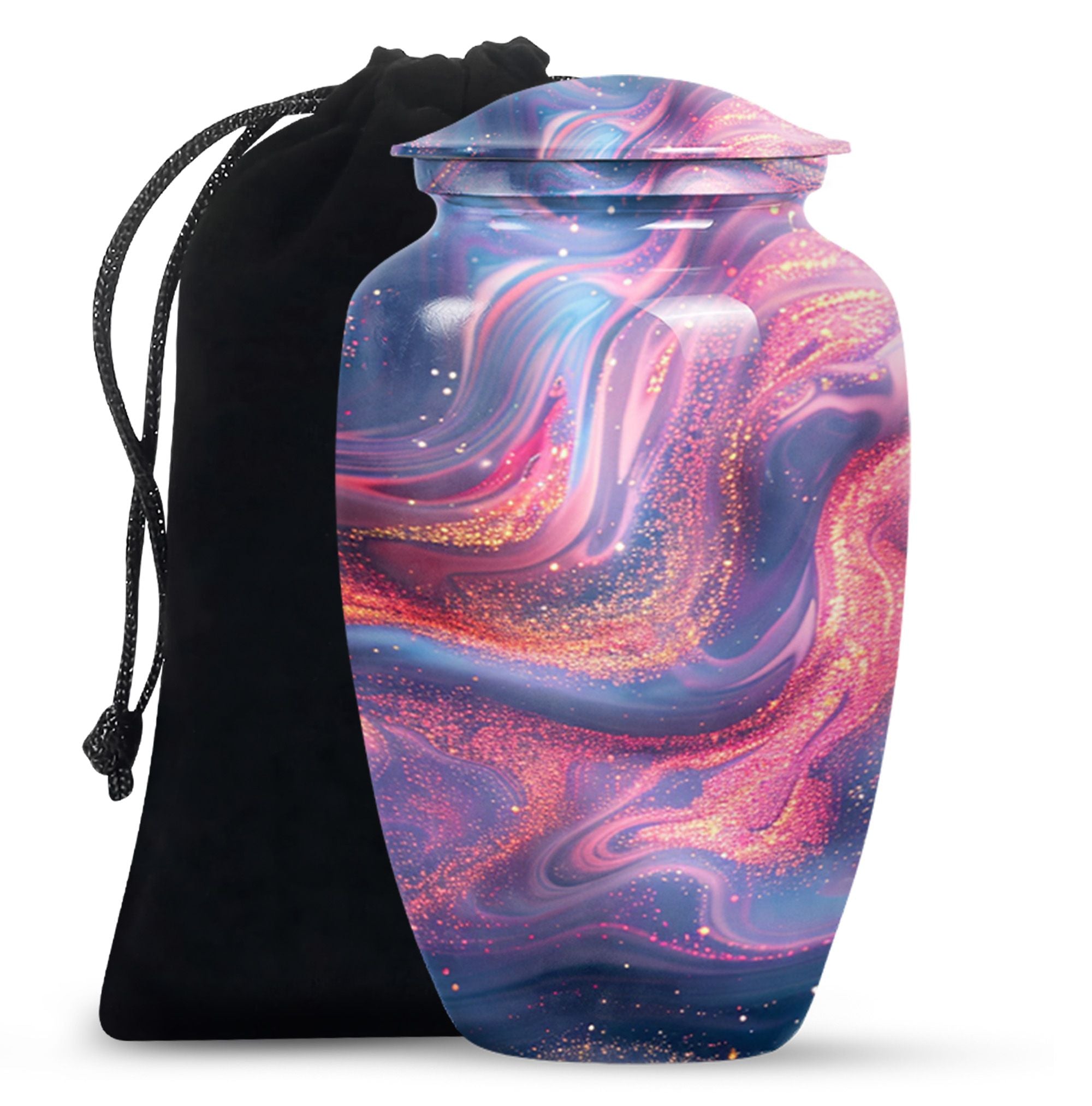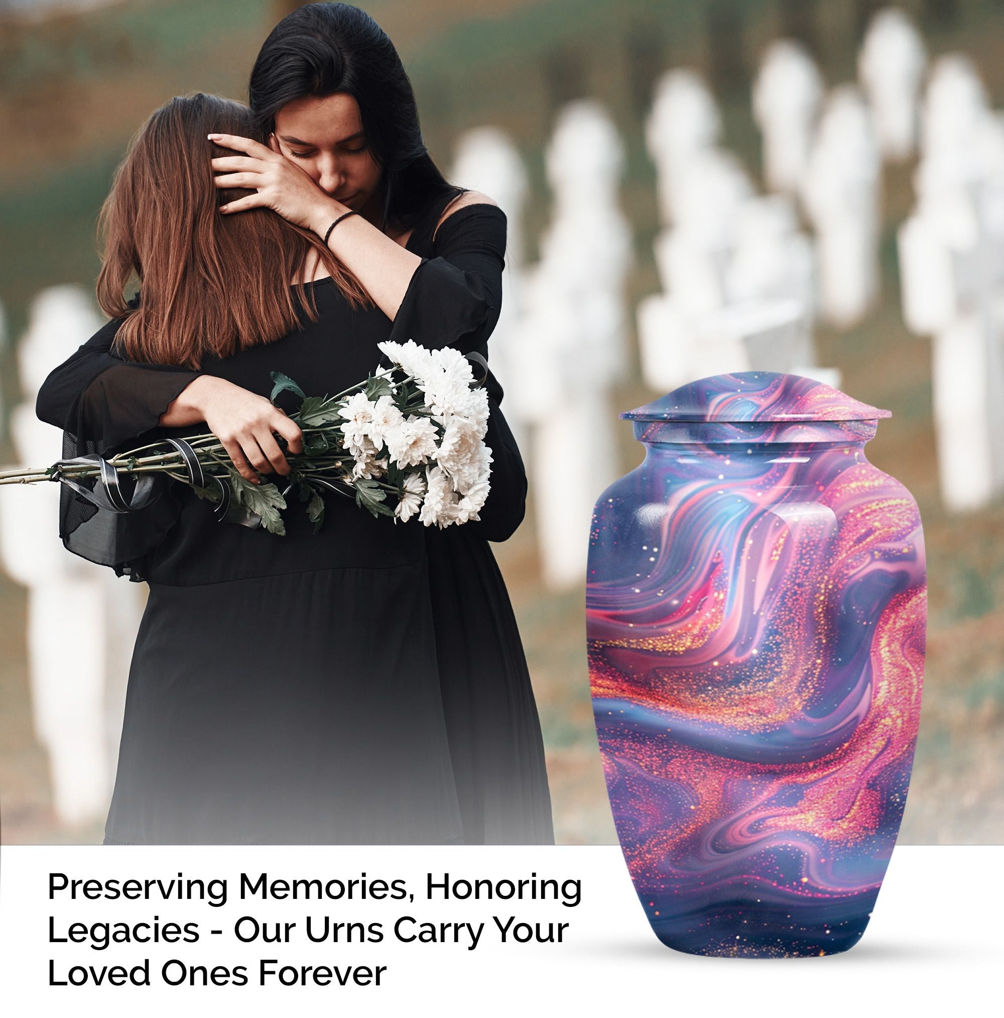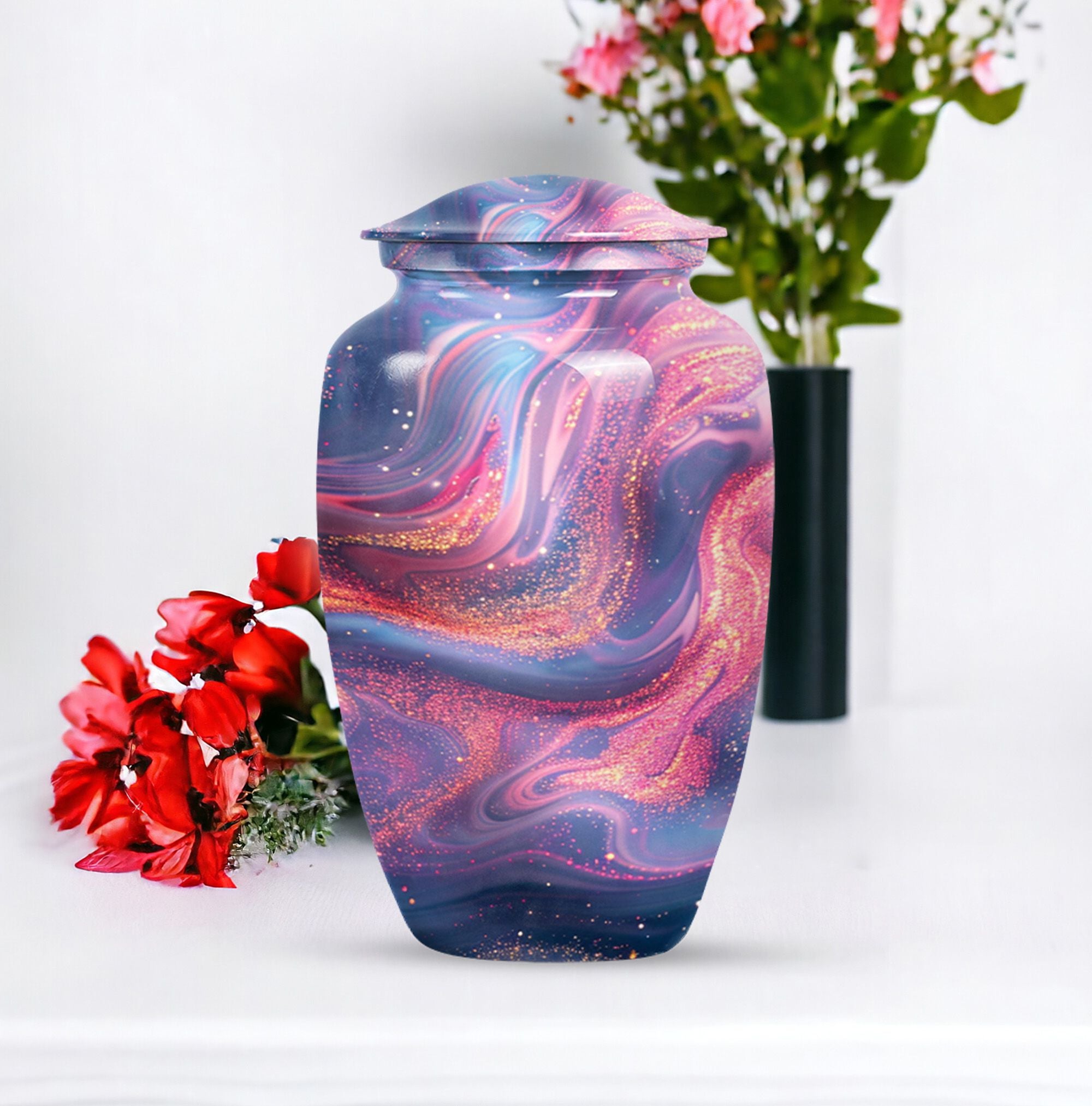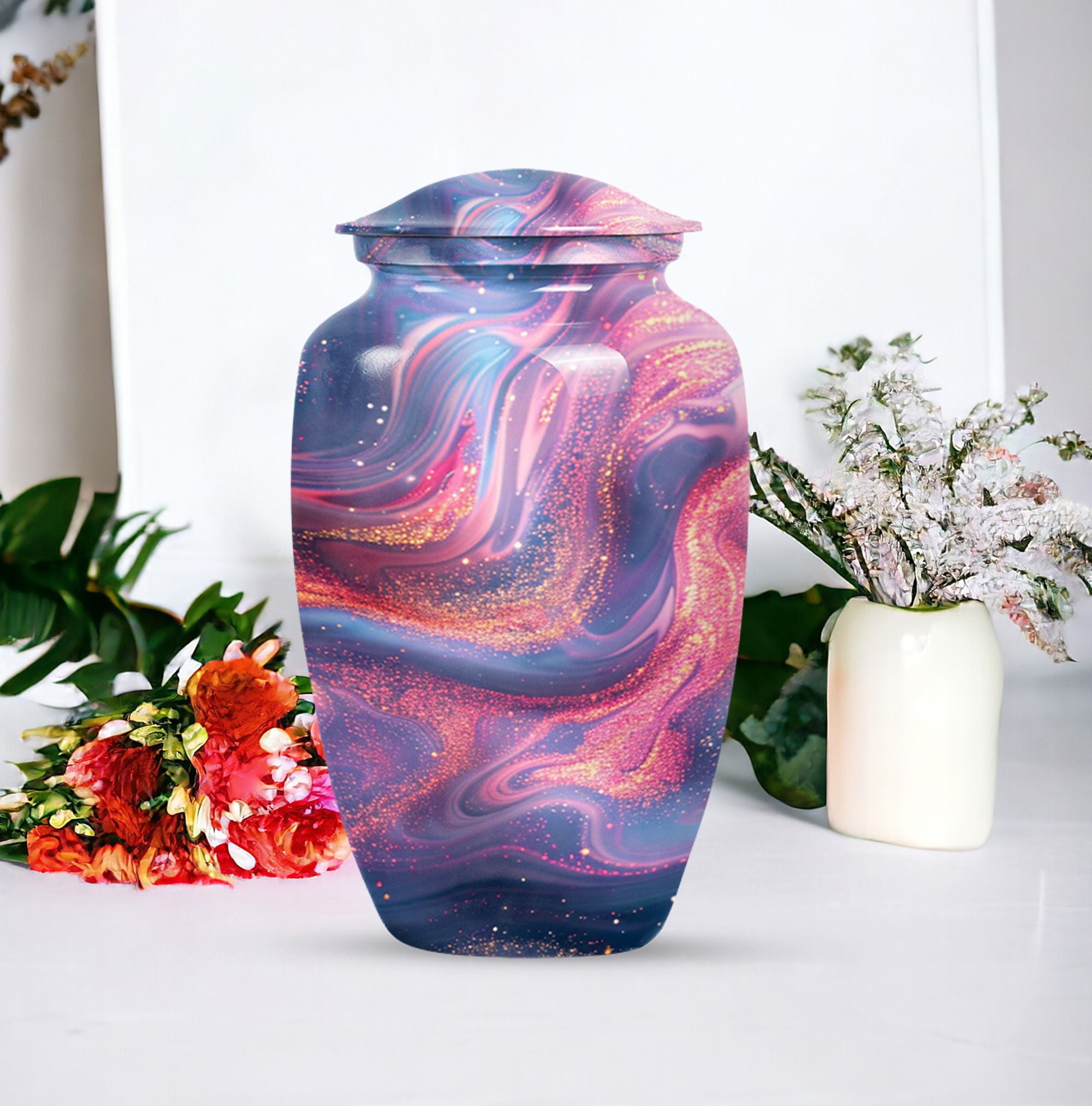 Paying tribute to your departed loved ones couldn't be more heartwarming with this Abstract Cremation Urn. It stands elegantly at a height of 10 inches and can store up to 200 cubic inches of ashes. Designed with tasteful abstract constructing using high-quality aluminium, this funeral urn fits perfectly into both ceremonial rites and solemn displays. Alongside its aesthetic presence, it has a significant underlying weight of 3.3 pounds, assuring stability and sturdiness. The large urn comes with a velvet pouch, providing an intimate containment for the ashes of your deceased. As an added touch of sentiment, the urn offers a customization option to engrave names, resonating with emotions and memories. Targeted keywords for this urn are 'urns for adult male', 'funeral urn for ashes for women' and 'urns for mom' among others. A classic memorial piece that exemplifies warmth and respect for our beloved.