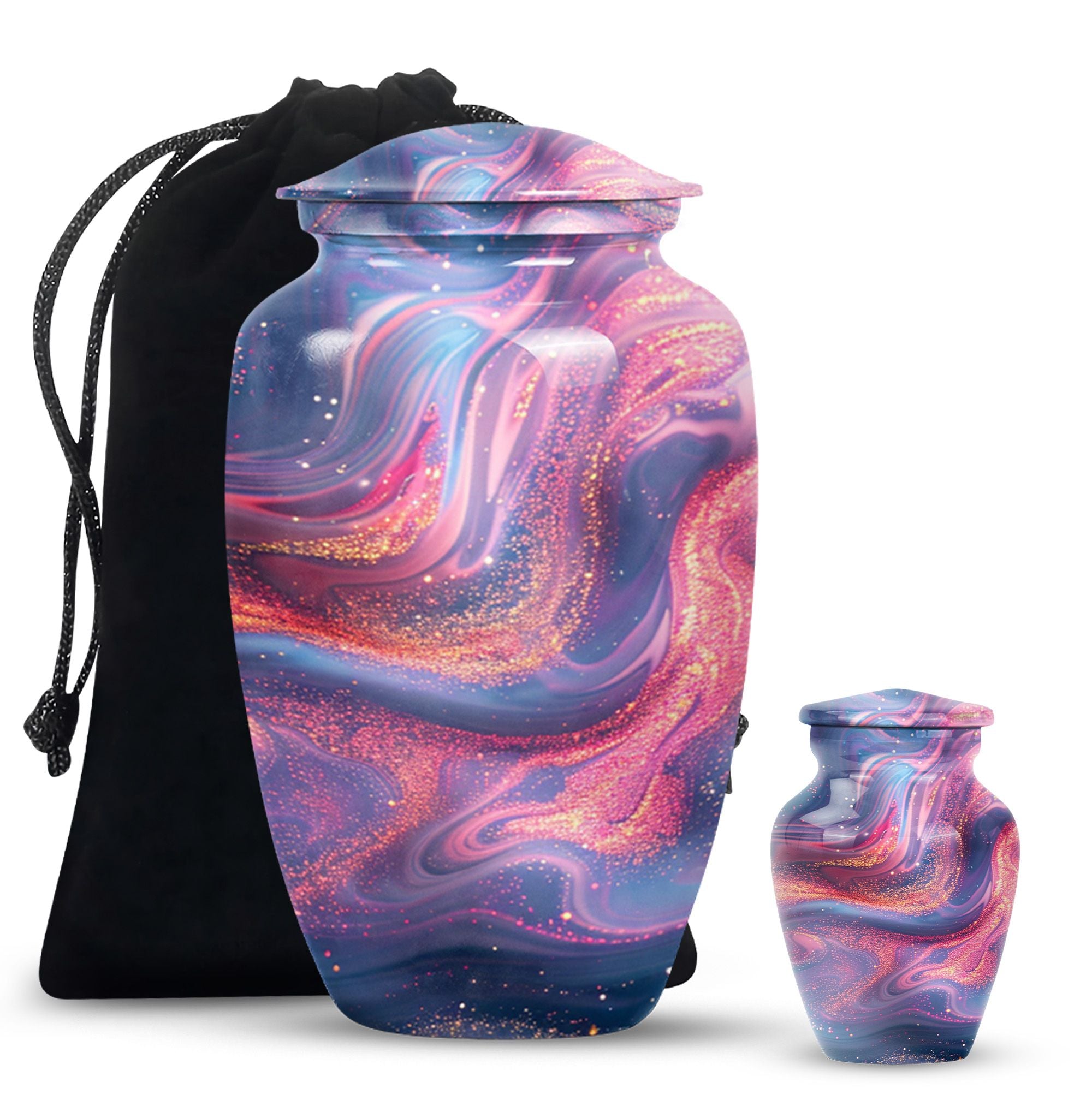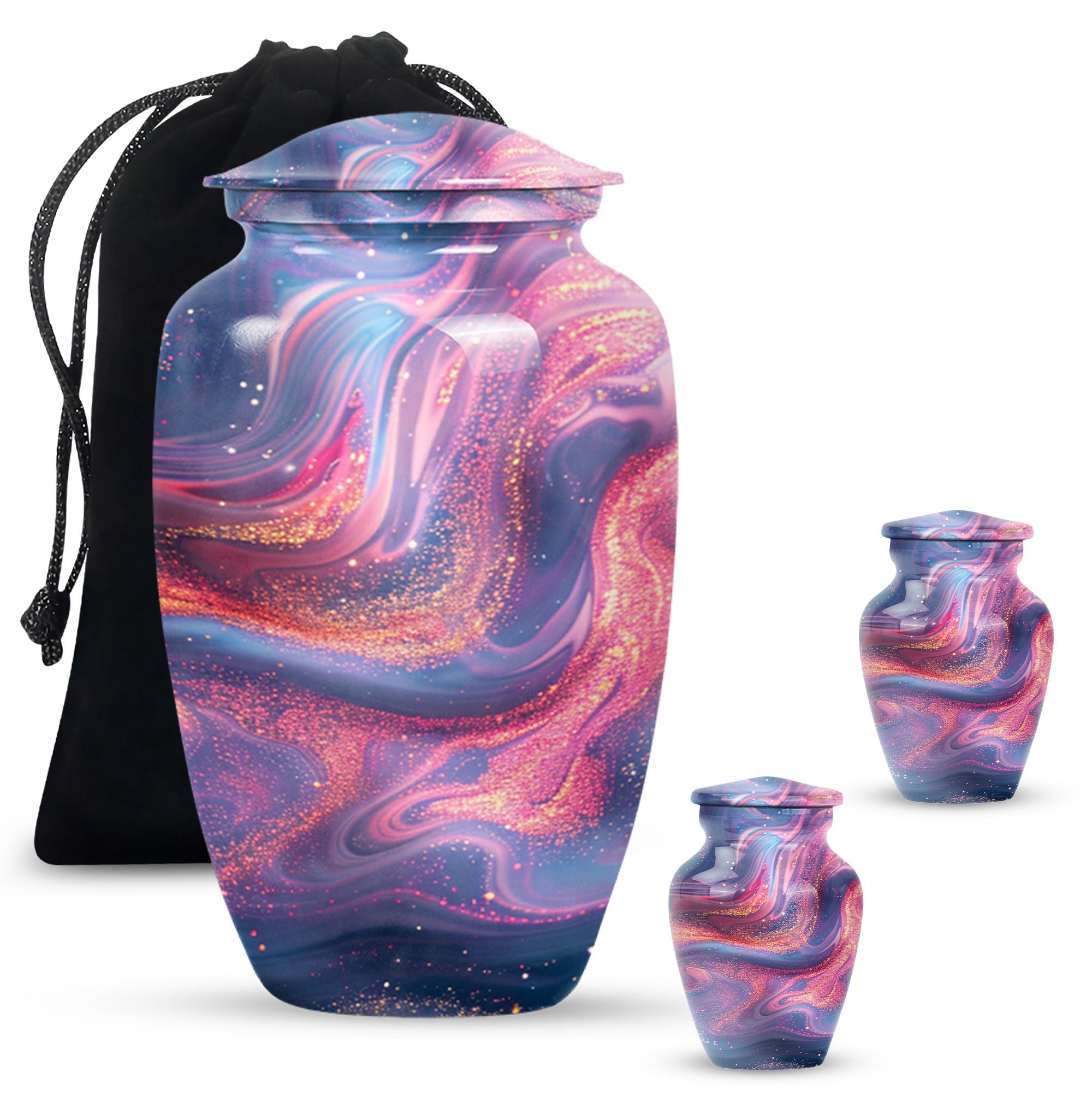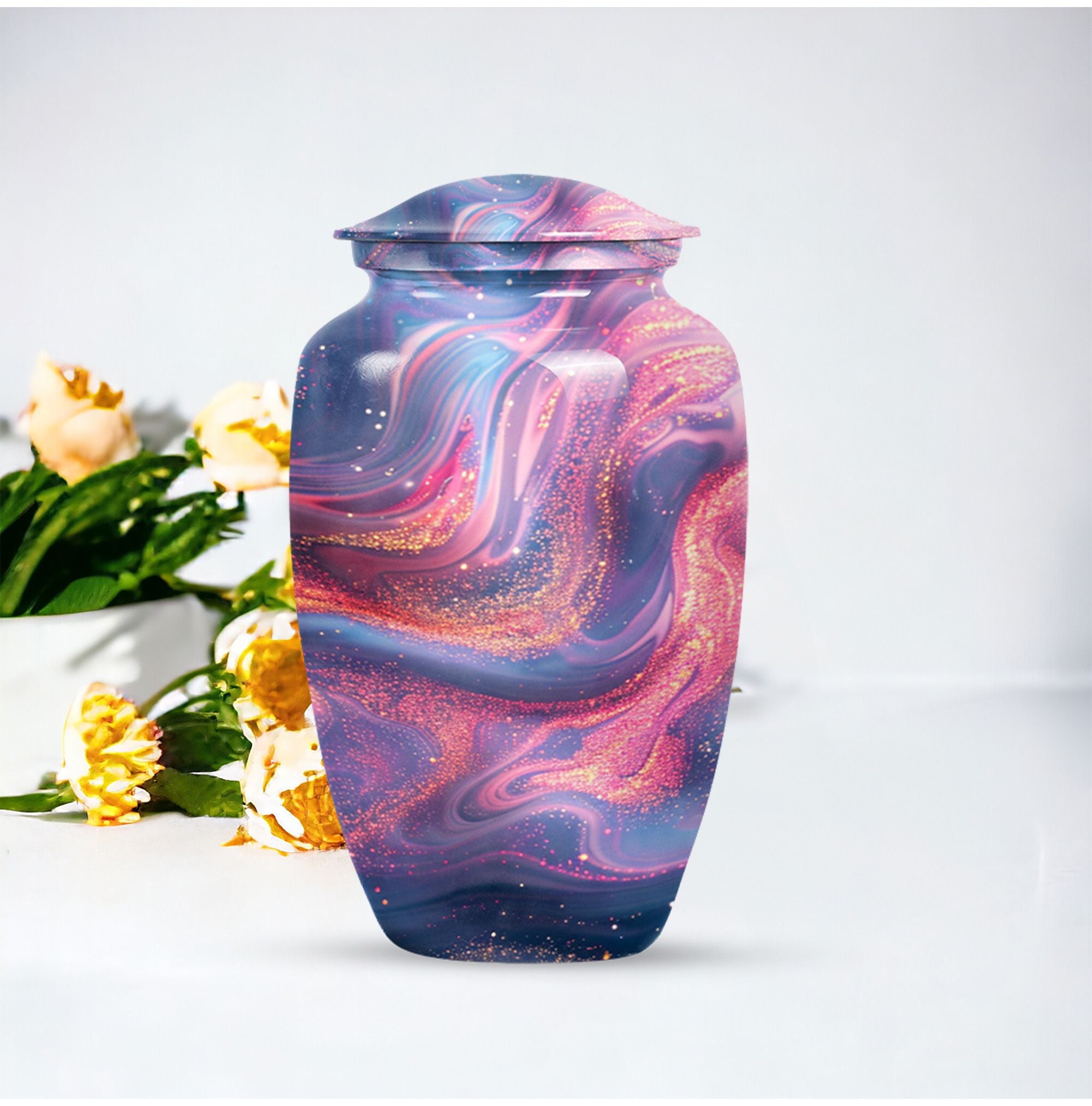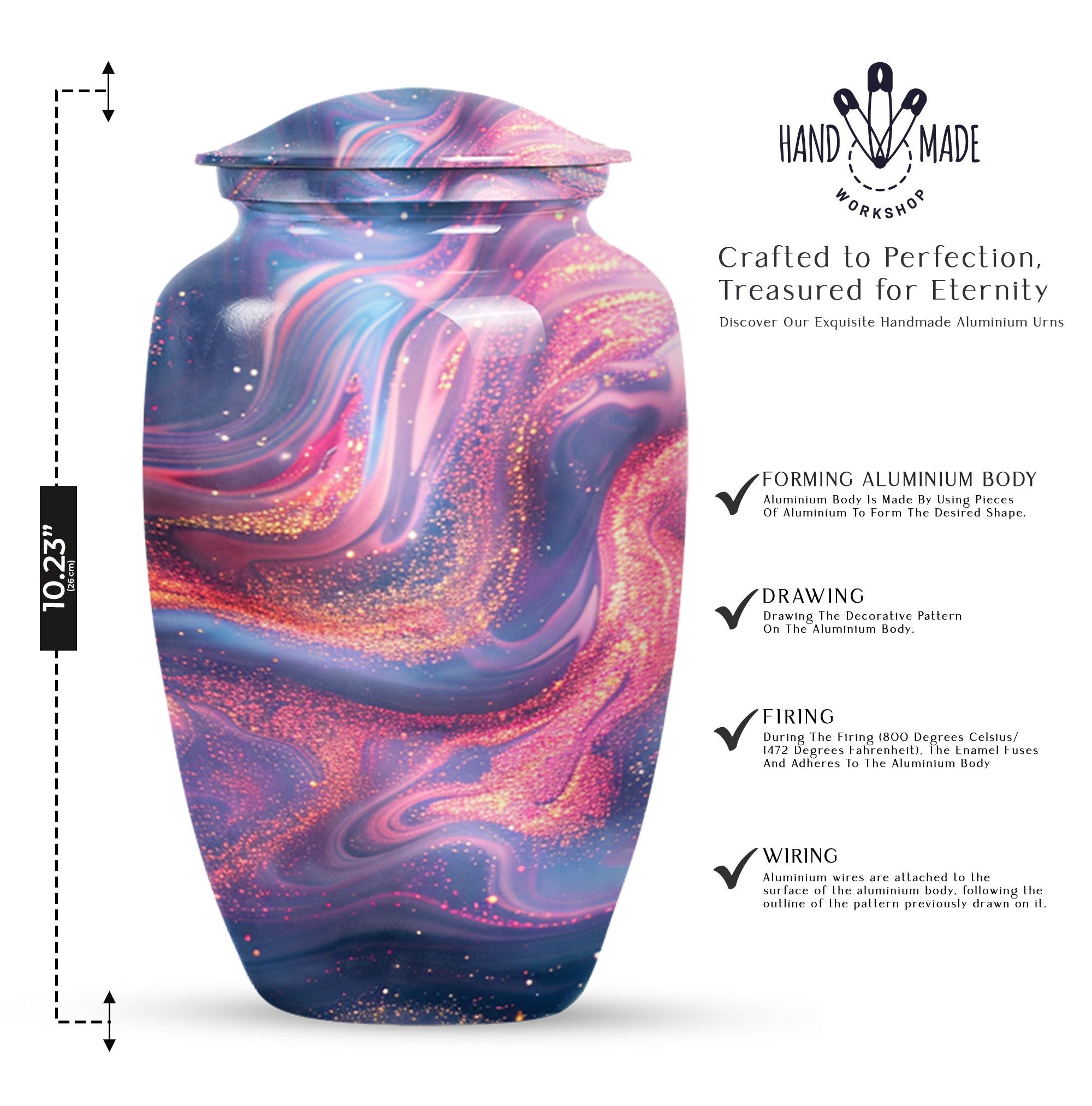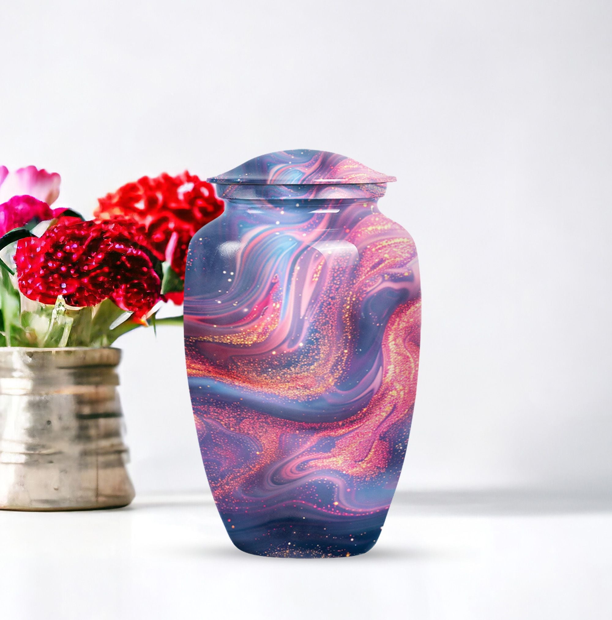 Paying tribute to your departed loved ones couldn't be more heartwarming with this Abstract Cremation Urn. It stands elegantly at a height of 10 inches and can store up to 200 cubic inches of ashes. Designed with tasteful abstract constructing using high-quality aluminium, this funeral urn fits perfectly into both ceremonial rites and solemn displays. Alongside its aesthetic presence, it has a significant underlying weight of 3.3 pounds, assuring stability and sturdiness. The large urn comes with a velvet pouch, providing an intimate containment for the ashes of your deceased. As an added touch of sentiment, the urn offers a customization option to engrave names, resonating with emotions and memories. Targeted keywords for this urn are 'urns for adult male', 'funeral urn for ashes for women' and 'urns for mom' among others. A classic memorial piece that exemplifies warmth and respect for our beloved.