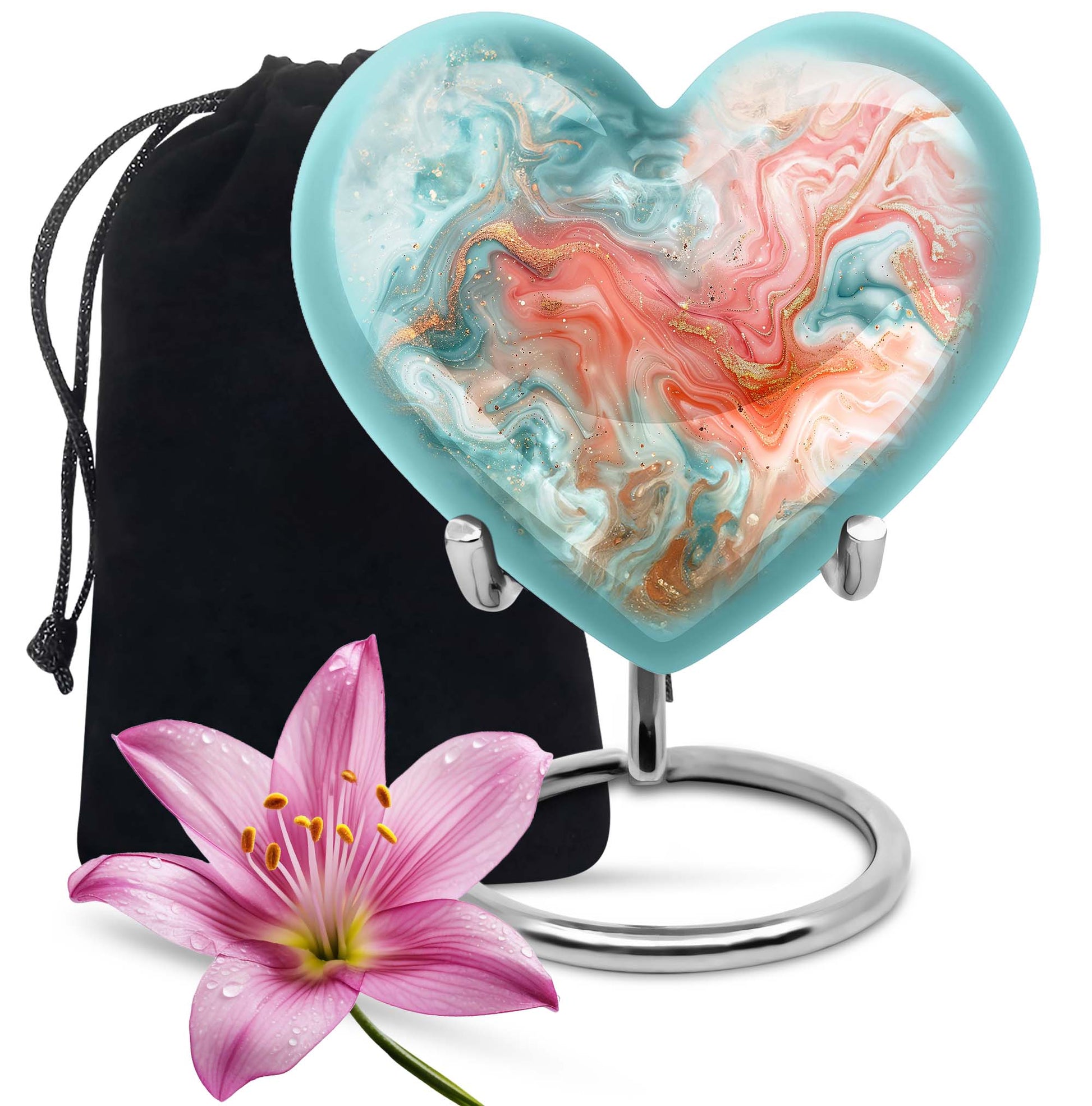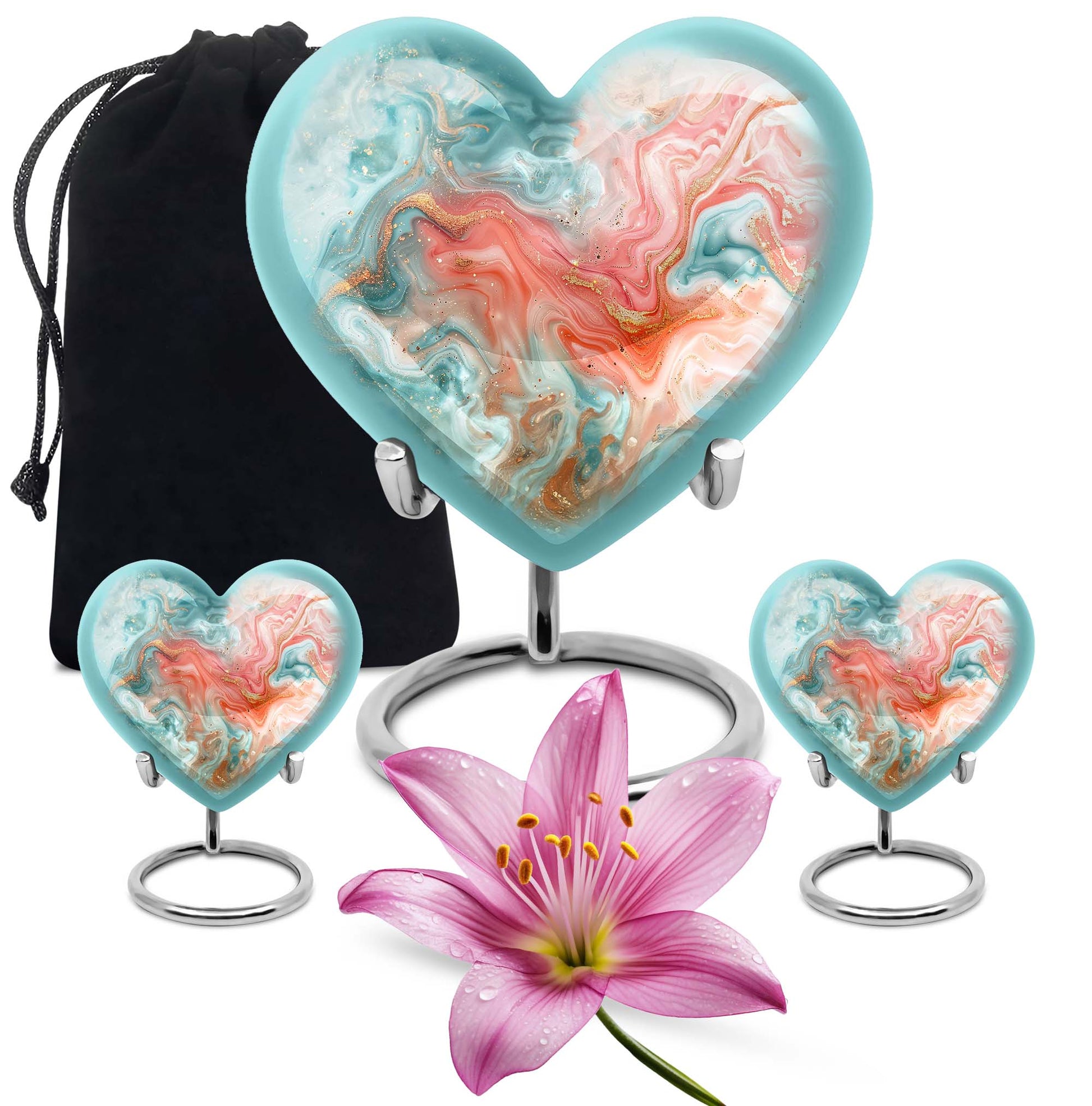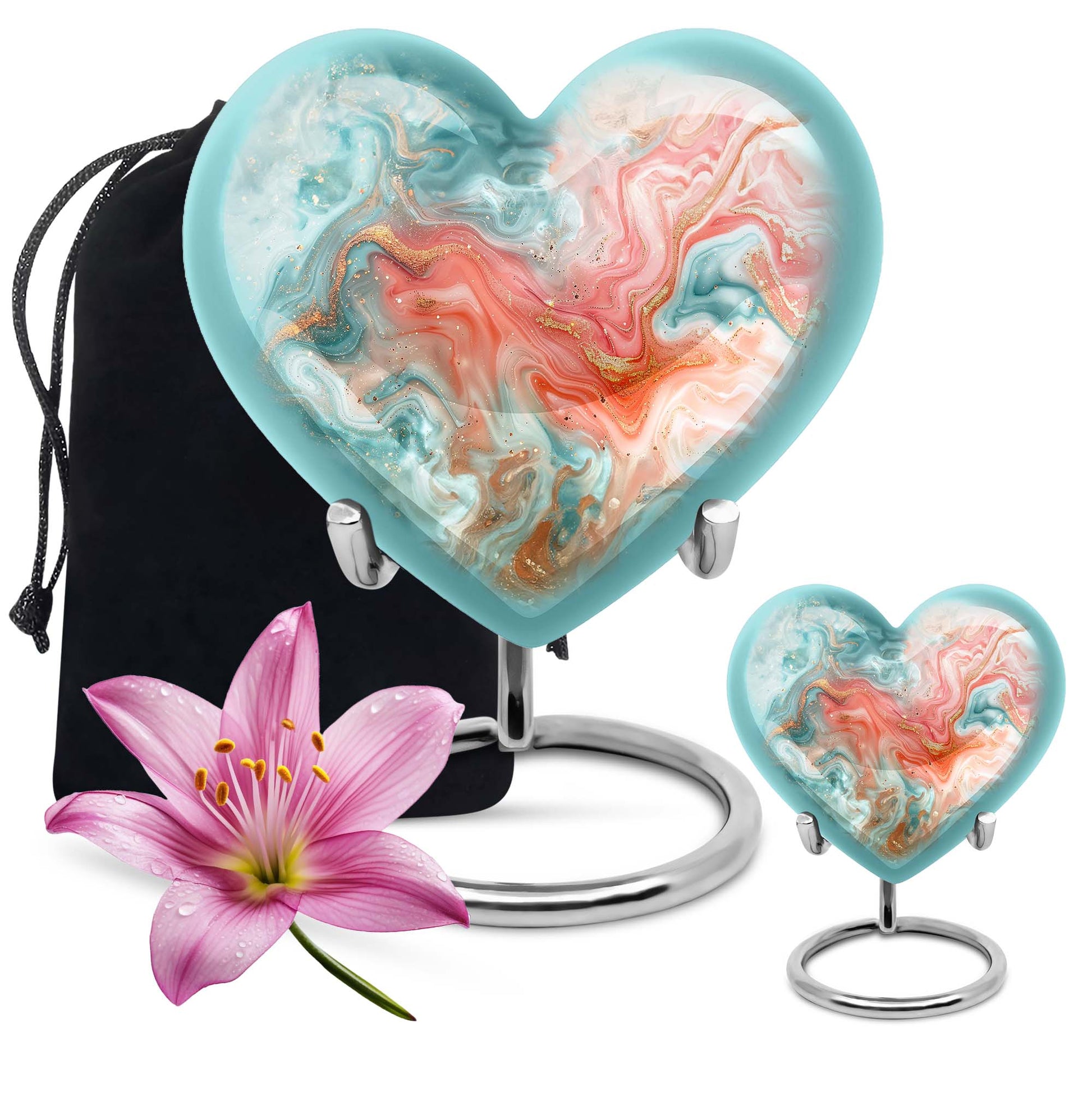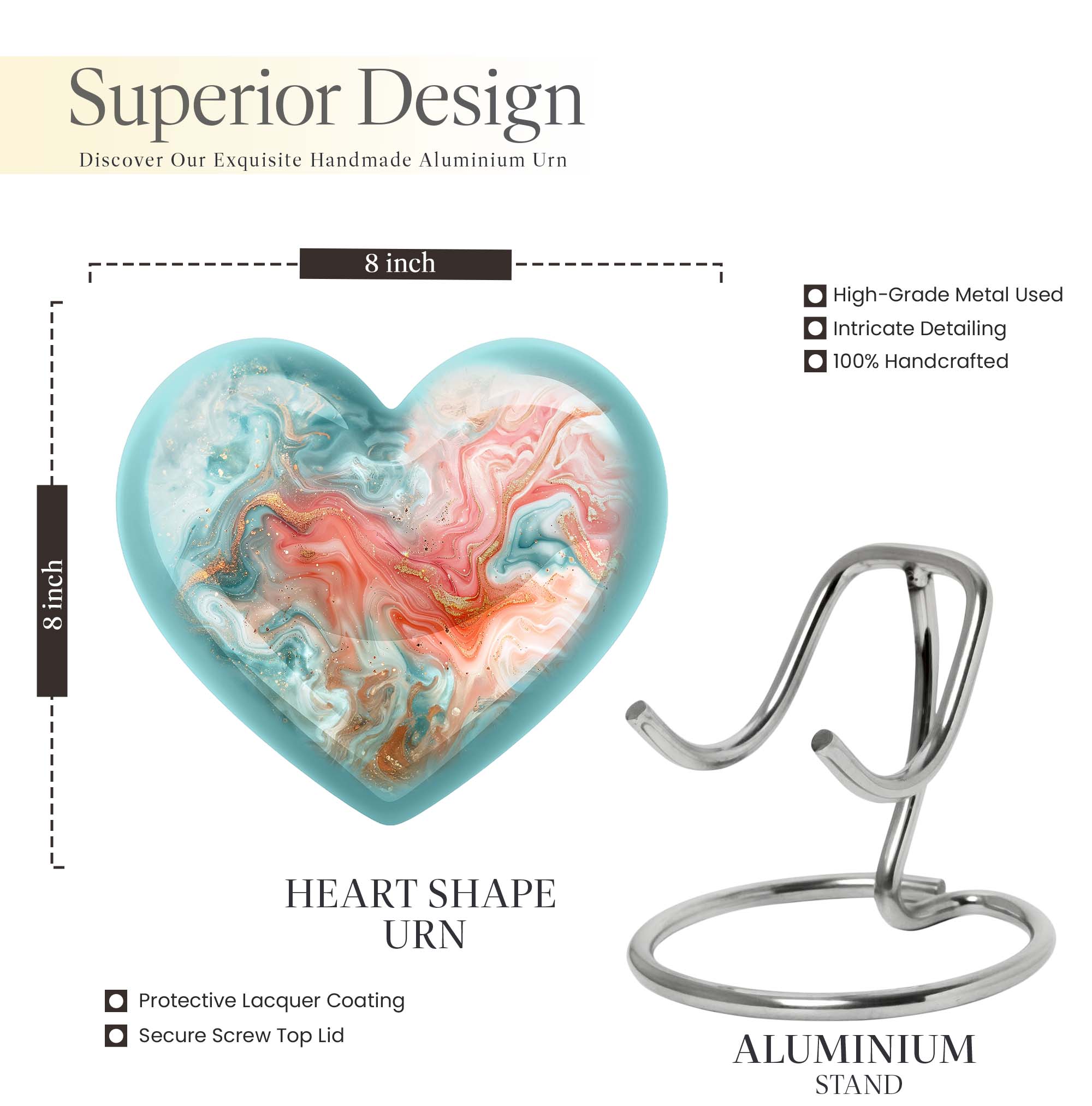 This 10-inch Abstract Heart Urn is a beautifully designed memorial urn, ideal for seniors and adults seeking an exceptional resting place for their loved ones. Made from durable Aluminium, this large urn can accommodate up to 200 cubic inches of human ashes, a respectful container for men or women. It weighs a solid 3.3 pounds and stands tall at 10 inches in height. The heart urn is embellished with an abstract theme, offering uniqueness and originality to its overall design. Your purchase includes a velvet pouch, providing a soft, gentle space for containment of ashes. Furthermore, there is an option to personalize this memorial urn with engraved names, adding a personal touch to this inescapable part of life. Opt for this abstract urn for a meaningful commemoration of your loved one. Includes keywords: memorial urns, abstract urn, urn for men & women ashes, adult human ashes urns, shaped urn, metal urns for human ashes.