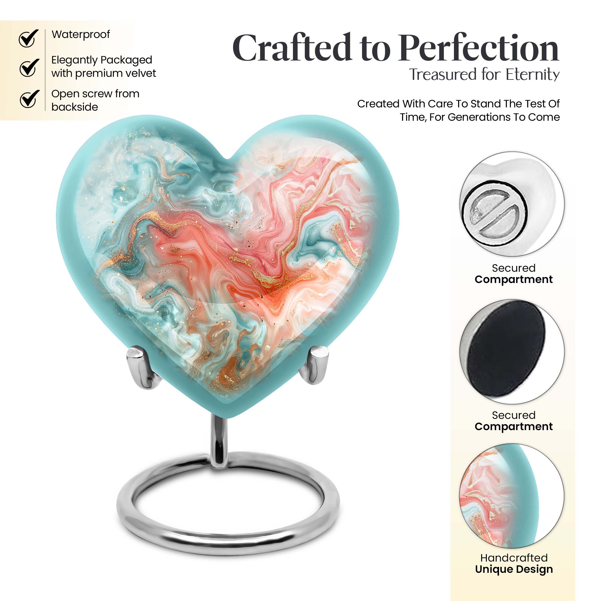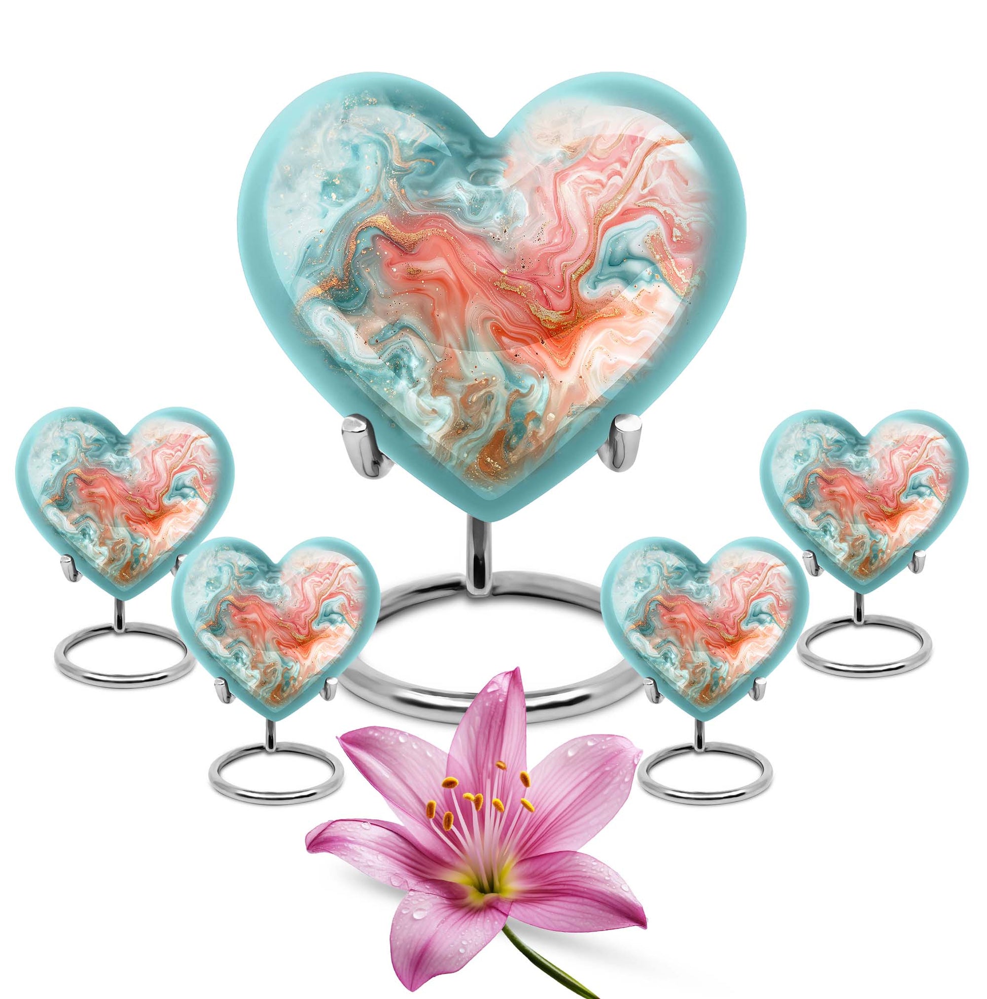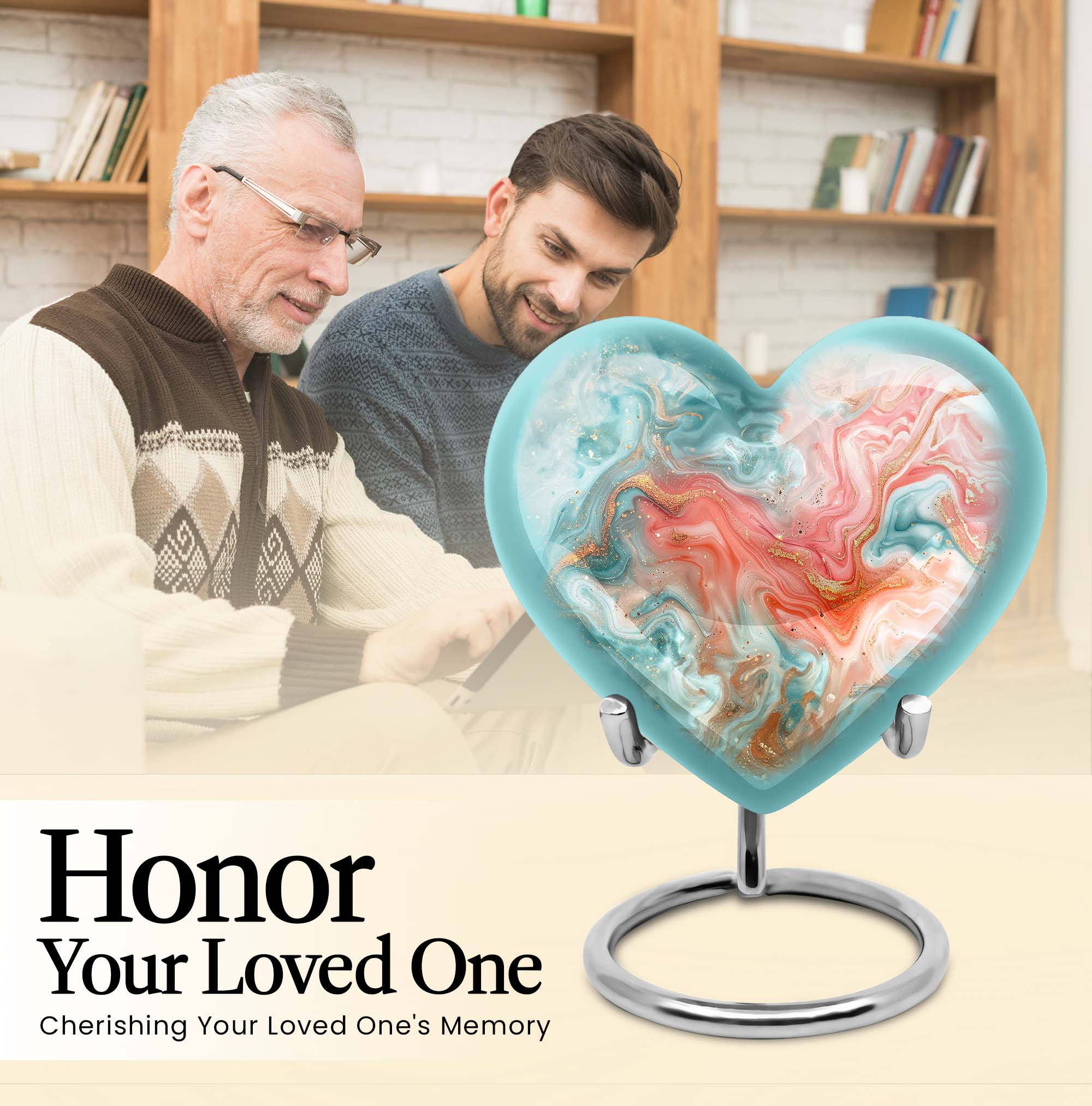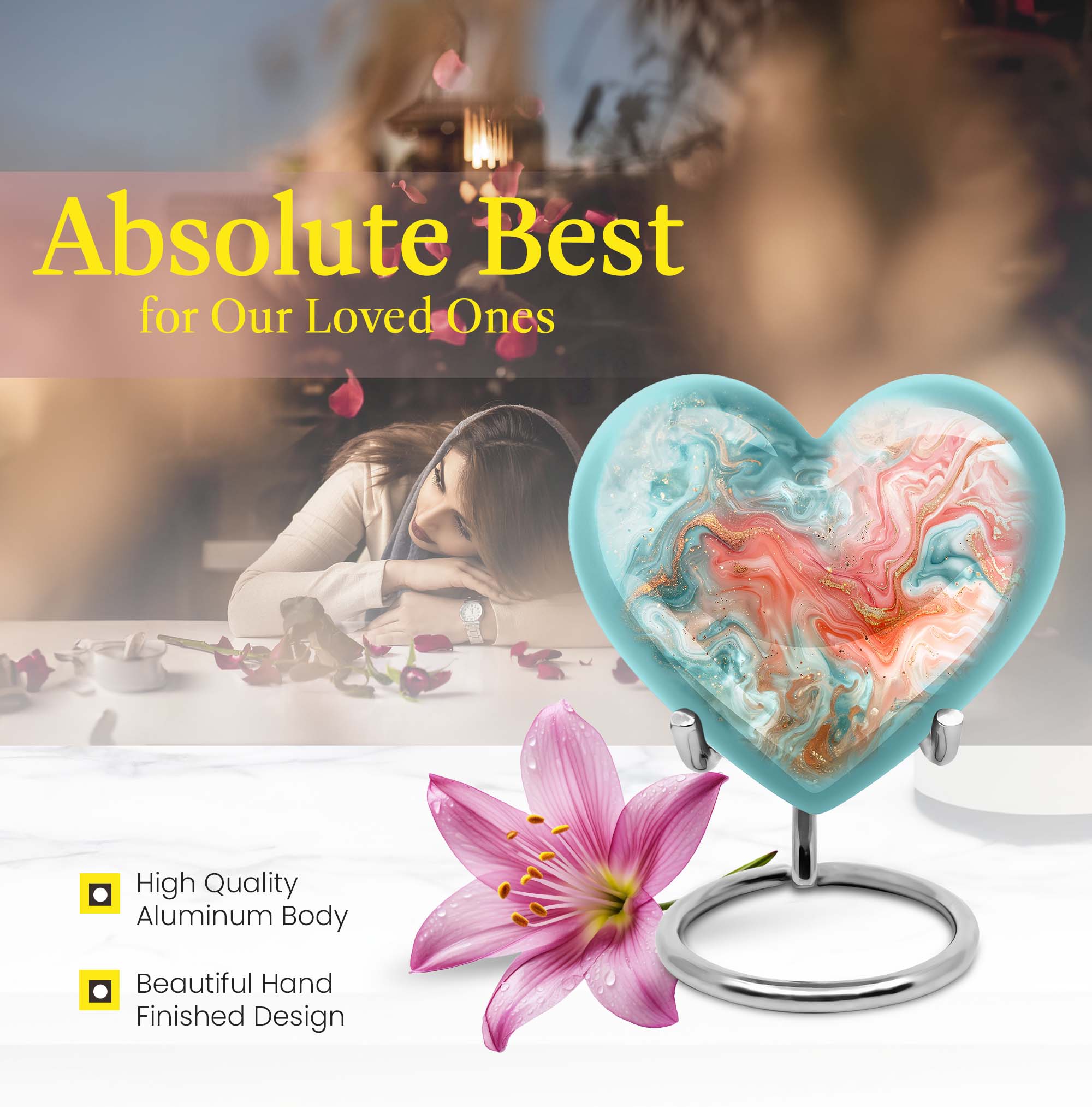 This 10-inch Abstract Heart Urn is a beautifully designed memorial urn, ideal for seniors and adults seeking an exceptional resting place for their loved ones. Made from durable Aluminium, this large urn can accommodate up to 200 cubic inches of human ashes, a respectful container for men or women. It weighs a solid 3.3 pounds and stands tall at 10 inches in height. The heart urn is embellished with an abstract theme, offering uniqueness and originality to its overall design. Your purchase includes a velvet pouch, providing a soft, gentle space for containment of ashes. Furthermore, there is an option to personalize this memorial urn with engraved names, adding a personal touch to this inescapable part of life. Opt for this abstract urn for a meaningful commemoration of your loved one. Includes keywords: memorial urns, abstract urn, urn for men & women ashes, adult human ashes urns, shaped urn, metal urns for human ashes.