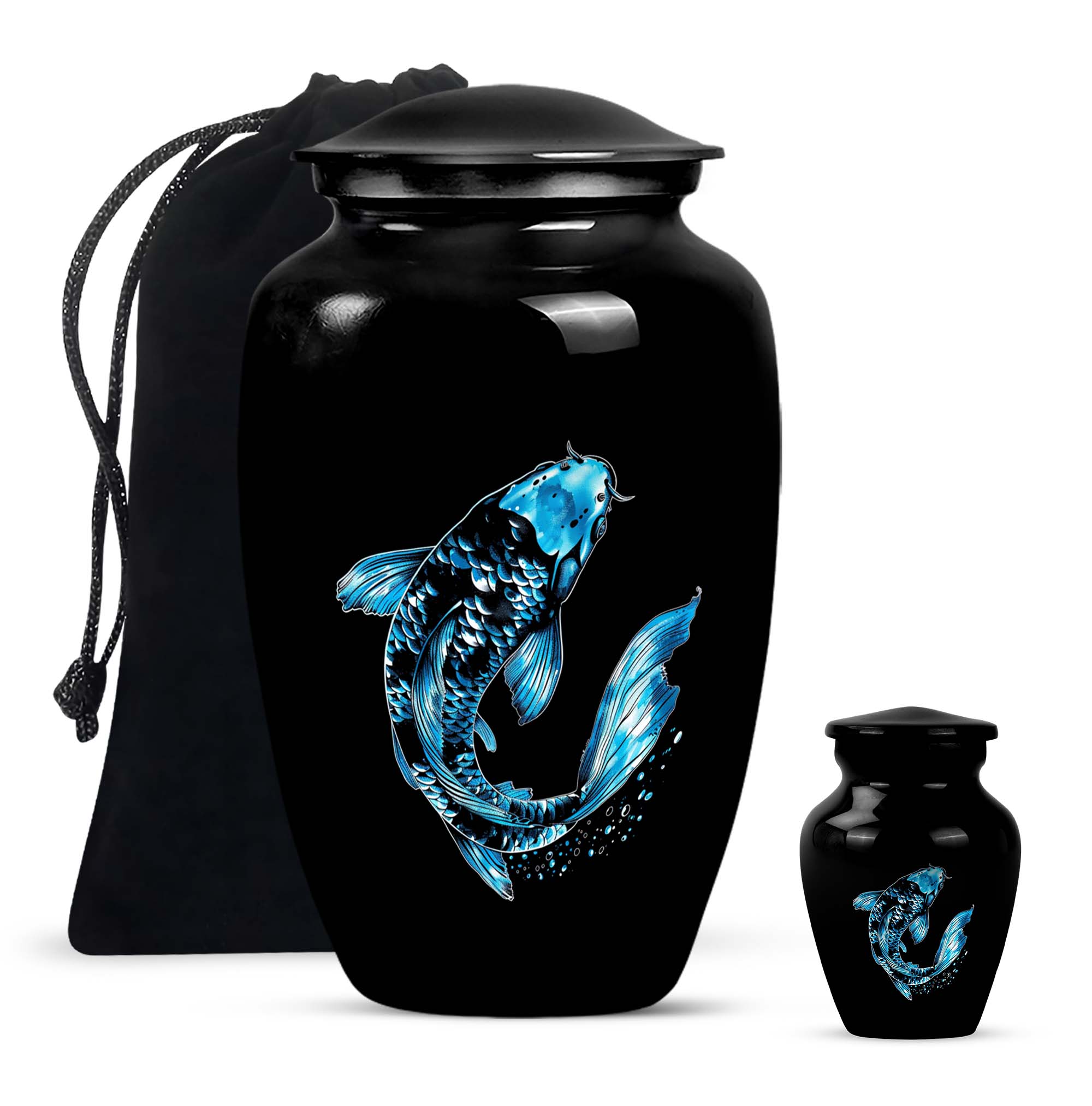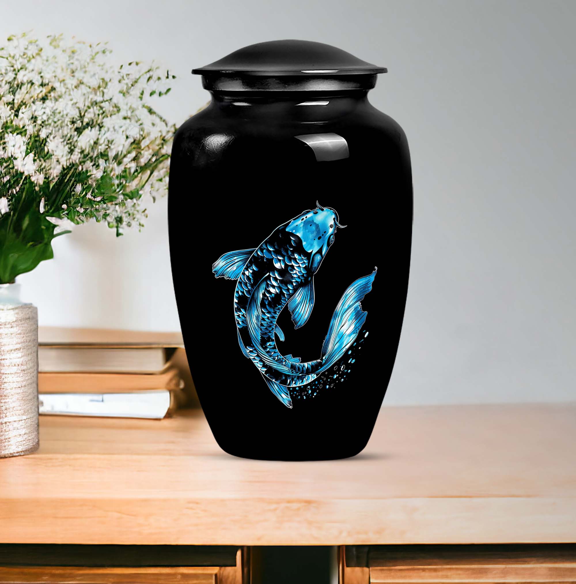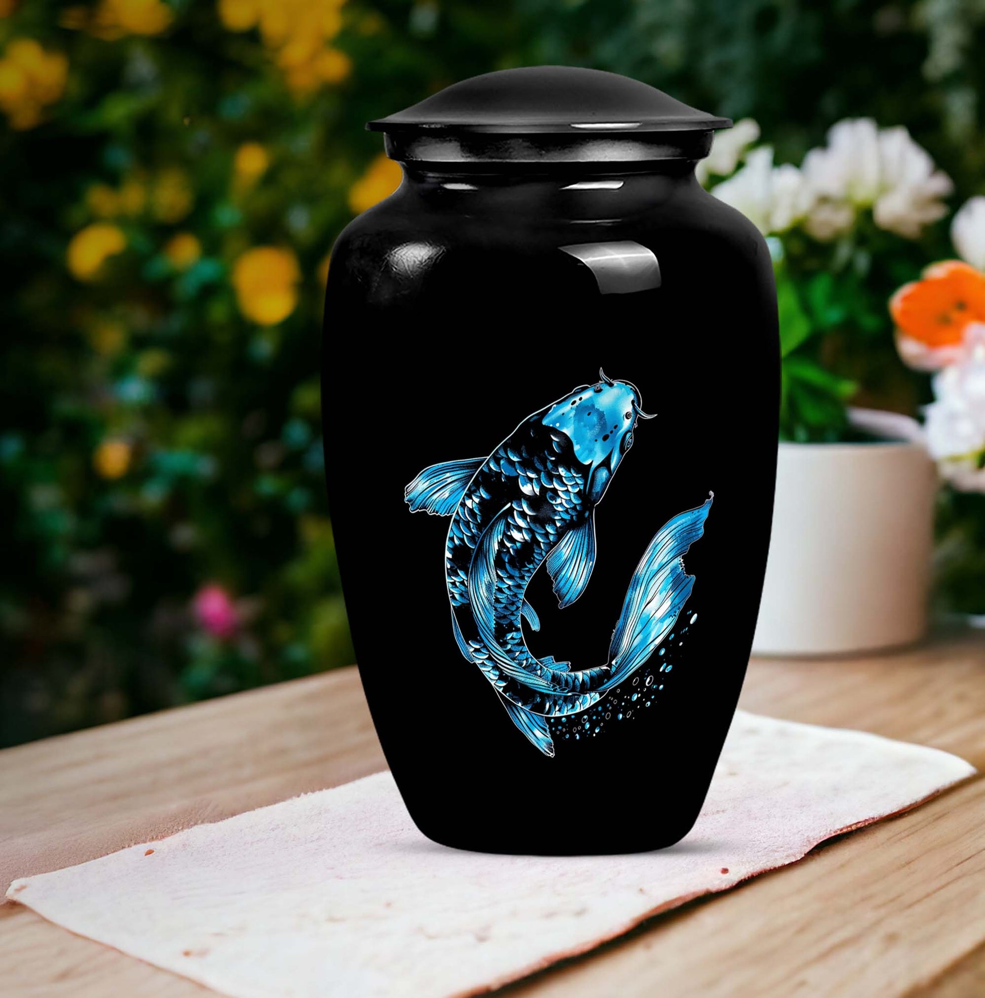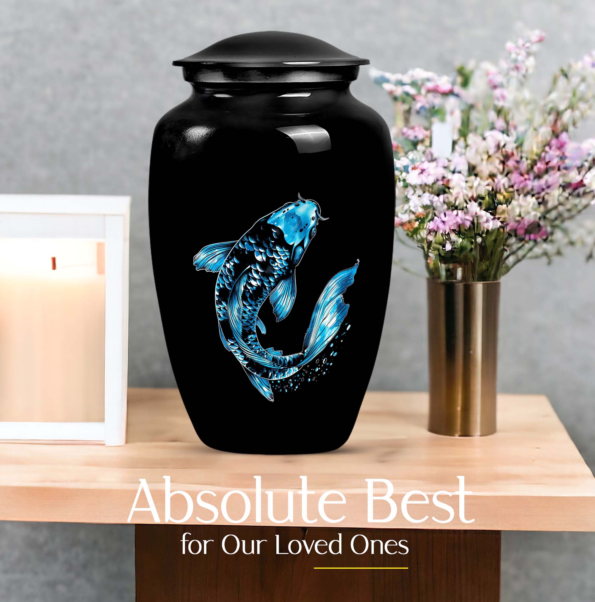 Experience a serene and noble token to honor your loved ones with this Classic Abstract Fish Urn. Precision crafted from high-grade Aluminum, this 10-inch burial urn for human ashes adult captivates with its unique abstract theme and sturdy build, weighing a substantial 3.3 pounds. The large urn offers an ample capacity of 200 cubic inches to safeguard the remnants of the departed. Personalize this exquisite cremation urn with engraved names, adding a touching commemoration to their cherished memory. The package also includes a plush velvet pouch, ensuring secure containment of the ashes. Highly sought after as funeral large and adult urns, this product symbolizes a heartwarming tribute to the departed. Infuse a profound sense of solemnity to your memorial ceremonies with this timeless fish urn, a dignified choice among cremation urns for human ashes men and cremation urns for adults.