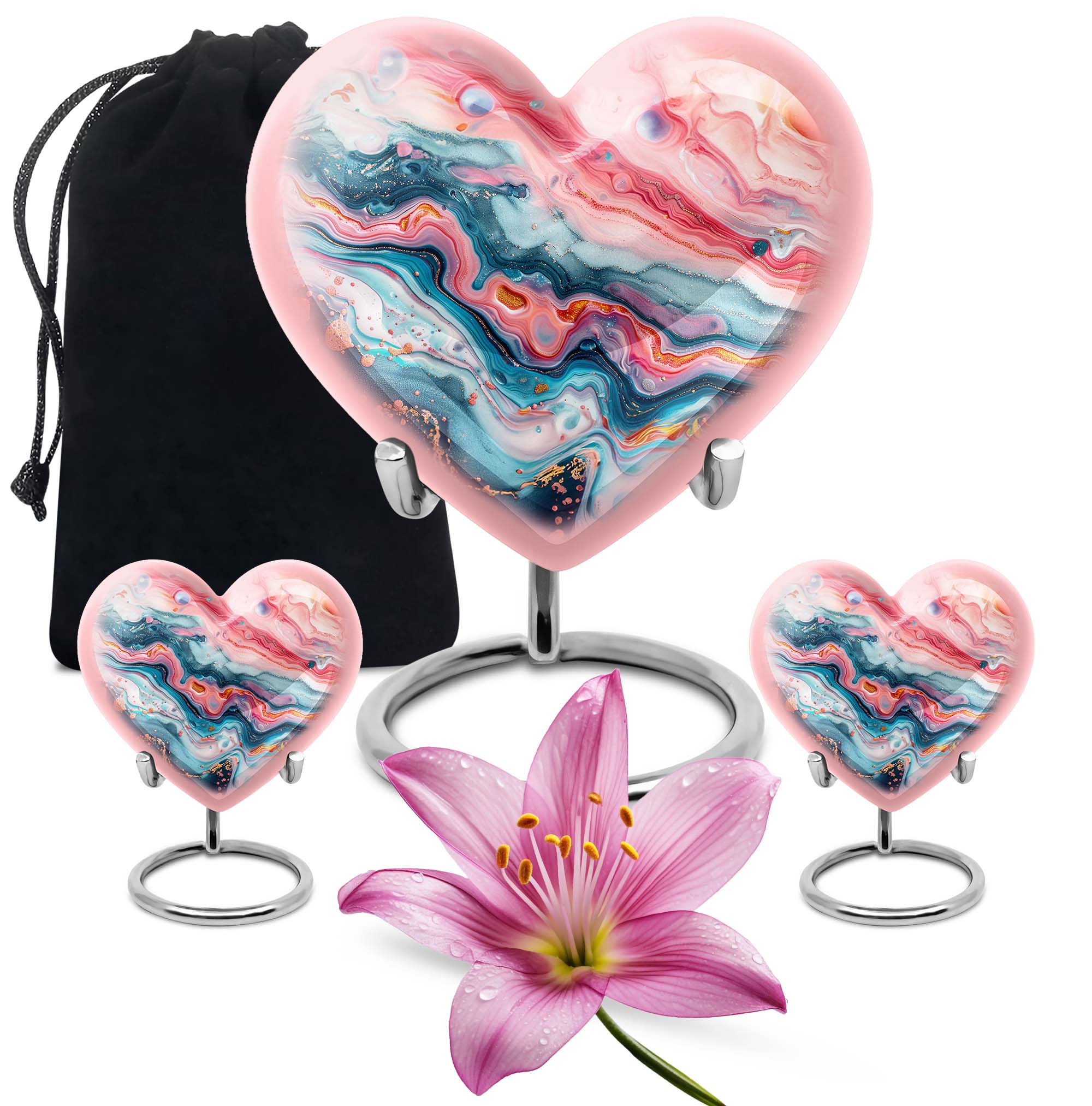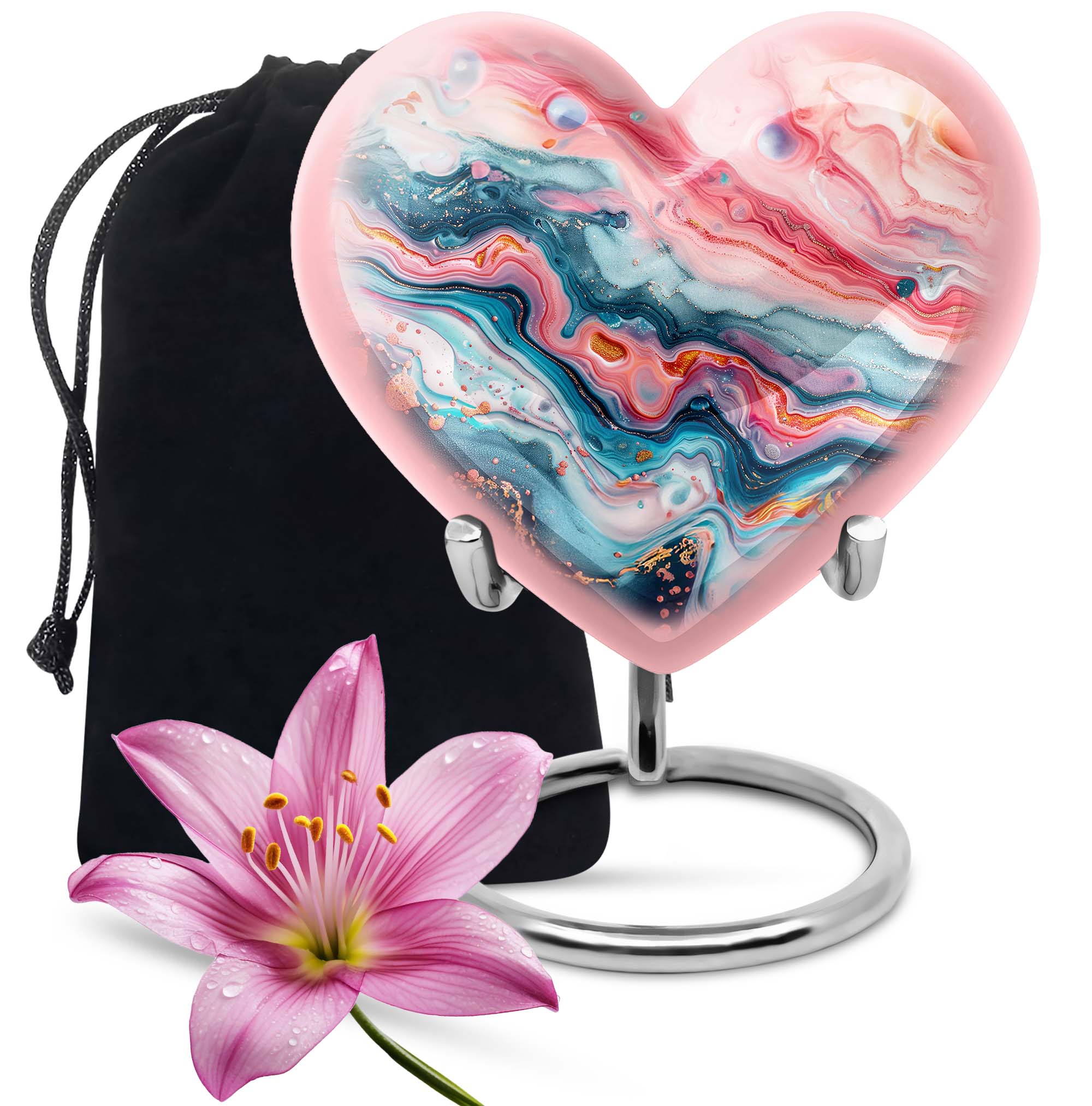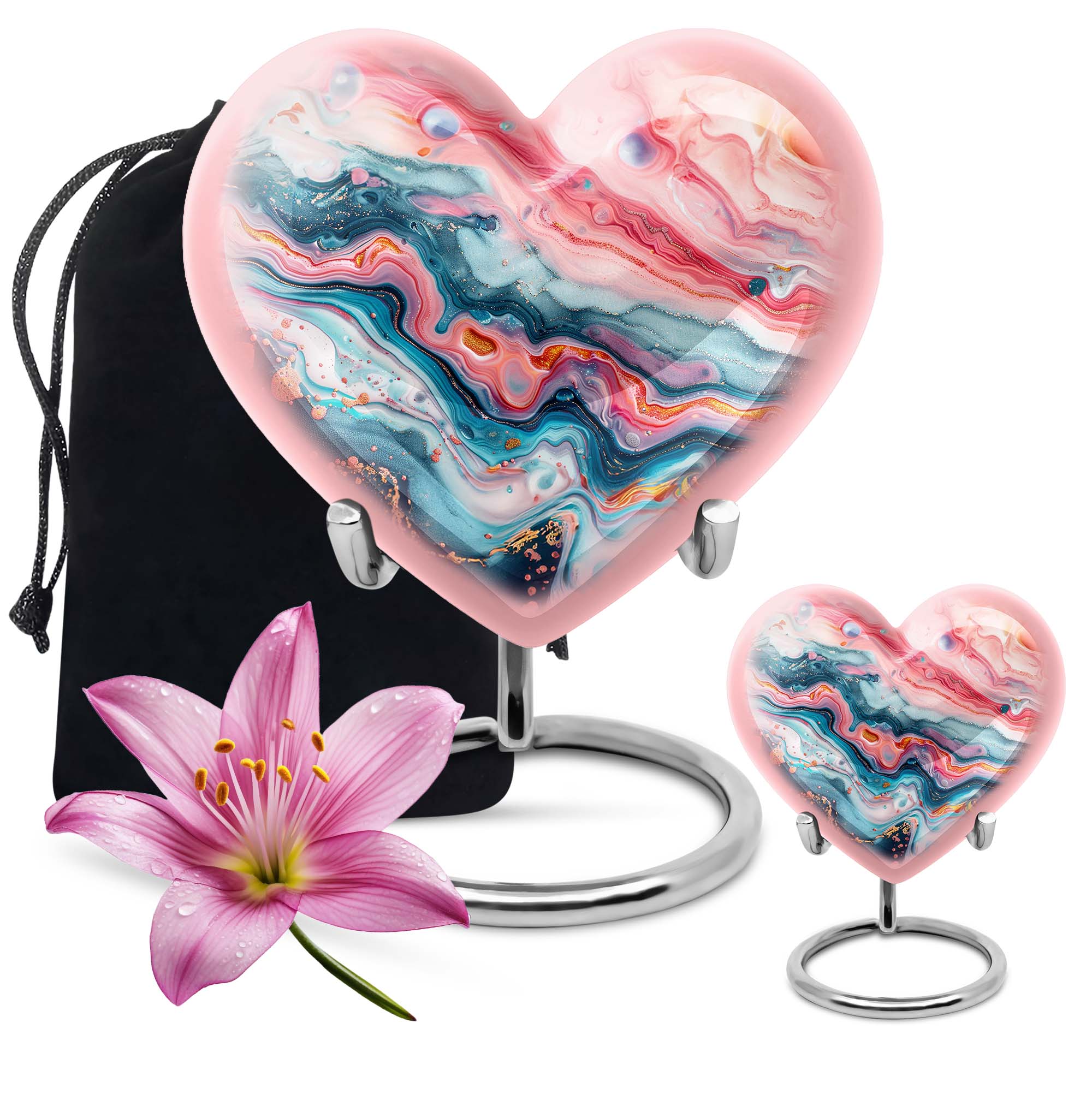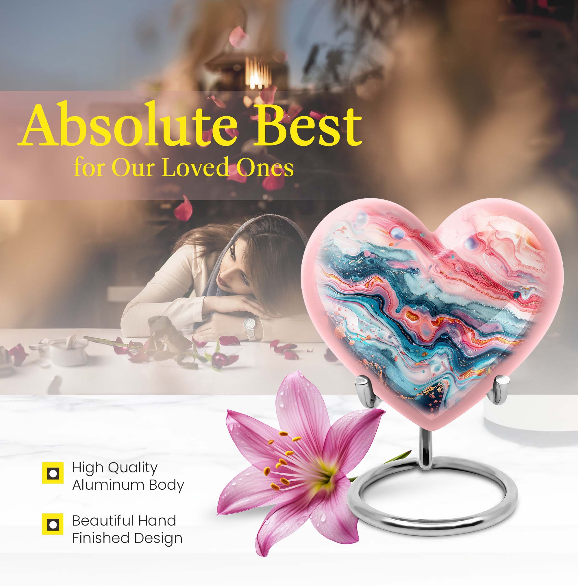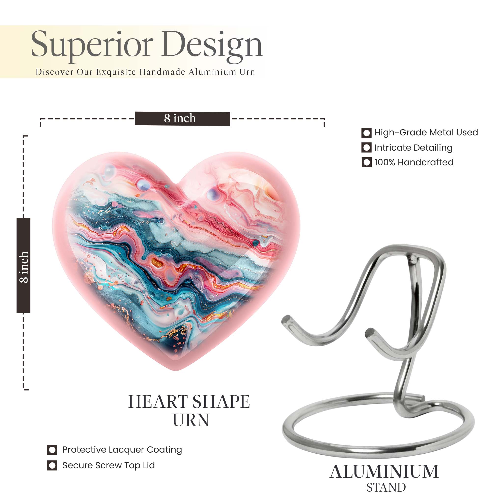 Our Abstract Heart Urn seamlessly integrates sentiment with a unique, modern appeal. This cremation urn measures a significant 10 inches, suitable for adults and seniors alike, and captures the essence of your loved one's persona. Crafted with excellence from aluminum, the urn weighs a stable 3.3 pounds and can hold up to 200 cubic inches of ashes in its embrace. It comes with a velvet pouch, ensuring respectful containment and preservation of ashes. A standout feature of this Large Urn is its extension into customization, enabling you to personalize it with engraved names, therefore adding a touching, intimate vibe to the commemoration. This urn not only serves its purpose but does so in an elegant manner, qualifying as an Affordable urn that maintains quality. Make your choice of burial urns for adult men ashes with our modern, abstract urn. For lovers of human urns that encapsulate memories in a sleek, iridescent metal design, our Abstract Heart Urn is an optimal choice.