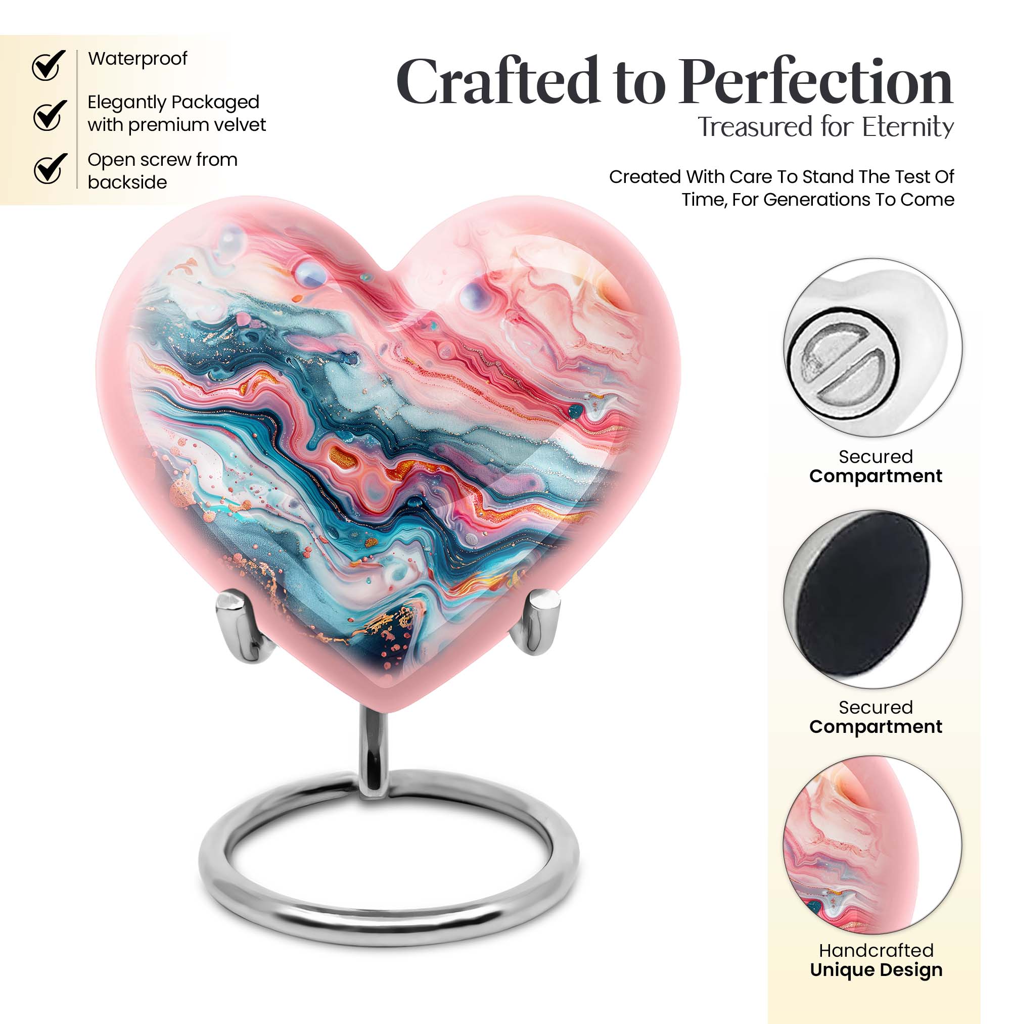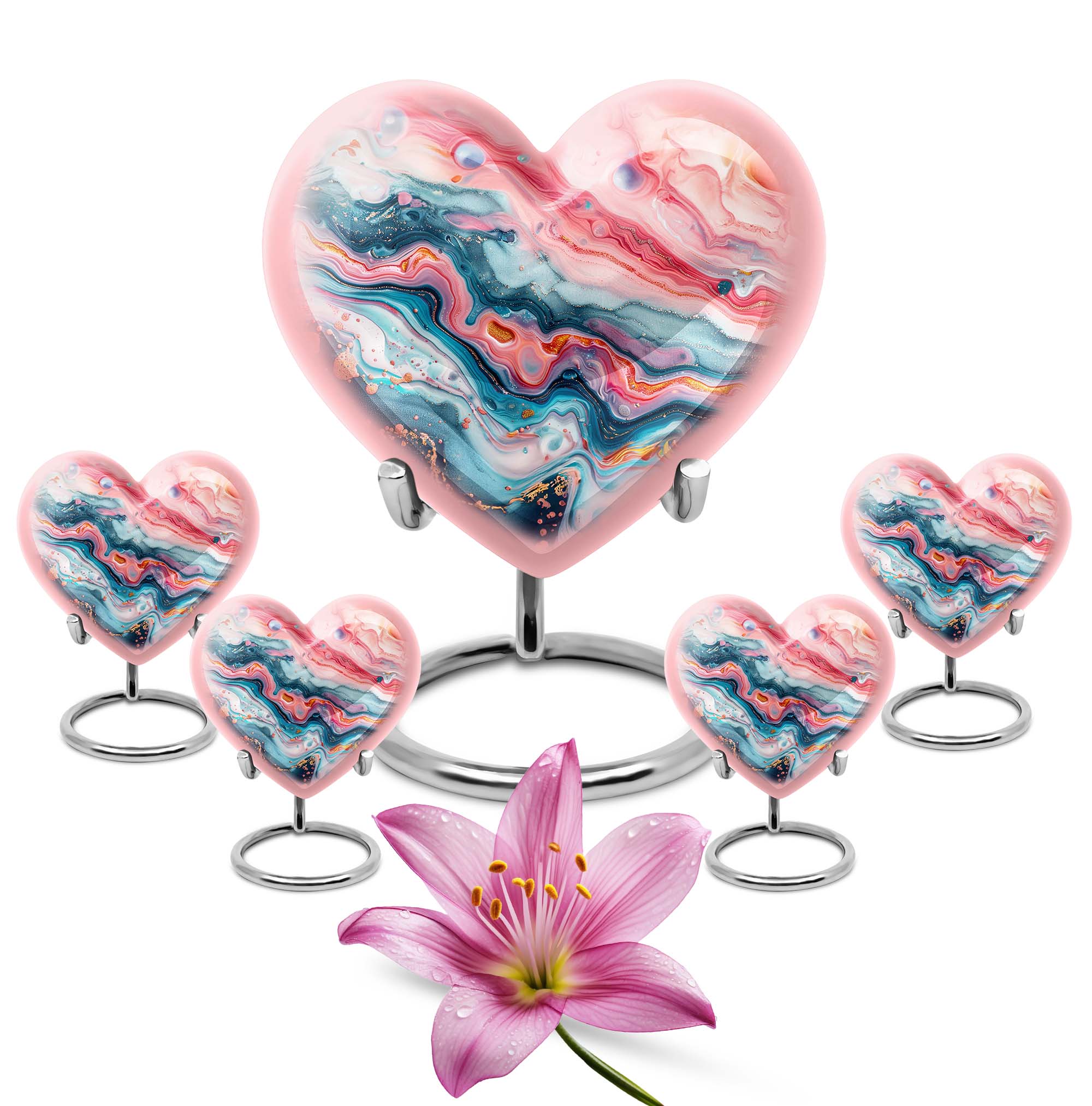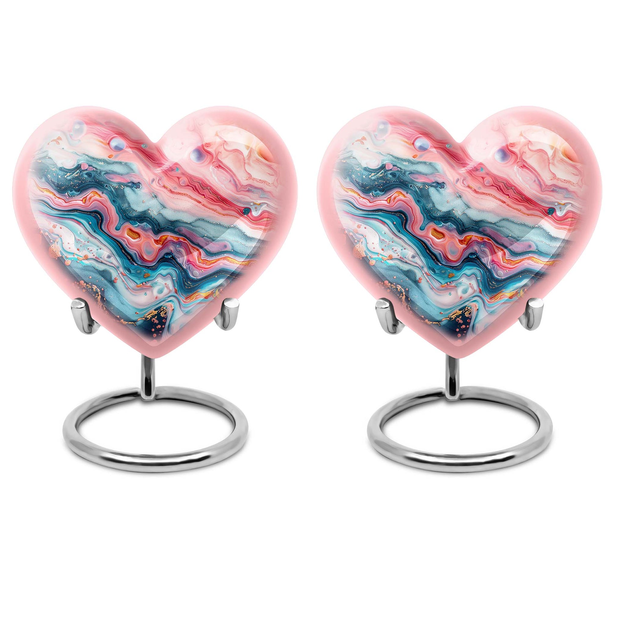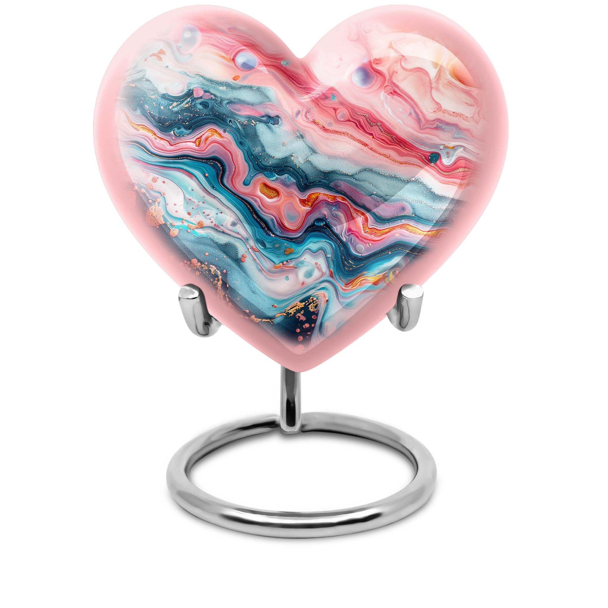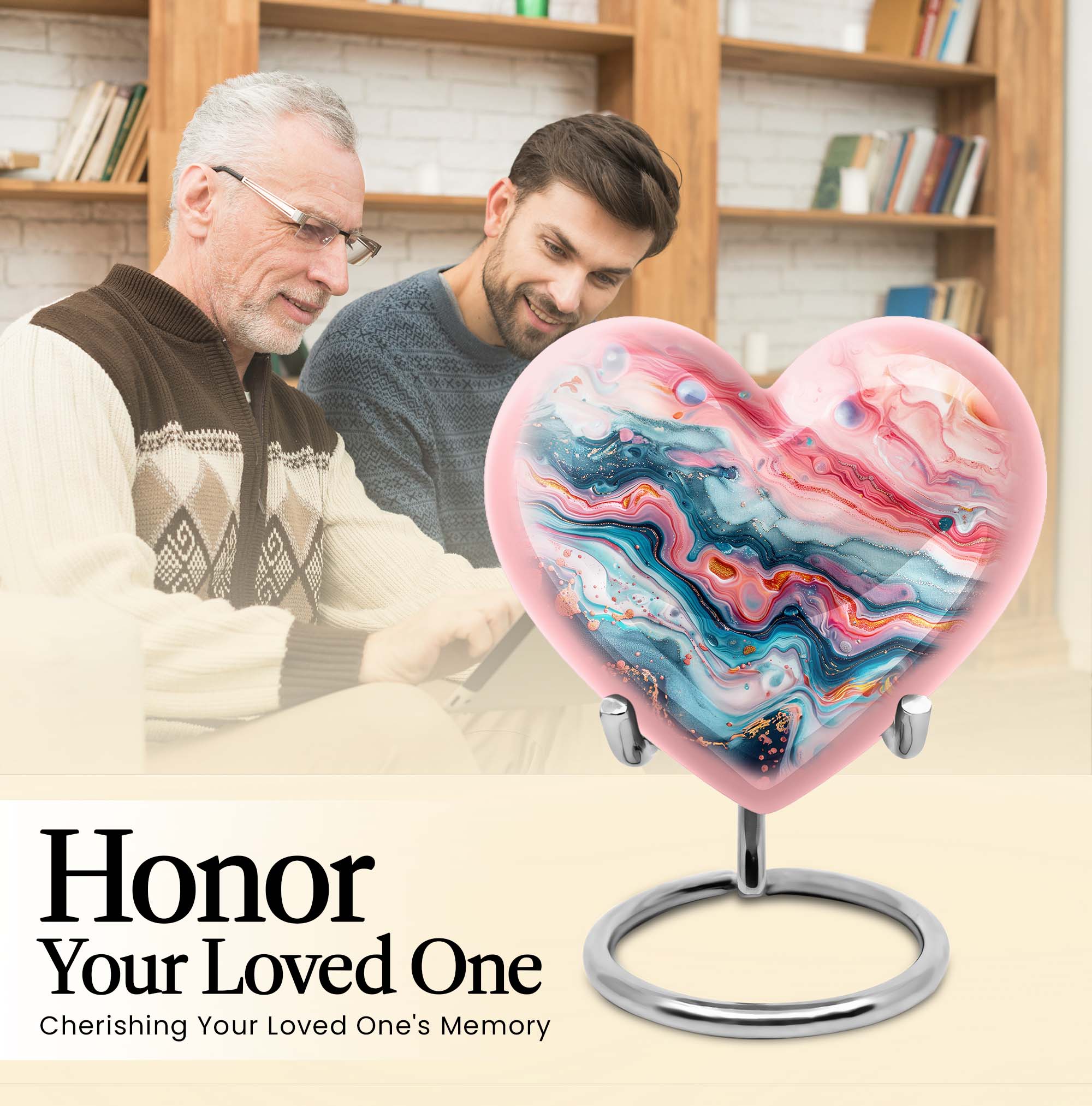 Our Abstract Heart Urn seamlessly integrates sentiment with a unique, modern appeal. This cremation urn measures a significant 10 inches, suitable for adults and seniors alike, and captures the essence of your loved one's persona. Crafted with excellence from aluminum, the urn weighs a stable 3.3 pounds and can hold up to 200 cubic inches of ashes in its embrace. It comes with a velvet pouch, ensuring respectful containment and preservation of ashes. A standout feature of this Large Urn is its extension into customization, enabling you to personalize it with engraved names, therefore adding a touching, intimate vibe to the commemoration. This urn not only serves its purpose but does so in an elegant manner, qualifying as an Affordable urn that maintains quality. Make your choice of burial urns for adult men ashes with our modern, abstract urn. For lovers of human urns that encapsulate memories in a sleek, iridescent metal design, our Abstract Heart Urn is an optimal choice.