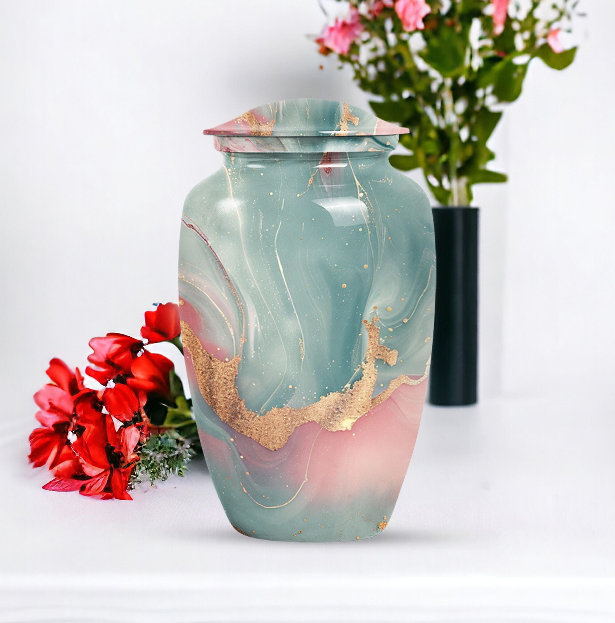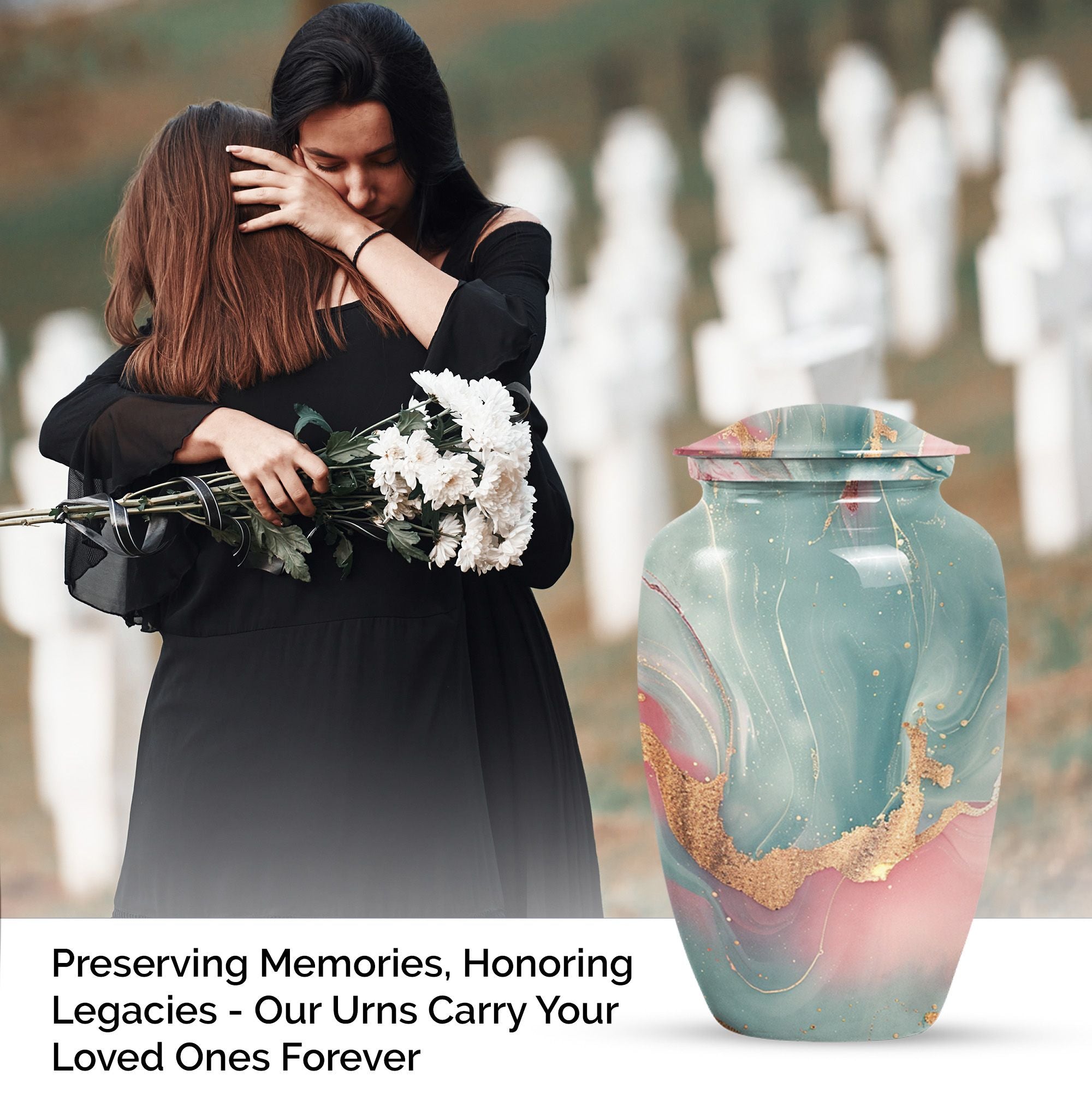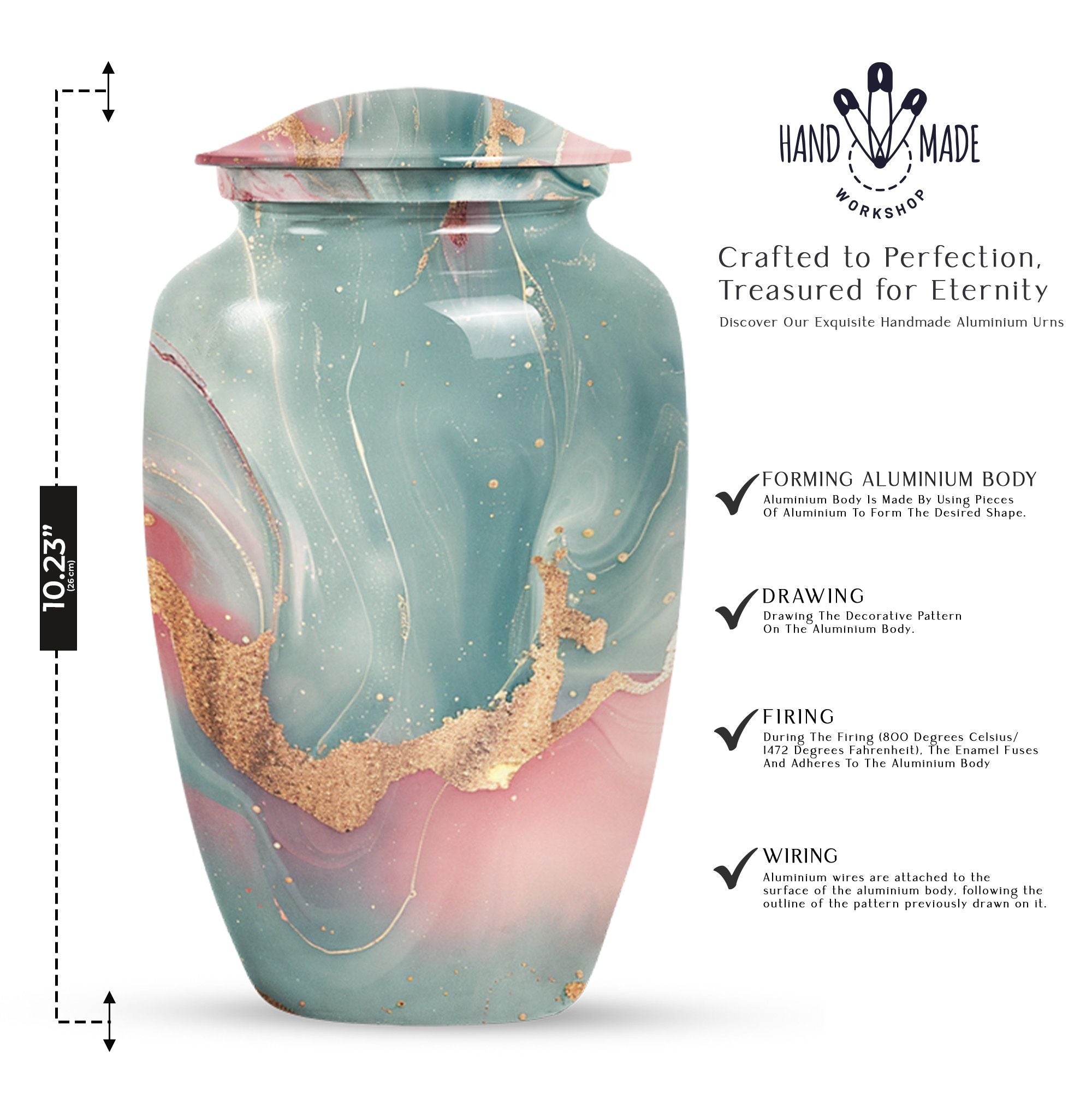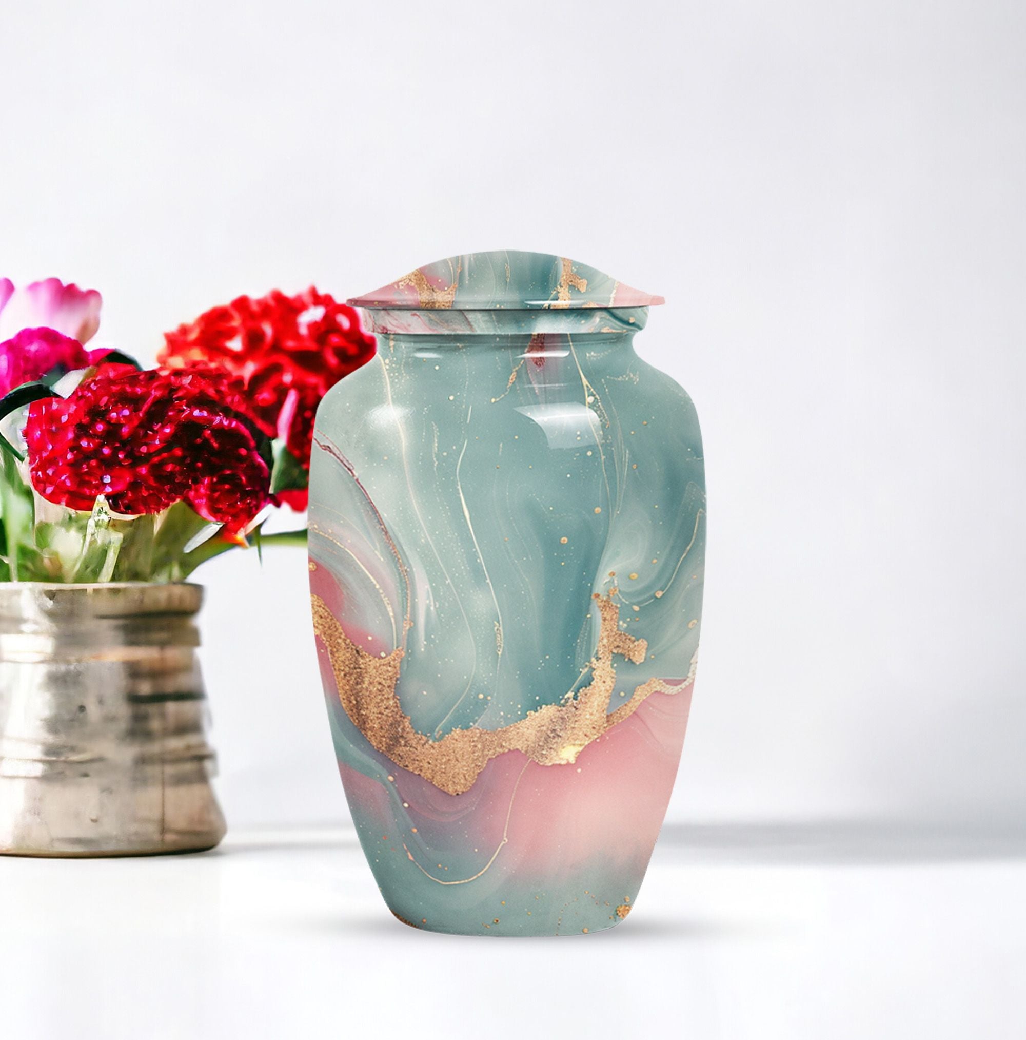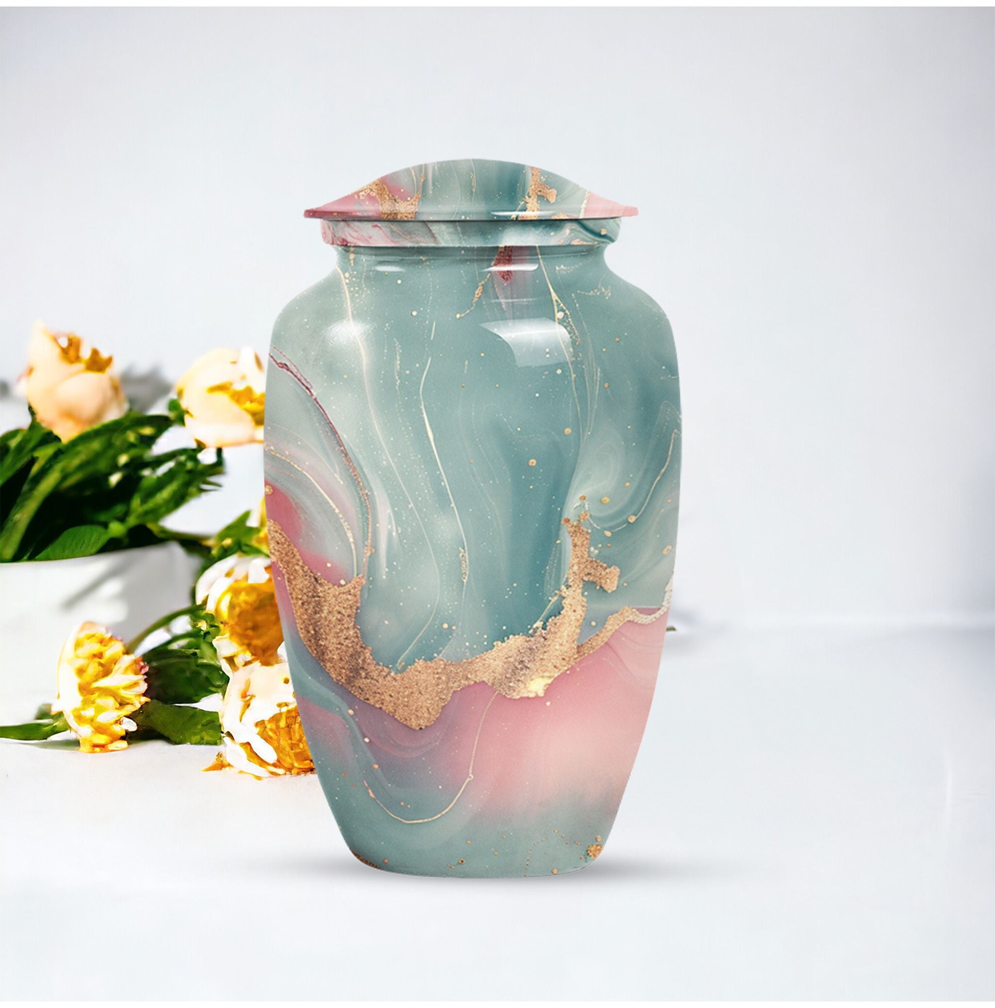 Discover a dignified and solemn tribute to celebrate the memory of a loved one with our Abstract Urn. Expertly crafted from high-quality aluminium, it is not just a cremation urn - but a testament to life well lived. Standing at a respectful 10 inches in height, it has a purposeful weight of 3.3 pounds, and an accommodating capacity of 200 cubic inches, suitable for an adult male. Acknowledge the uniqueness and individuality of those who have passed on with the ability to personalize the piece with engraved names. Each urn comes with a velvet pouch for the dignified containment of ashes. This product, finding its place in the large urns category, is perfect for burial in-ground or keeping at home. Our urn invokes a sense of the abstract theme, opening up conversations and reminding us that each life is a beautiful, complex tapestry. When you search for 'burial urns for men & women ashes', or 'funeral metal urn', our abstract urn is a fitting choice, imbuing reverence and respect.