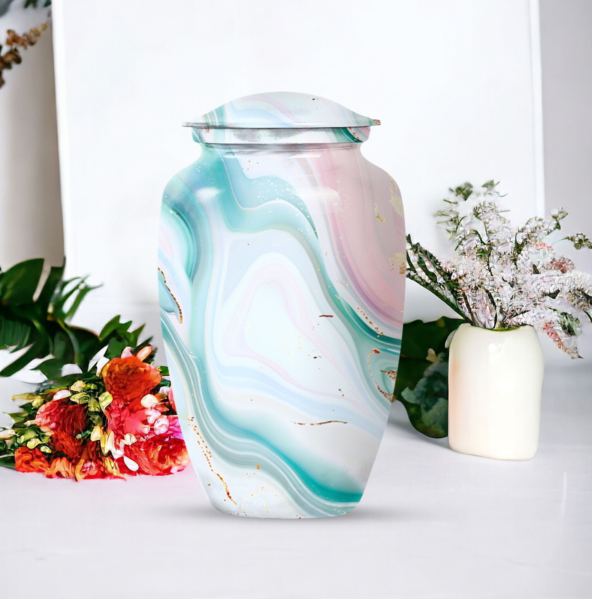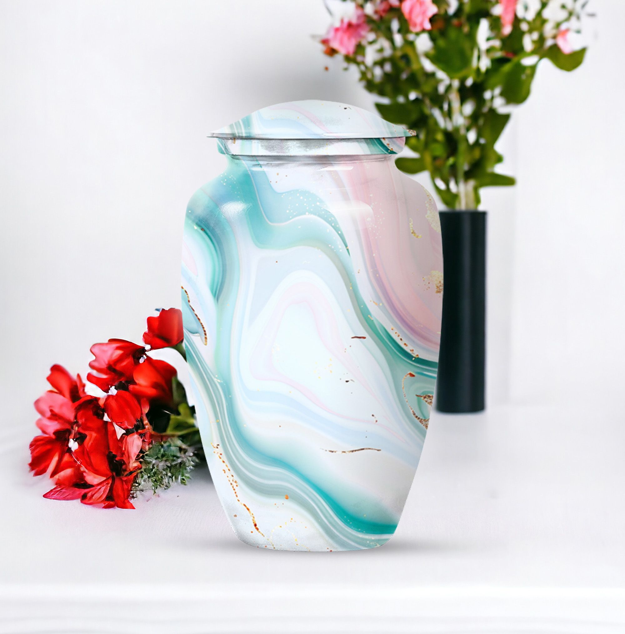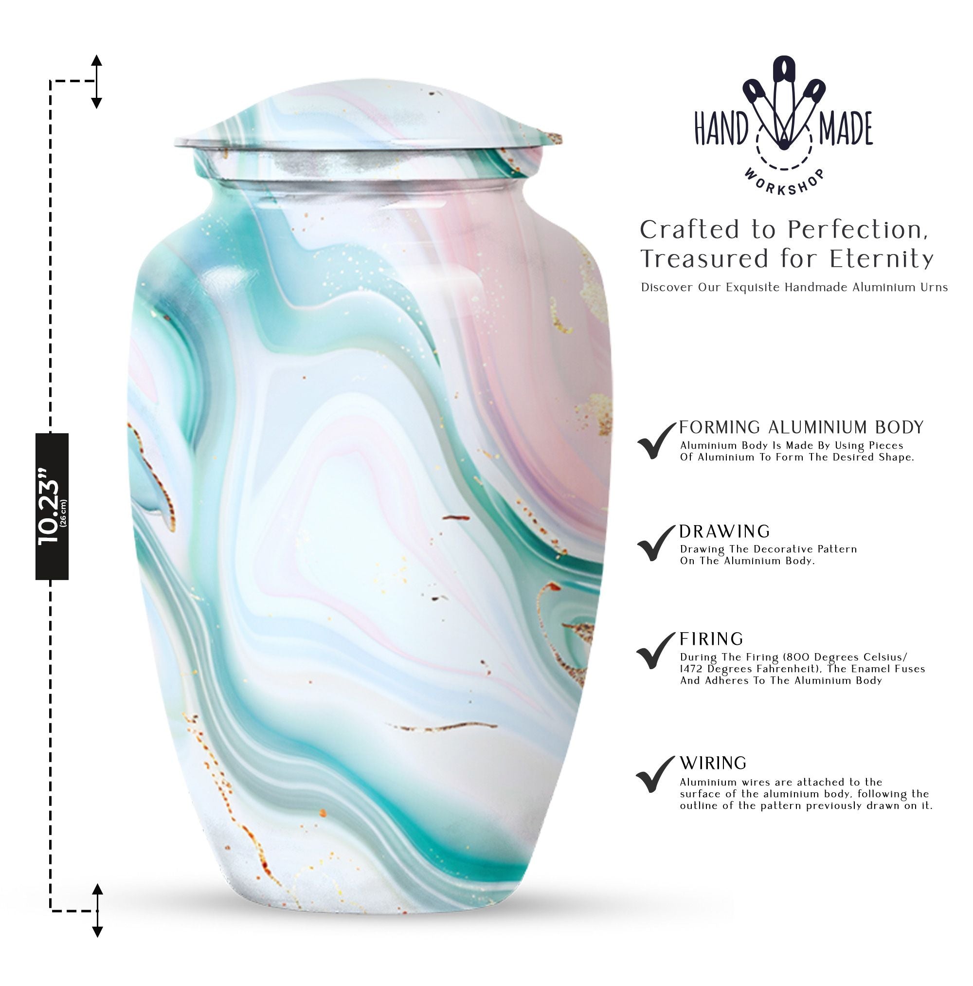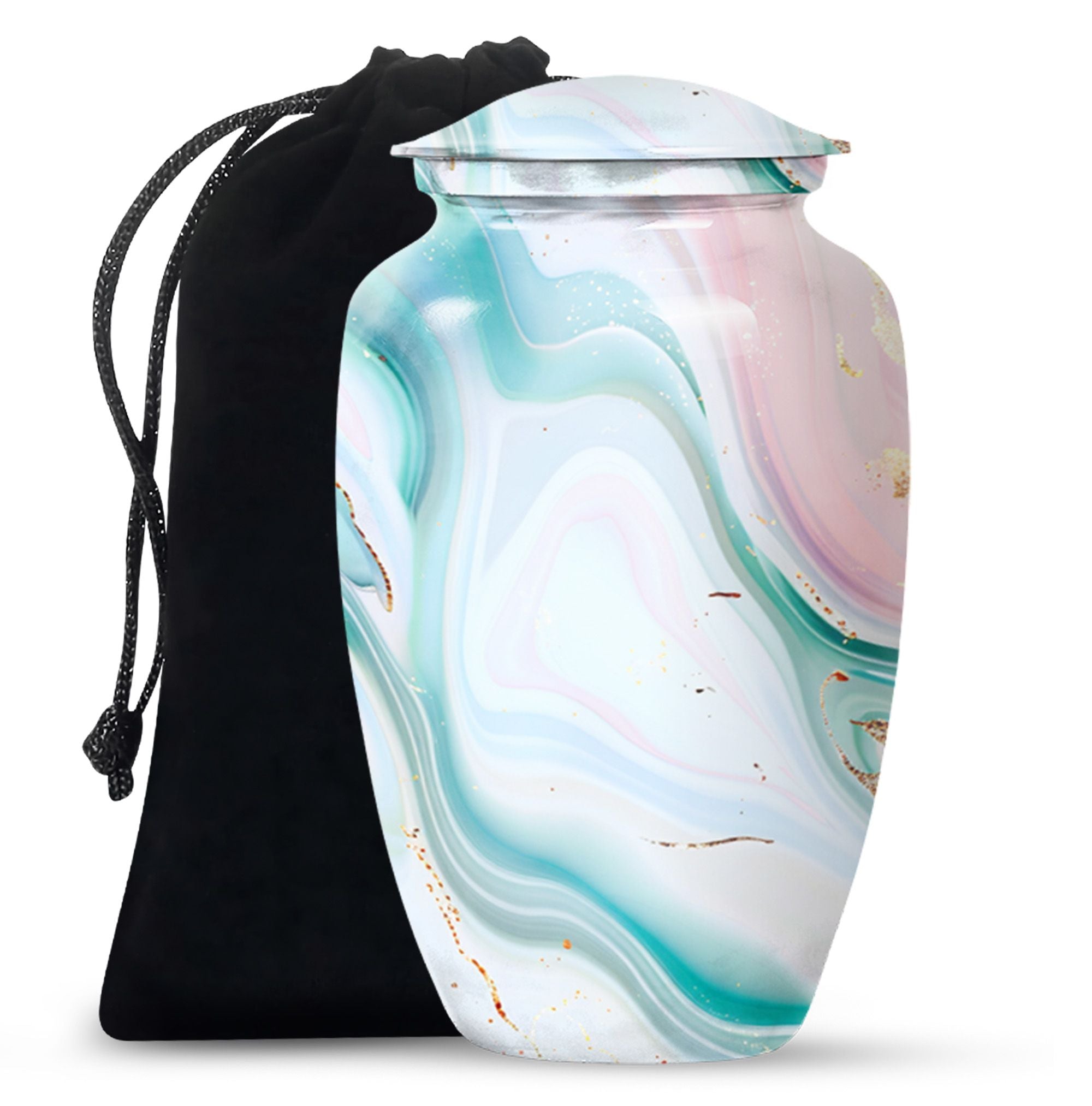 Discover the Abstract Urn, a tribute to your loved one that marries quality and timeless design. Crafted with precision from durable Aluminium, this large urn stands 10 inches tall and can hold up to 200 cubic inches of ashes, making it a fitting memorial urn for ashes from an adult male or female. The urn is 3.3 pounds in weight, demonstrating its substantive and steadfast nature. It comes in an alluring classic urn style, aligning with the theme of abstraction. One of the prime features that set this cremation urn apart from ordinary funeral urns for human ashes is the opportunity for personalization. Make this urn your own by adding engraved names, a thoughtful way to remember your loved one. It also includes a velvet pouch for respectful containment of ashes. This urn goes beyond being a mere funeral decor; it serves as a tangible memory of shared times and a symbol of eternal peace. Navigate grief with the comforting presence of this Abstract Urn.