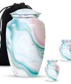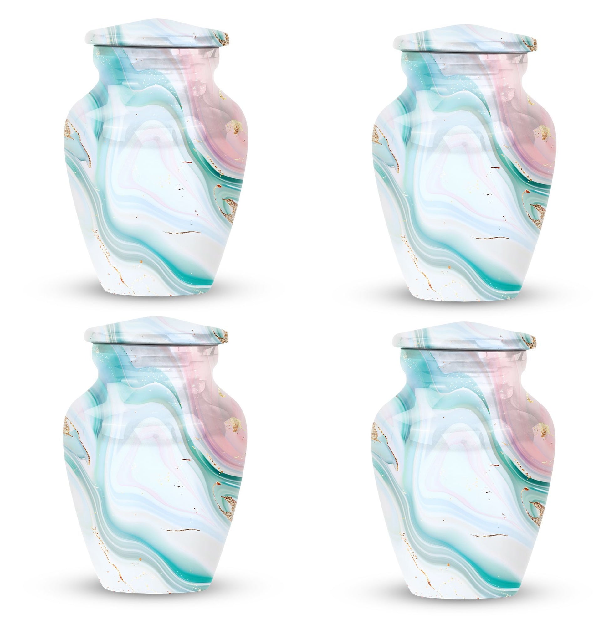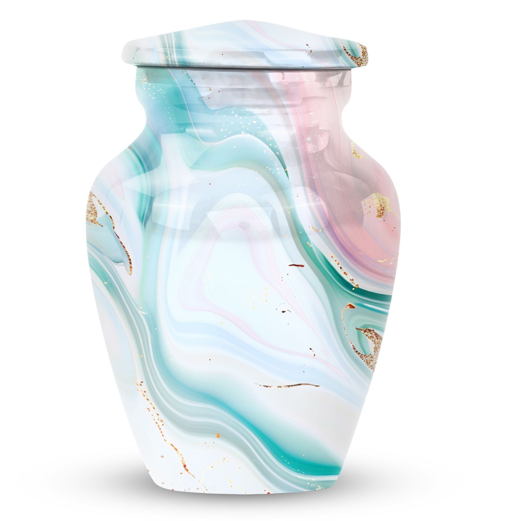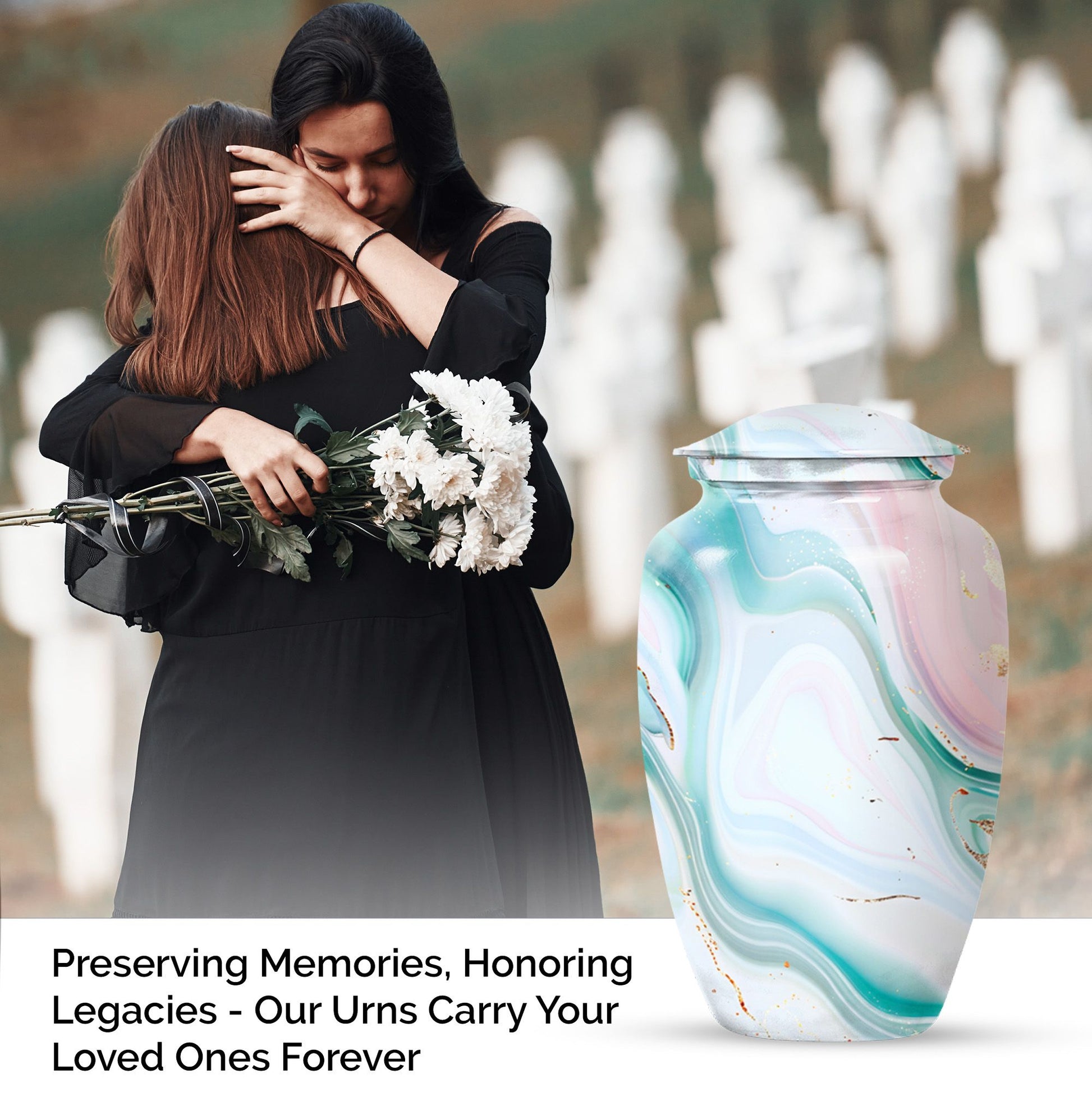 Discover the Abstract Urn, a tribute to your loved one that marries quality and timeless design. Crafted with precision from durable Aluminium, this large urn stands 10 inches tall and can hold up to 200 cubic inches of ashes, making it a fitting memorial urn for ashes from an adult male or female. The urn is 3.3 pounds in weight, demonstrating its substantive and steadfast nature. It comes in an alluring classic urn style, aligning with the theme of abstraction. One of the prime features that set this cremation urn apart from ordinary funeral urns for human ashes is the opportunity for personalization. Make this urn your own by adding engraved names, a thoughtful way to remember your loved one. It also includes a velvet pouch for respectful containment of ashes. This urn goes beyond being a mere funeral decor; it serves as a tangible memory of shared times and a symbol of eternal peace. Navigate grief with the comforting presence of this Abstract Urn.