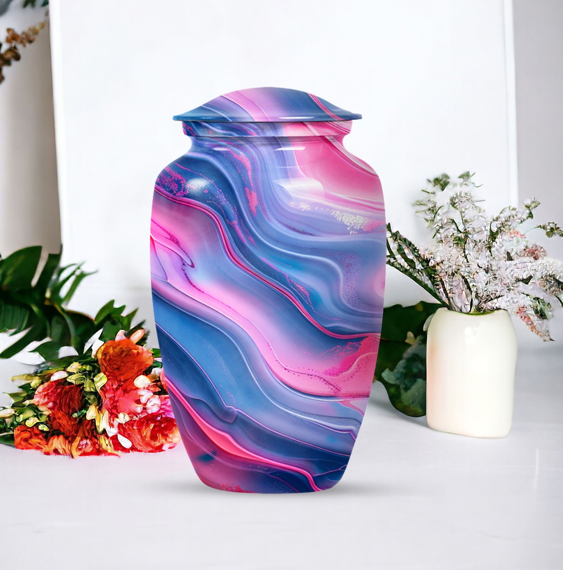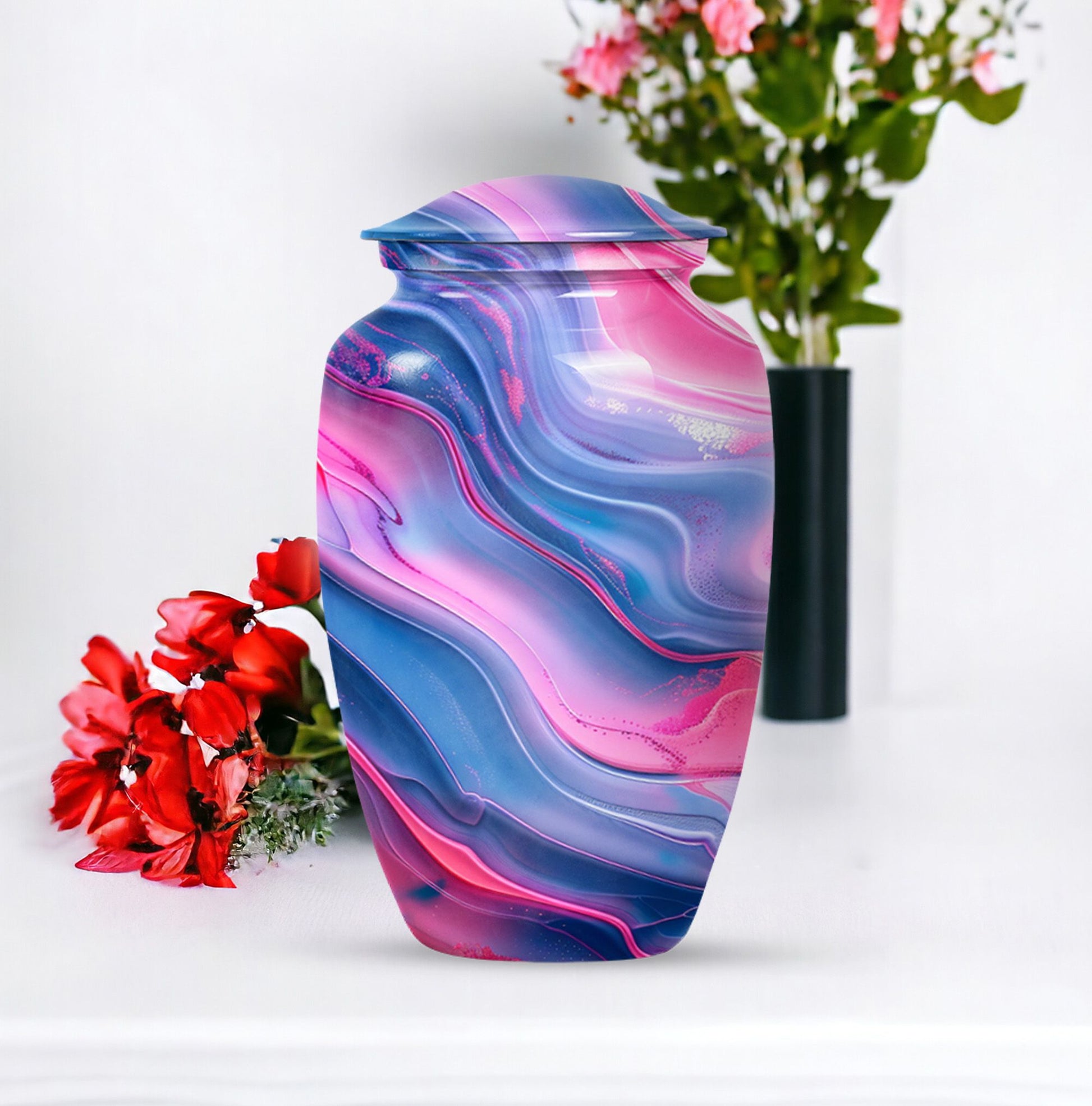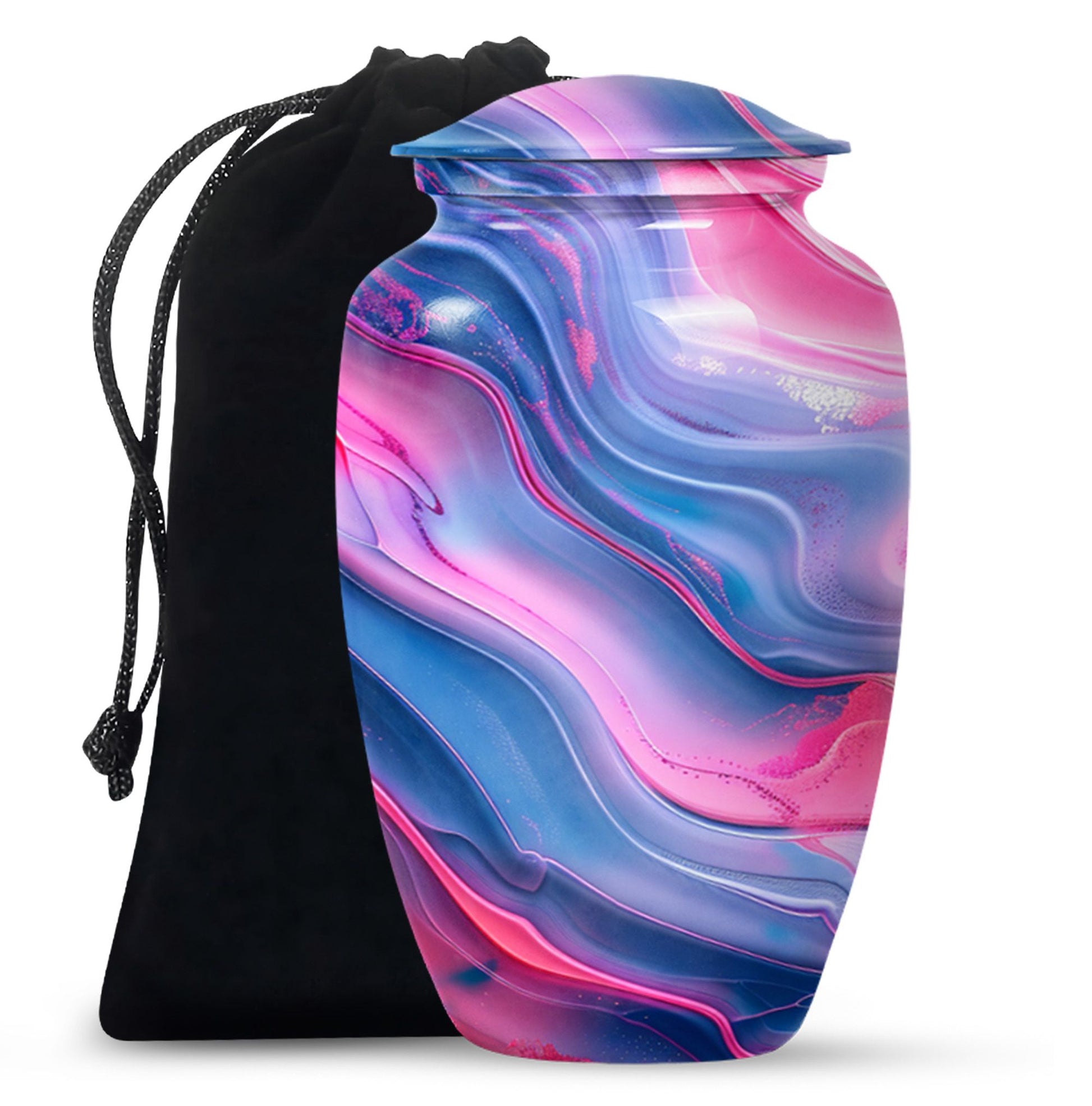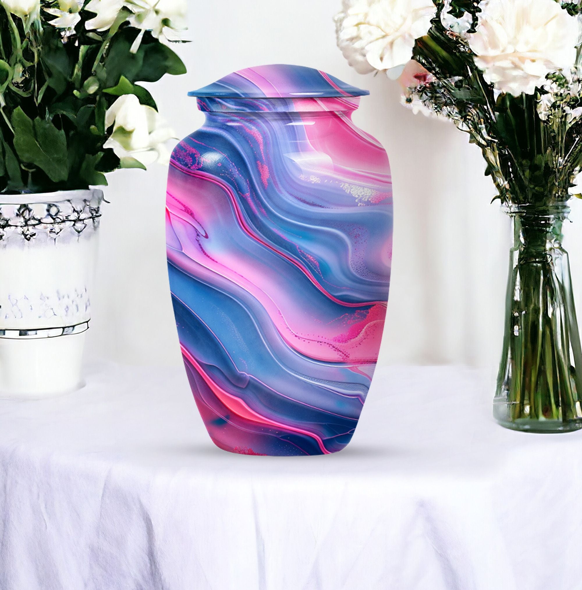 Cherish the memory of your special someone with this exquisite Abstract Urn. This large, 10-inch urn has been meticulously crafted from durable aluminium, ensuring long-lasting remembrance. Its pristine, 200 cubic inch capacity provides a thoughtful resting place for the ashes of an adult female. Weighing 3.3 pounds, the urn is compact enough to be discreetly located anywhere in your home. The abstract theme imbues the urn with a sense of sophistication, yet the quintessential classic urn design is ever-present. Personalize your memorial urn with engraved names, adding that much-needed personal touch to a difficult farewell. The product also includes a velvet pouch, providing a delicate containment for the ashes and a respectful acknowledgment of your loved one's life. As a leading product in memorial ceremony supplies, this urn is more than a shape box for gifts; it's a heartfelt tribute.