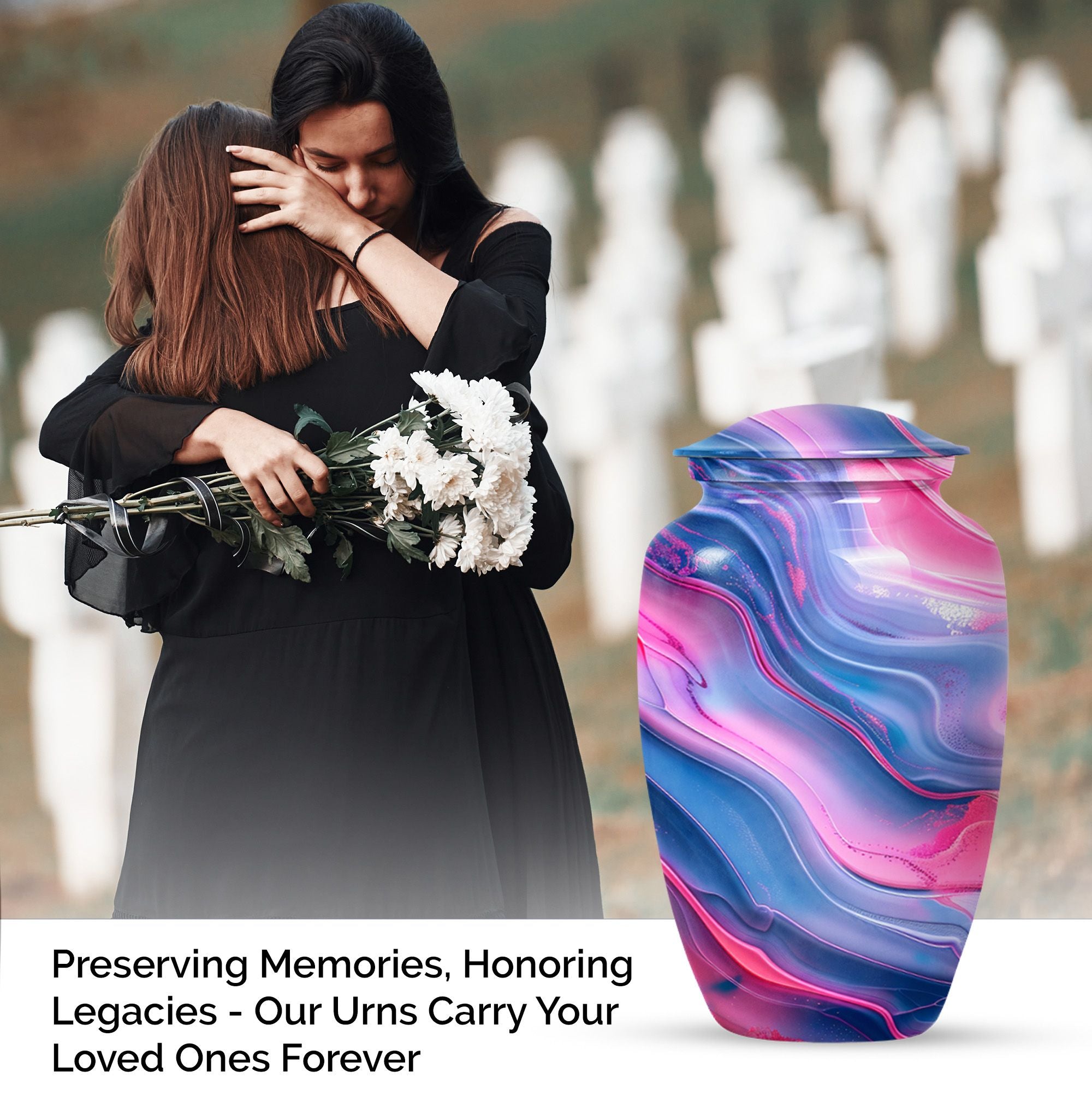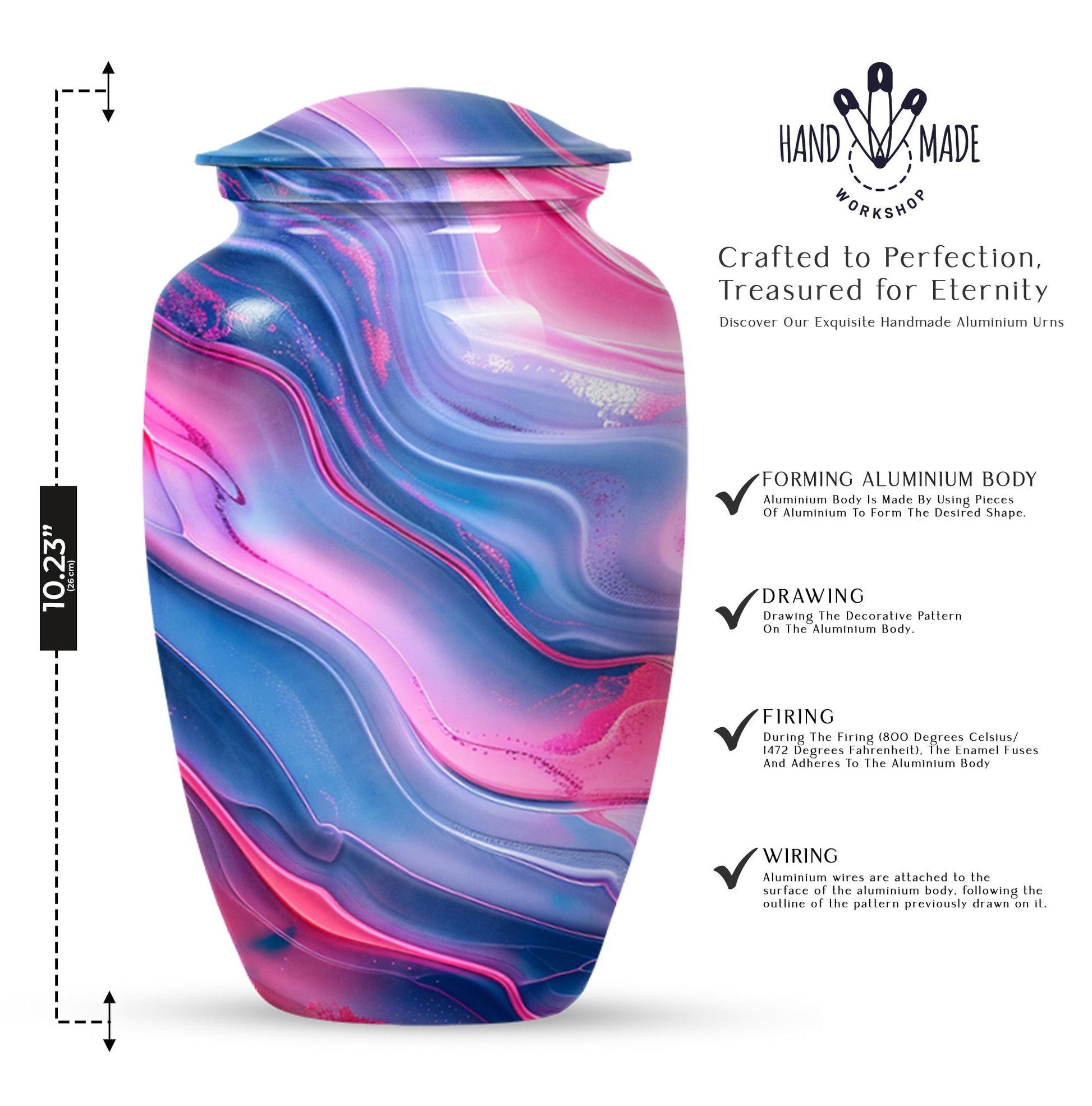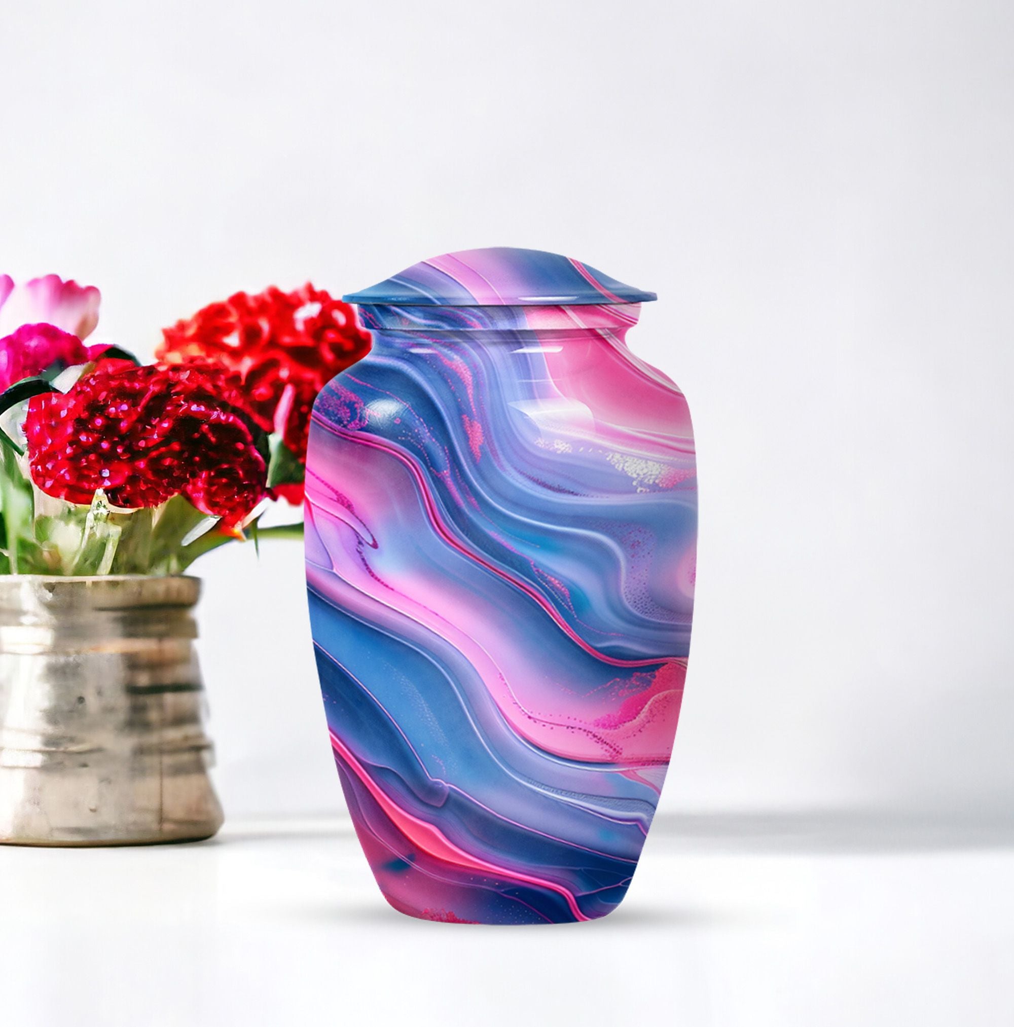 Cherish the memory of your special someone with this exquisite Abstract Urn. This large, 10-inch urn has been meticulously crafted from durable aluminium, ensuring long-lasting remembrance. Its pristine, 200 cubic inch capacity provides a thoughtful resting place for the ashes of an adult female. Weighing 3.3 pounds, the urn is compact enough to be discreetly located anywhere in your home. The abstract theme imbues the urn with a sense of sophistication, yet the quintessential classic urn design is ever-present. Personalize your memorial urn with engraved names, adding that much-needed personal touch to a difficult farewell. The product also includes a velvet pouch, providing a delicate containment for the ashes and a respectful acknowledgment of your loved one's life. As a leading product in memorial ceremony supplies, this urn is more than a shape box for gifts; it's a heartfelt tribute.