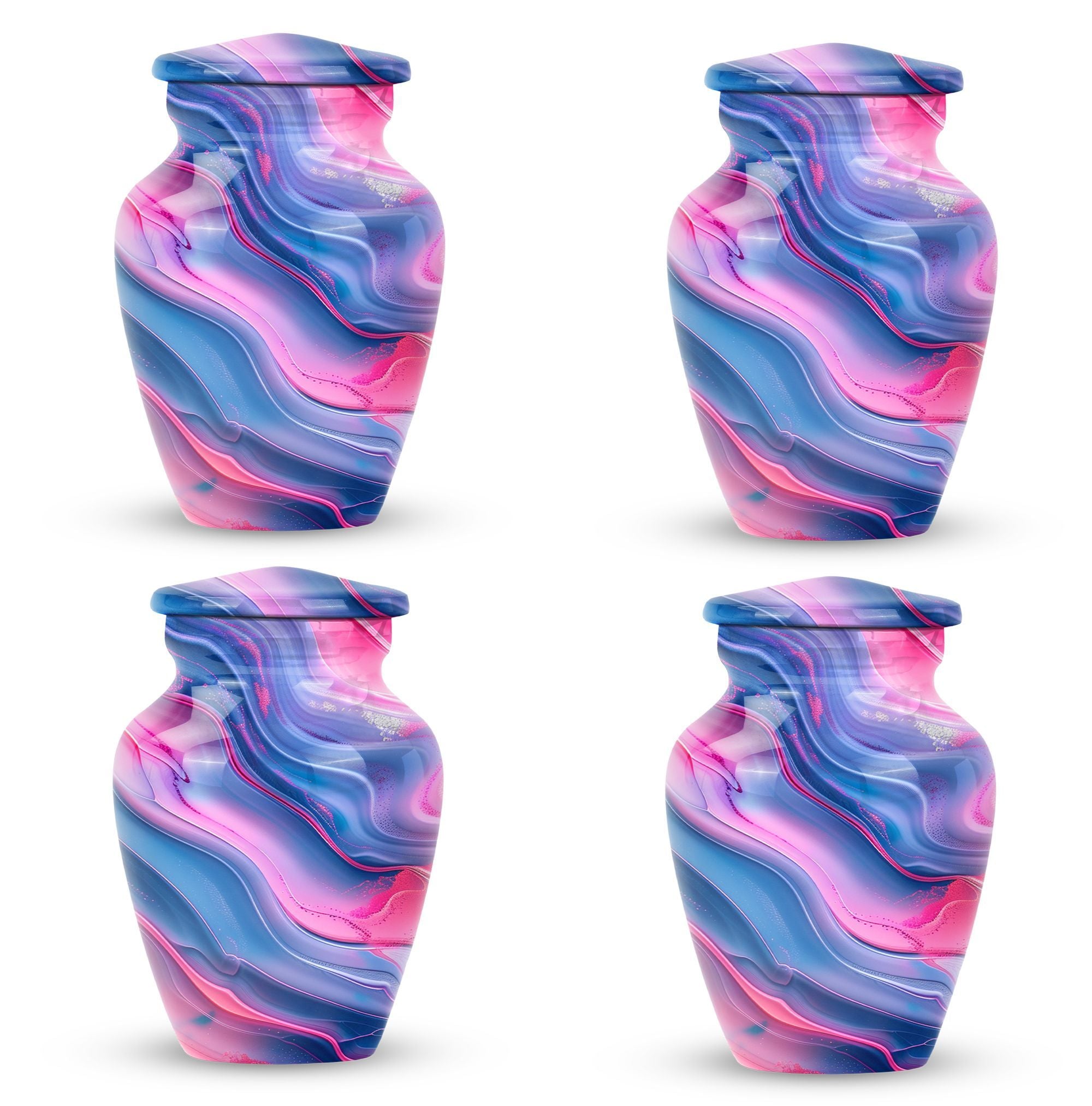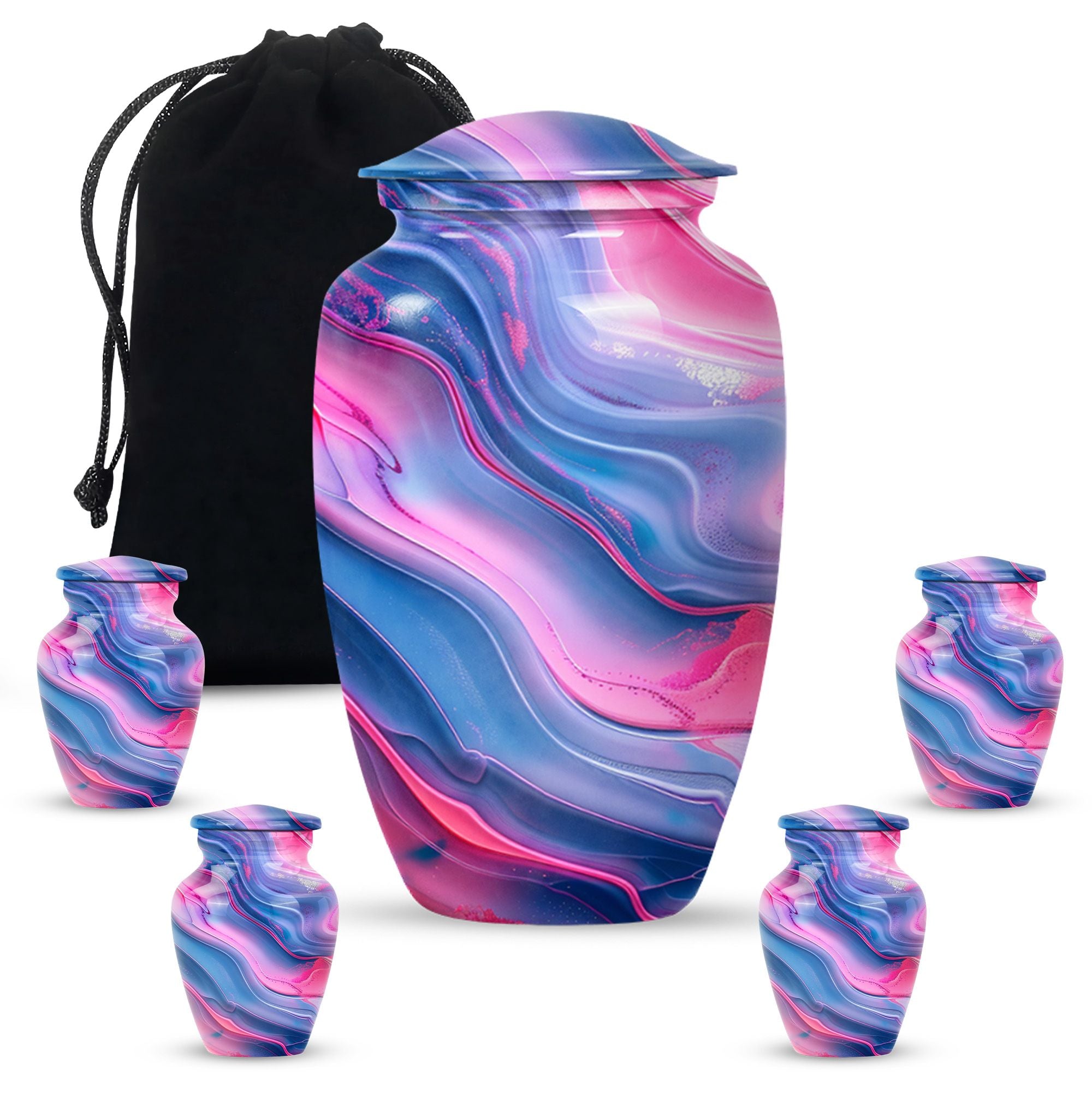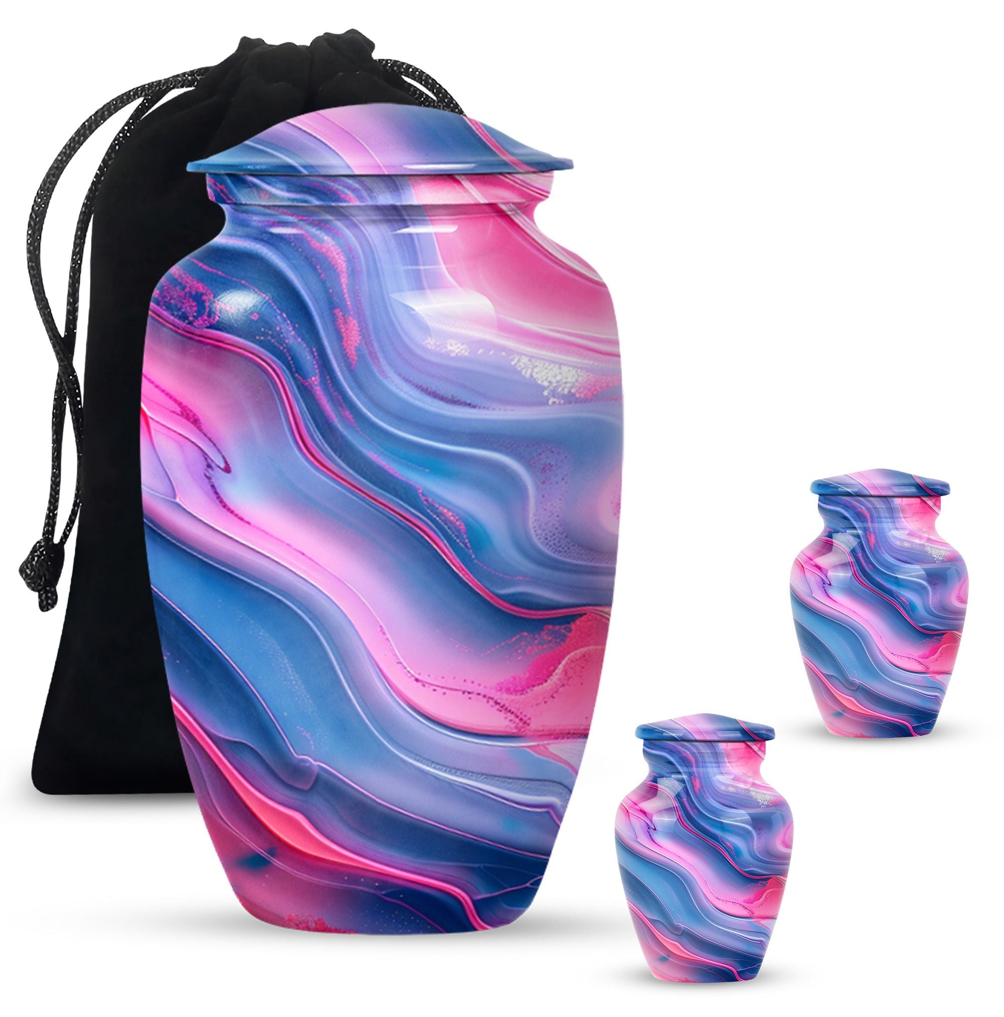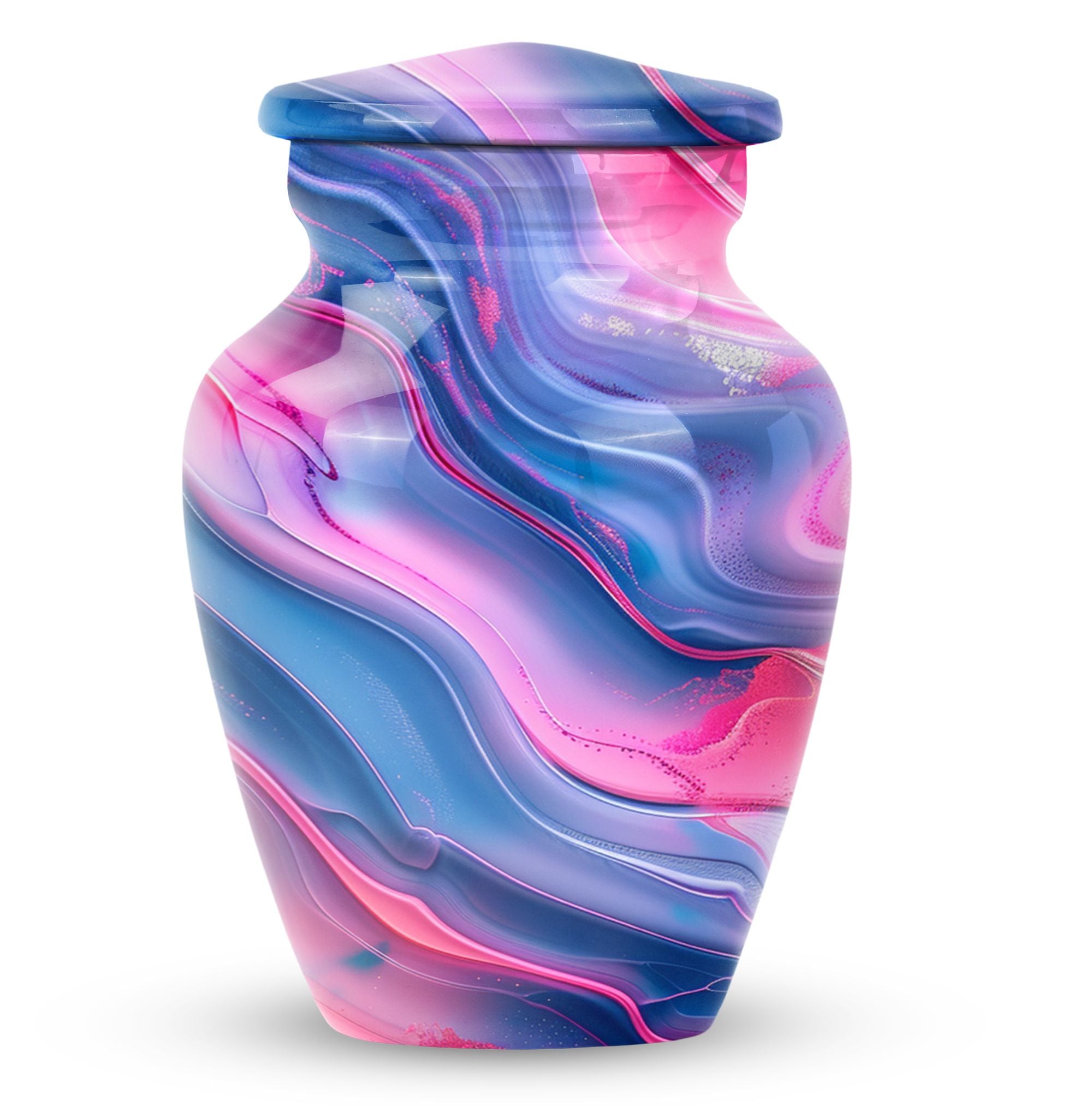 Cherish the memory of your special someone with this exquisite Abstract Urn. This large, 10-inch urn has been meticulously crafted from durable aluminium, ensuring long-lasting remembrance. Its pristine, 200 cubic inch capacity provides a thoughtful resting place for the ashes of an adult female. Weighing 3.3 pounds, the urn is compact enough to be discreetly located anywhere in your home. The abstract theme imbues the urn with a sense of sophistication, yet the quintessential classic urn design is ever-present. Personalize your memorial urn with engraved names, adding that much-needed personal touch to a difficult farewell. The product also includes a velvet pouch, providing a delicate containment for the ashes and a respectful acknowledgment of your loved one's life. As a leading product in memorial ceremony supplies, this urn is more than a shape box for gifts; it's a heartfelt tribute.