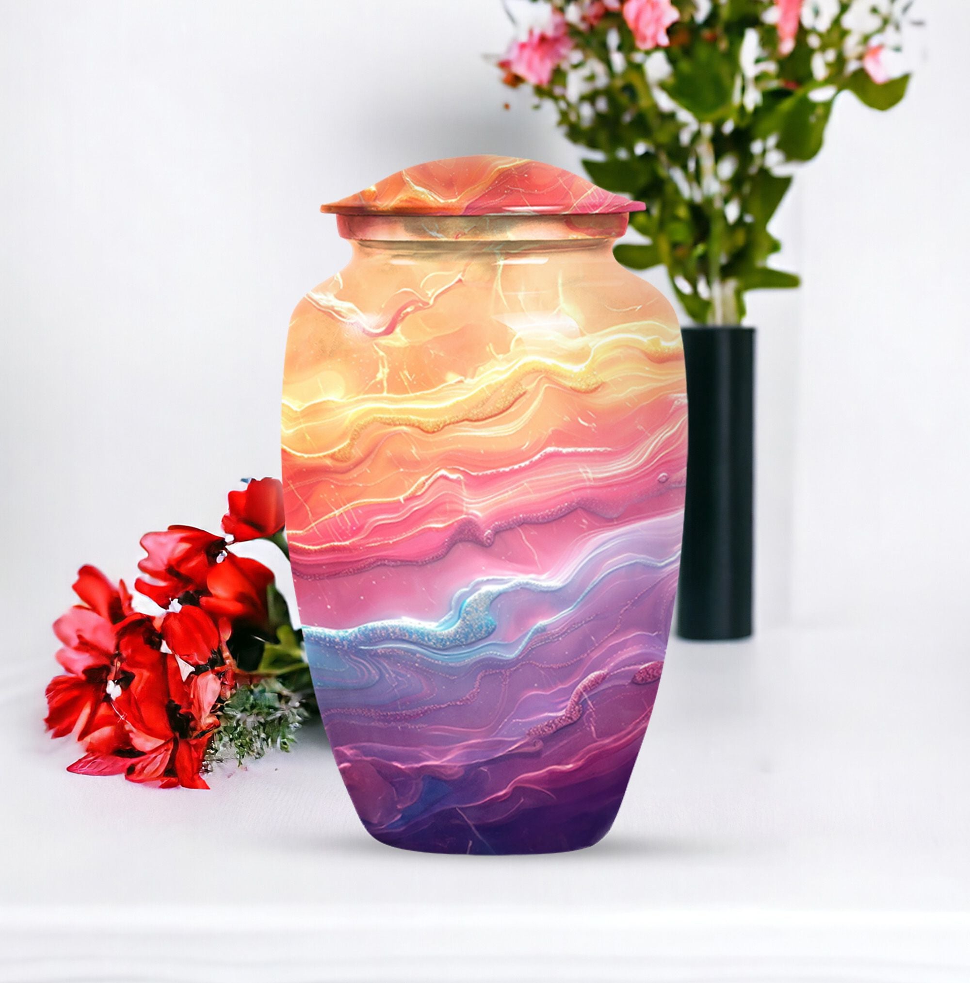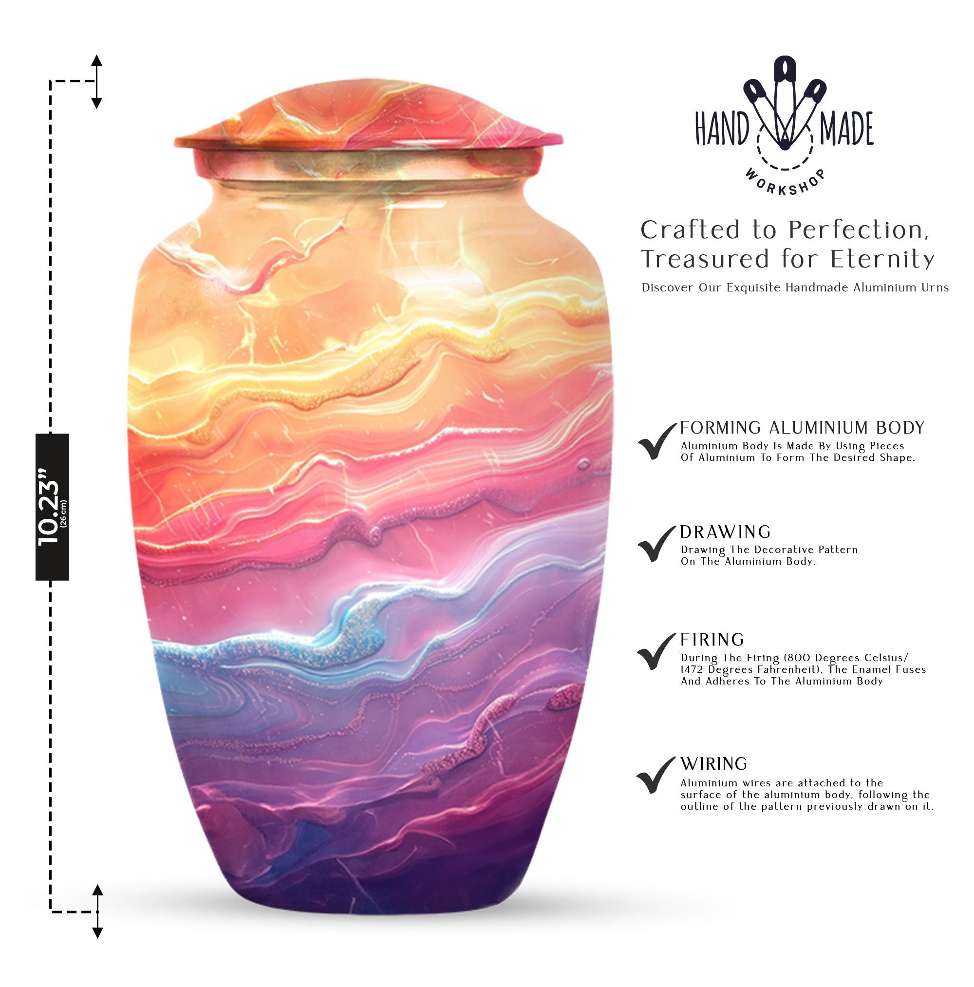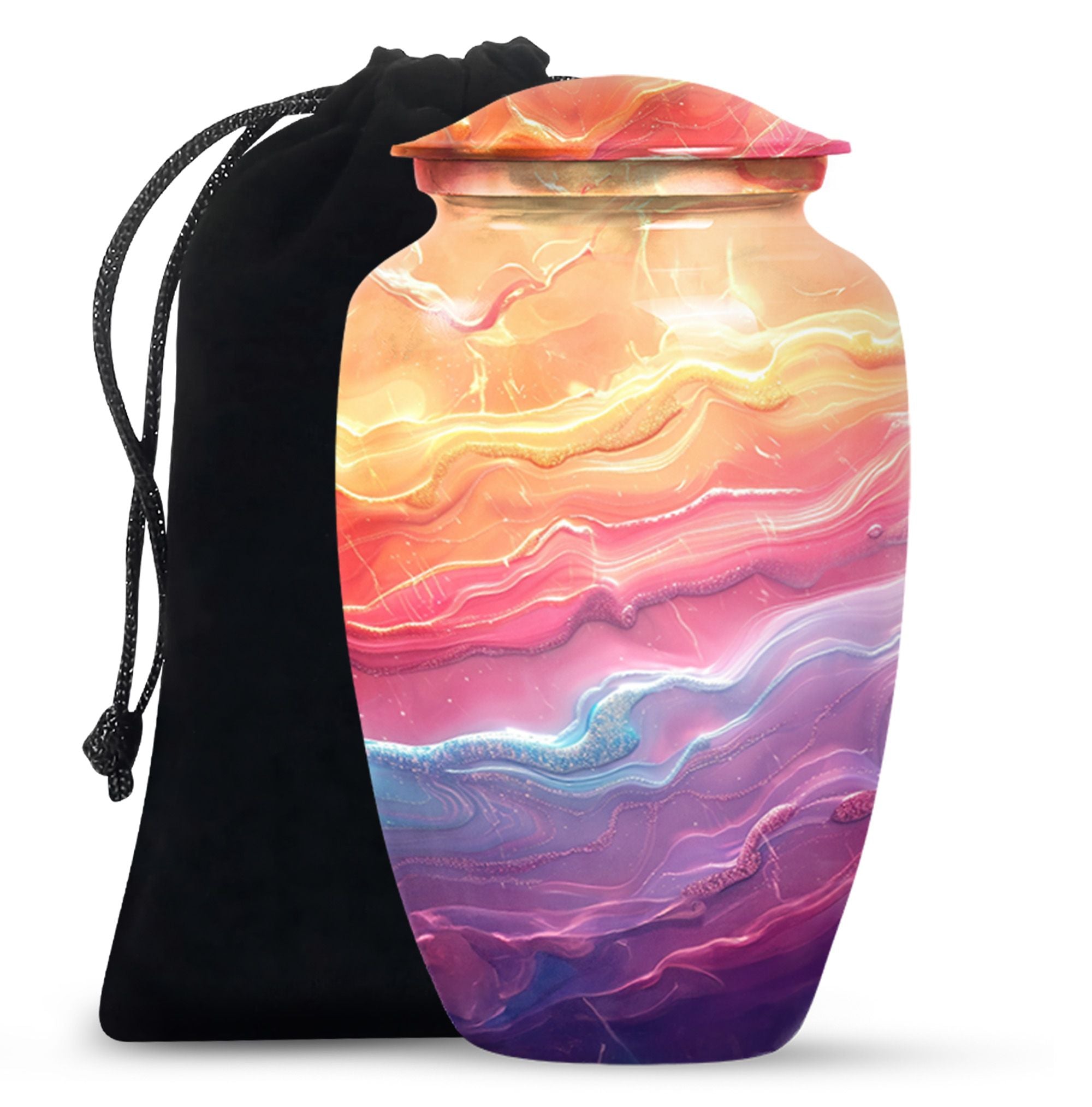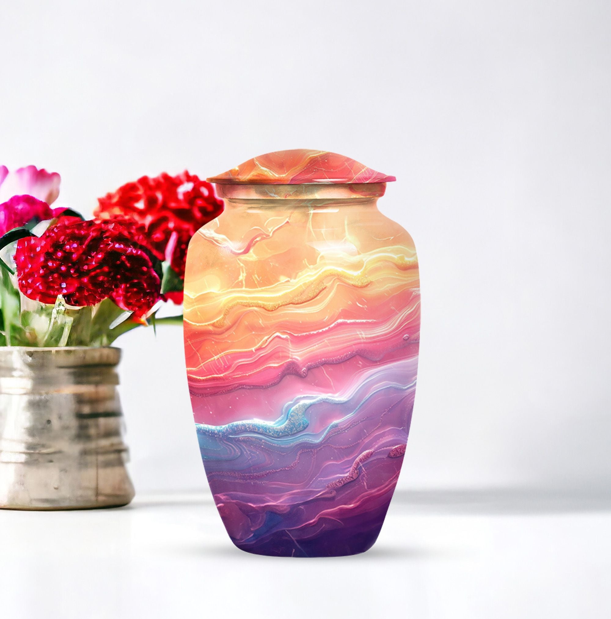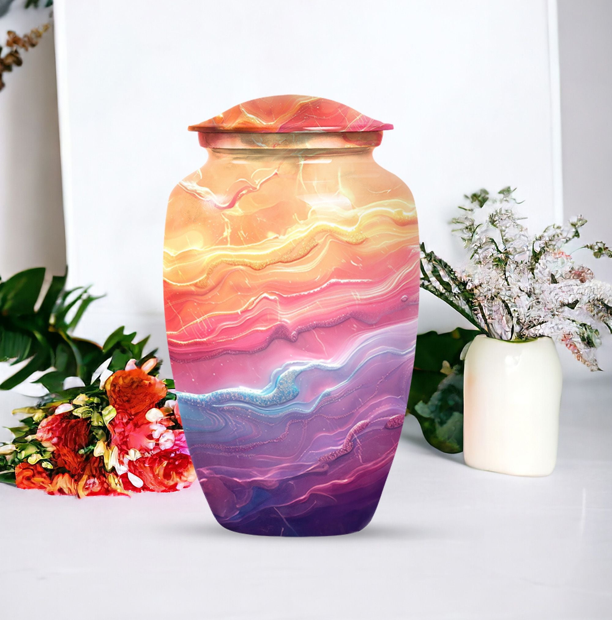 Emanate profound honor and tribute to your departed loved ones with our Abstract Urn. A rare find in the realm of memorial adult urns, this piece accommodates not just to human ashes for women, but also males, making it a versatile choice among the large urns. Standing eloquently at 10 inches with a weight of 3.3 pounds, this somber yet sophisticated creation possesses the capacity of 200 cubic inches, aptly presenting a fitting sanctuary for cremation ashes. The classically-styled urn is meticulously crafted from high-quality Aluminium, ensuring longevity. The package conveniently includes a velvet pouch for the containment of ashes, adding an extra measure of respect. What's more, this urn can be customized with engraved names, offering a personalized touch to this sanctuary. Ideal for those seeking funeral large urns or cremation urns for women, this memory-preserving treasure is a highly-sought item in our collection. Harness the power of commemoration with this powerful symbol of love and life.