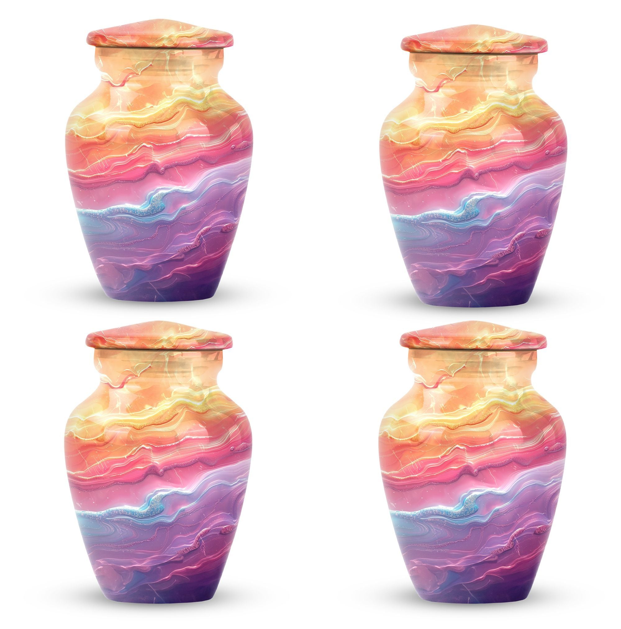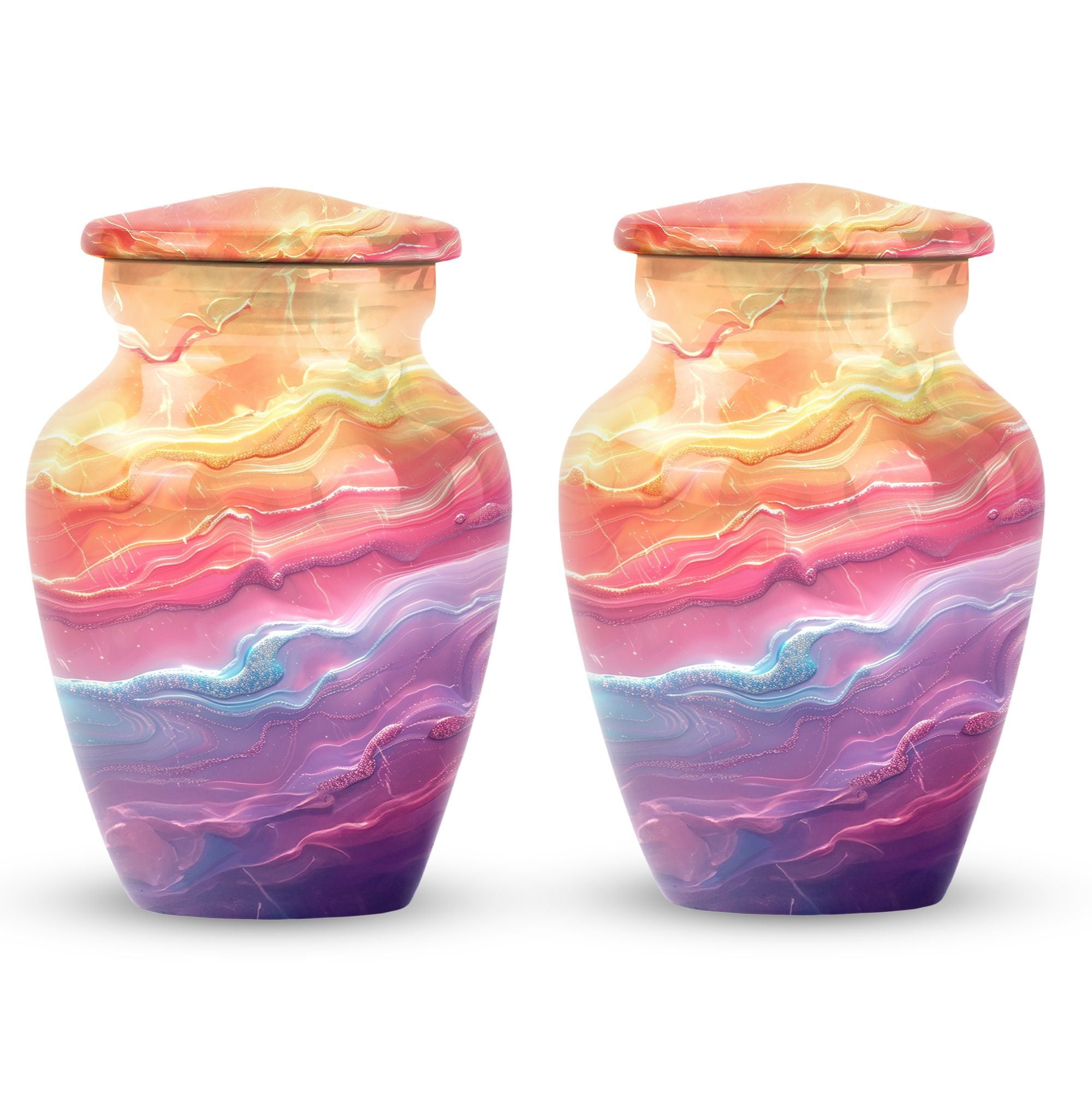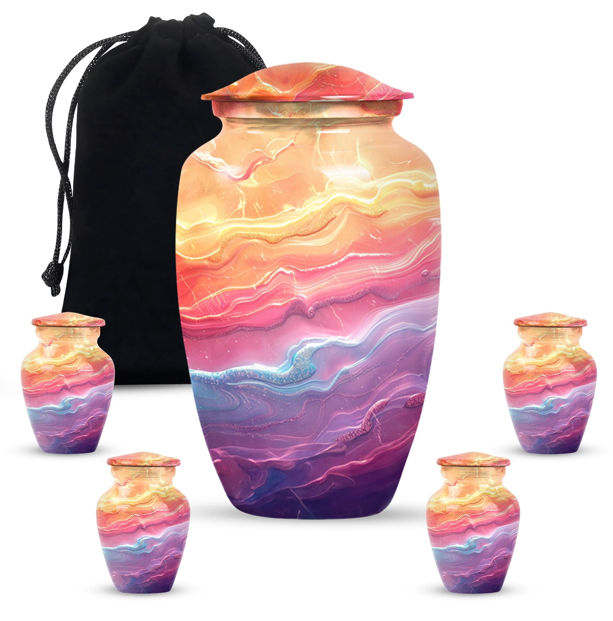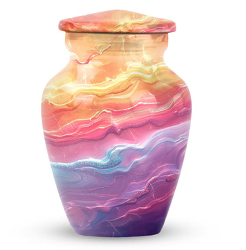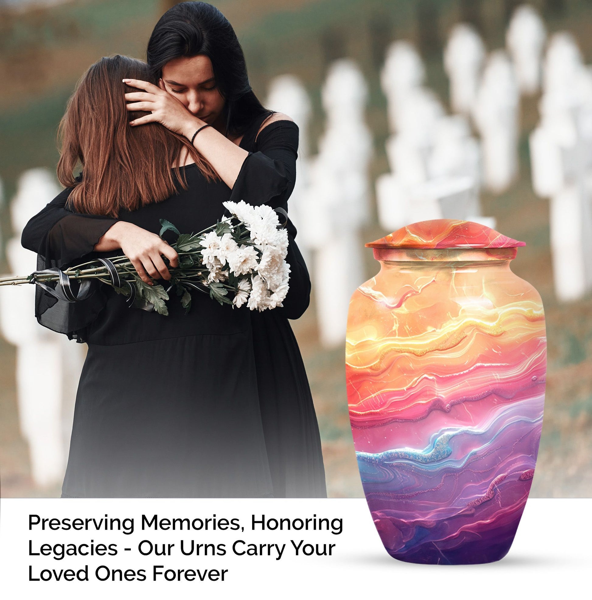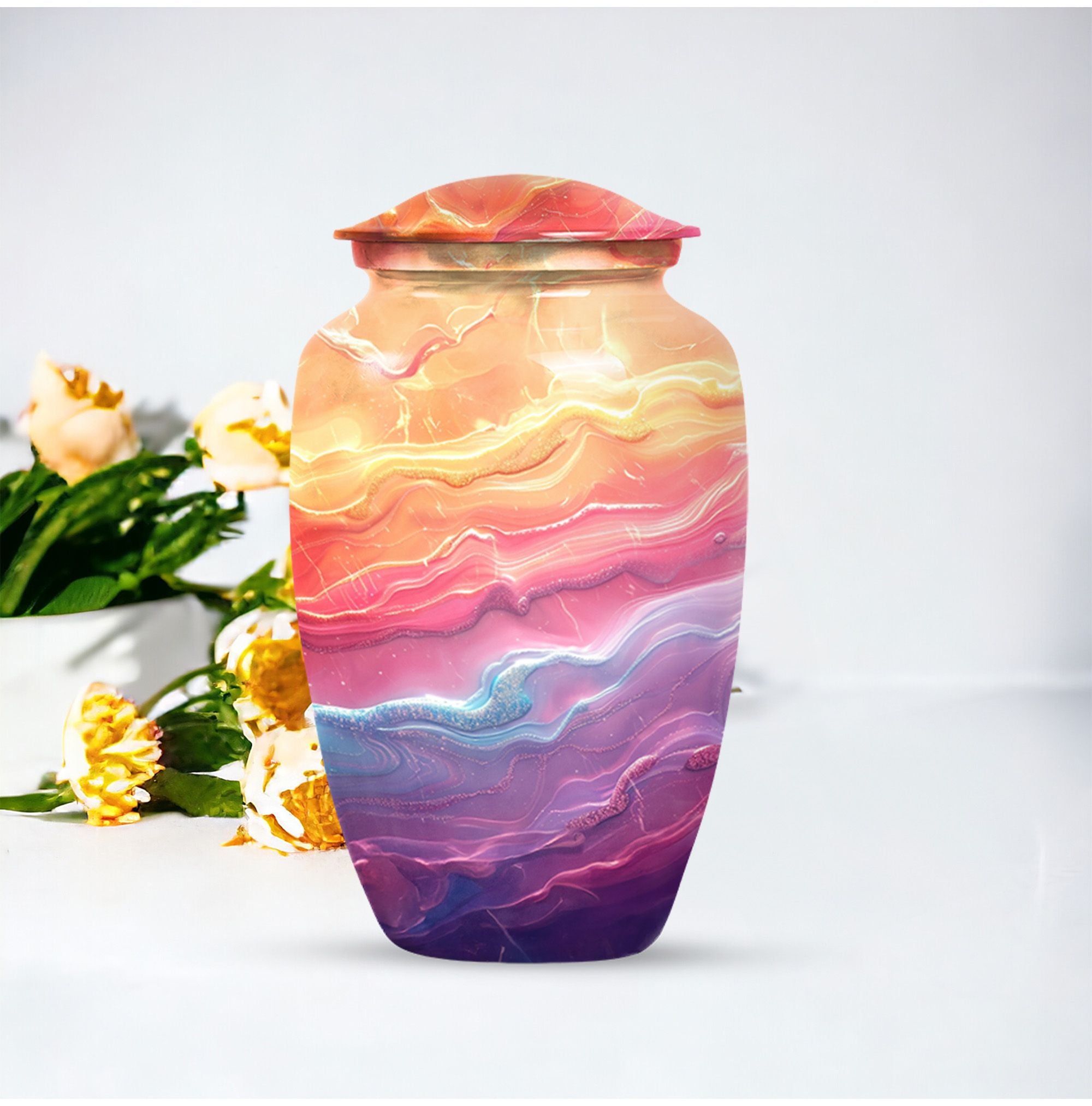 Emanate profound honor and tribute to your departed loved ones with our Abstract Urn. A rare find in the realm of memorial adult urns, this piece accommodates not just to human ashes for women, but also males, making it a versatile choice among the large urns. Standing eloquently at 10 inches with a weight of 3.3 pounds, this somber yet sophisticated creation possesses the capacity of 200 cubic inches, aptly presenting a fitting sanctuary for cremation ashes. The classically-styled urn is meticulously crafted from high-quality Aluminium, ensuring longevity. The package conveniently includes a velvet pouch for the containment of ashes, adding an extra measure of respect. What's more, this urn can be customized with engraved names, offering a personalized touch to this sanctuary. Ideal for those seeking funeral large urns or cremation urns for women, this memory-preserving treasure is a highly-sought item in our collection. Harness the power of commemoration with this powerful symbol of love and life.