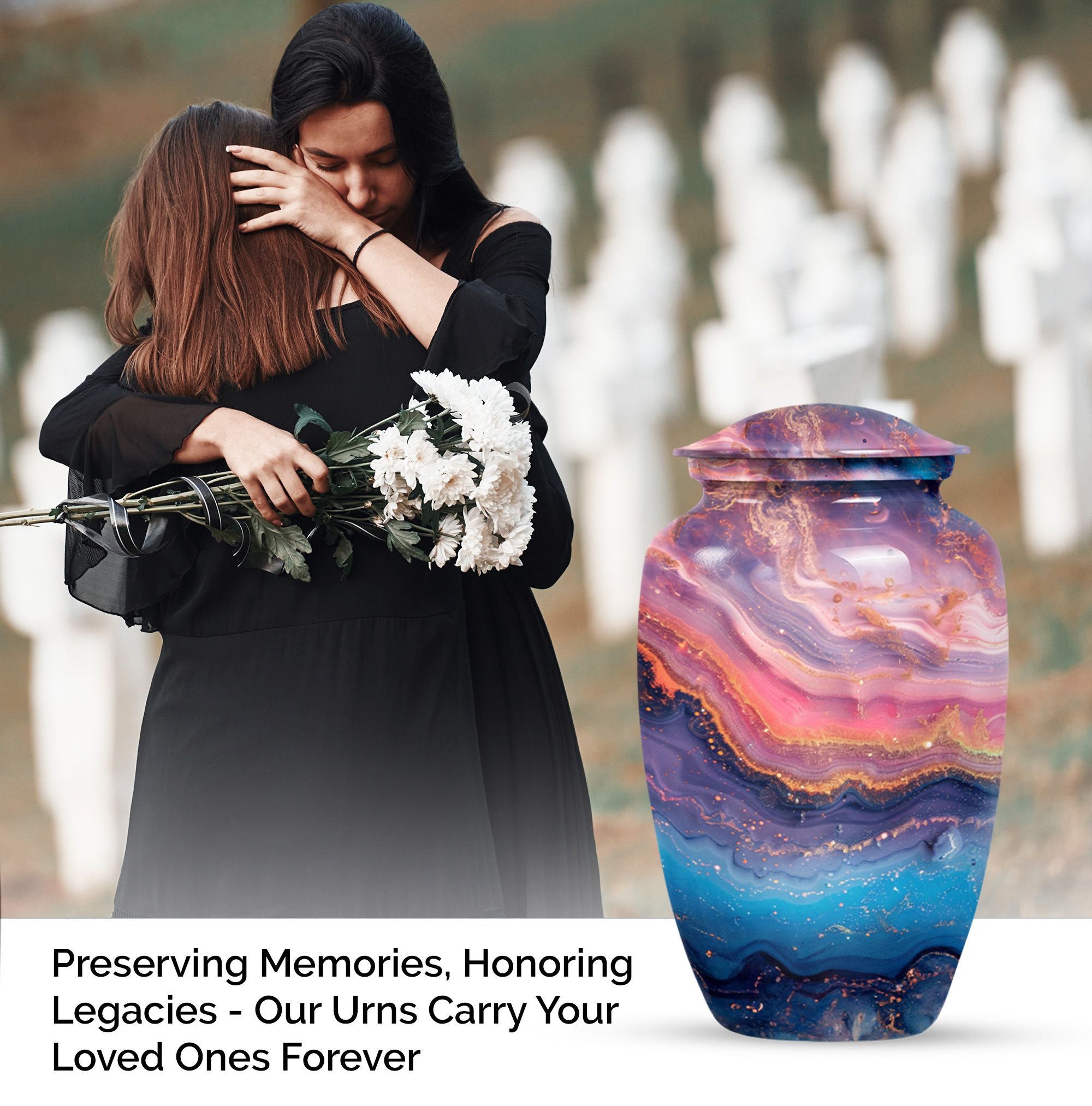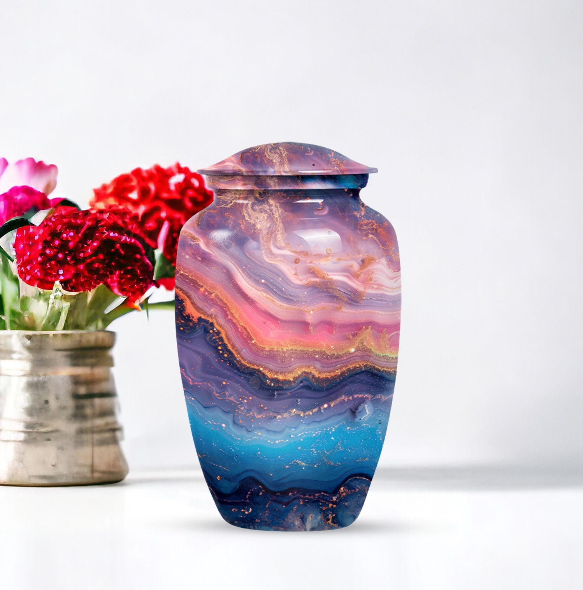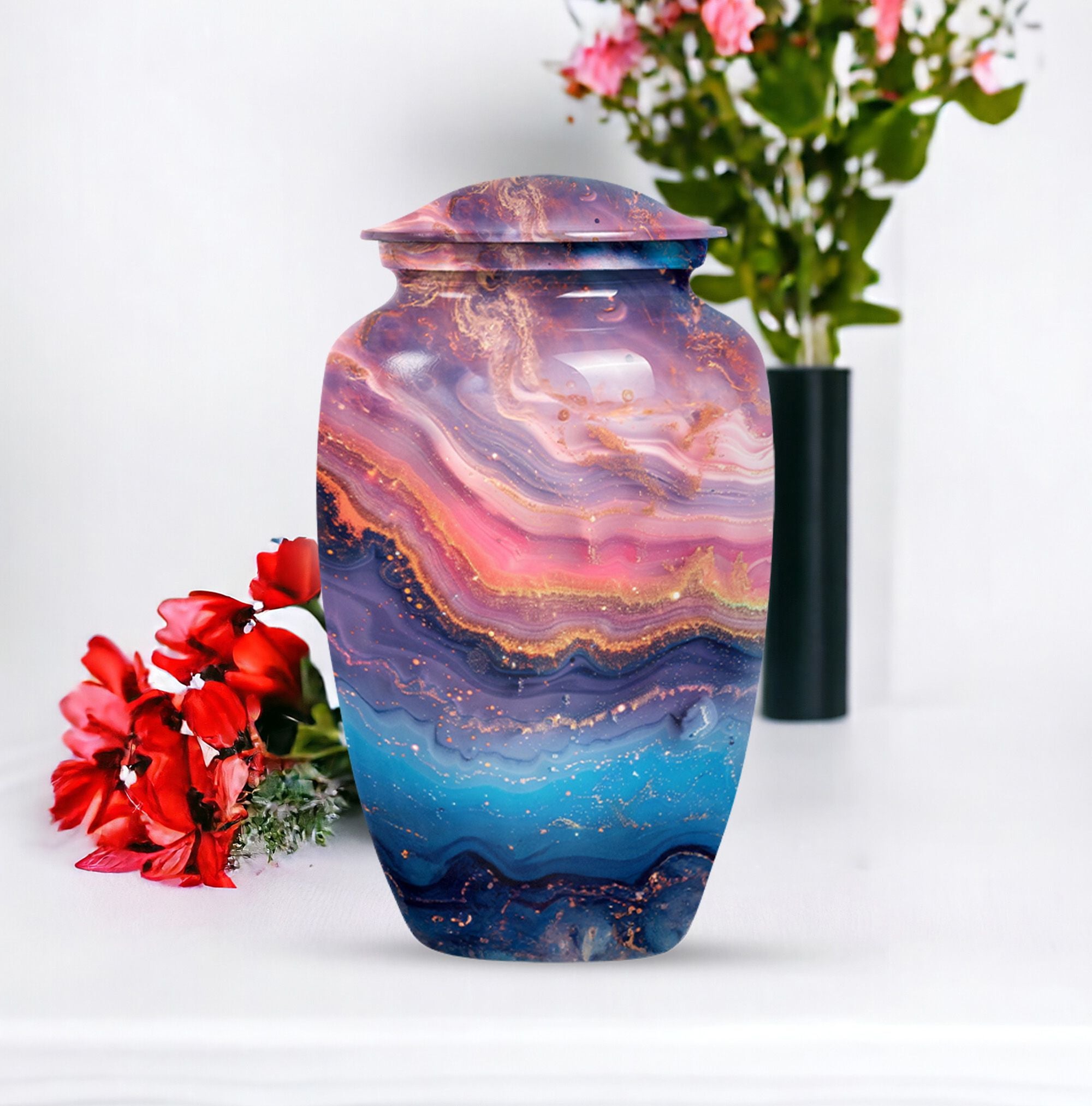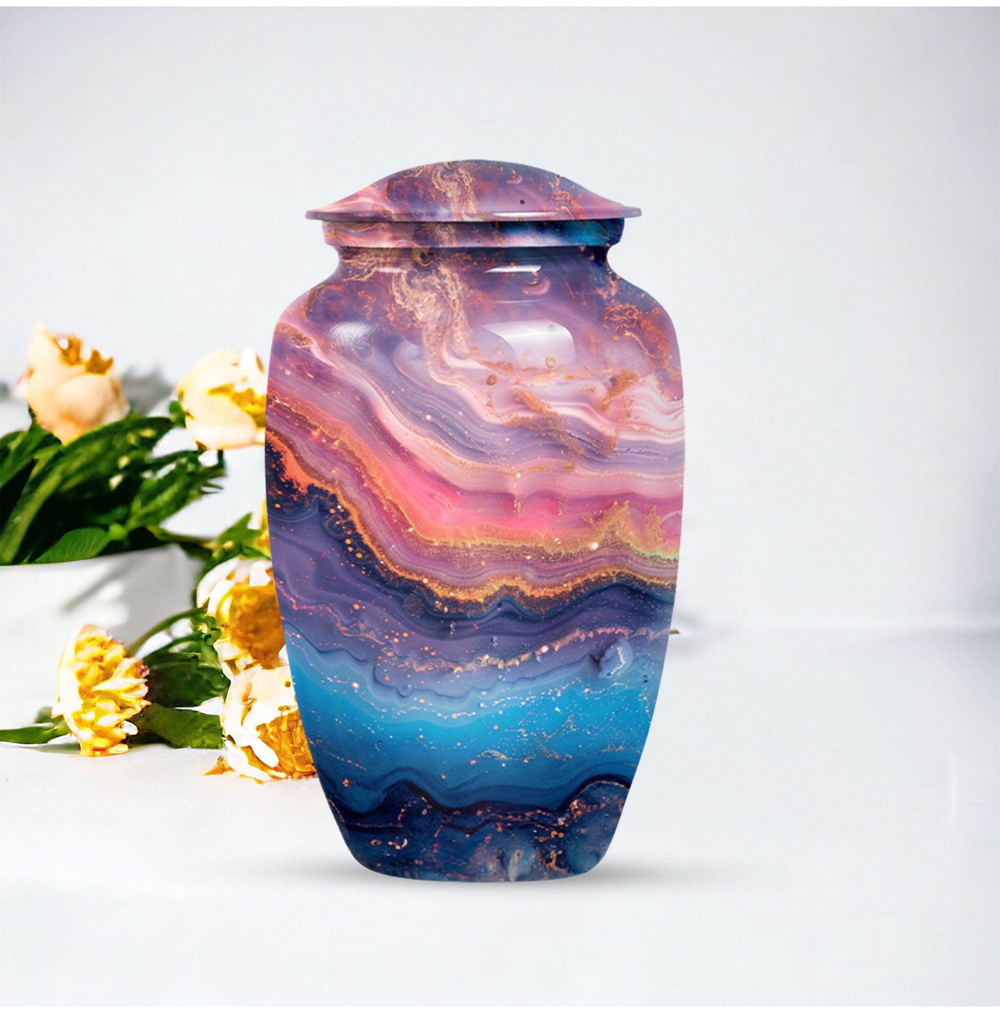 Crafted with profound respect, this Abstract Urn serves as a noble resting place for the dearly departed. As one of the cremation urns primarily designed for males, it presents an ideal choice to honor your loved ones. The aesthetic is catered by type - a large urn with a stature of 10 inches in height. Weighing in at 3.3 pounds, it provides ample capacity, up to 200 cubic inches, intended for adult-sized remains. Seated inside its sturdy aluminium construction, this cremation urn offers an assurance of sustained sanctity. Engravings such as names or messages can be arranged for a personalized touch - a comforting feature during harsh times of mourning. A velvet pouch comes with the package to ensure the containment of sacred ashes with utmost tenderness. Meticulously designed, the Classic Urn allows for a compassionate ceremonial ritual.