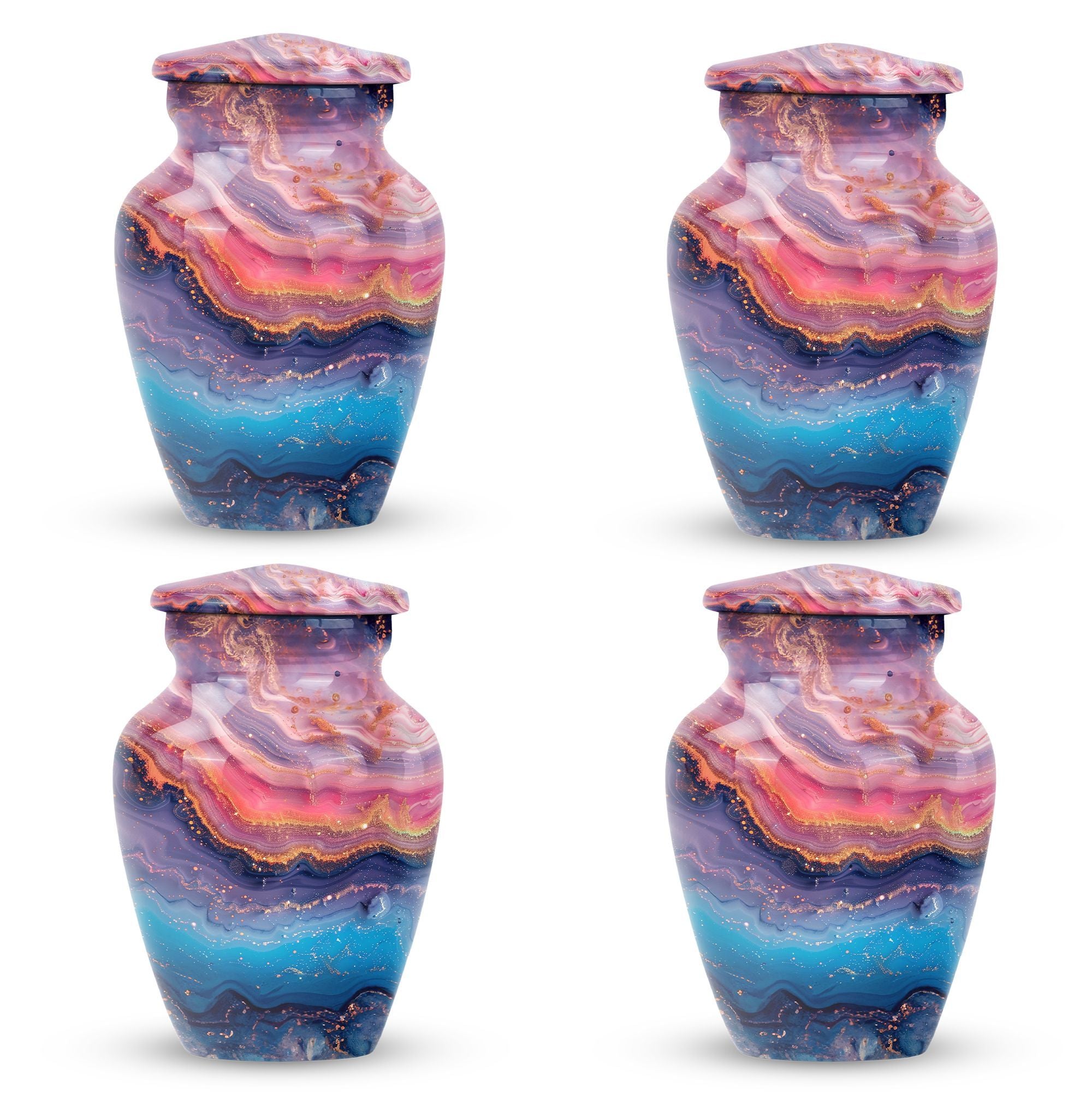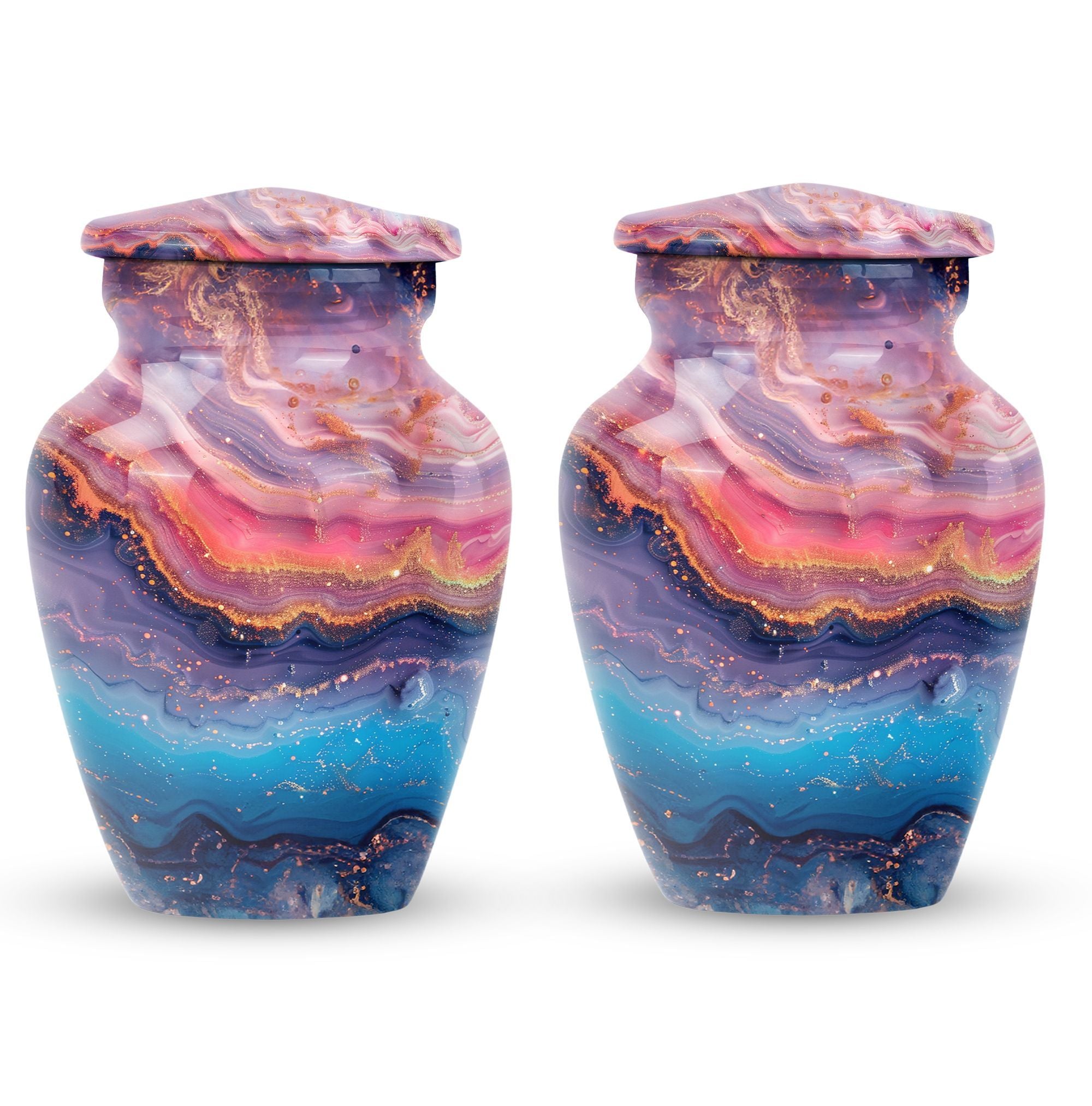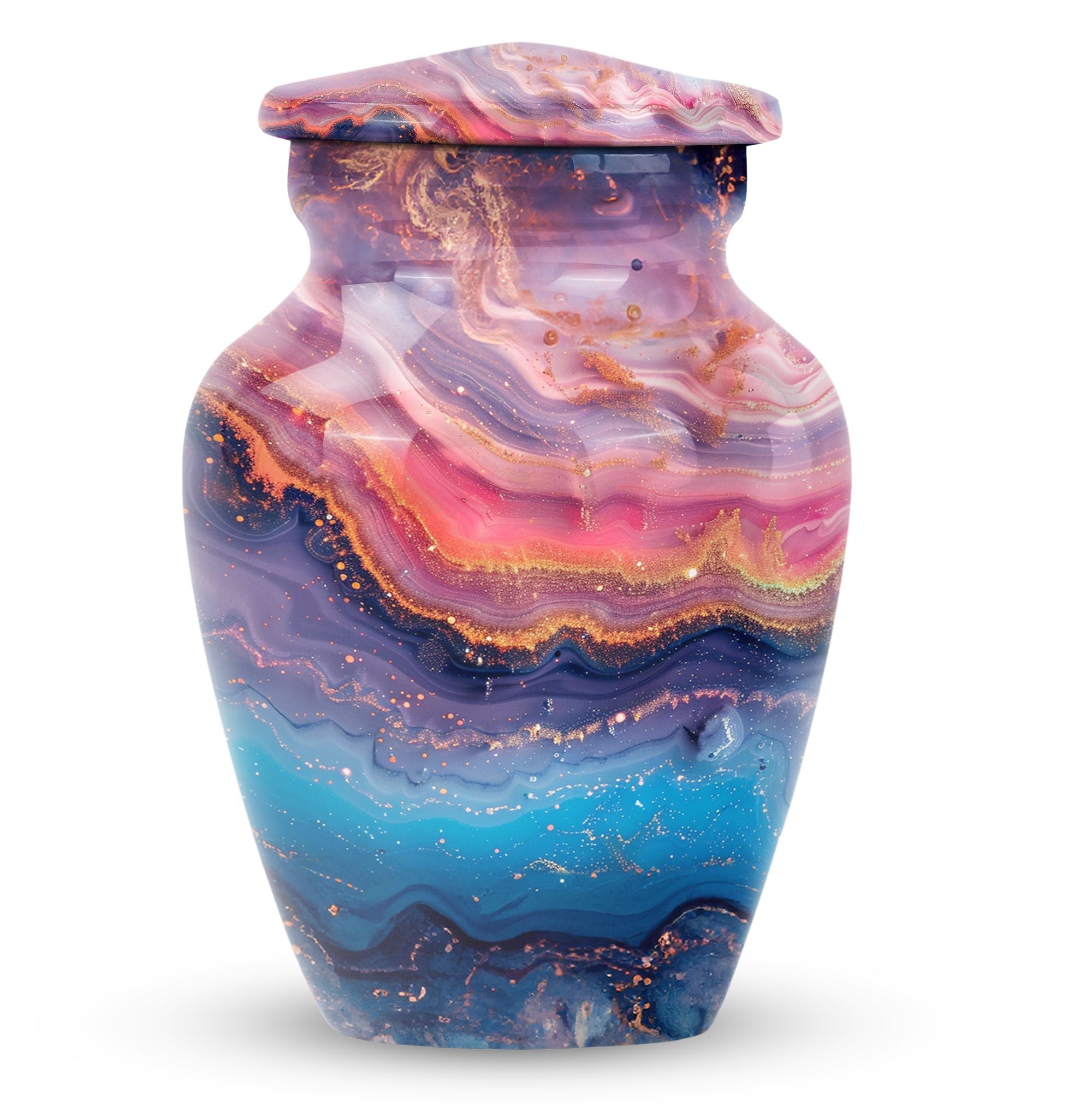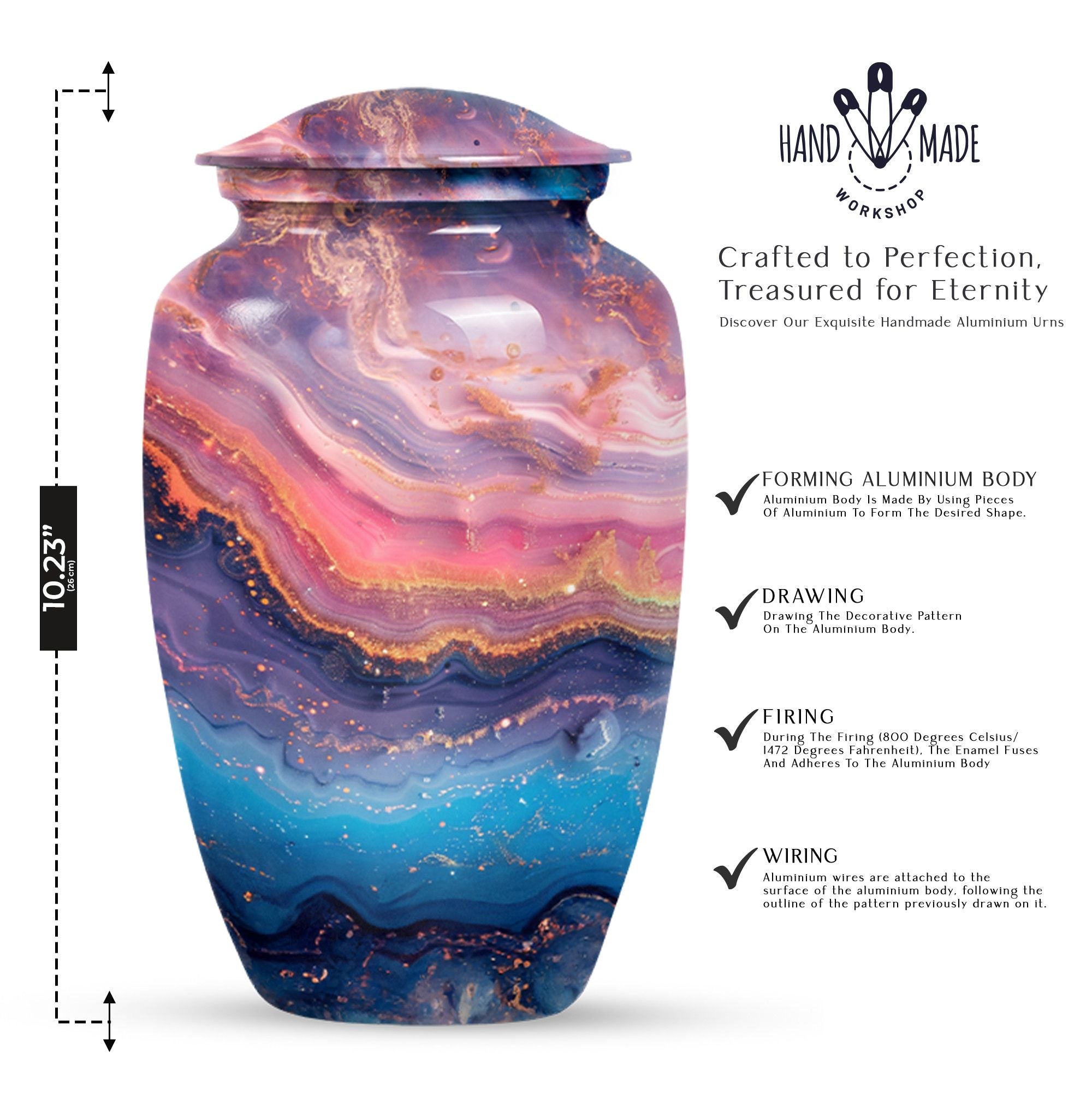 Crafted with profound respect, this Abstract Urn serves as a noble resting place for the dearly departed. As one of the cremation urns primarily designed for males, it presents an ideal choice to honor your loved ones. The aesthetic is catered by type - a large urn with a stature of 10 inches in height. Weighing in at 3.3 pounds, it provides ample capacity, up to 200 cubic inches, intended for adult-sized remains. Seated inside its sturdy aluminium construction, this cremation urn offers an assurance of sustained sanctity. Engravings such as names or messages can be arranged for a personalized touch - a comforting feature during harsh times of mourning. A velvet pouch comes with the package to ensure the containment of sacred ashes with utmost tenderness. Meticulously designed, the Classic Urn allows for a compassionate ceremonial ritual.