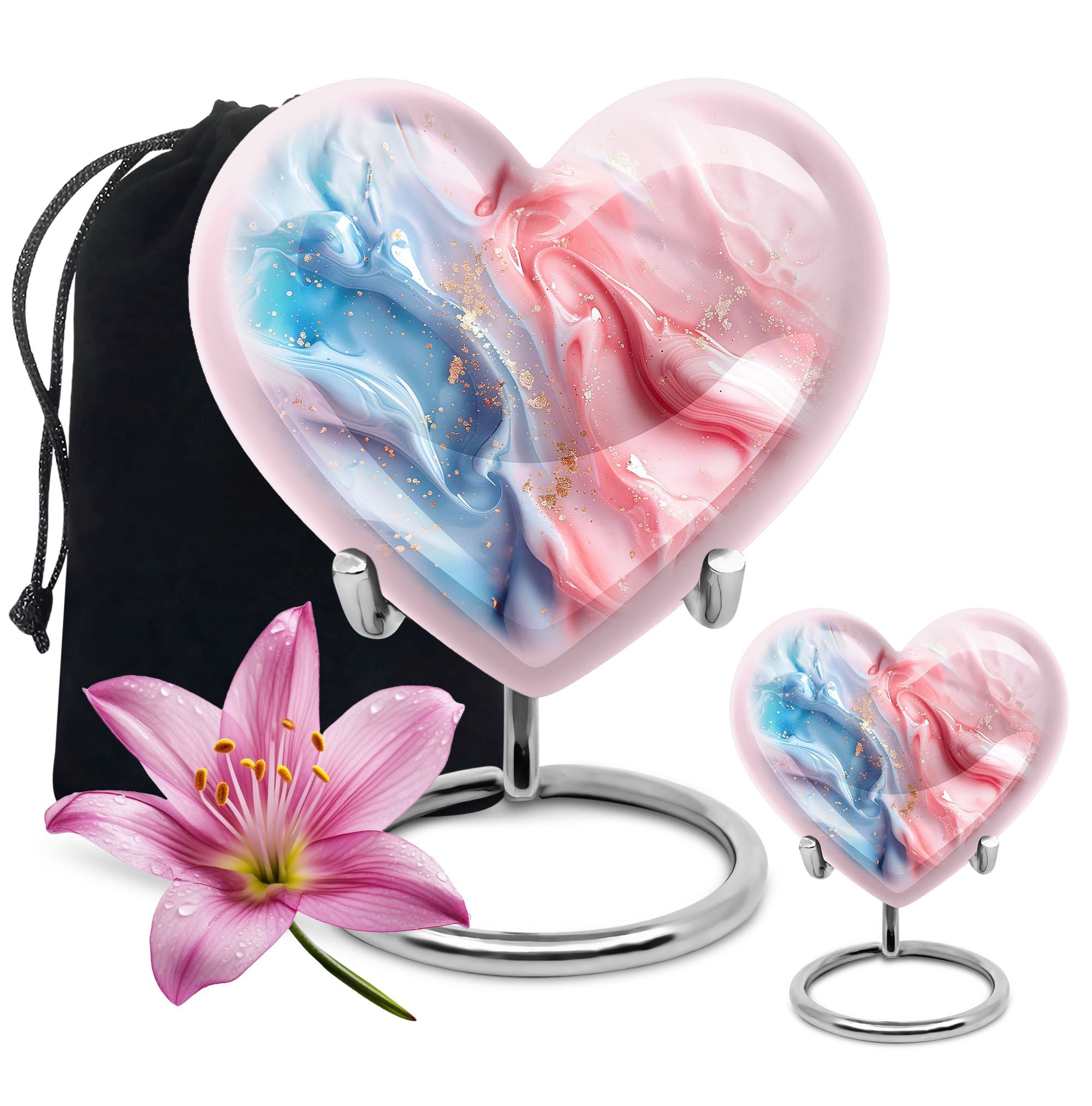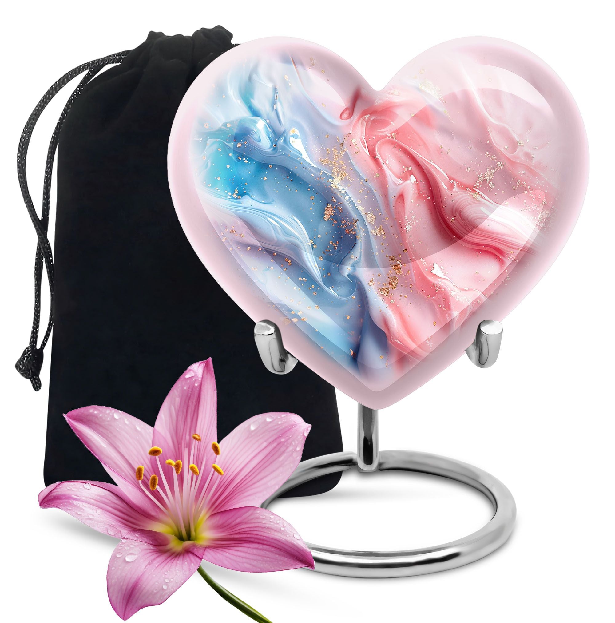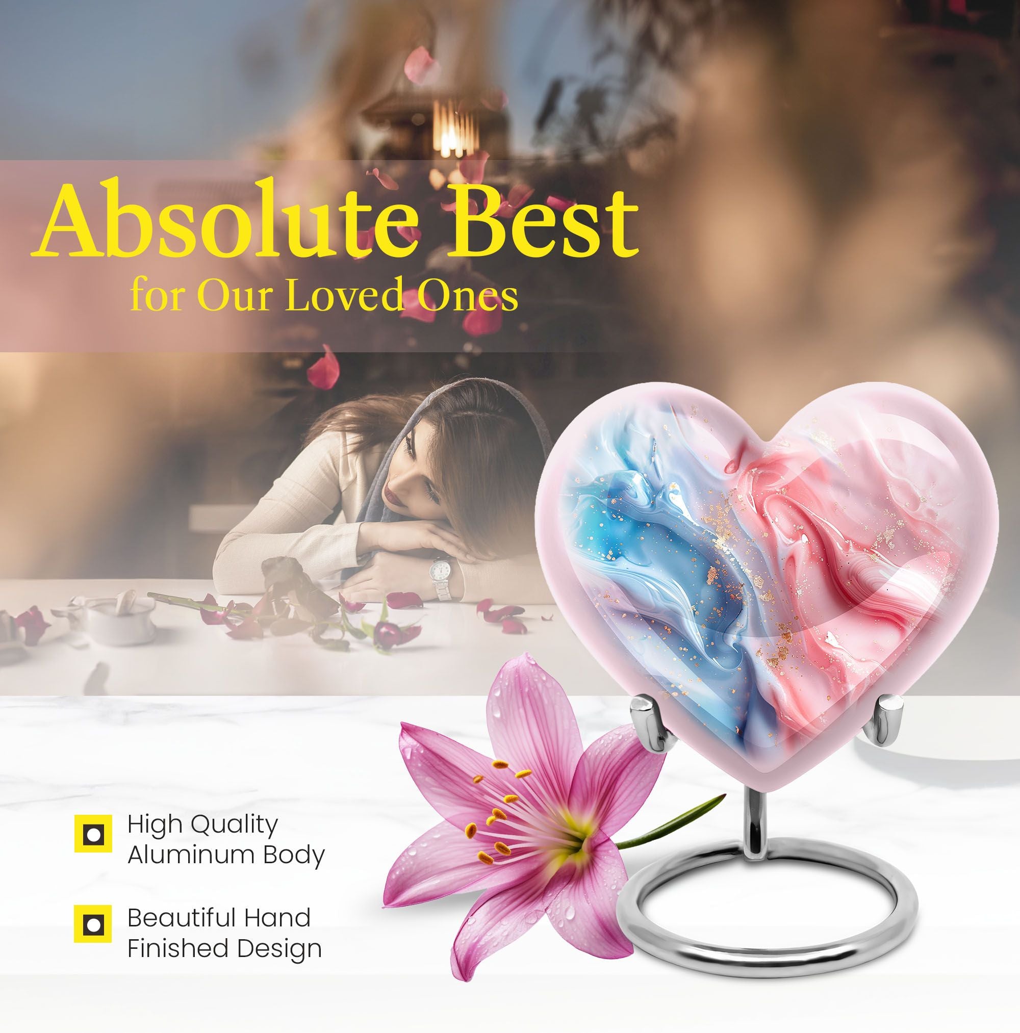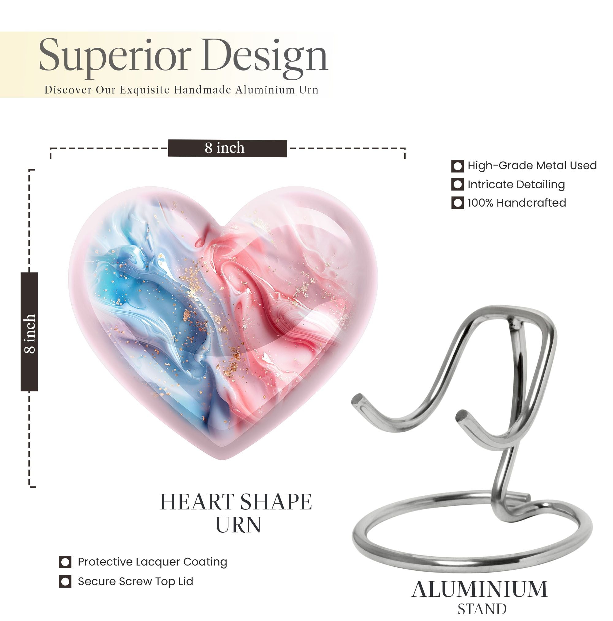 Our Abstract Urn, a thoughtfully designed cremation urn for ashes, serves as the perfect memorial element for your loved ones. Meticulously crafted from high-quality Aluminium, this cremation urn boasts a generous size of 10 inches and weighs a substantial 3.3 pounds. The urn is designed in a symbolic Heart shape, reflecting endless love and perpetual affection. The meticulous capacity of up to 200 cubic inches ensures ample space for safe preservation. A distinctive trait of our product is its customization feature allowing you to personalize the urn with engraved names, imprinting an everlasting memory. The product package comes inclusive of a plush velvet pouch for secure containment and respectful discretion of ashes. Ideal for the locale 'en', our Large Urn is more than just a burial urn for cremation; it's an introspective tribute. This practical Abstract urn will genuinely honor your loved one's memory on your behalf.