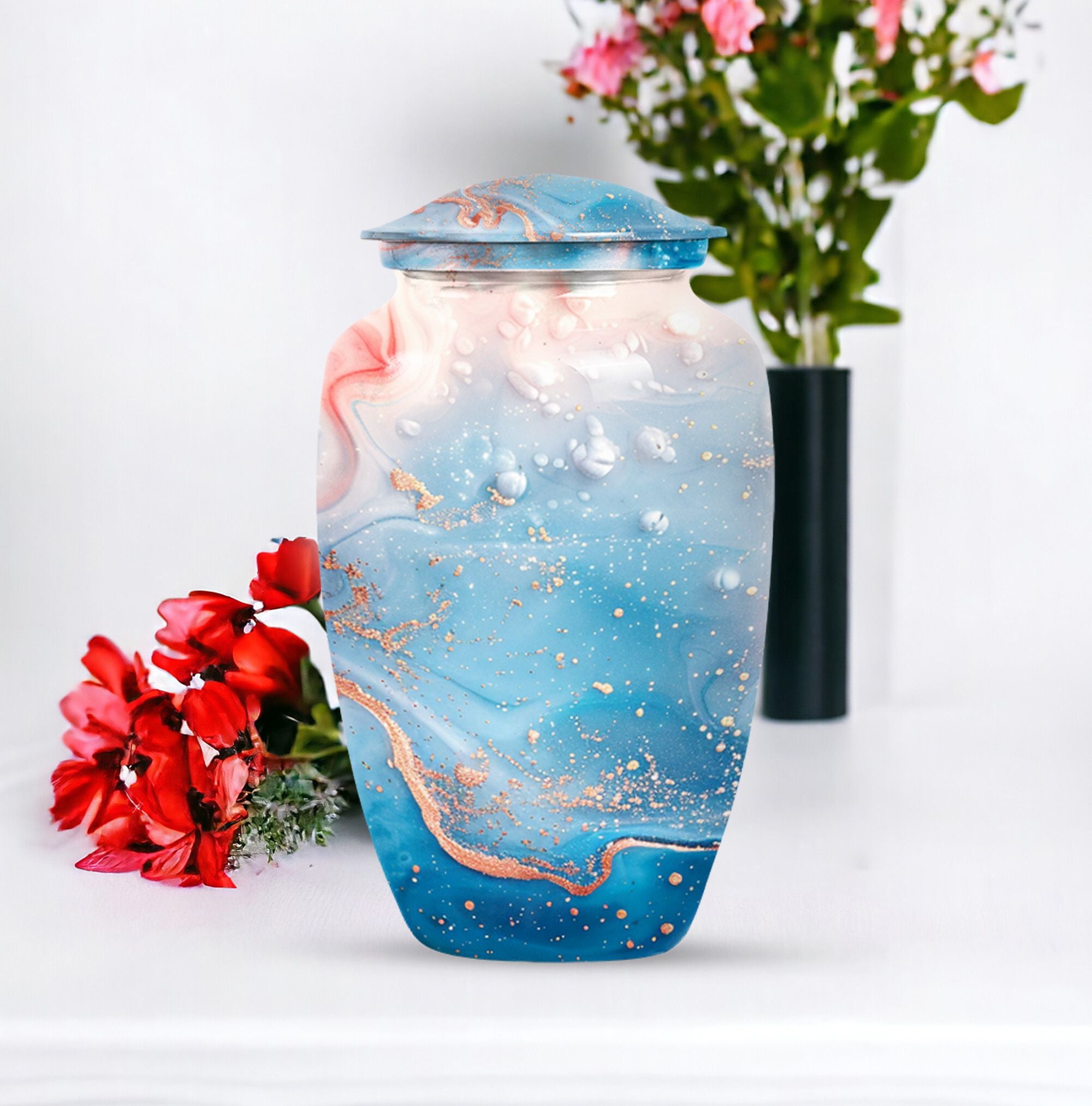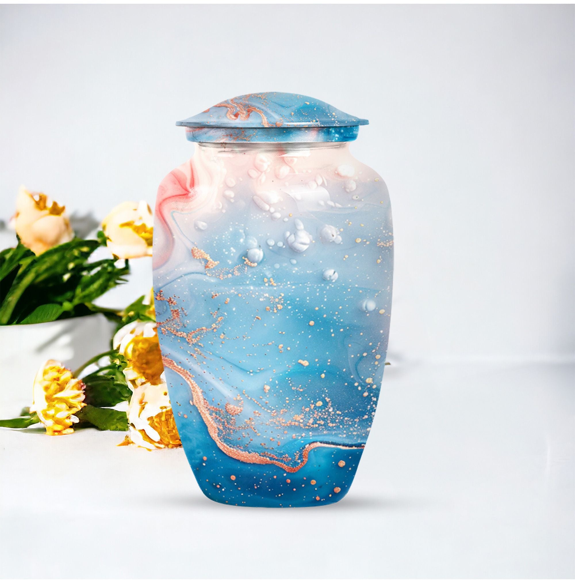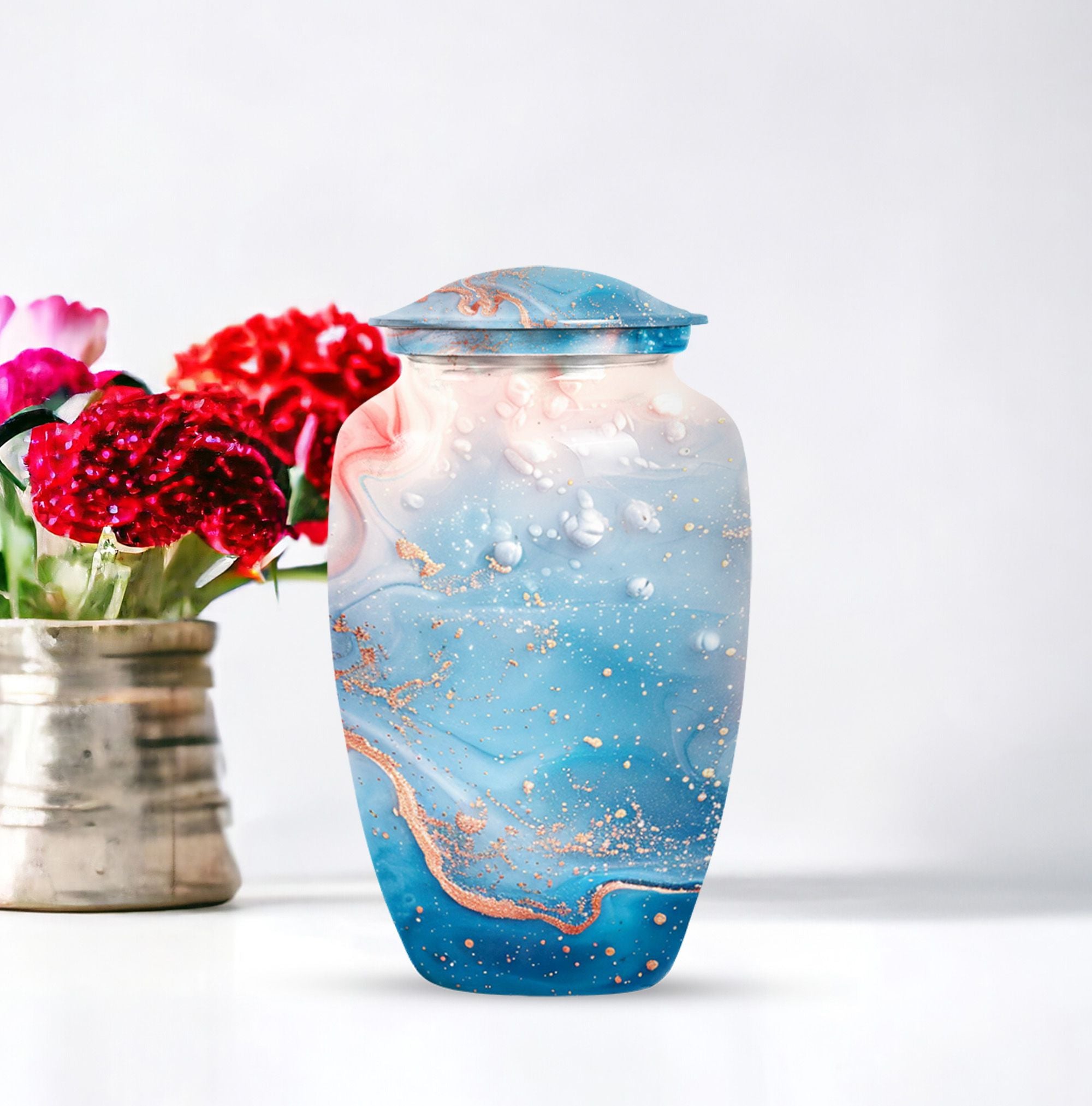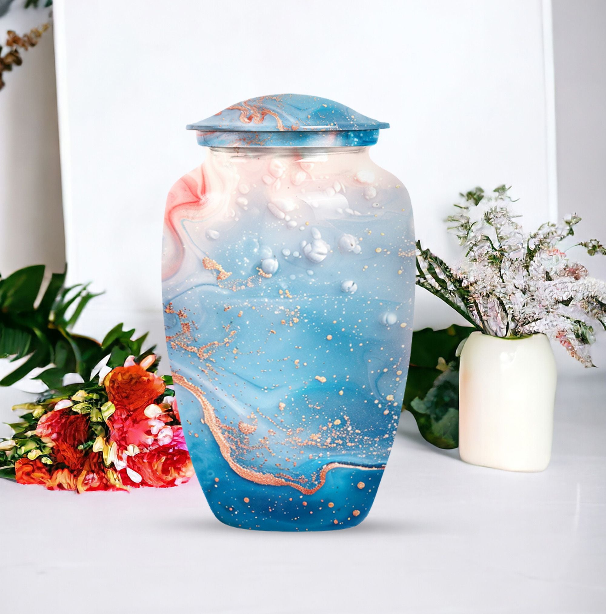 Discover a dignified way to commemorate precious lives with our 10 Inch Abstract Urn, perfect for memorial burial. Its iconic Classic Urn silhouette is crafted from sturdy aluminium, ensuring it stands as a time-honored repository of cherished memories. Despite its profound capacity of 200 cubic inches, it maintains a manageably lightweight presence at just 3.3 pounds. This tastefully abstract urn is designed to seamlessly blend with various decor styles while paying heartfelt tribute to your loved ones. Complemented by a velvet pouch for containment of ashes, it ensures security and elegance in equal measure. Further adding to this funeral urn's sentimental appeal is the ability to personalize it with engraved names, making it a truly unique dedication to singular lives. It is designed to cater to a wide range of funeral burial needs, including serving as a cremation urns for humans or a funeral urns for adult ashes. An epitome of substantial aesthetics and profound emotions, our abstract urn makes a cherished choice for memorial urns.