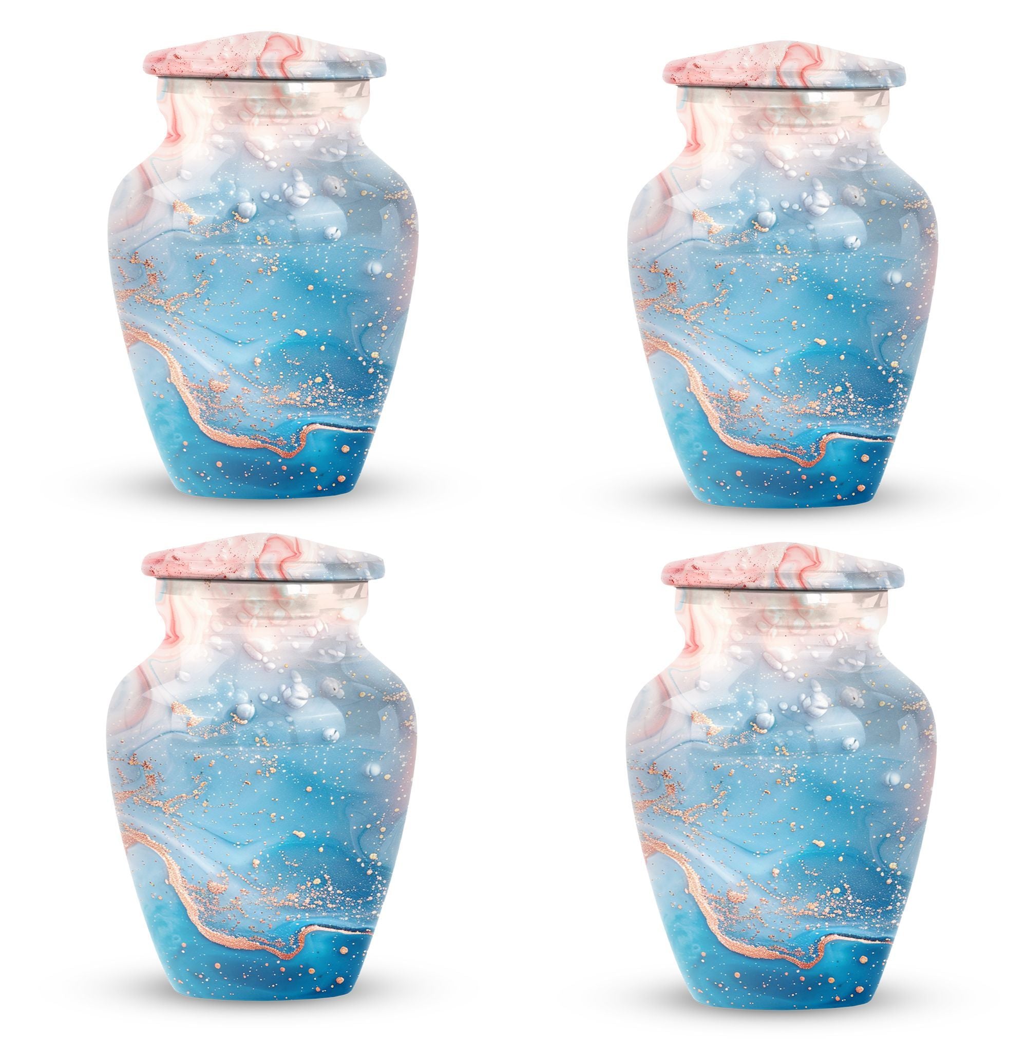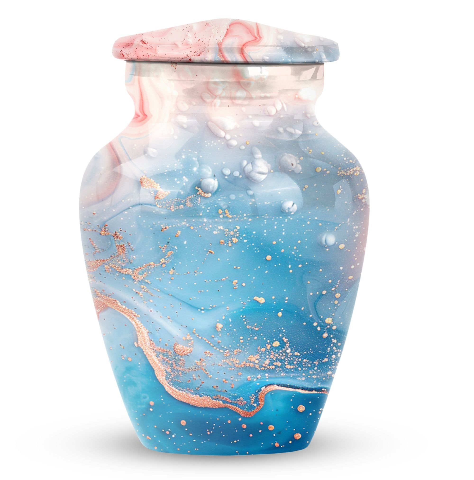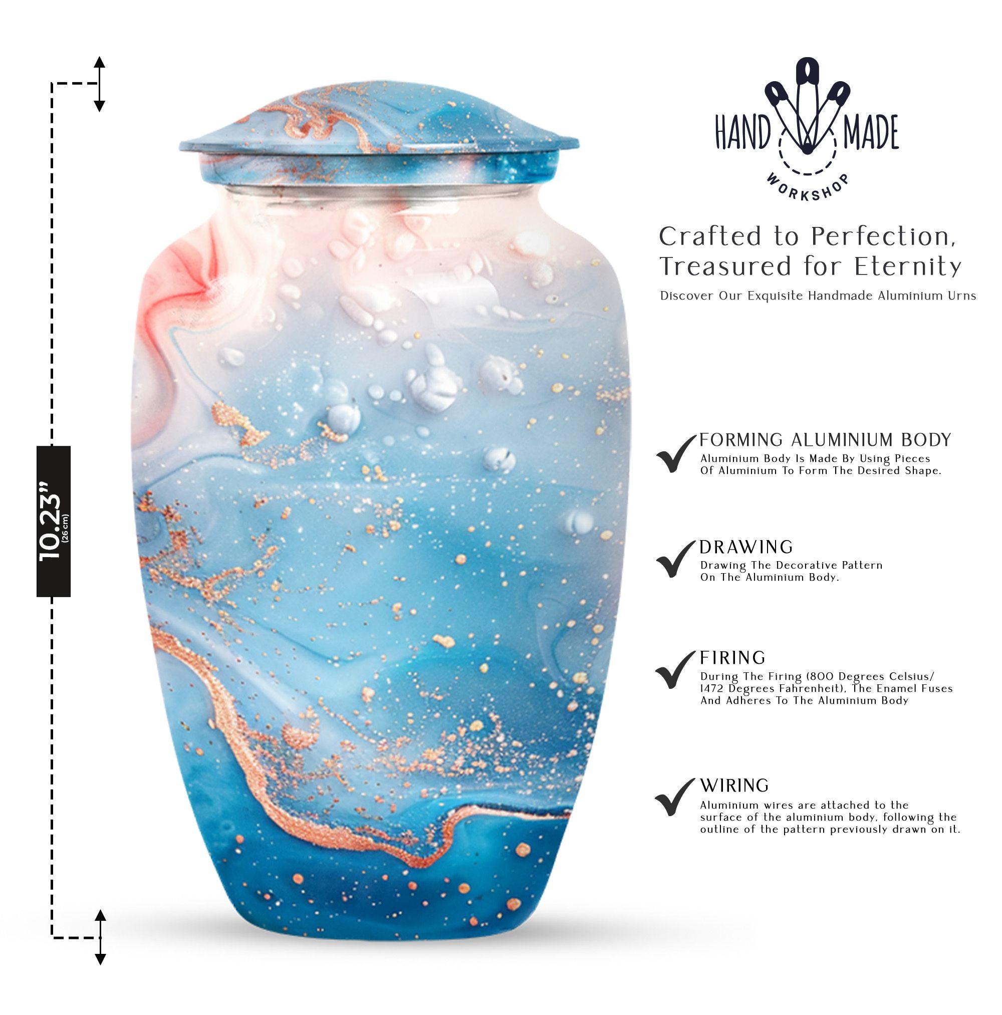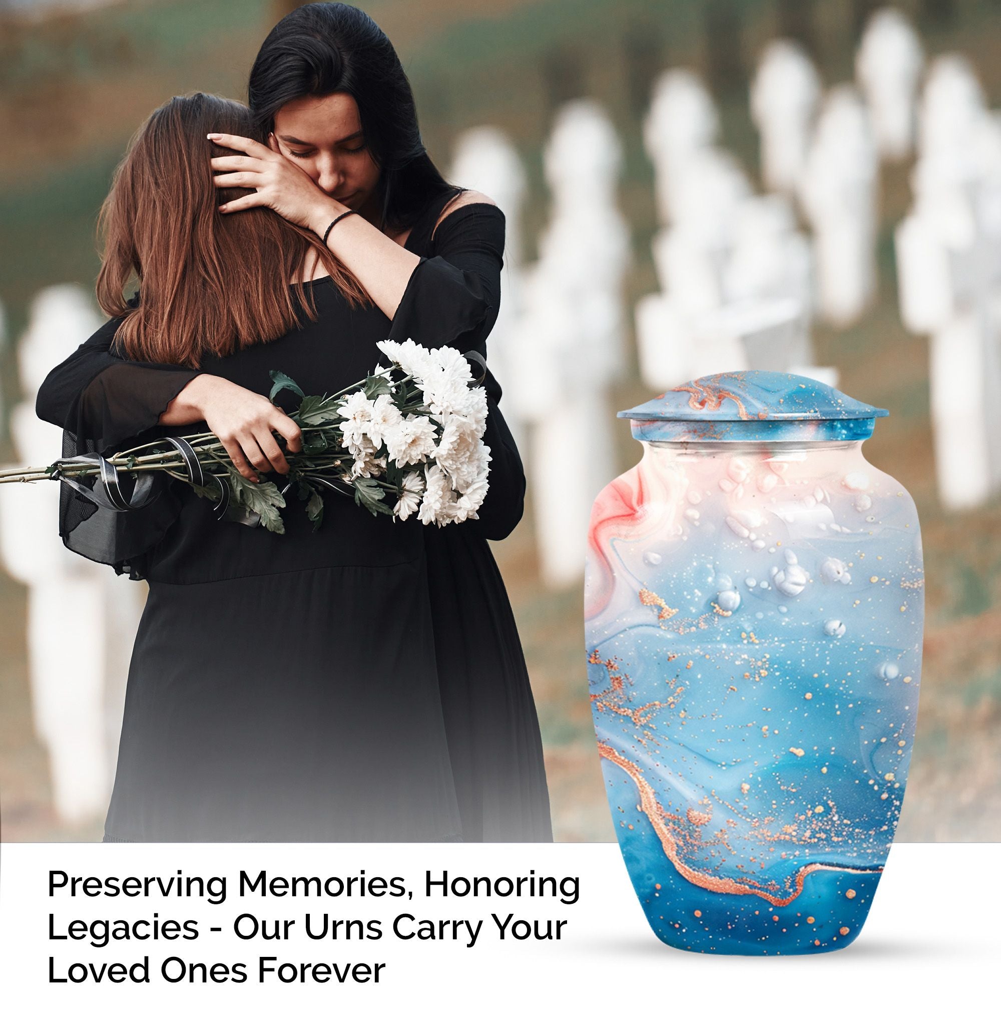 Discover a dignified way to commemorate precious lives with our 10 Inch Abstract Urn, perfect for memorial burial. Its iconic Classic Urn silhouette is crafted from sturdy aluminium, ensuring it stands as a time-honored repository of cherished memories. Despite its profound capacity of 200 cubic inches, it maintains a manageably lightweight presence at just 3.3 pounds. This tastefully abstract urn is designed to seamlessly blend with various decor styles while paying heartfelt tribute to your loved ones. Complemented by a velvet pouch for containment of ashes, it ensures security and elegance in equal measure. Further adding to this funeral urn's sentimental appeal is the ability to personalize it with engraved names, making it a truly unique dedication to singular lives. It is designed to cater to a wide range of funeral burial needs, including serving as a cremation urns for humans or a funeral urns for adult ashes. An epitome of substantial aesthetics and profound emotions, our abstract urn makes a cherished choice for memorial urns.