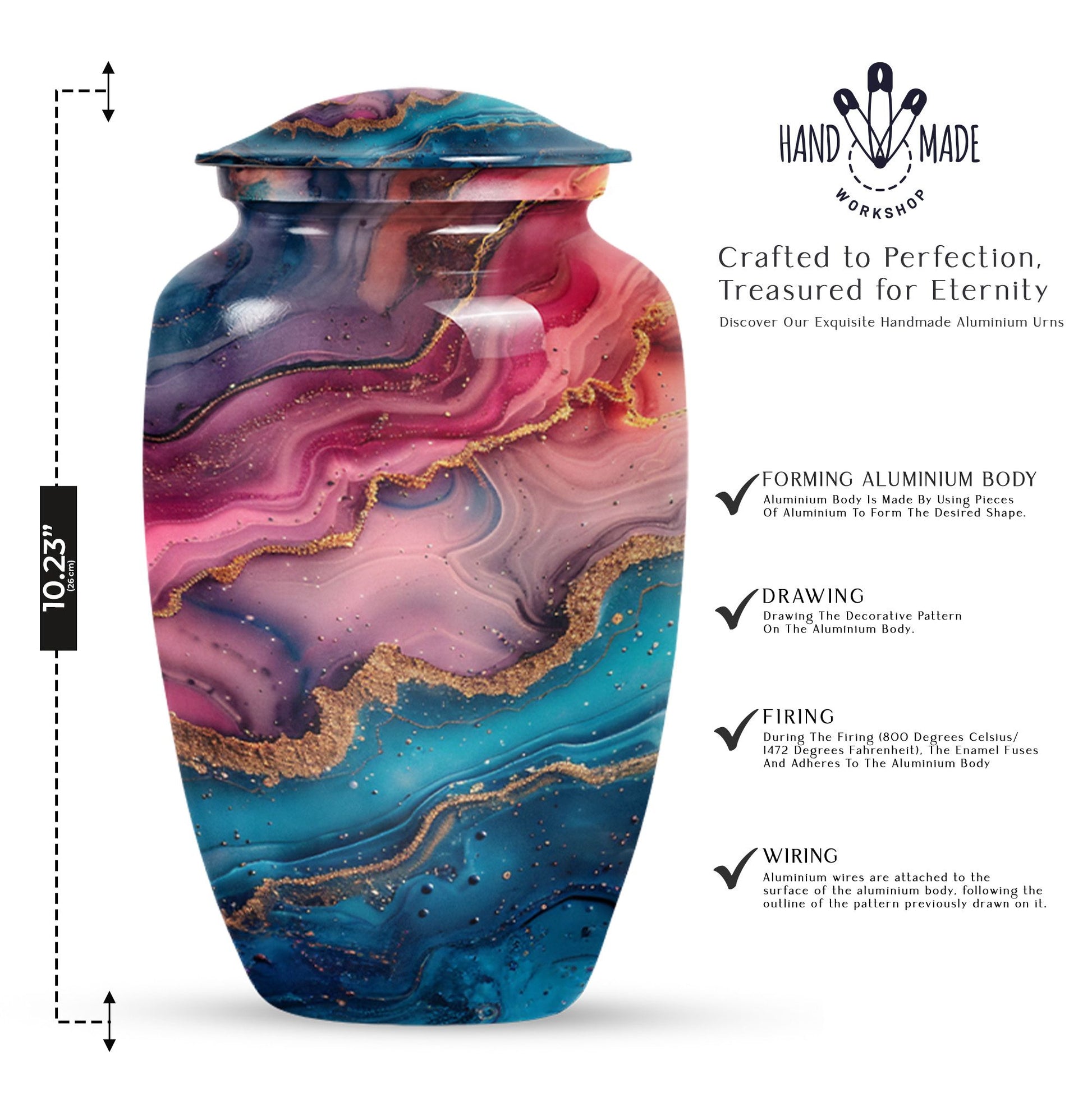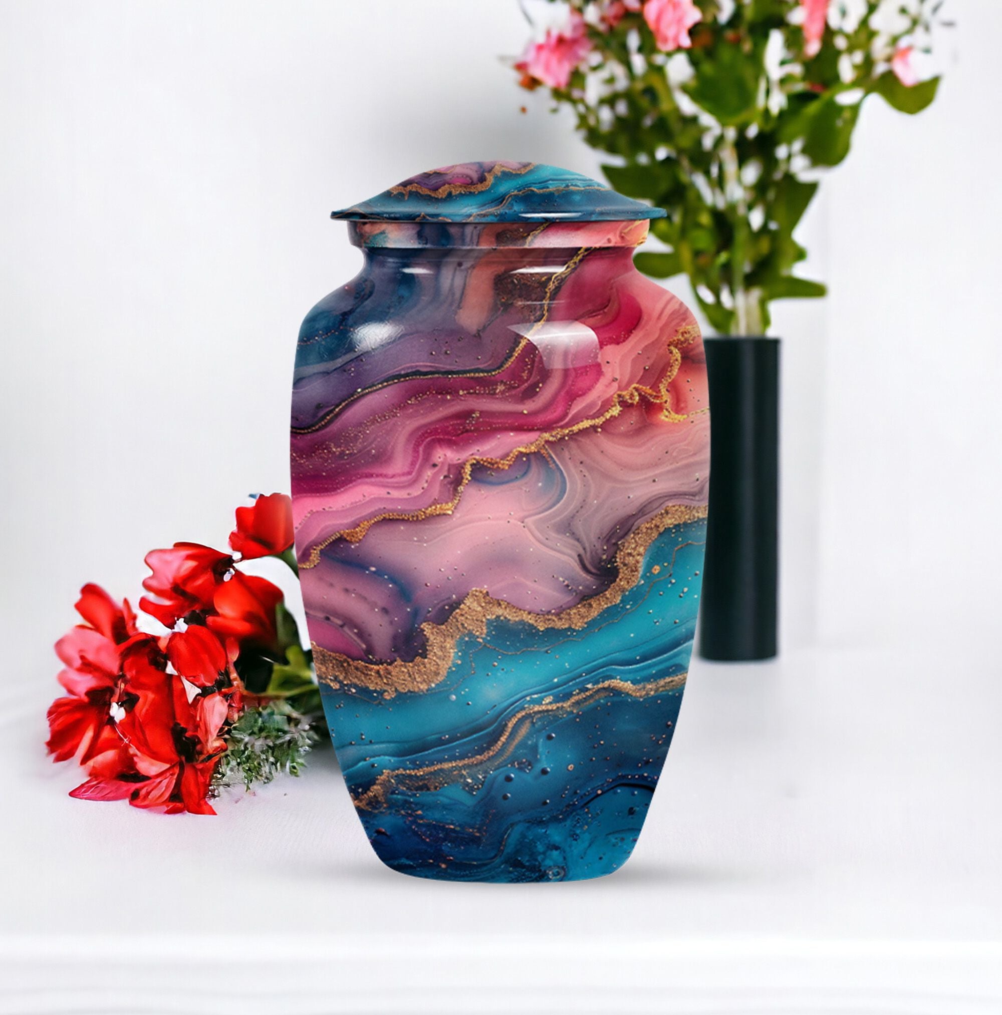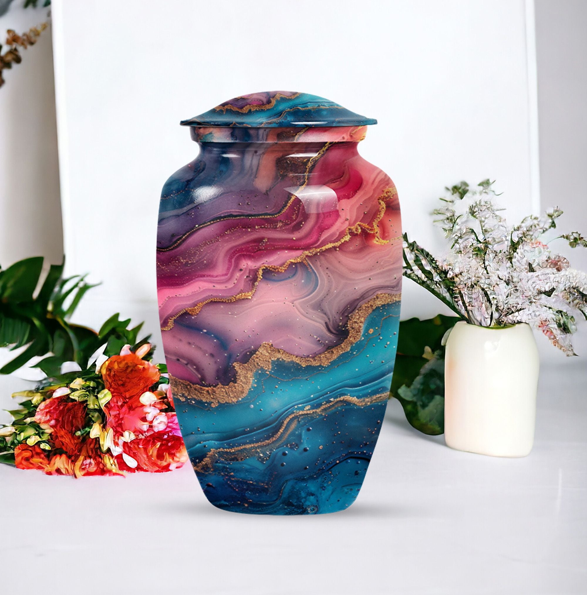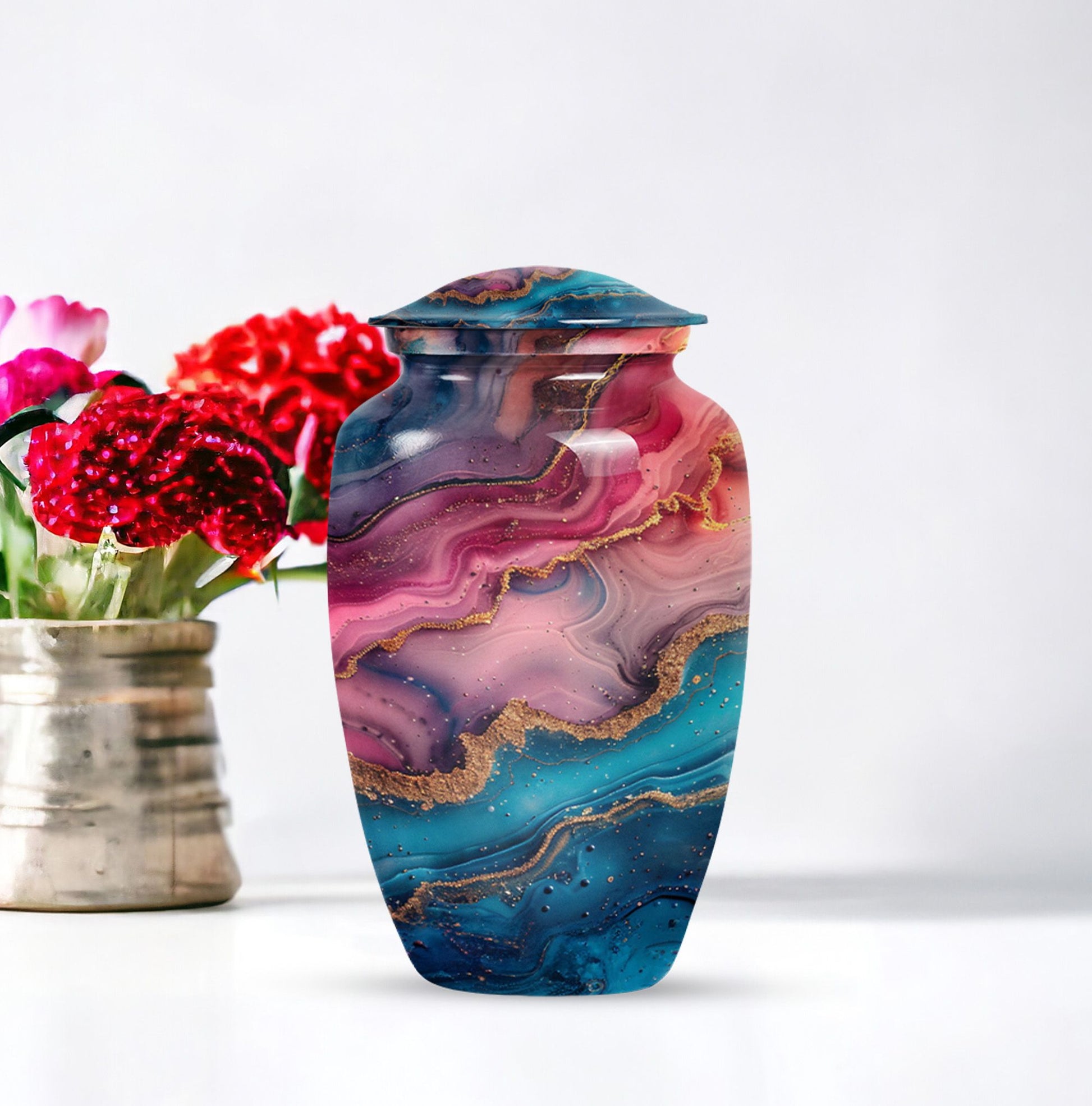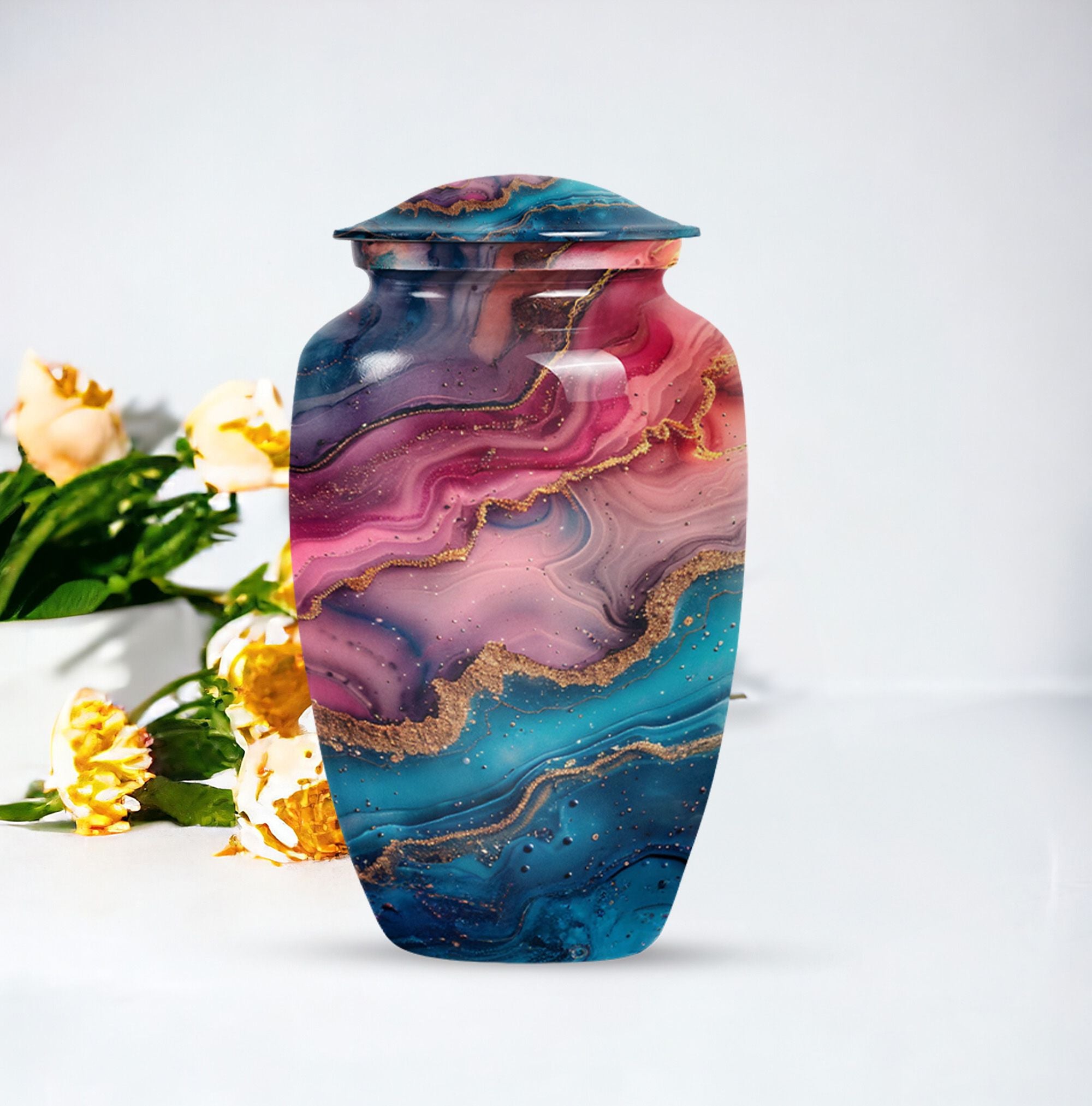 Experience a tasteful and unique way to remember your loved ones with our Abstract Urn - a suitable memorial for mom that pays tribute with dignity and respect. This elegant 10-inch Classic Urn perfectly captures a balance between tradition and modernity, presenting a unique option within Memorial Ceremony Supplies. Crafted from sturdy yet lightweight aluminium, it discreetly nestles up to 200 cubic inches of ashes. A convenient velvet pouch adds an extra layer of discretion and protection. Weighing in at a manageable 3.3 pounds, and standing at impressive 10 inches in height, this large urn is a dignified and respectful homage to your departed loved one. Add a personal touch to it as we offer the opportunity to engrave names on this classic urn for an enhanced memories keepsake. As a part of the wider category of memorial urns, this specific product is designed to cater to your specific needs of burial and cremation urns. Take a step towards peaceful remembrance using a finely crafted urn for human ashes adult, infusing bespoke elegance into your memorial tradition.