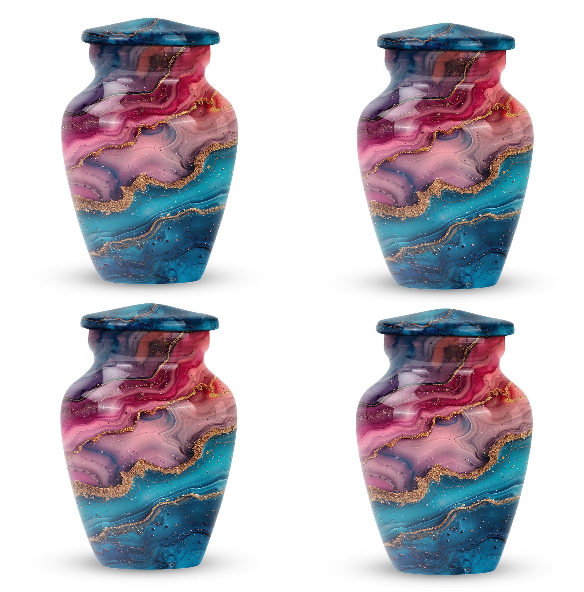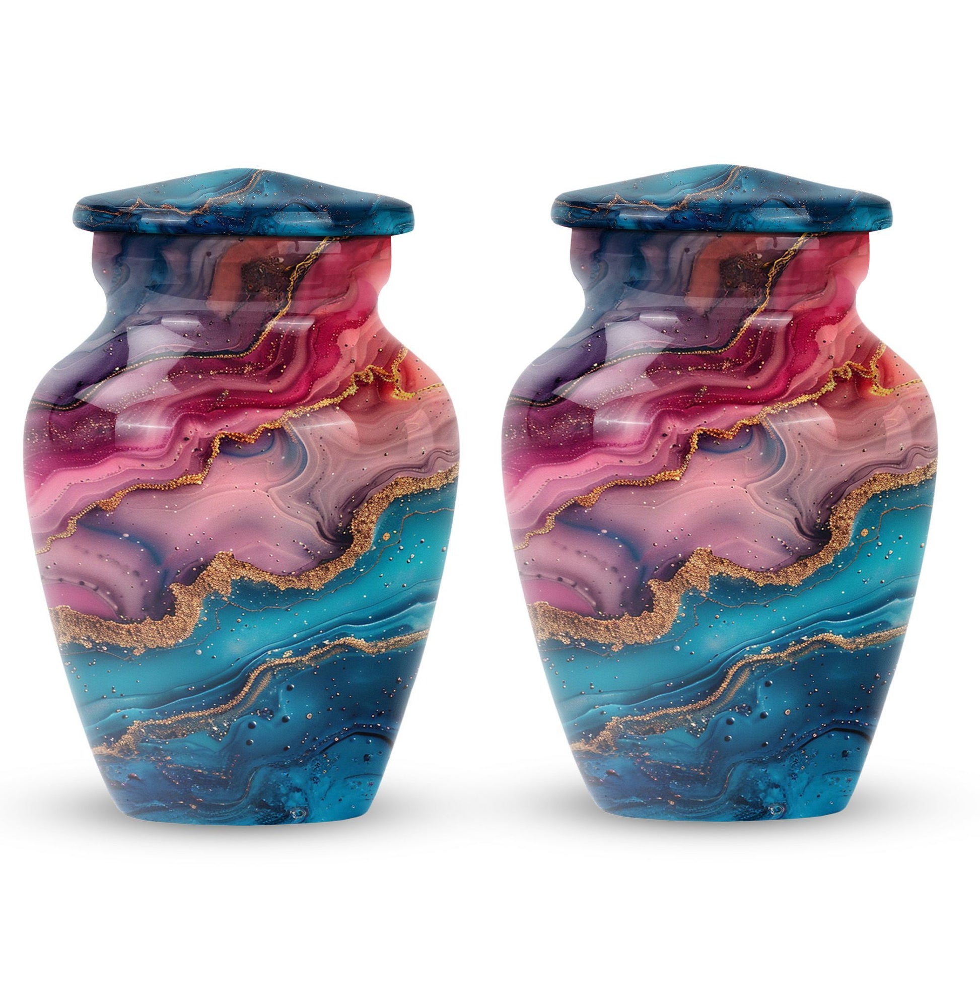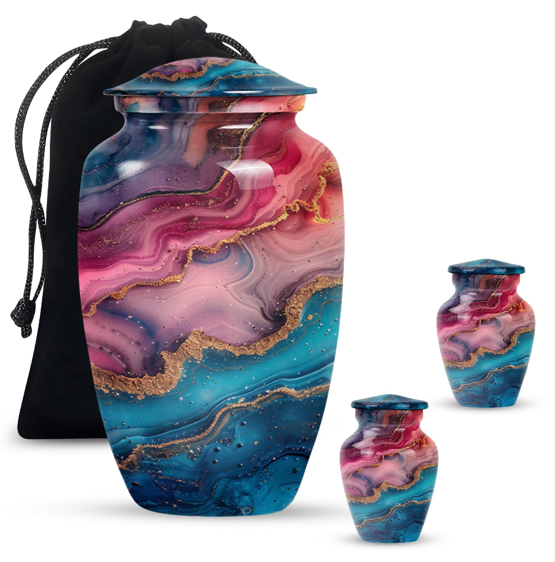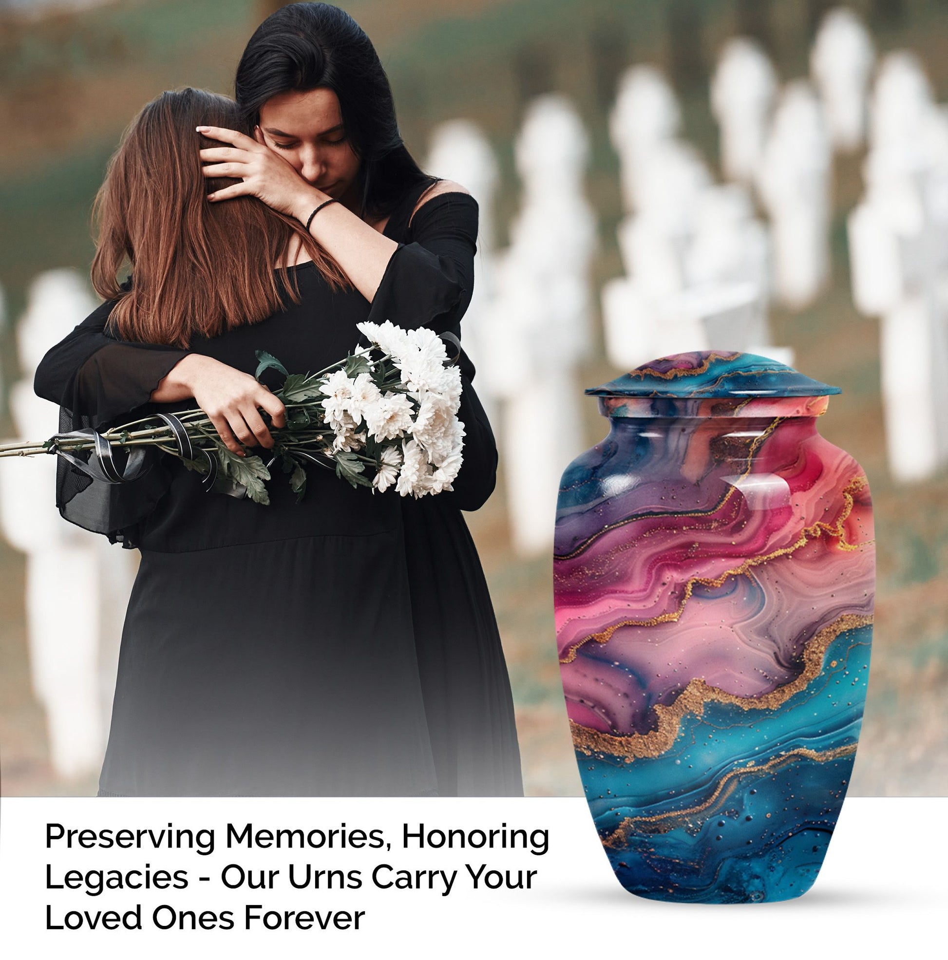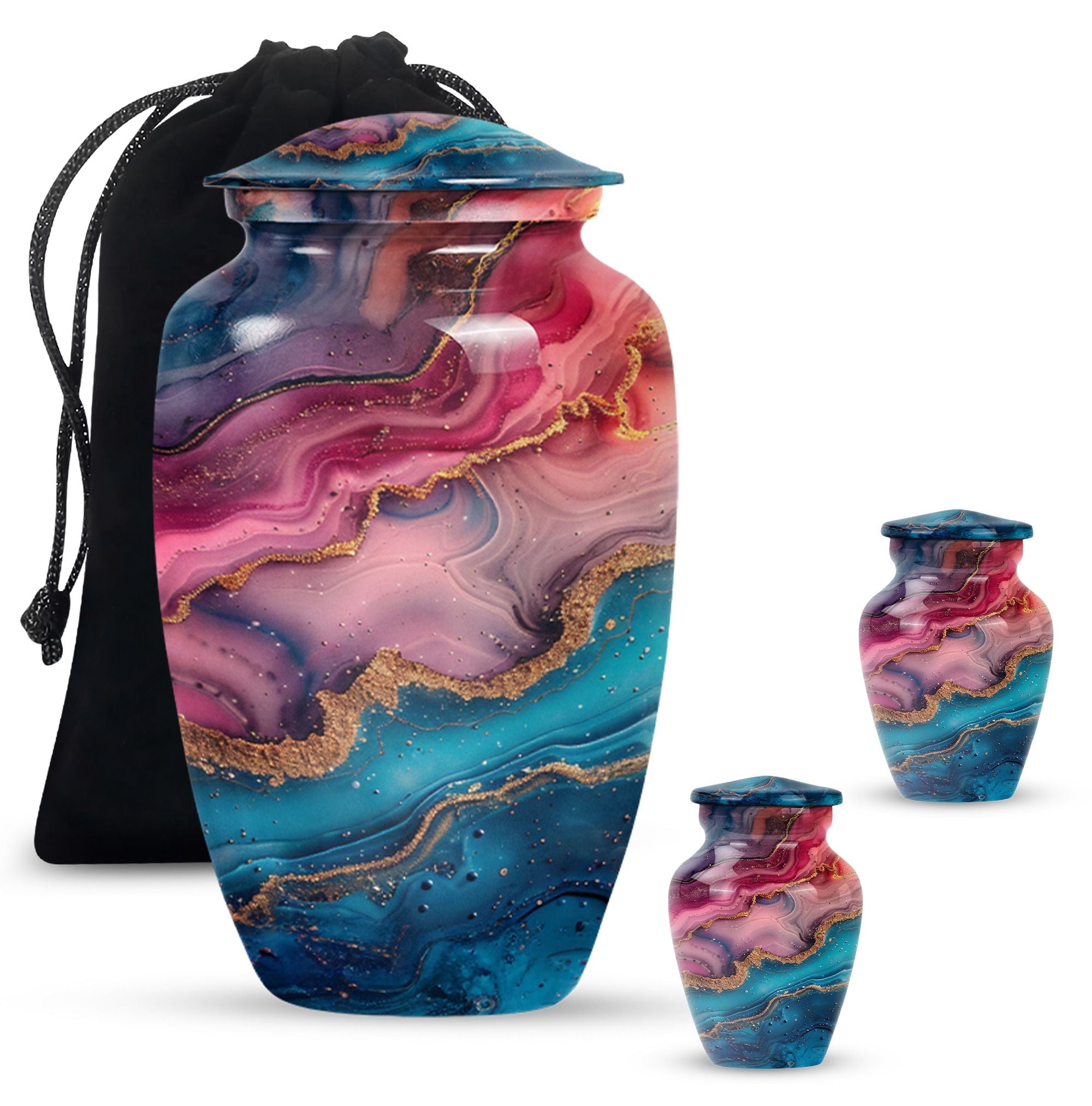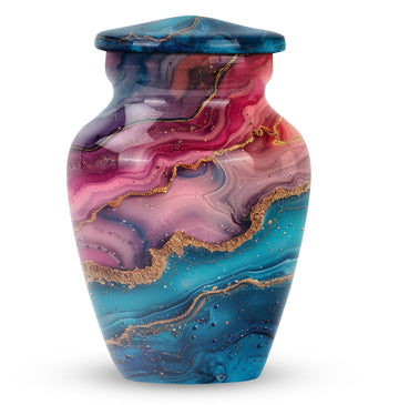 Experience a tasteful and unique way to remember your loved ones with our Abstract Urn - a suitable memorial for mom that pays tribute with dignity and respect. This elegant 10-inch Classic Urn perfectly captures a balance between tradition and modernity, presenting a unique option within Memorial Ceremony Supplies. Crafted from sturdy yet lightweight aluminium, it discreetly nestles up to 200 cubic inches of ashes. A convenient velvet pouch adds an extra layer of discretion and protection. Weighing in at a manageable 3.3 pounds, and standing at impressive 10 inches in height, this large urn is a dignified and respectful homage to your departed loved one. Add a personal touch to it as we offer the opportunity to engrave names on this classic urn for an enhanced memories keepsake. As a part of the wider category of memorial urns, this specific product is designed to cater to your specific needs of burial and cremation urns. Take a step towards peaceful remembrance using a finely crafted urn for human ashes adult, infusing bespoke elegance into your memorial tradition.