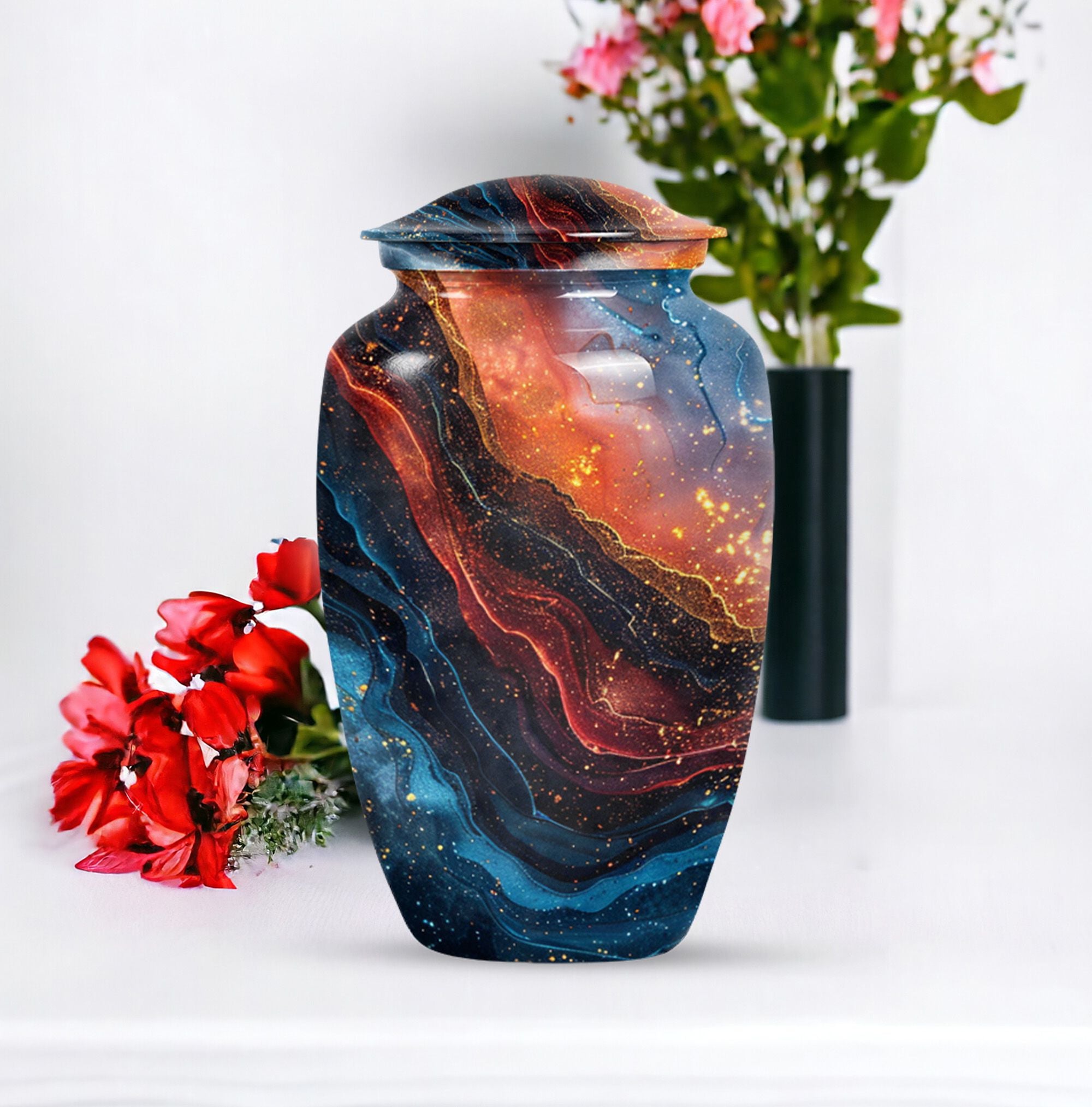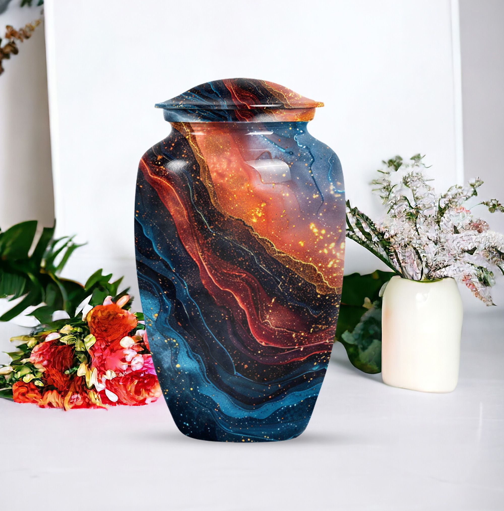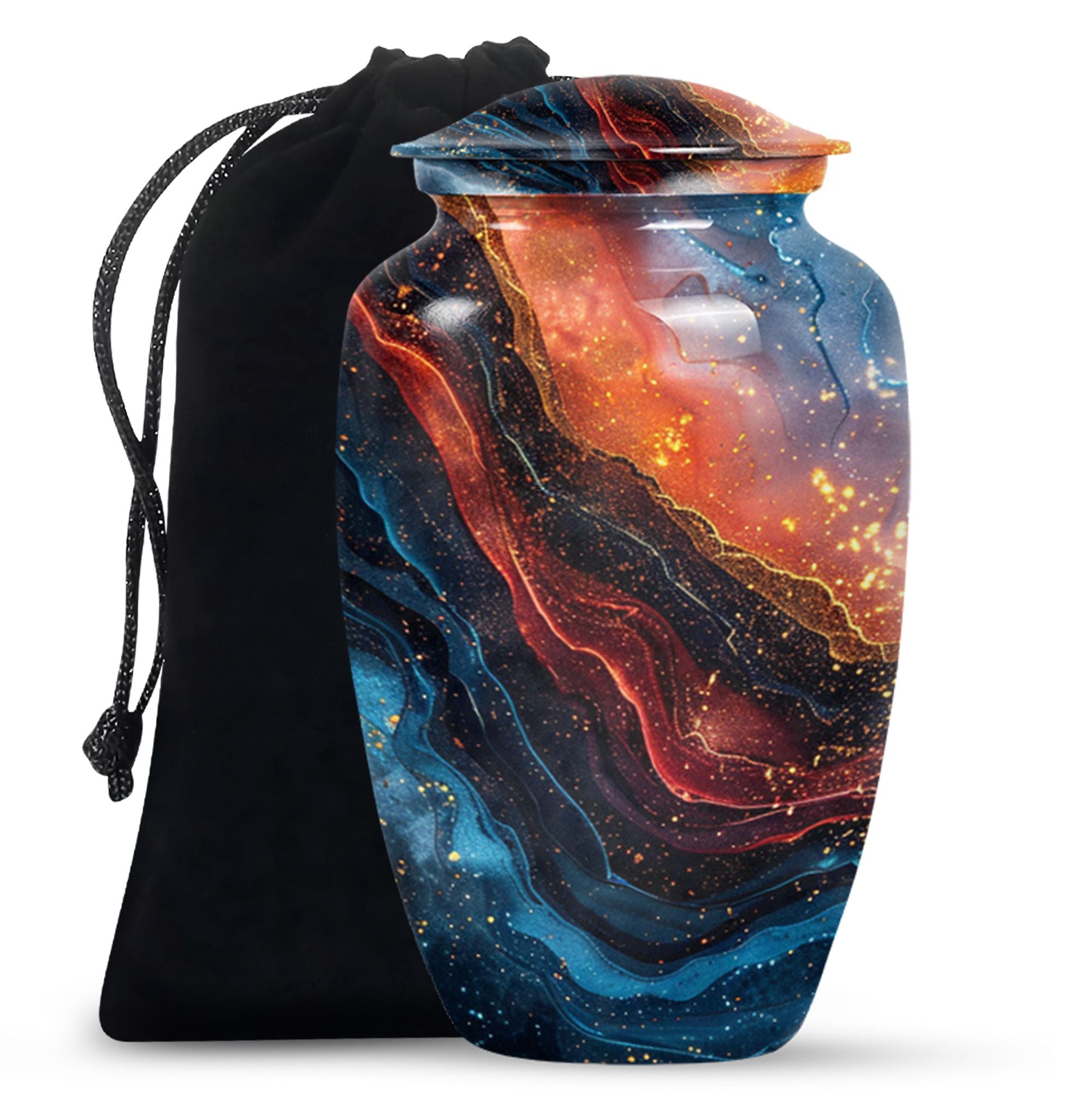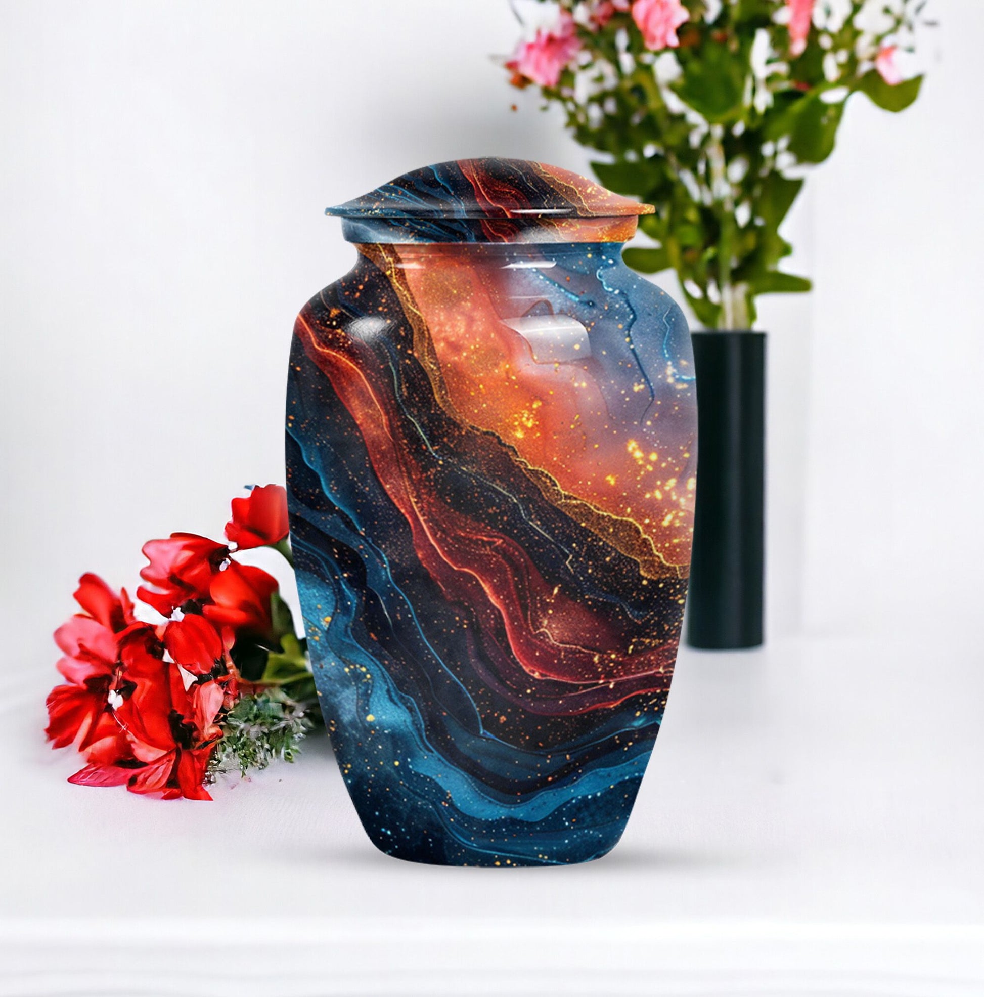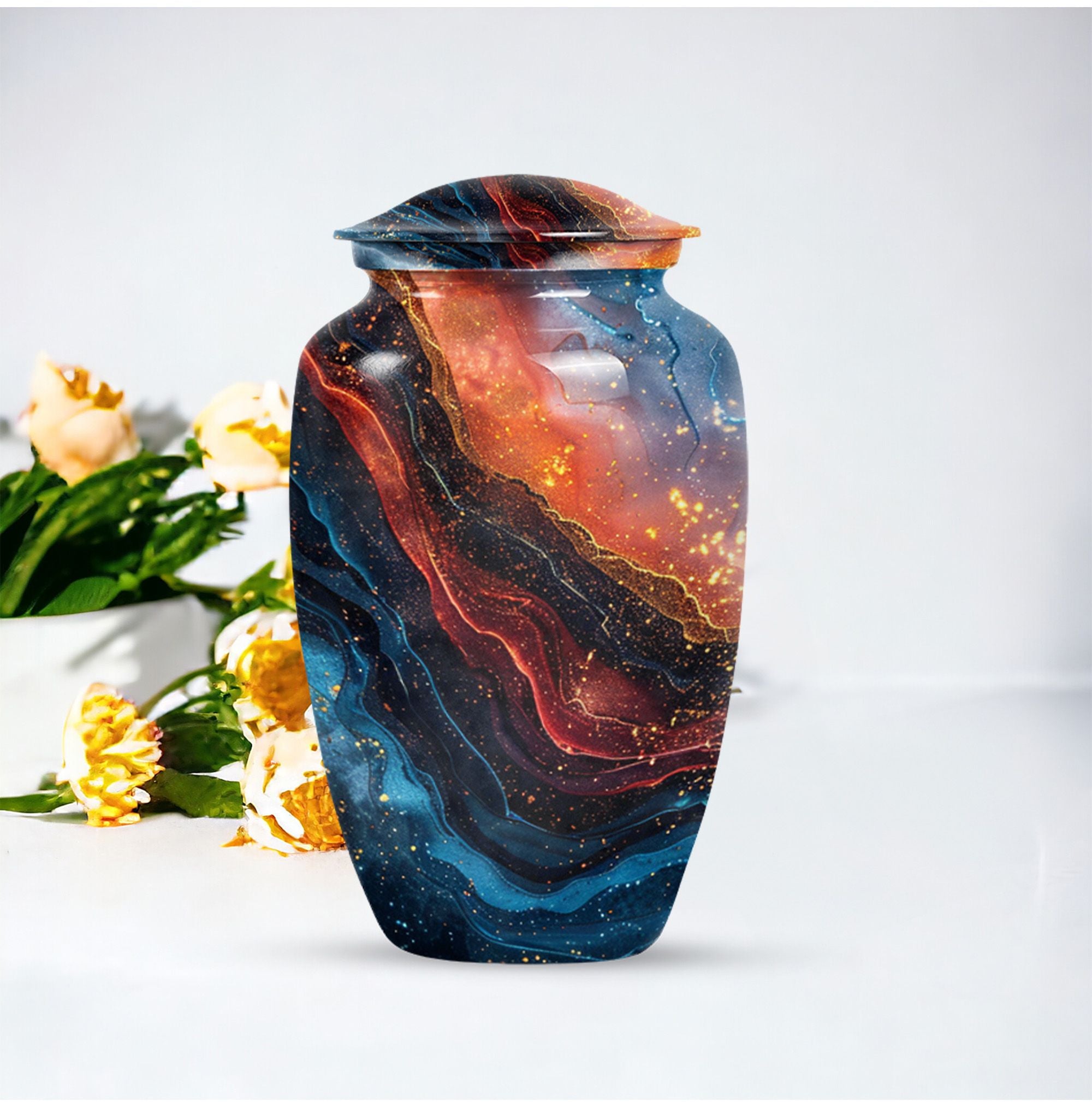 Experience a rare blend of beauty and sophistication with this Large Abstract Urn. Crafted from high-quality aluminium, this funeral urn for human ashes offers an innovative approach to commemorative keepsakes. Its substantial 10-inch size and weight of 3.3 pounds make it a sturdy and durable option for safe containment of your dear one's ashes. Offering a vast capacity of 200 cubic inches, our urn easily accommodates the ashes of an adult man, reassuring you of an all-around fit in terms of size and volume. The urn goes beyond functionality, breaking away from standard designs with an abstract theme for added aesthetics. With options to personalize with engraved names, it adds a unique and thoughtful touch to this already alluring cremation urn. Each purchase includes a luxe velvet pouch, providing protective storage for the ashes. Bask in the novelty of this aluminium cremation urn, conscientiously designed for those searching for 'metal urns for adult human ashes' or 'urns for cremation ashes'.