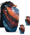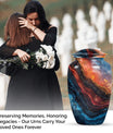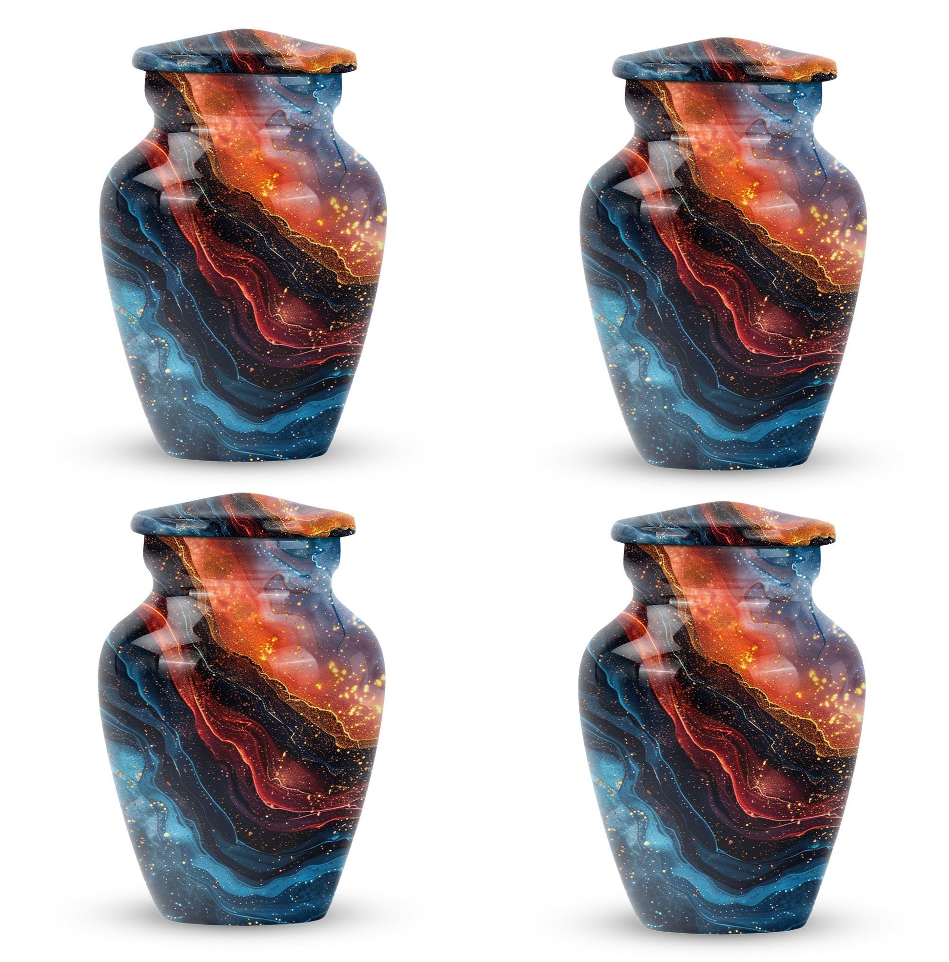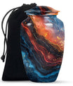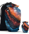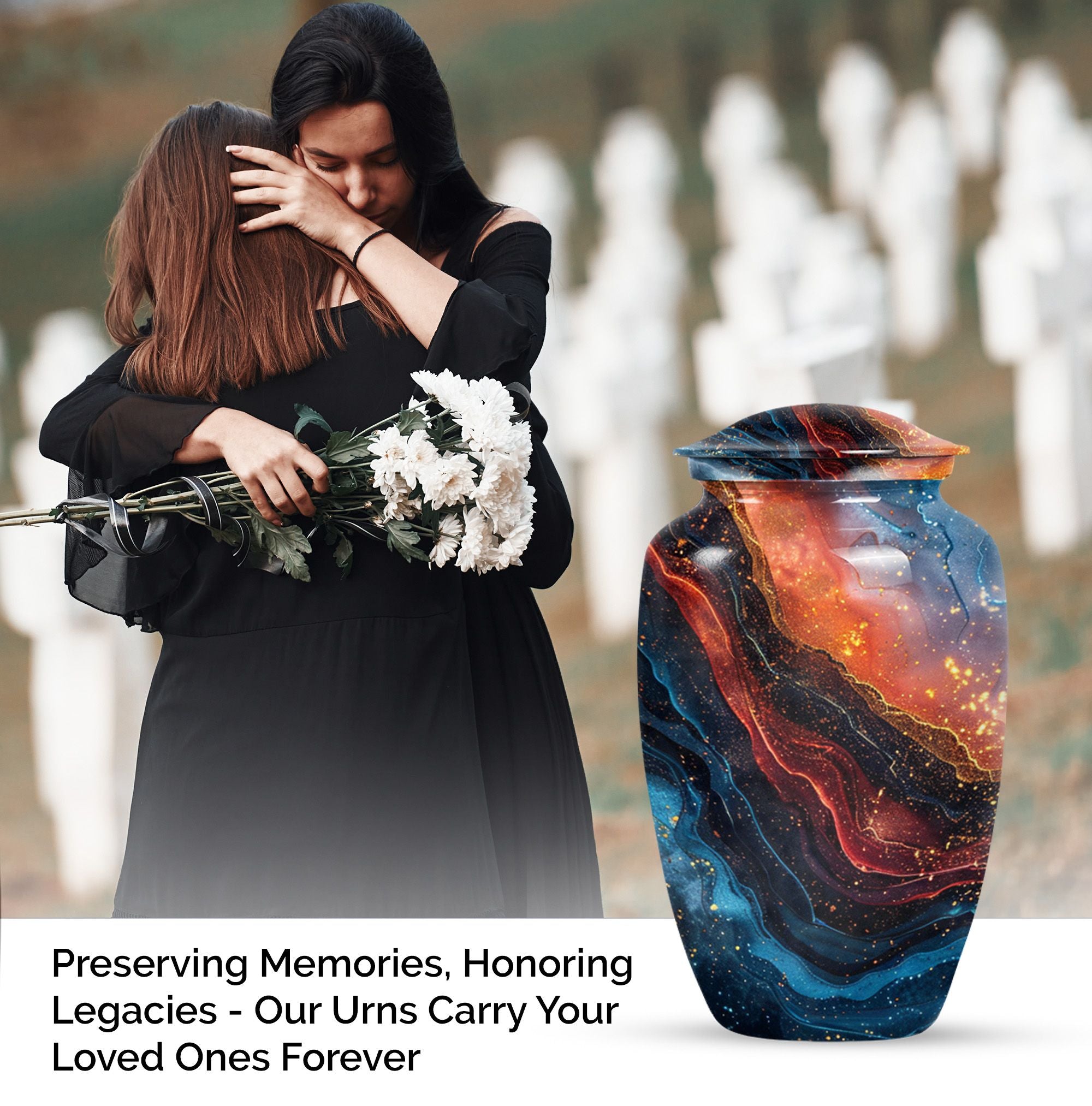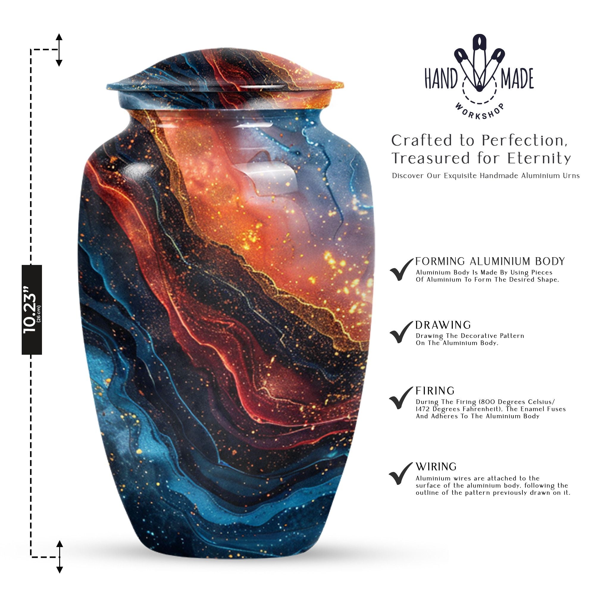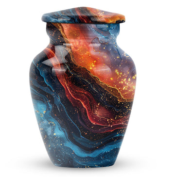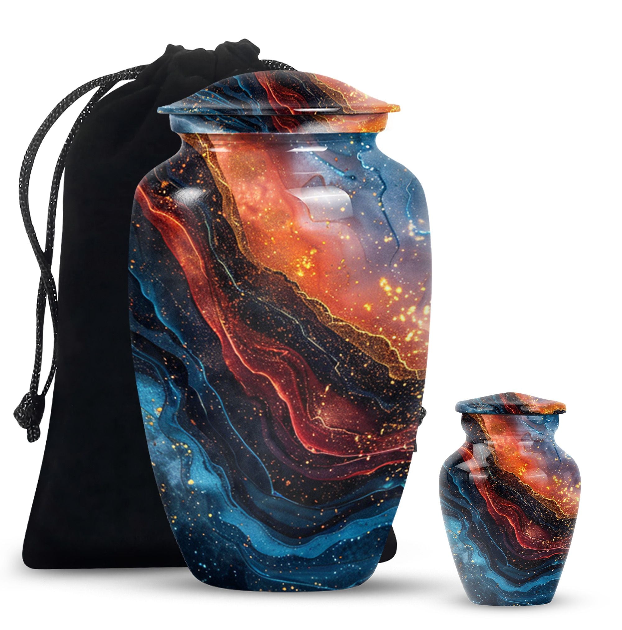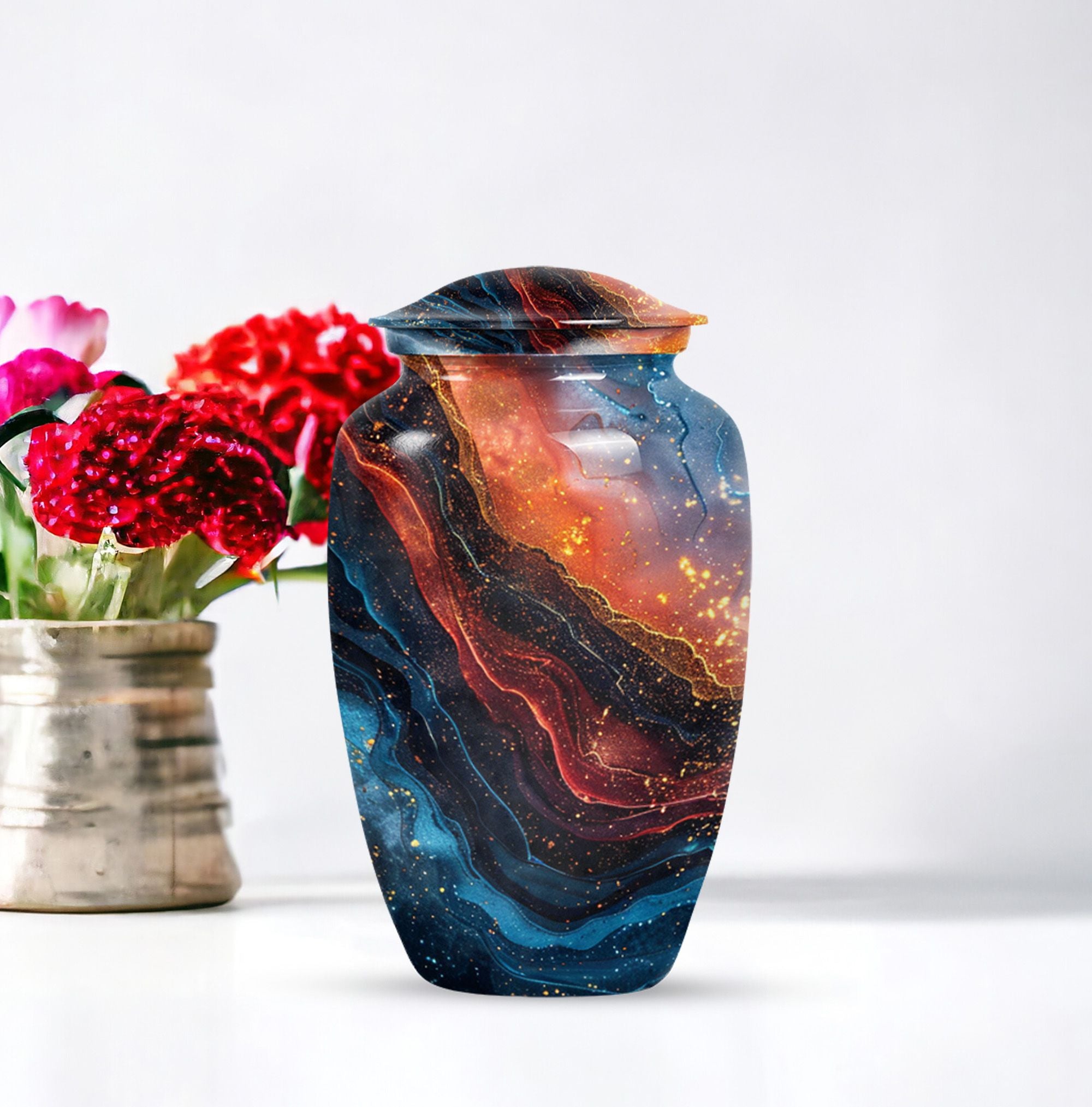 Experience a rare blend of beauty and sophistication with this Large Abstract Urn. Crafted from high-quality aluminium, this funeral urn for human ashes offers an innovative approach to commemorative keepsakes. Its substantial 10-inch size and weight of 3.3 pounds make it a sturdy and durable option for safe containment of your dear one's ashes. Offering a vast capacity of 200 cubic inches, our urn easily accommodates the ashes of an adult man, reassuring you of an all-around fit in terms of size and volume. The urn goes beyond functionality, breaking away from standard designs with an abstract theme for added aesthetics. With options to personalize with engraved names, it adds a unique and thoughtful touch to this already alluring cremation urn. Each purchase includes a luxe velvet pouch, providing protective storage for the ashes. Bask in the novelty of this aluminium cremation urn, conscientiously designed for those searching for 'metal urns for adult human ashes' or 'urns for cremation ashes'.