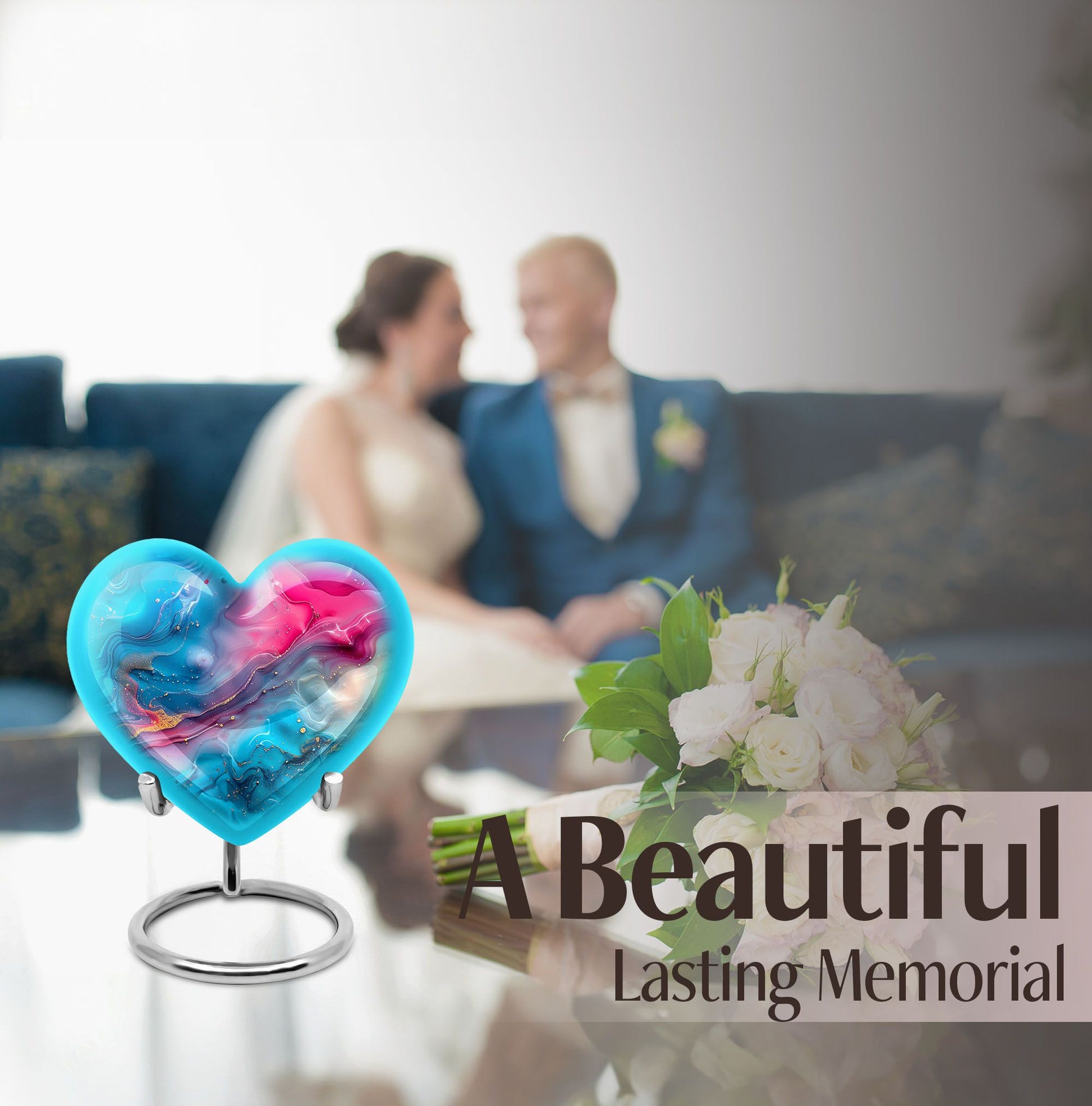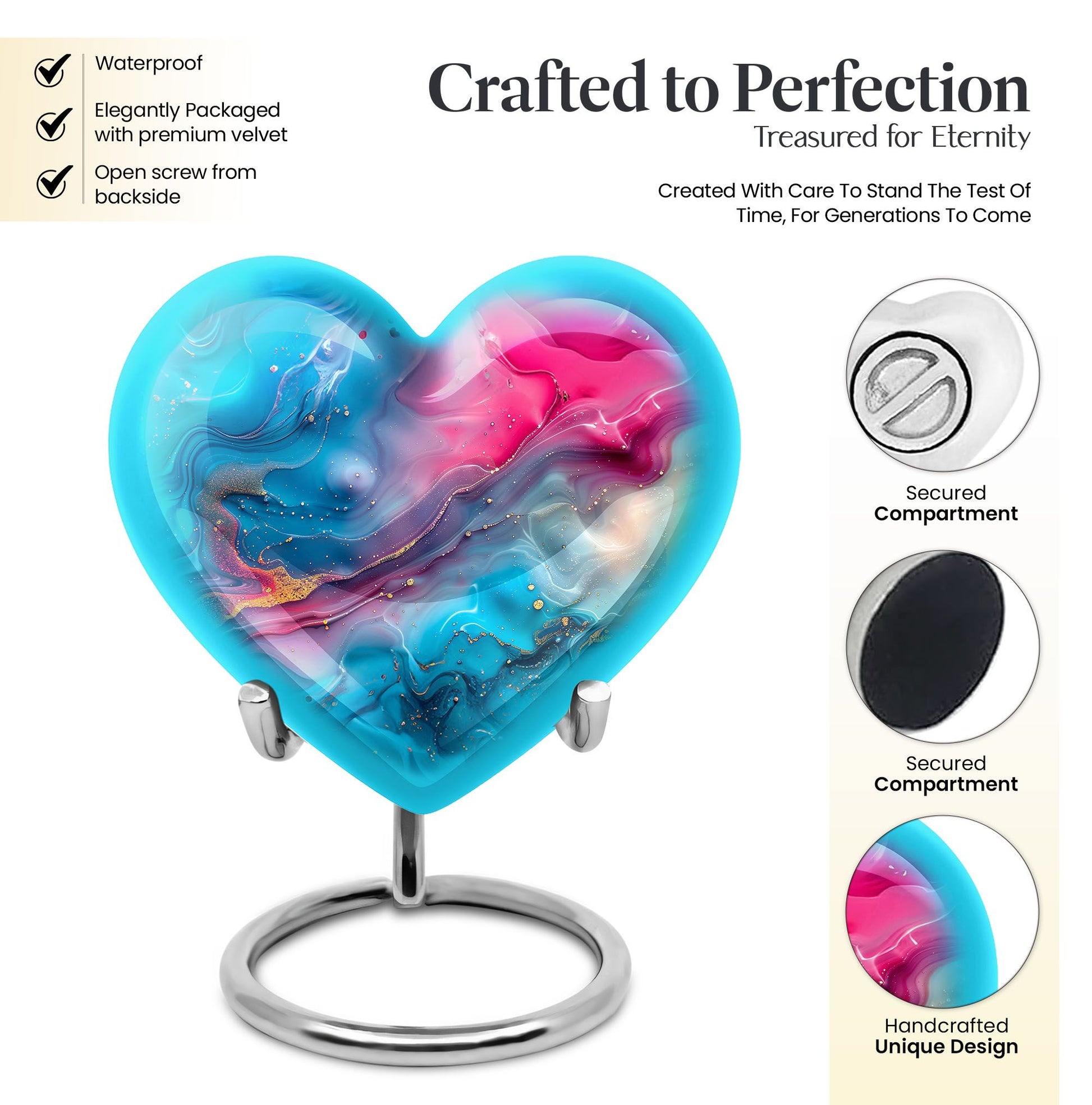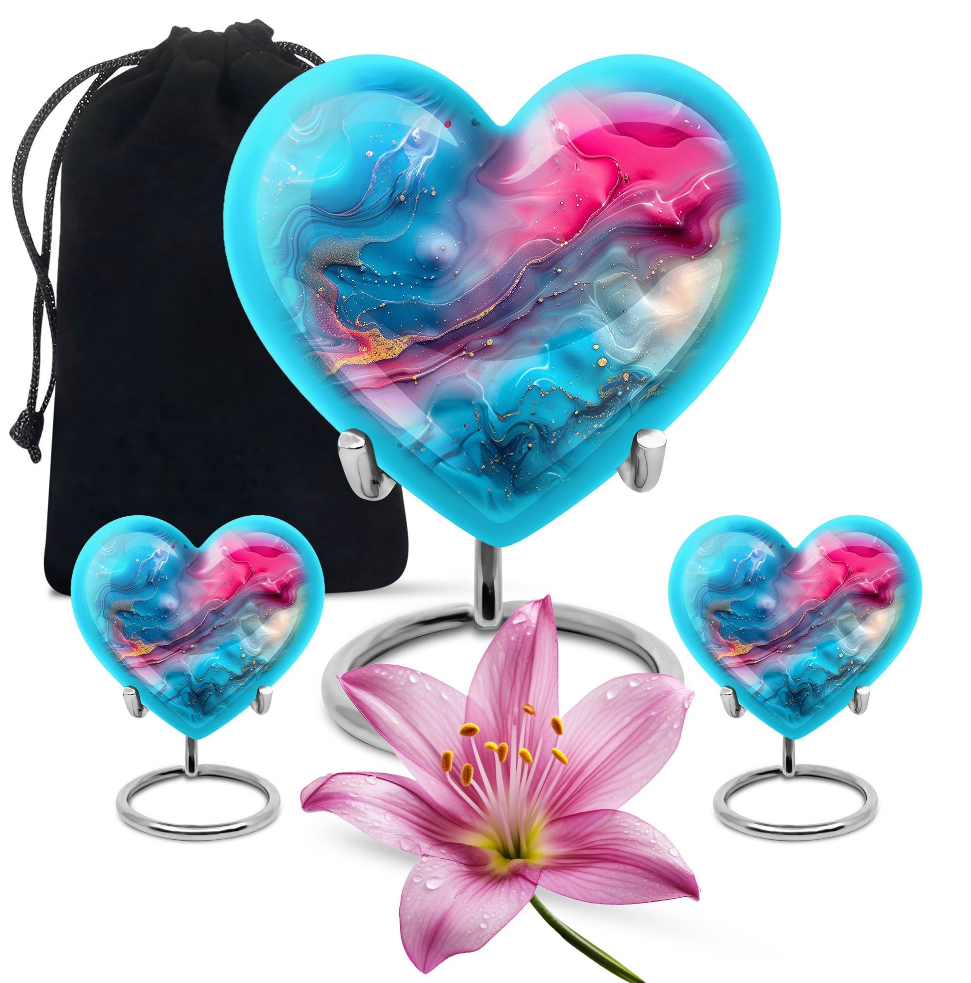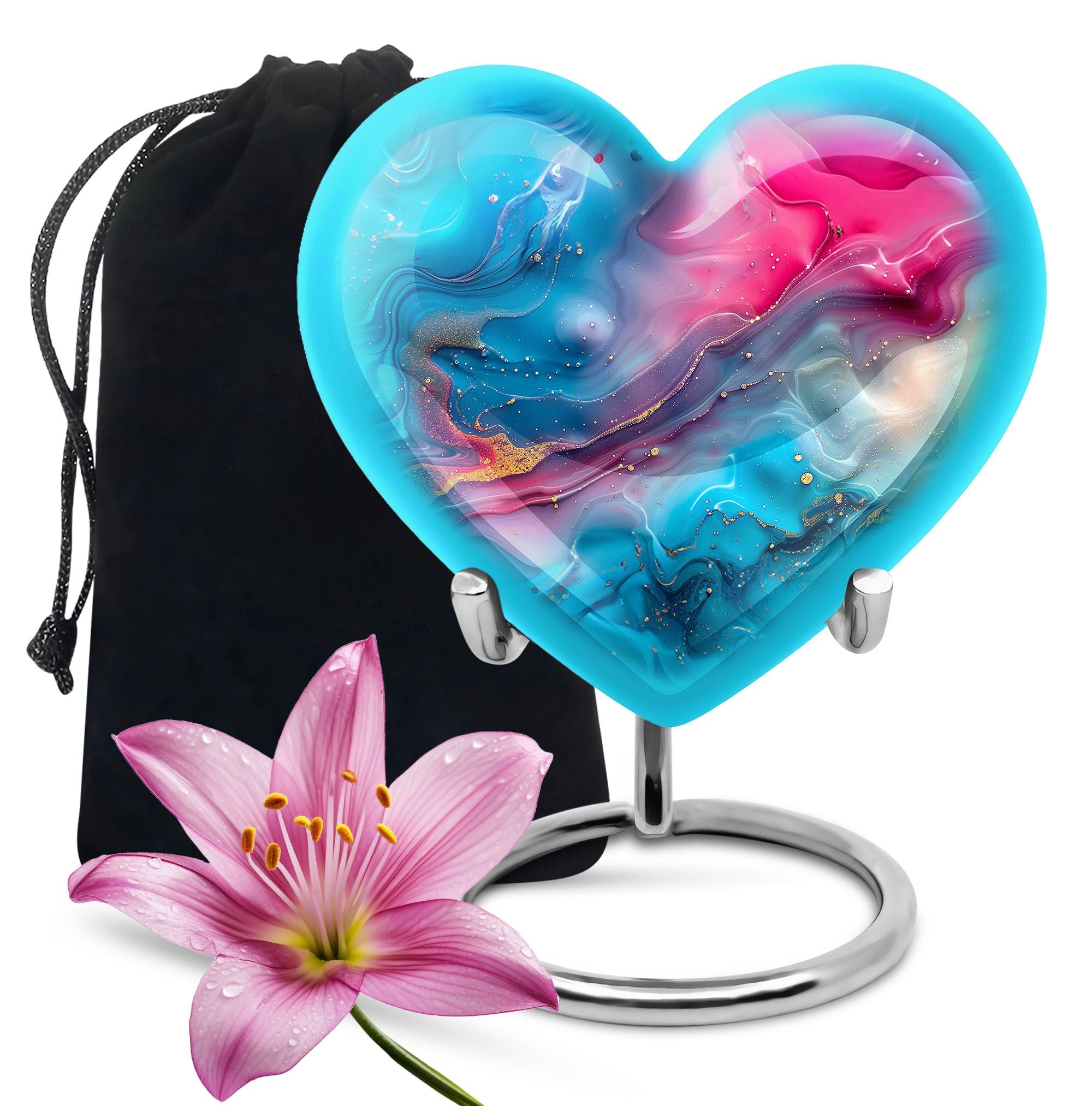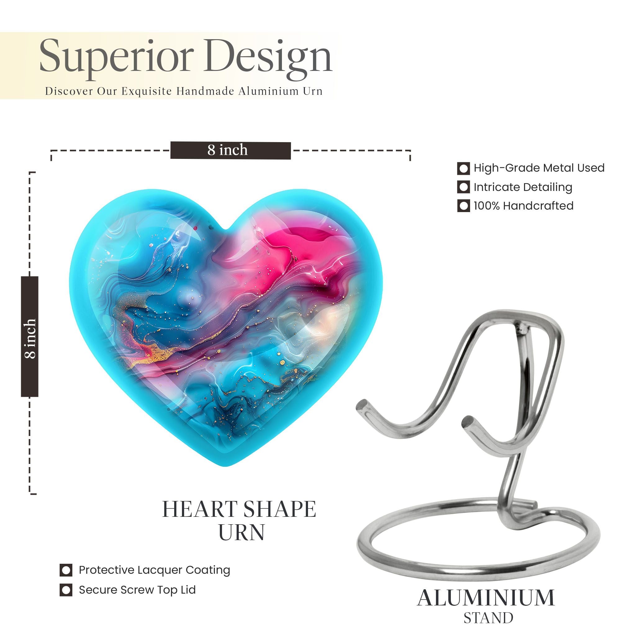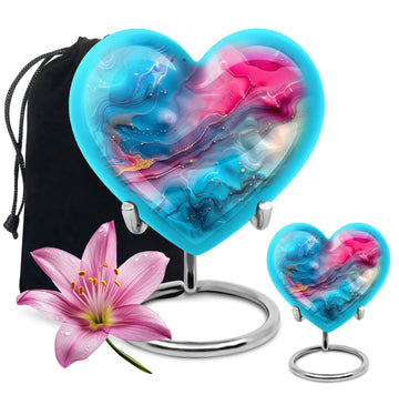Honor your loved ones with dignity with this deluxe, deep 10-inch Aluminium Abstract Urn. This cremation urn serves as a lasting memory and comes in a commanding size, uniquely shaped like a heart to show the enduring love for your departed. It offers a substantial capacity of 200 cubic inches to securely accommodate the ashes of an adult male. The urn weighs 3.3 pounds which adds to its formidable presence and long-lasting quality. It comes with a comforting velvet pouch ensuring safe containment and transport. Adding a personalized touch, this urn allows for engraved names, making a unique piece entirely. This Abstract Urn strays from the generic look of other large urns, embracing an abstract theme to create a distinctive and unforgettable tribute. Portability makes it an ideal choice for those who wish to embark on memorial travel. This product takes into account the needs of those searching for 'urns for males', 'human urns for ashes female', 'Portable Urns for Travels'.