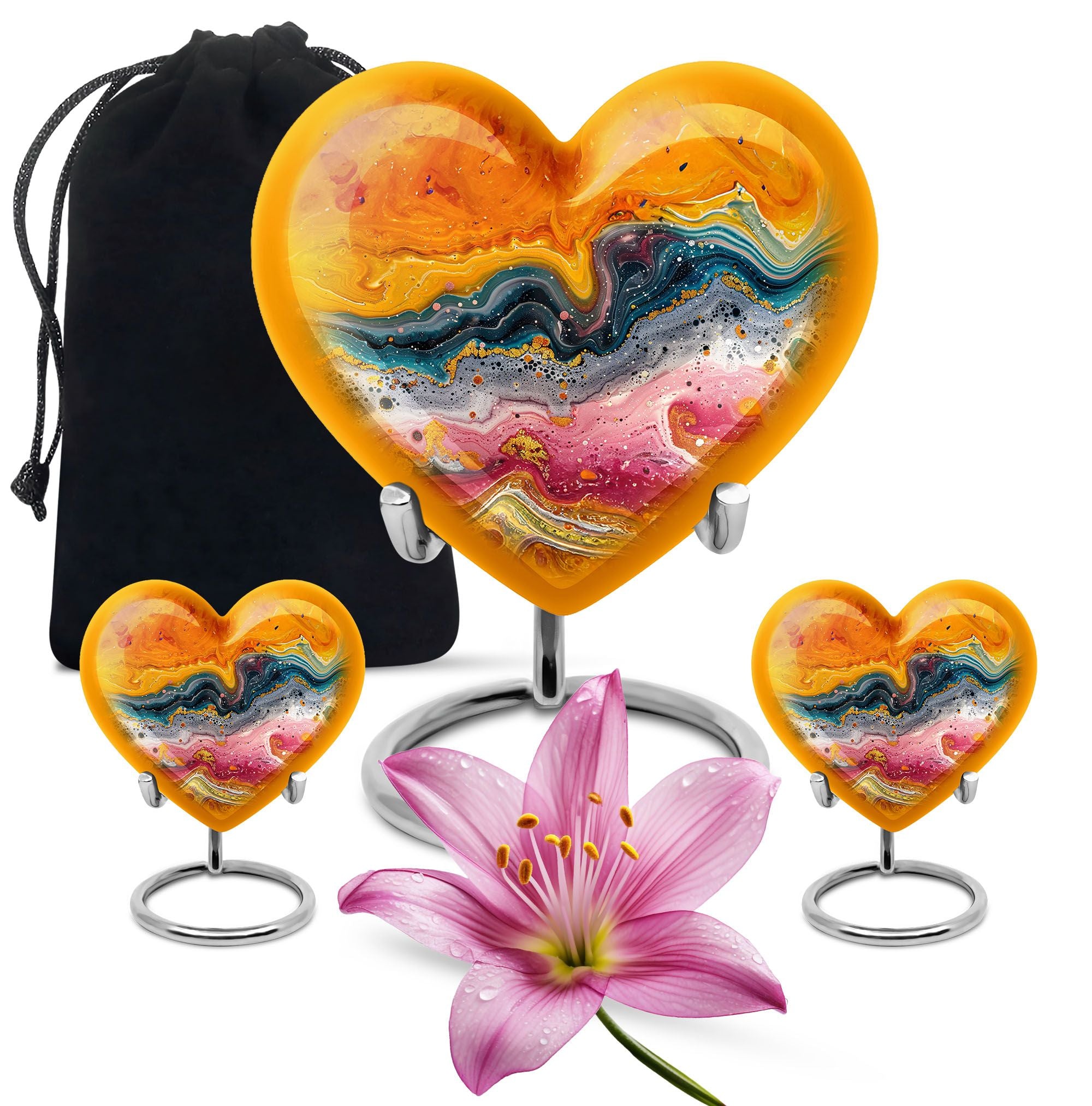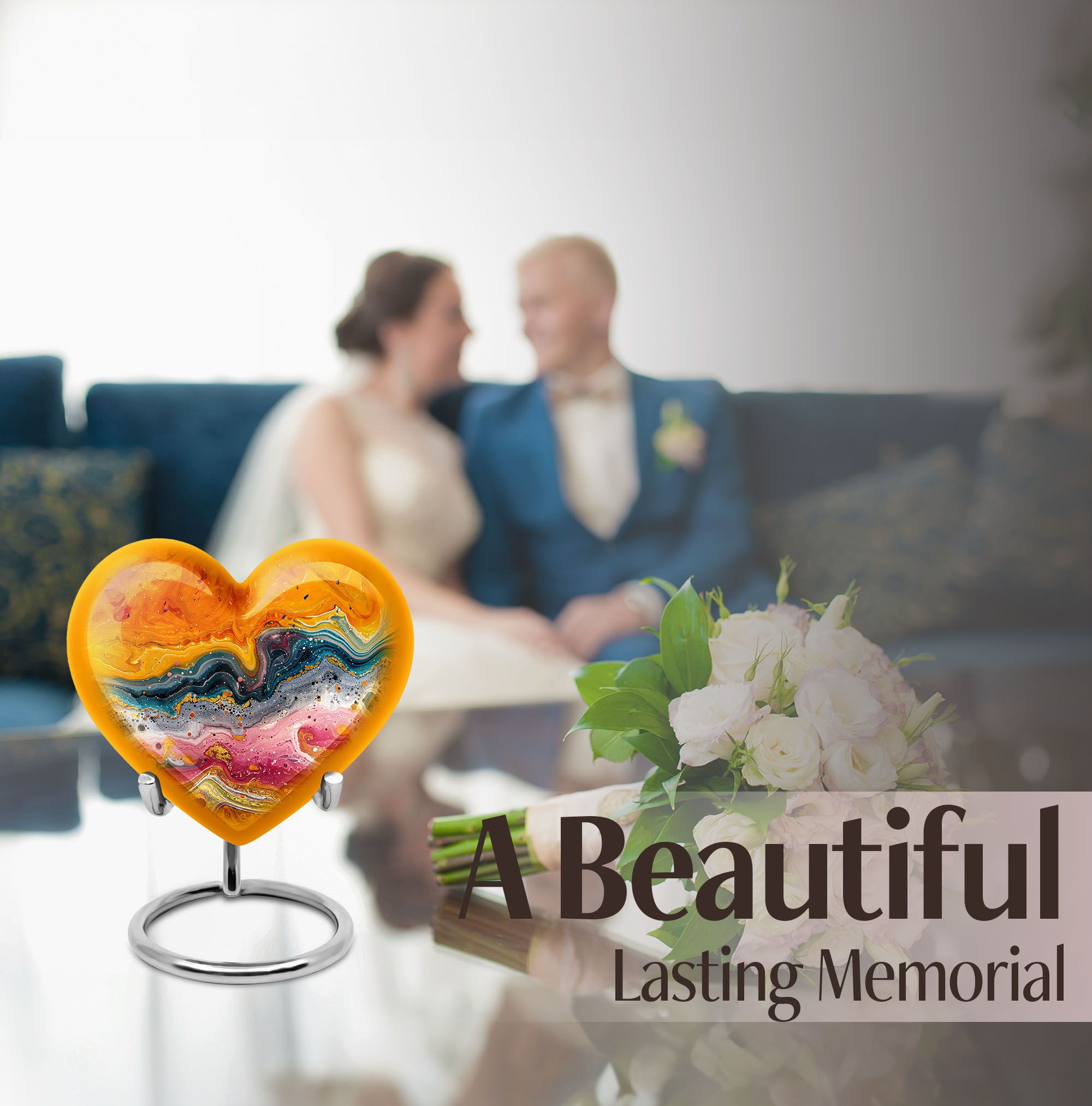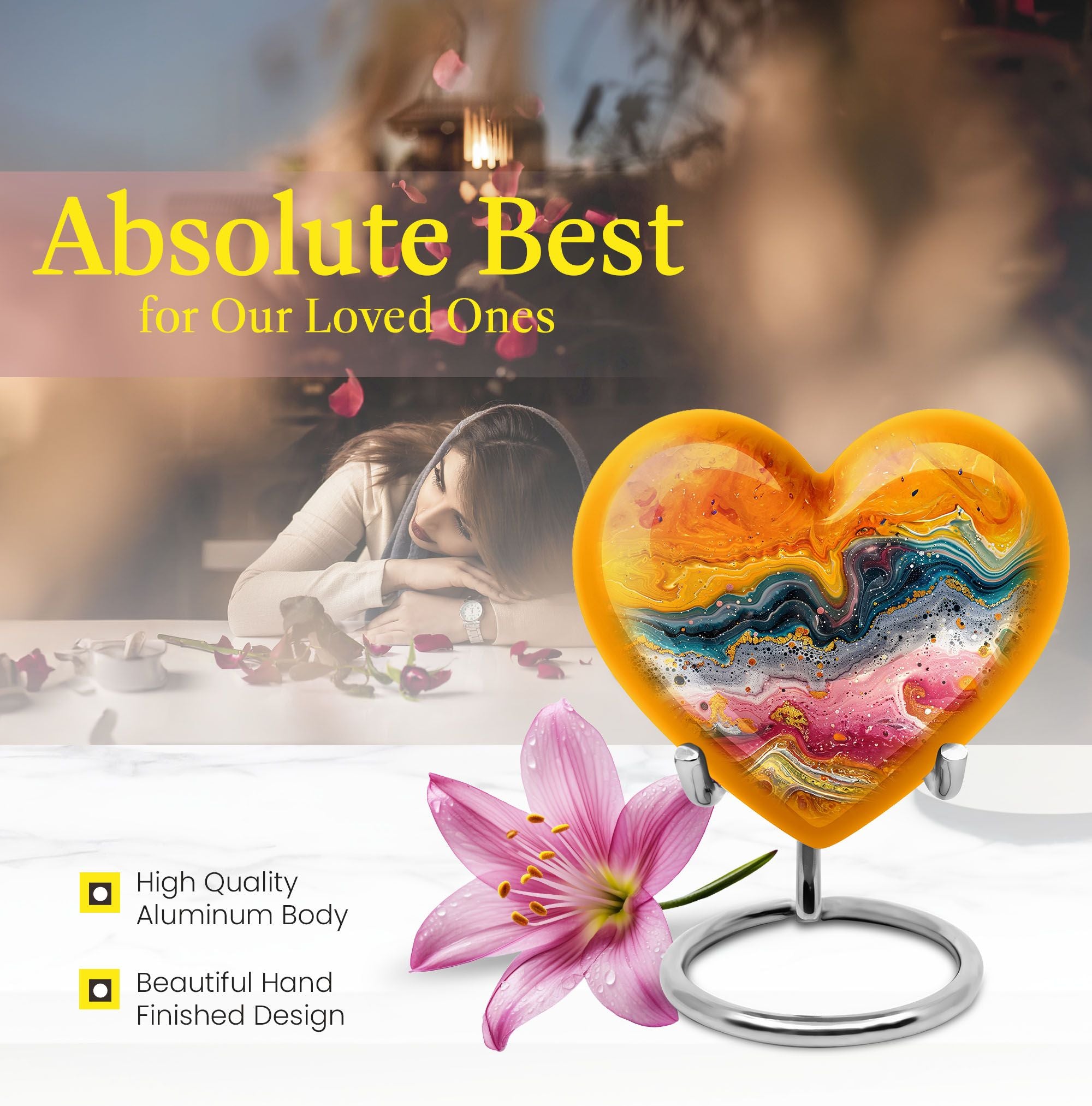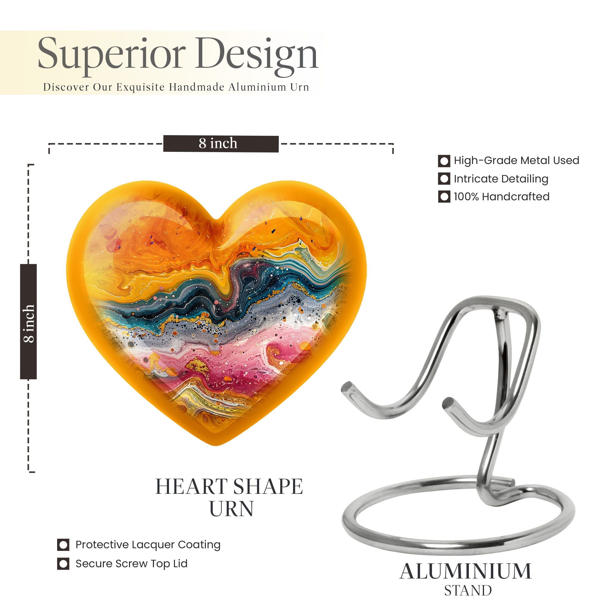 Honor your beloved one with our unique, Abstract Urn. This 10-inch cremation urn is a touching tribute, artfully crafted in a heart design from durable aluminium. Perfectly suitable for large urn needs, it has an impressive weight of 3.3 pounds and dimensions of 10 inches in height. Its substantial capacity of 200 cubic inches offers ample space to securely house the ashes of your dear departed. Every urn is paired with a velvet pouch, which provides an elegant containment for the remains. You may also choose to personalize this funeral urn, engraving names that will forever remind you of the precious moments you've shared. This heartfelt product demonstrates our dedication to providing meaningful memorial ceremony supplies. Ideal as funeral urns for mom or urns for any female, this item reflects the deep-seated love and respect that never dies. Uncommonly breathtaking, our personalized, unique urn for ashes brilliantly blends sentiment with style.