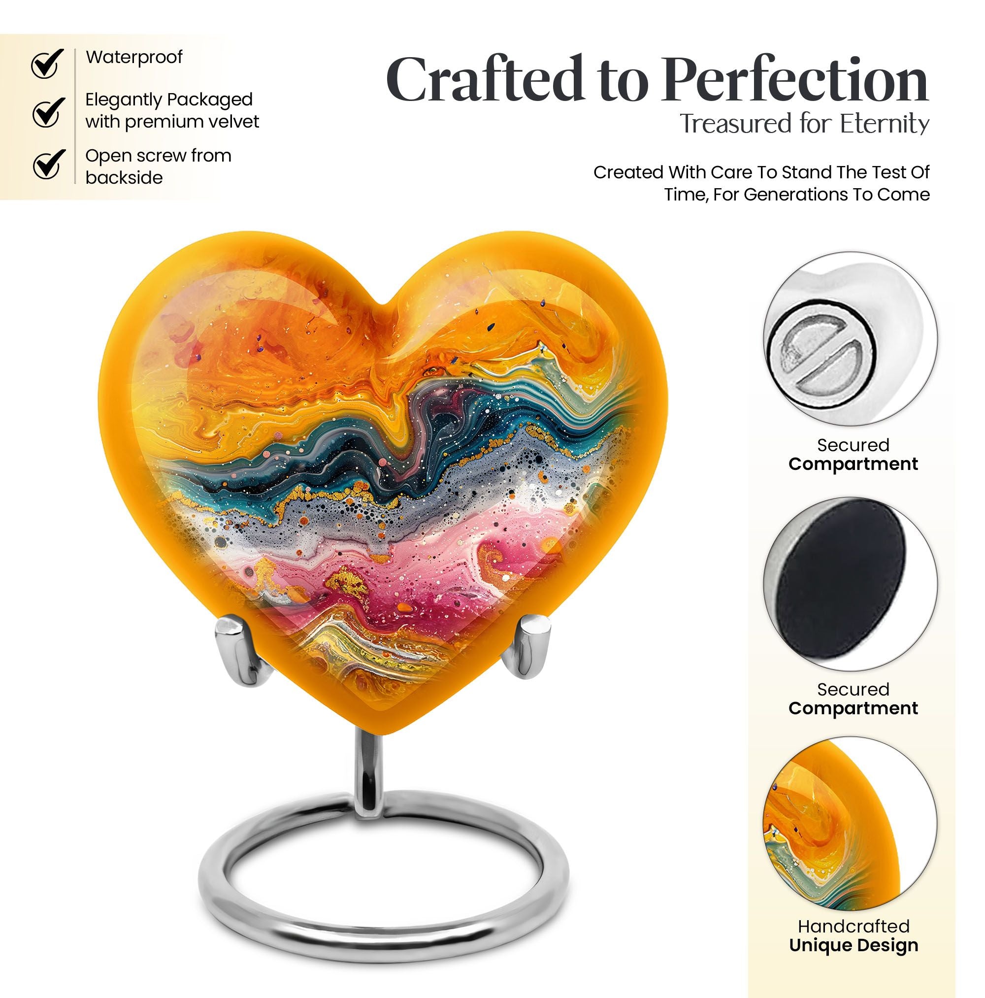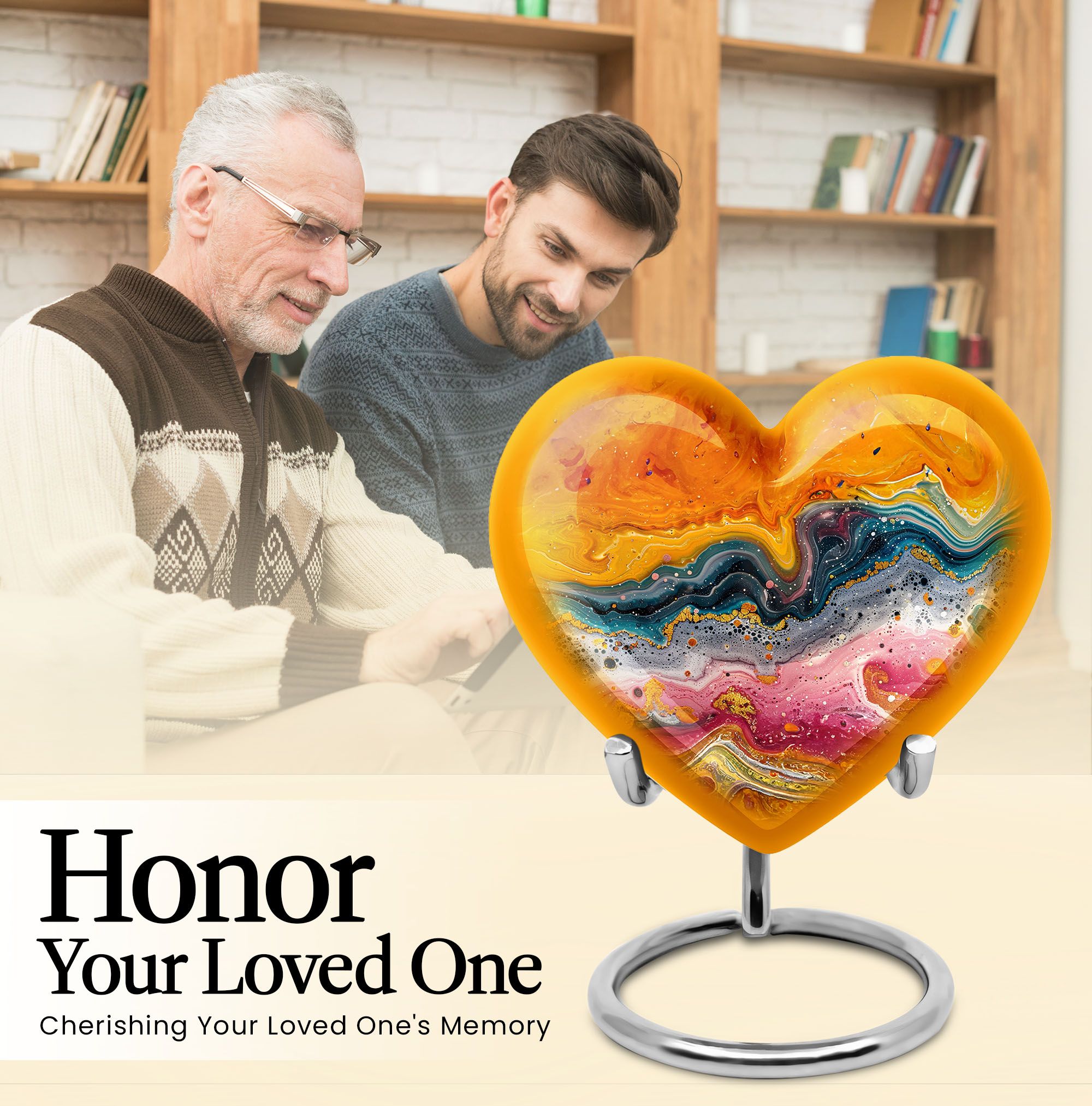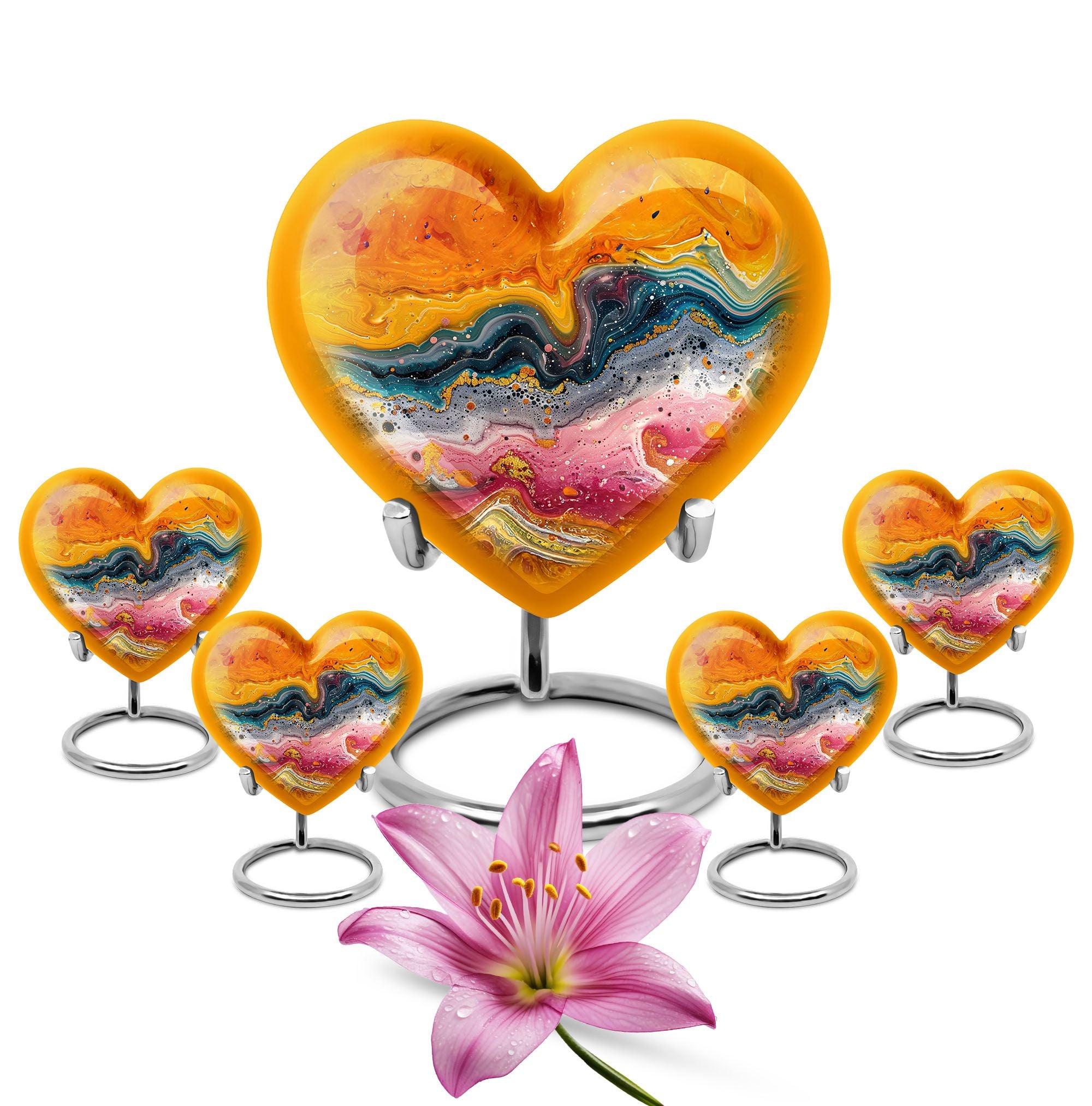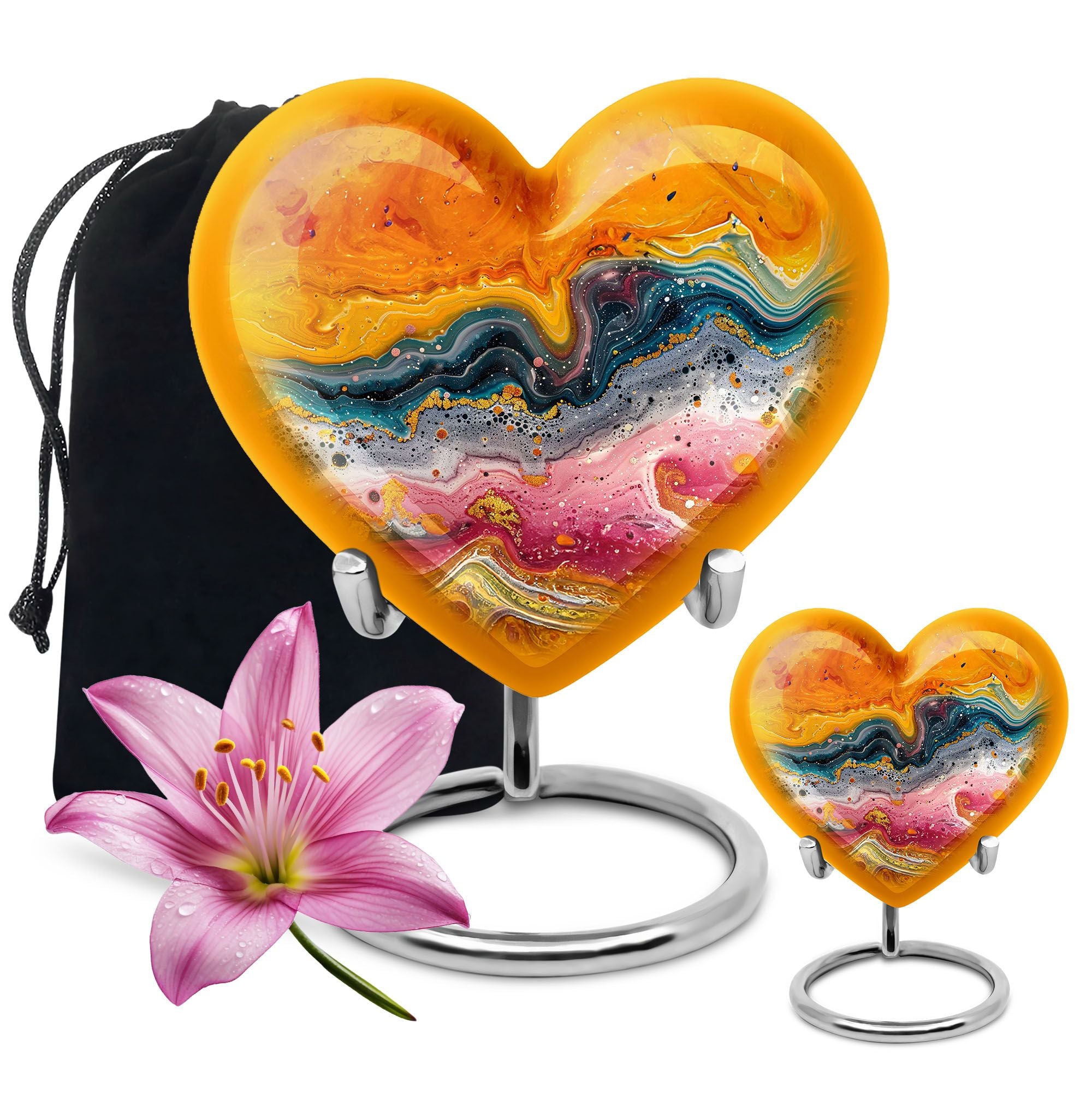 Honor your beloved one with our unique, Abstract Urn. This 10-inch cremation urn is a touching tribute, artfully crafted in a heart design from durable aluminium. Perfectly suitable for large urn needs, it has an impressive weight of 3.3 pounds and dimensions of 10 inches in height. Its substantial capacity of 200 cubic inches offers ample space to securely house the ashes of your dear departed. Every urn is paired with a velvet pouch, which provides an elegant containment for the remains. You may also choose to personalize this funeral urn, engraving names that will forever remind you of the precious moments you've shared. This heartfelt product demonstrates our dedication to providing meaningful memorial ceremony supplies. Ideal as funeral urns for mom or urns for any female, this item reflects the deep-seated love and respect that never dies. Uncommonly breathtaking, our personalized, unique urn for ashes brilliantly blends sentiment with style.