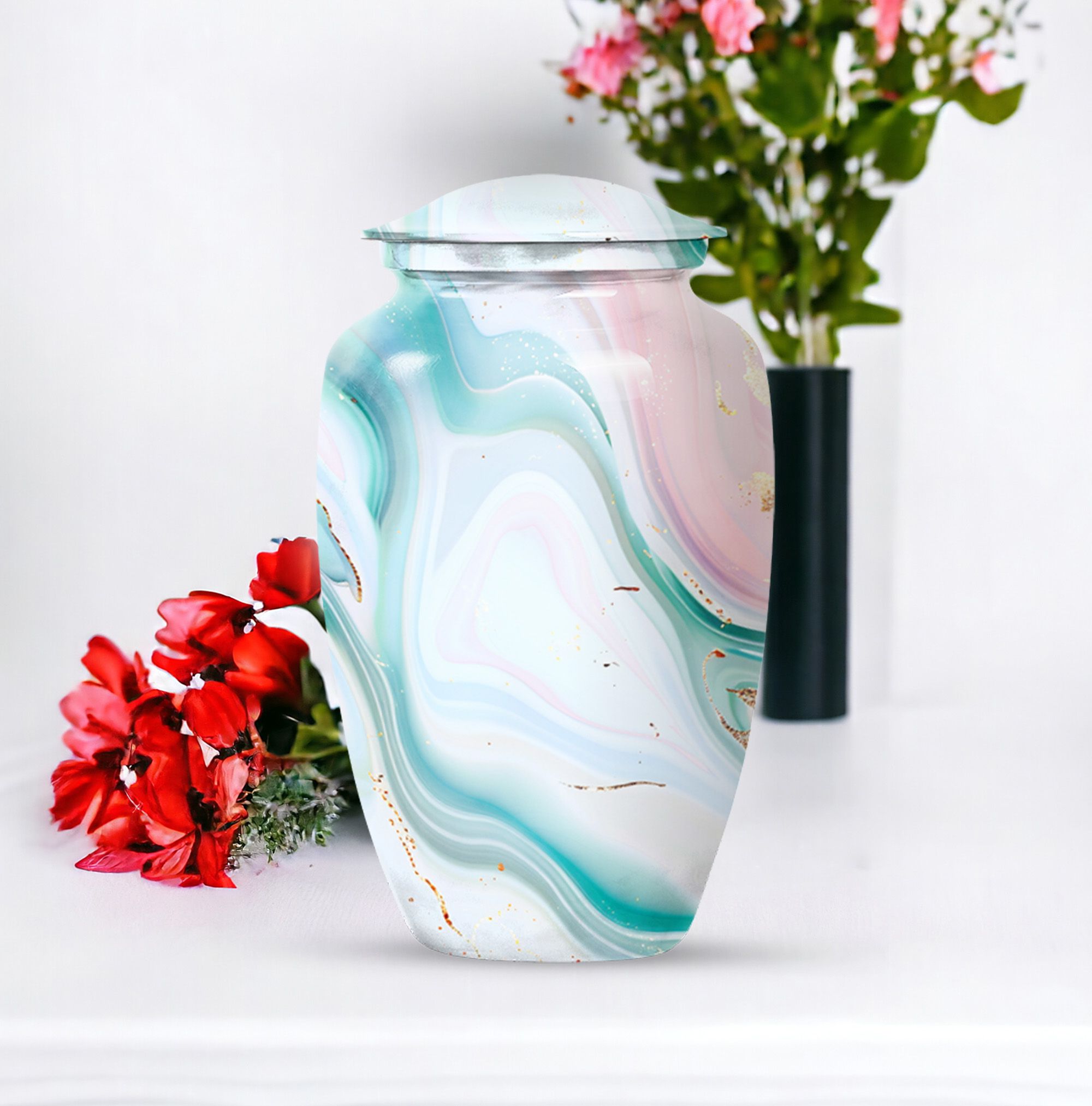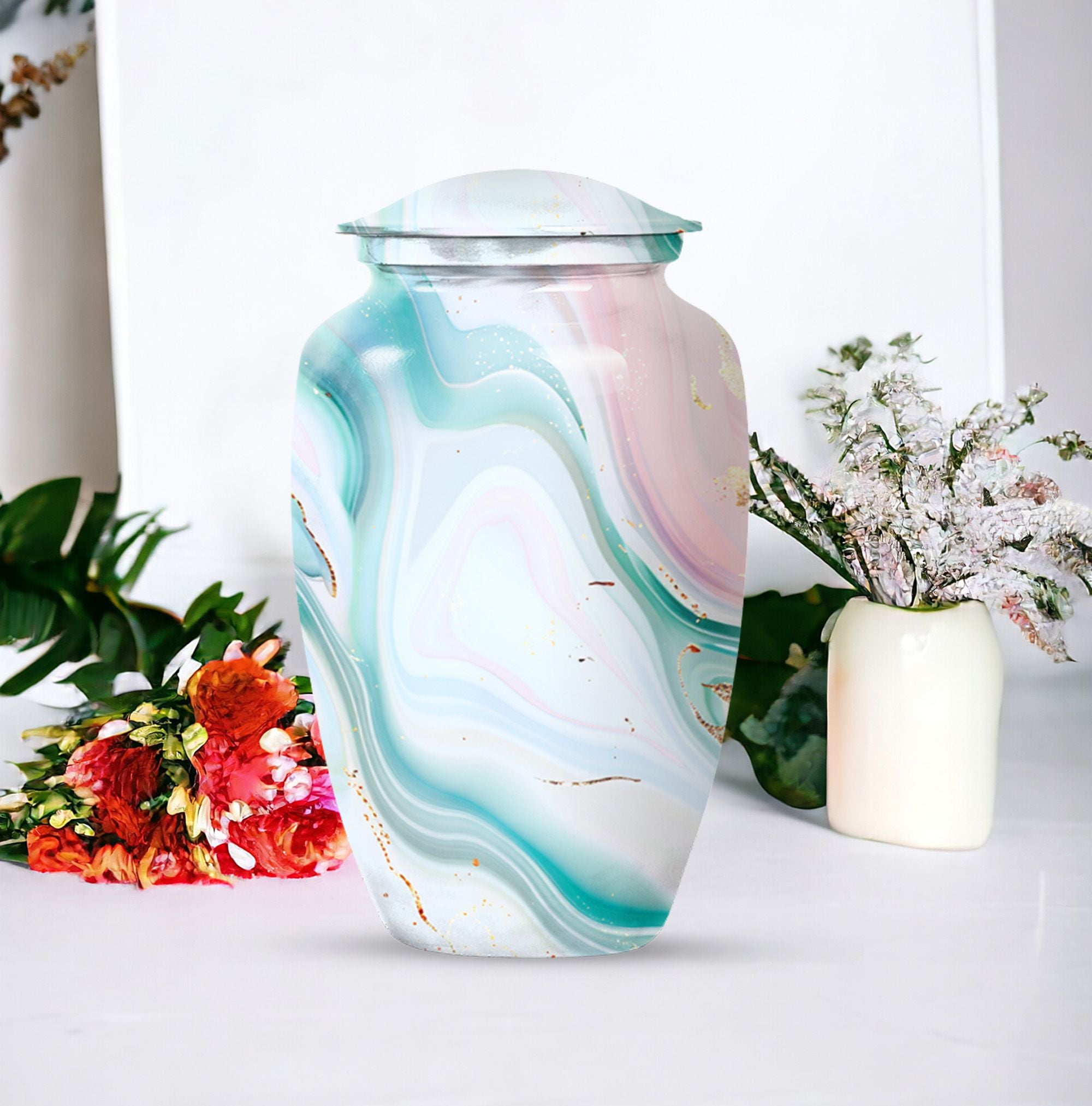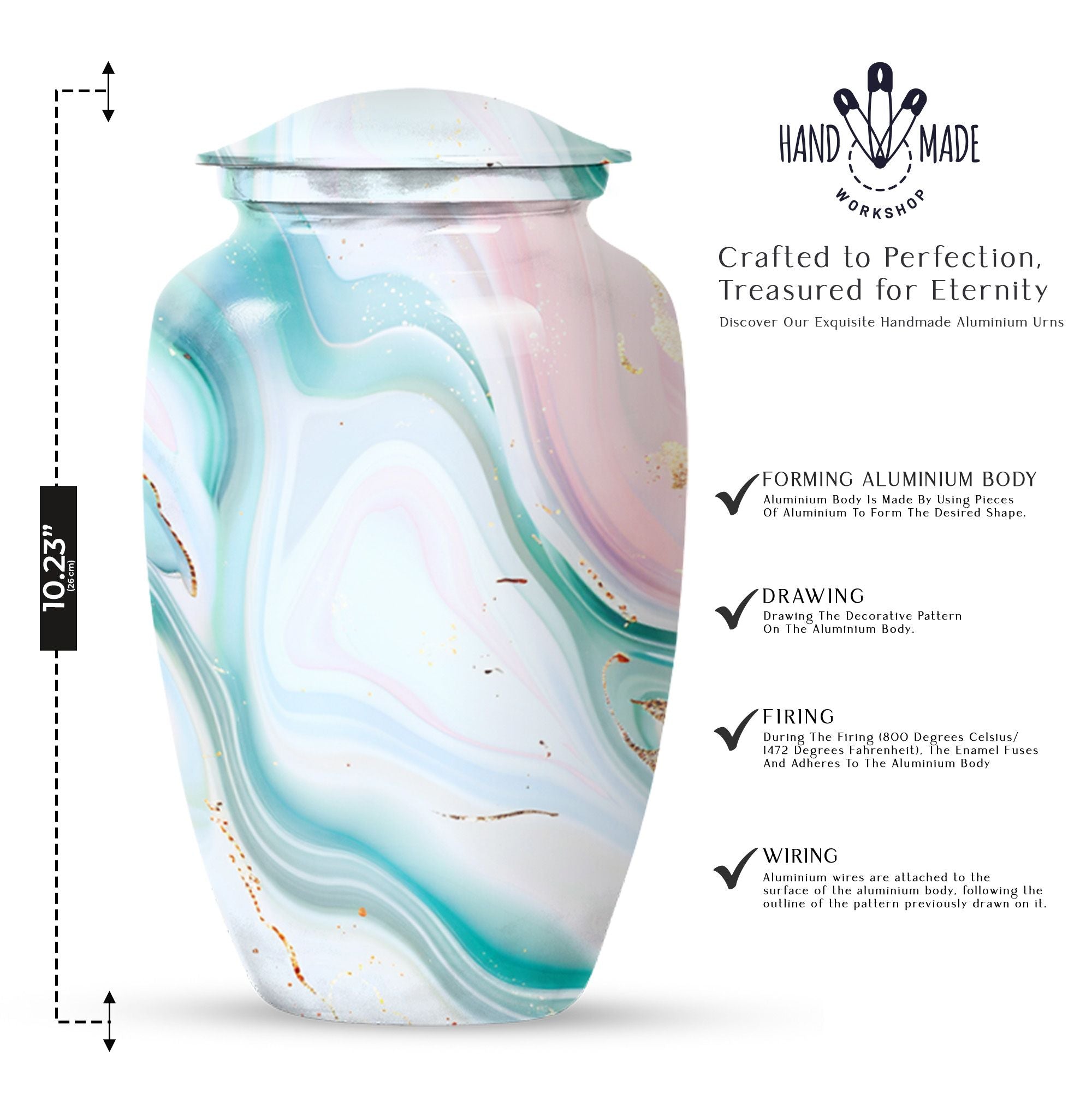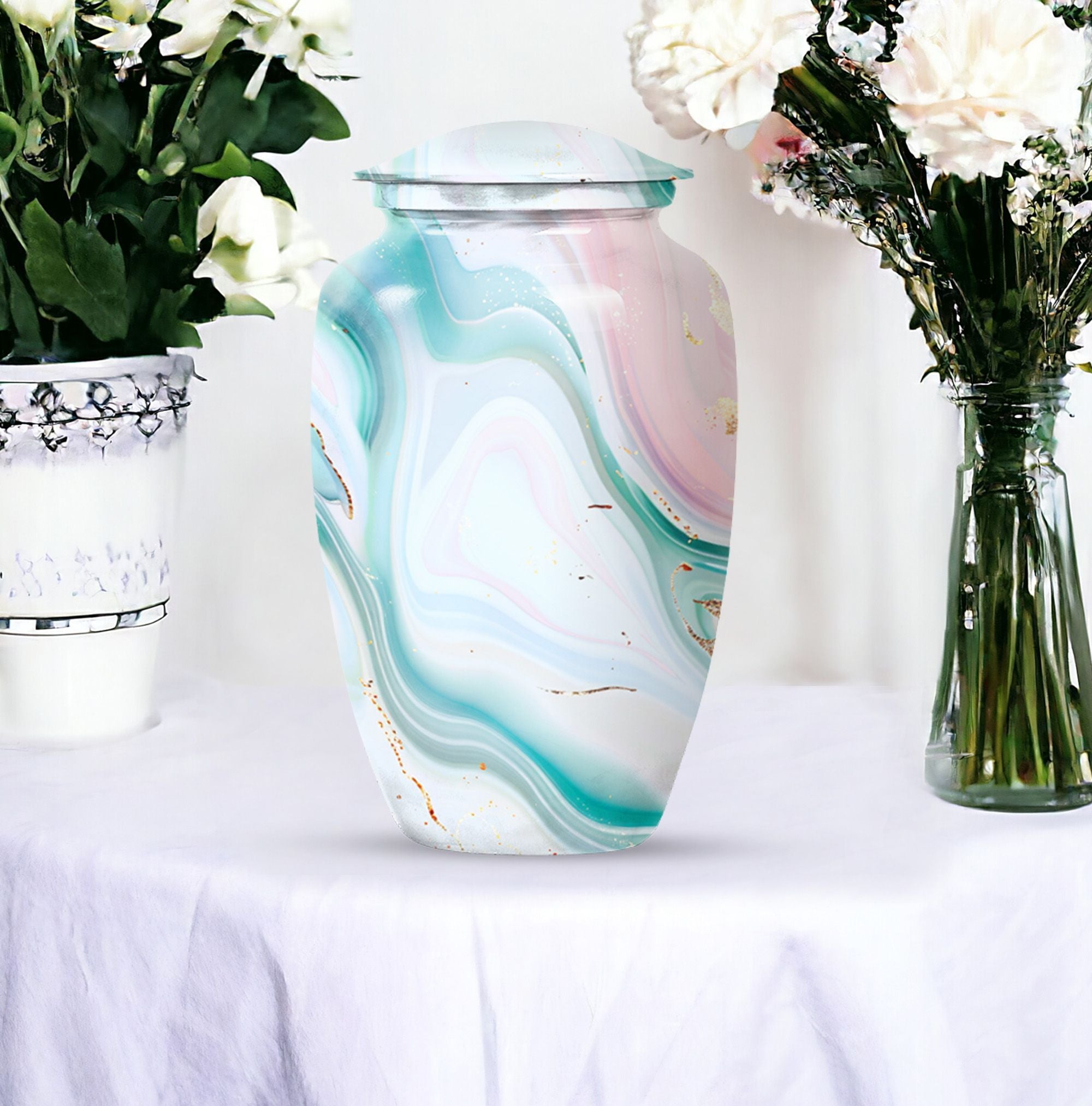 Immerse in a profound and respectful remembrance of your dear ones with our Abstract Urn, crafted intentionally for ceremonial use. Tailored for women, this cremation urn fits subtly with its 10-inch stature. It weighs only 3.3 pounds, a testament to its carefully crafted aluminum facade that bears an undercurrent of classic and abstract aesthetic. This full-sized urn can securely hold up to 200 cubic inches of ashes, adequate for an adult. Adding an intimate touch is a velvet pouch accompanying the urn, solemnly containing the ashes while offering a comforting touch. Enhance it further by personalizing it with engraved names, fostering a unique and sentimental value. The keywords ‘funeral cremation urns for women’, ‘memorial large urns for ashes’, ‘ash urn’, ‘urn shaped', and ‘funeral urns for adult ashes are strategically used for SEO optimization, anticipating the likely search queries of our esteemed clientele. Our product strives to offer a weighty expression to your precious memories.