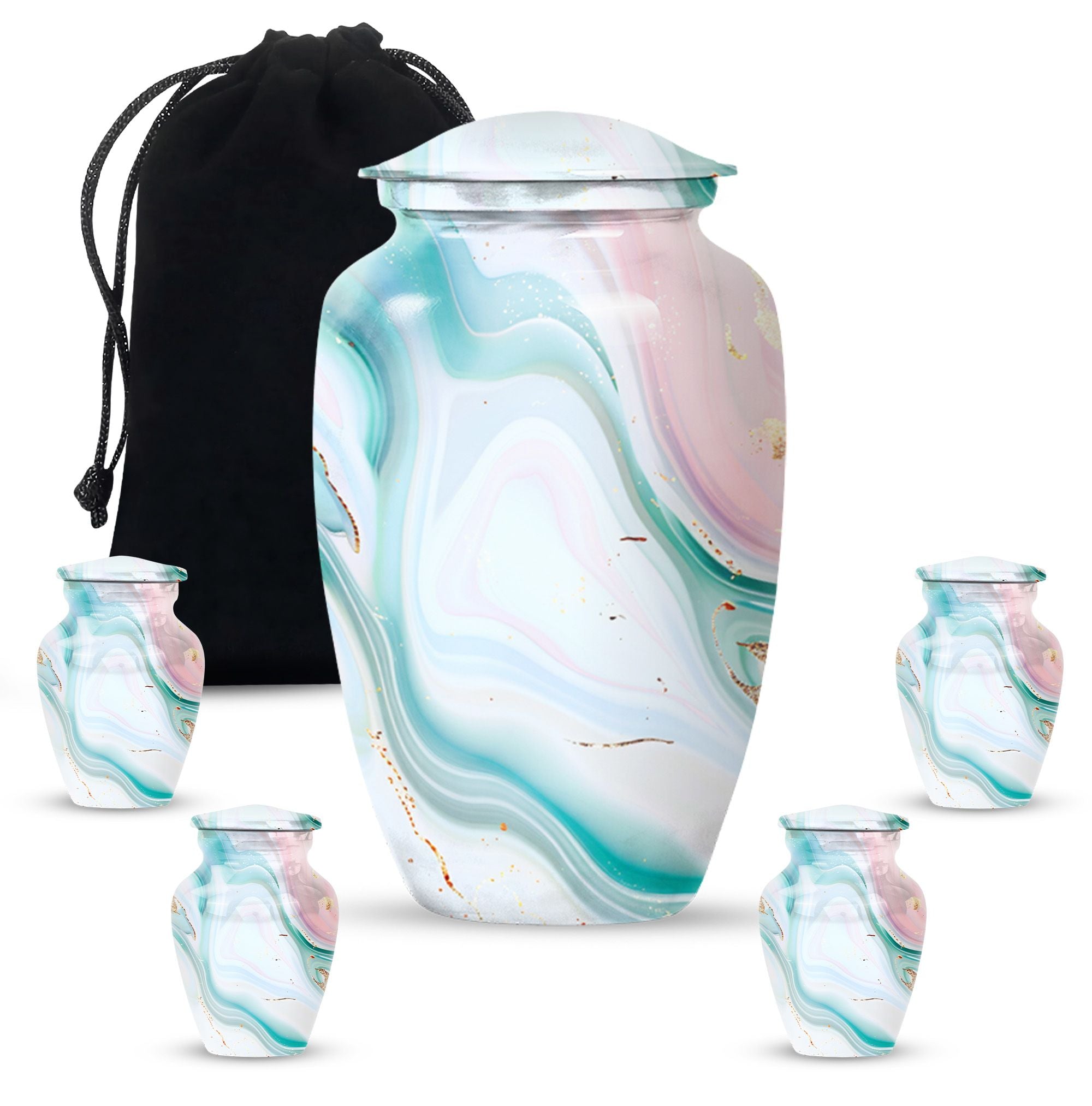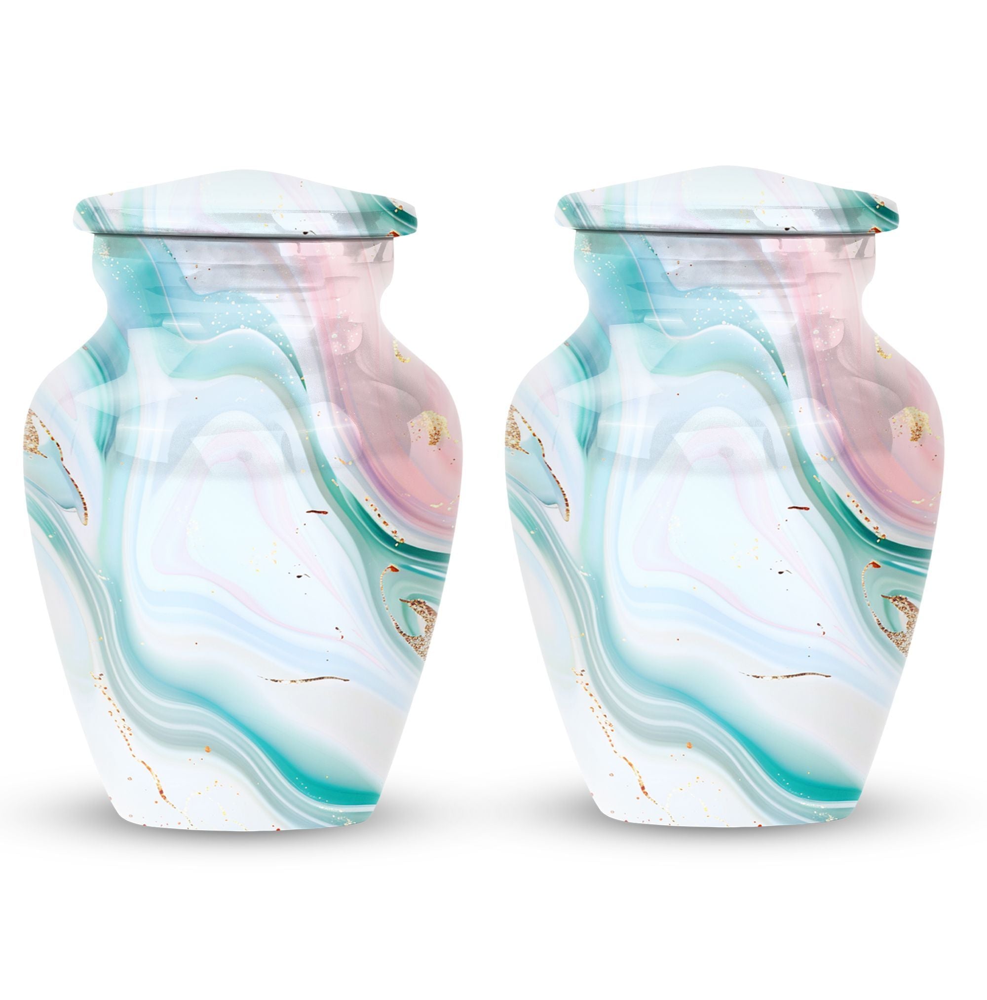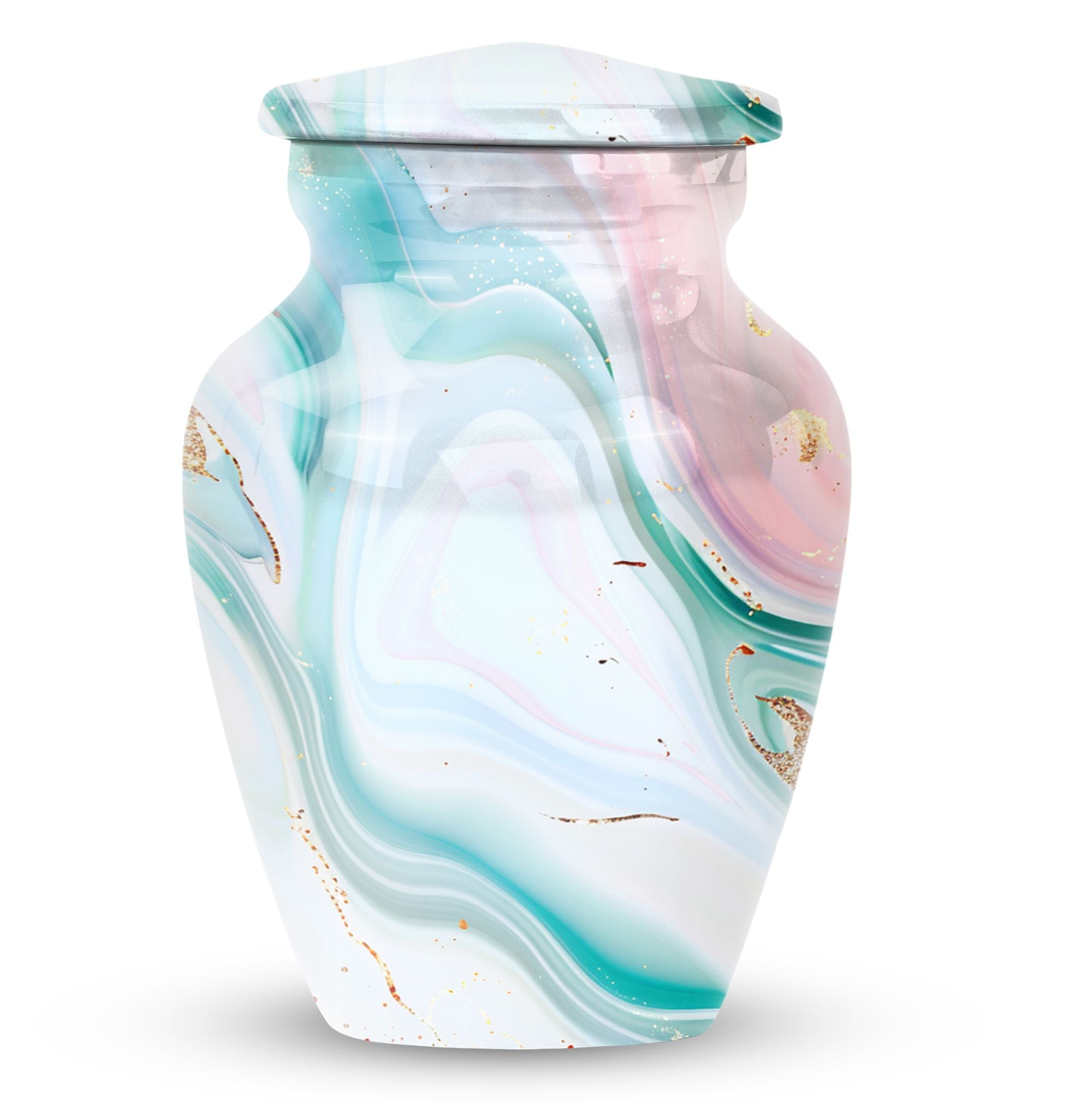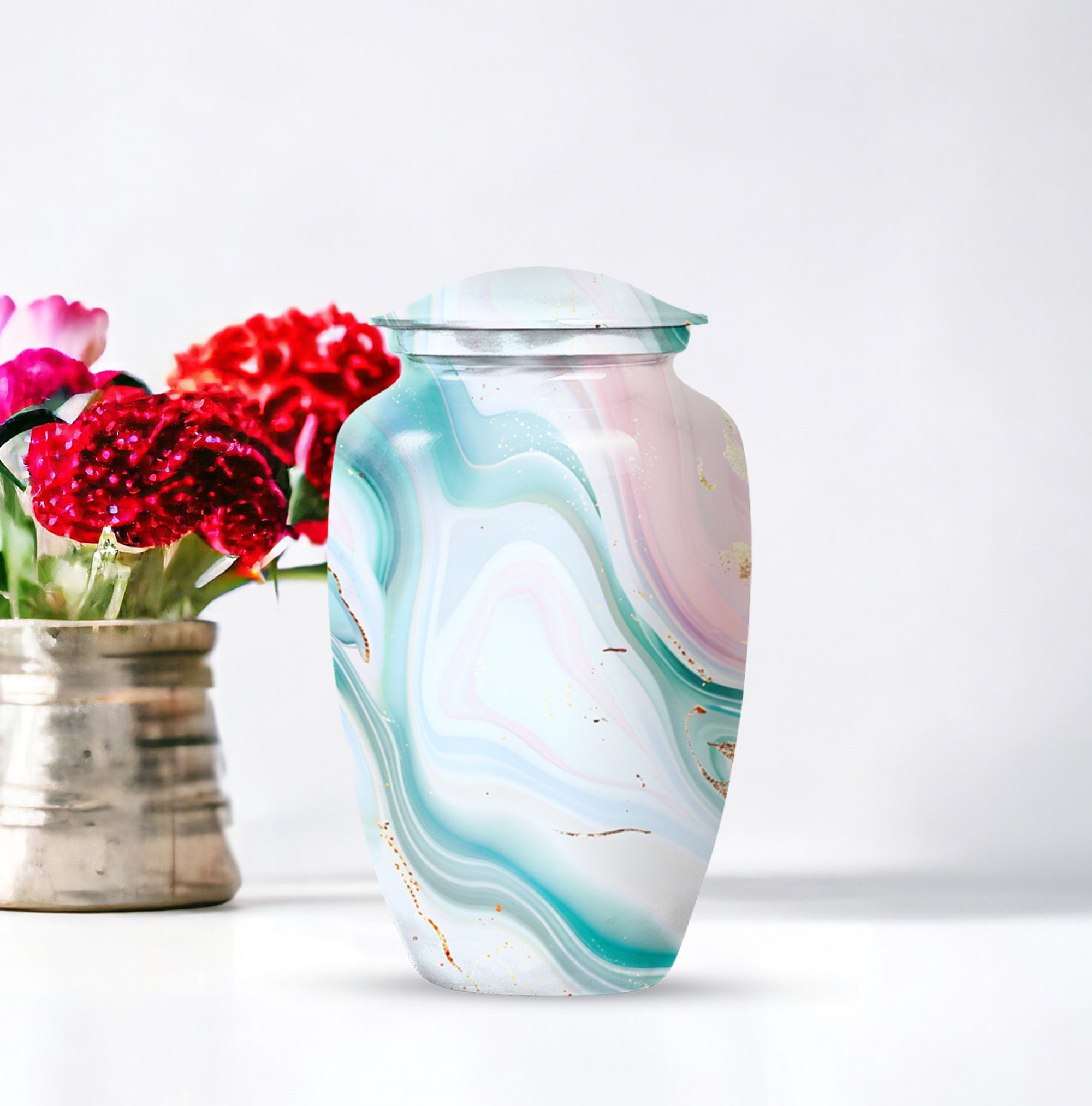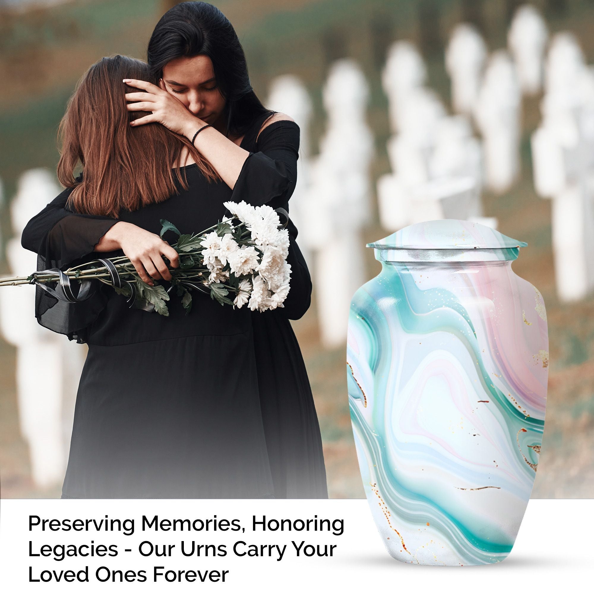 Immerse in a profound and respectful remembrance of your dear ones with our Abstract Urn, crafted intentionally for ceremonial use. Tailored for women, this cremation urn fits subtly with its 10-inch stature. It weighs only 3.3 pounds, a testament to its carefully crafted aluminum facade that bears an undercurrent of classic and abstract aesthetic. This full-sized urn can securely hold up to 200 cubic inches of ashes, adequate for an adult. Adding an intimate touch is a velvet pouch accompanying the urn, solemnly containing the ashes while offering a comforting touch. Enhance it further by personalizing it with engraved names, fostering a unique and sentimental value. The keywords ‘funeral cremation urns for women’, ‘memorial large urns for ashes’, ‘ash urn’, ‘urn shaped', and ‘funeral urns for adult ashes are strategically used for SEO optimization, anticipating the likely search queries of our esteemed clientele. Our product strives to offer a weighty expression to your precious memories.