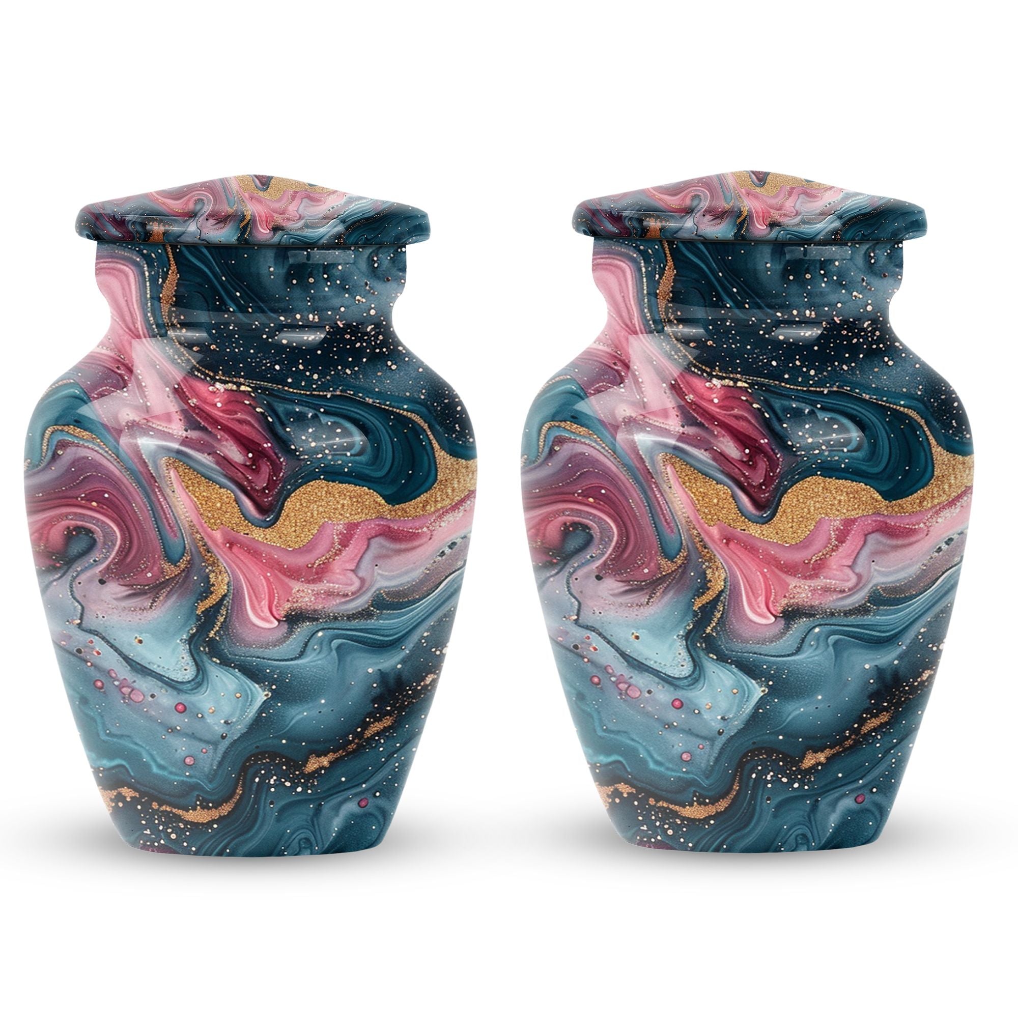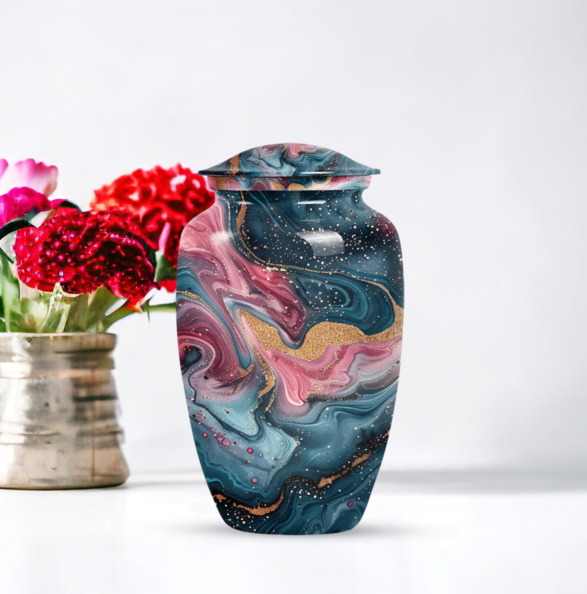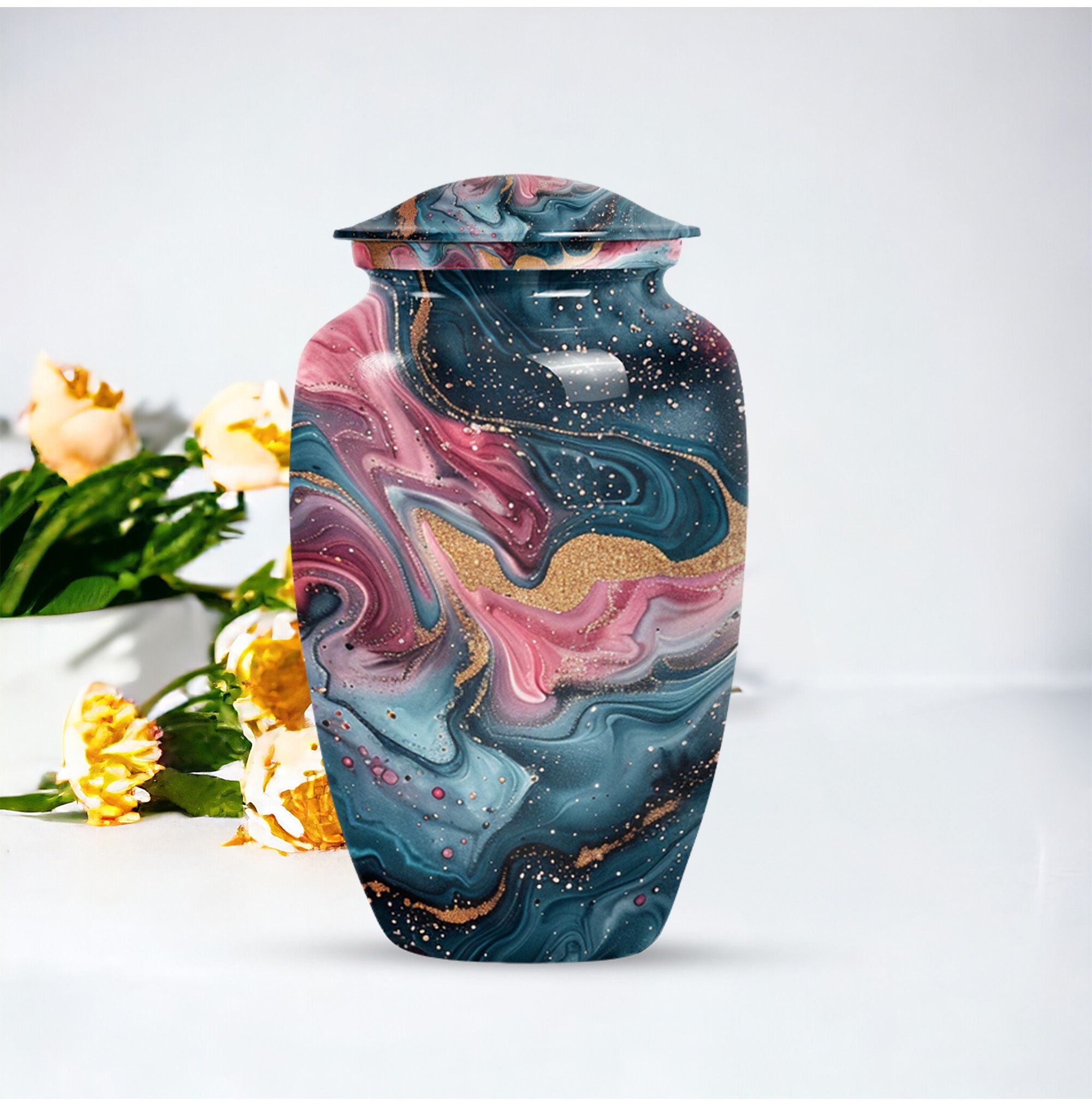 Elevate your memorial tribute with our large, Abstract Urn—a heartfelt way to honor your lost loved one. Crafted from high-quality aluminium, this memorial urn for ashes weighs a solid 3.3 pounds and stands at an impressive 10 inches in height. Its size and capacity of 200 cubic inches make it suitable for containing a substantial amount of ashes securely. Our Classic Urn design offers a timeless dedication to commemorations of your dear departed ones. What sets it apart is the personal touch—we offer customization options where you can personalize the Urn with engraved names. Each Abstract Urn comes with a velvet pouch designed to safely contain the ashes. The unique amalgamation of these features makes this urn an exceptional selection in comparison to other funeral metal urns or for urns for burial. This urn's abstract theme adds an element of art, making it not just a container for ashes but a beautifully crafted tribute.