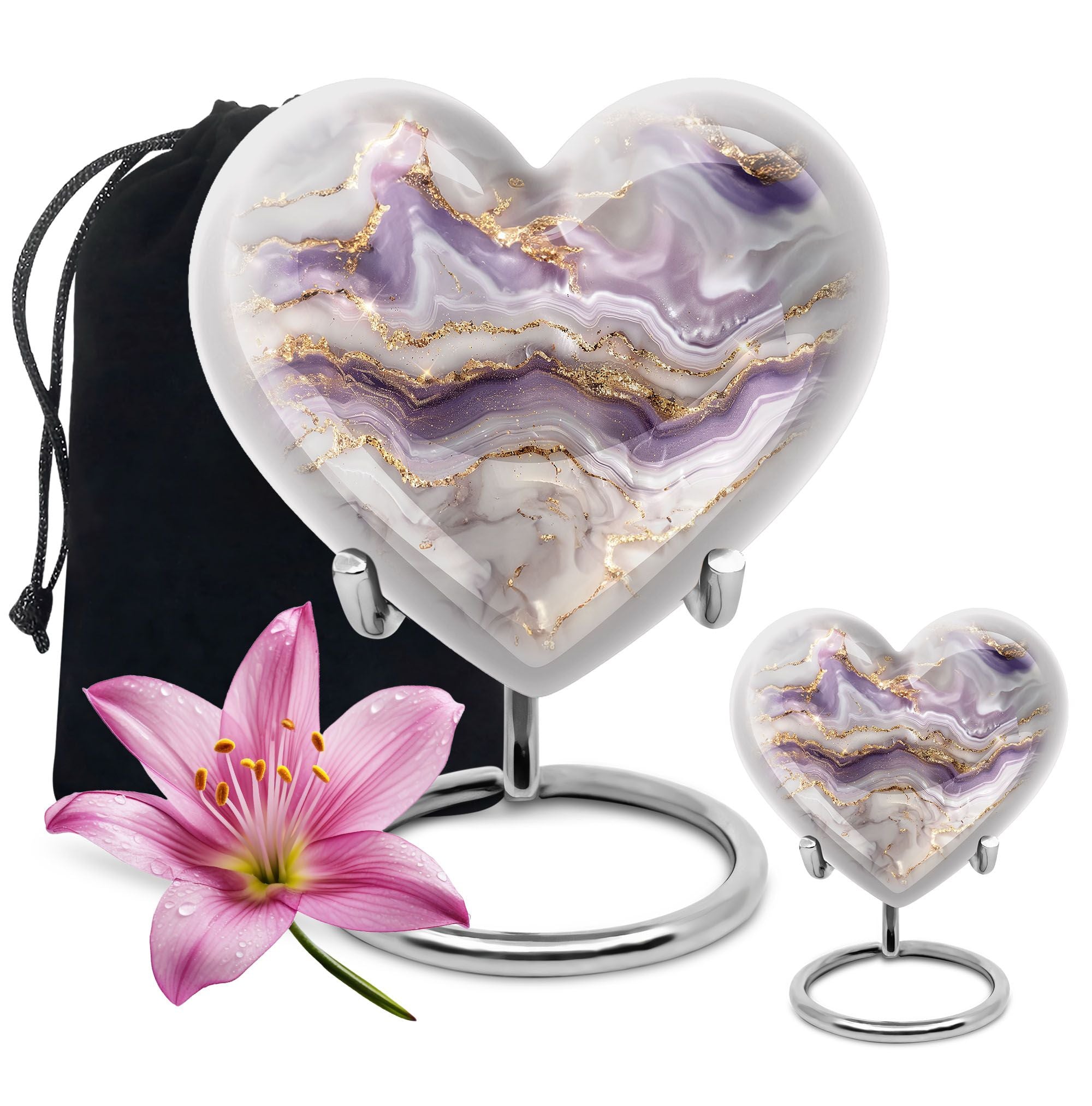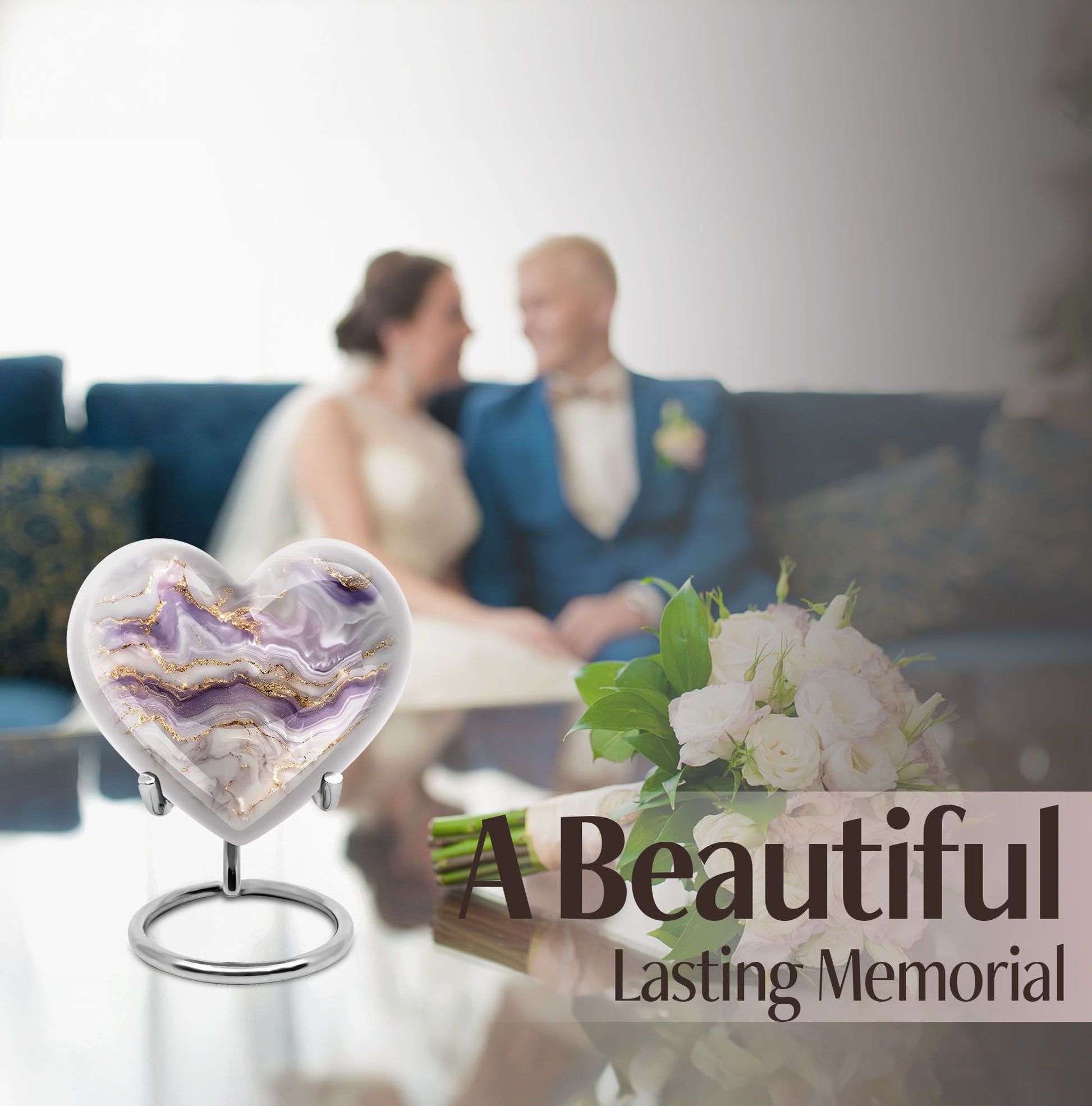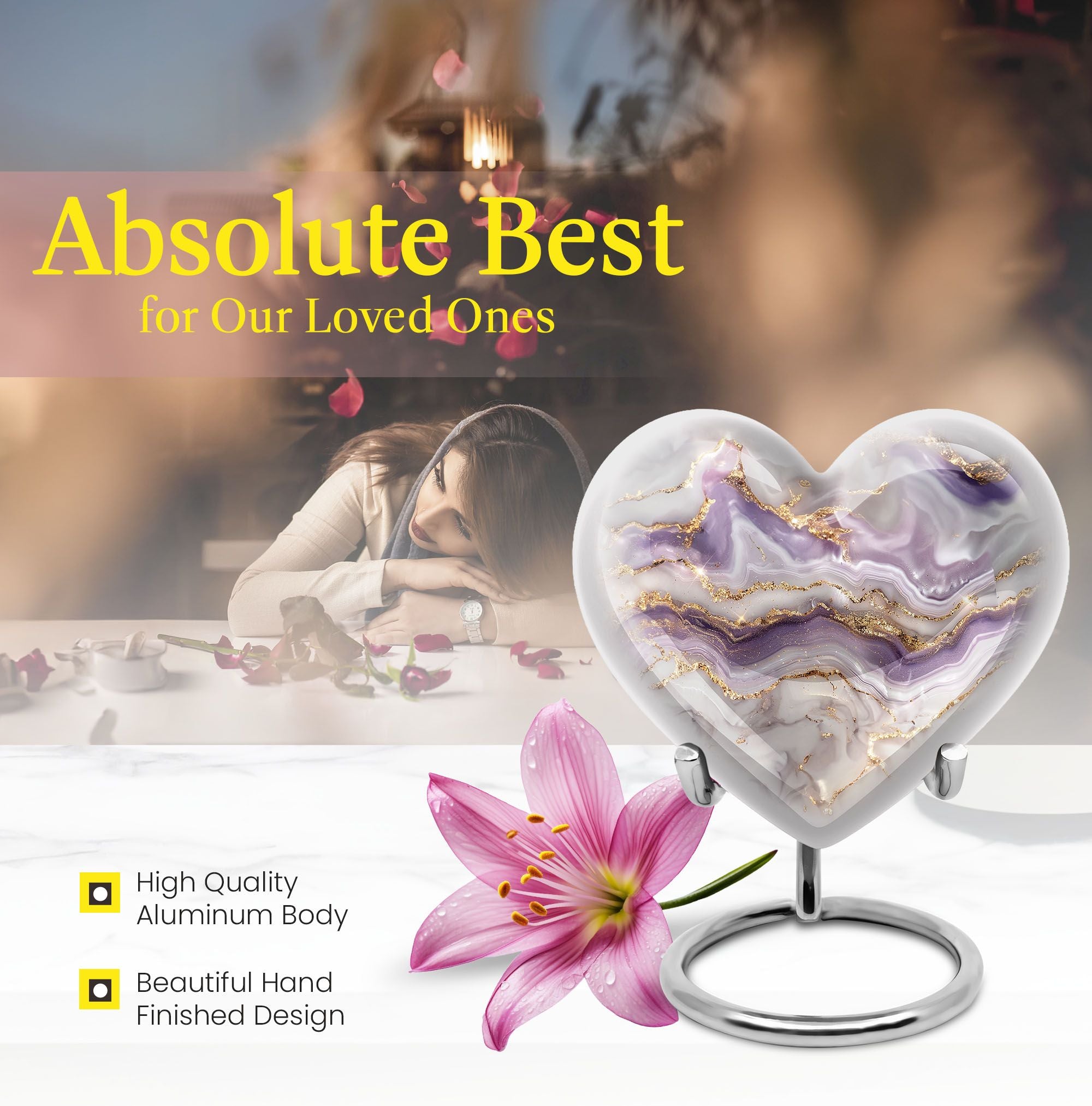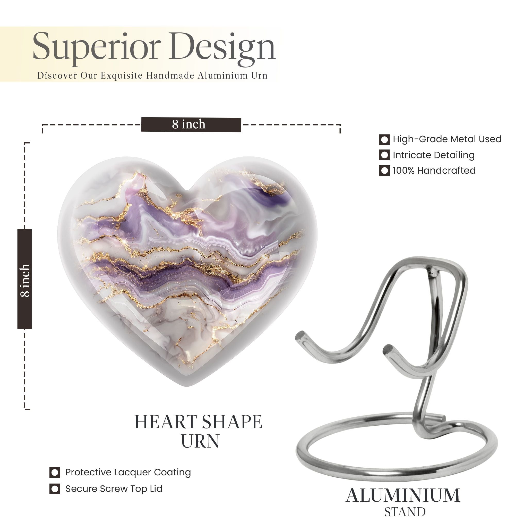 Introducing our unique, Abstract Urn, a graceful tribute to a remarkable life lived. This engaging, heart-shaped funeral urn is expertly crafted with your heartfelt memories in mind. It is 10 inches in height; this large urn proffers an outstanding capacity of 200 cubic inches, ideal for holding the remains of an adult female or male. It's meticulously structured with resilient aluminum for lasting durability, and carefully cocooned in a plush velvet pouch for dignified containment of ashes. It's easy to see why this beautifully sleek and weighted Urn at 3.3 pounds has become a favorite amongst memorial urns. Thoughtfully designed to offer you the possibility of personalizing your token of remembrance with engraved names. It uniquely brings an abstract theme to life, making it more than just a cremation urn for men & women. Its distinguishing character shines through in the elegant adult cremation urns arena. The sophisticated heart urn design doubles as an appealing, free-standing piece, beautifully contoured to serve as a poignant reminder of your treasured times with your loved one.