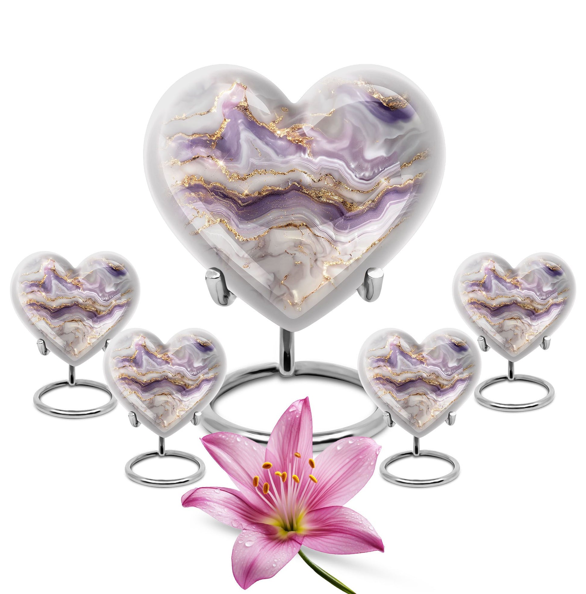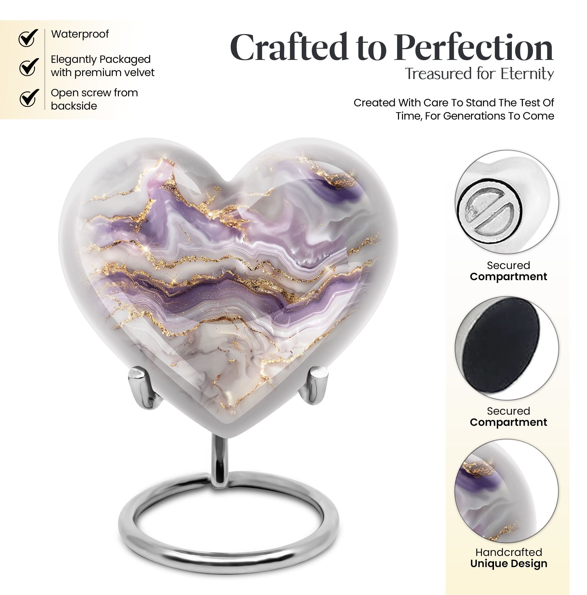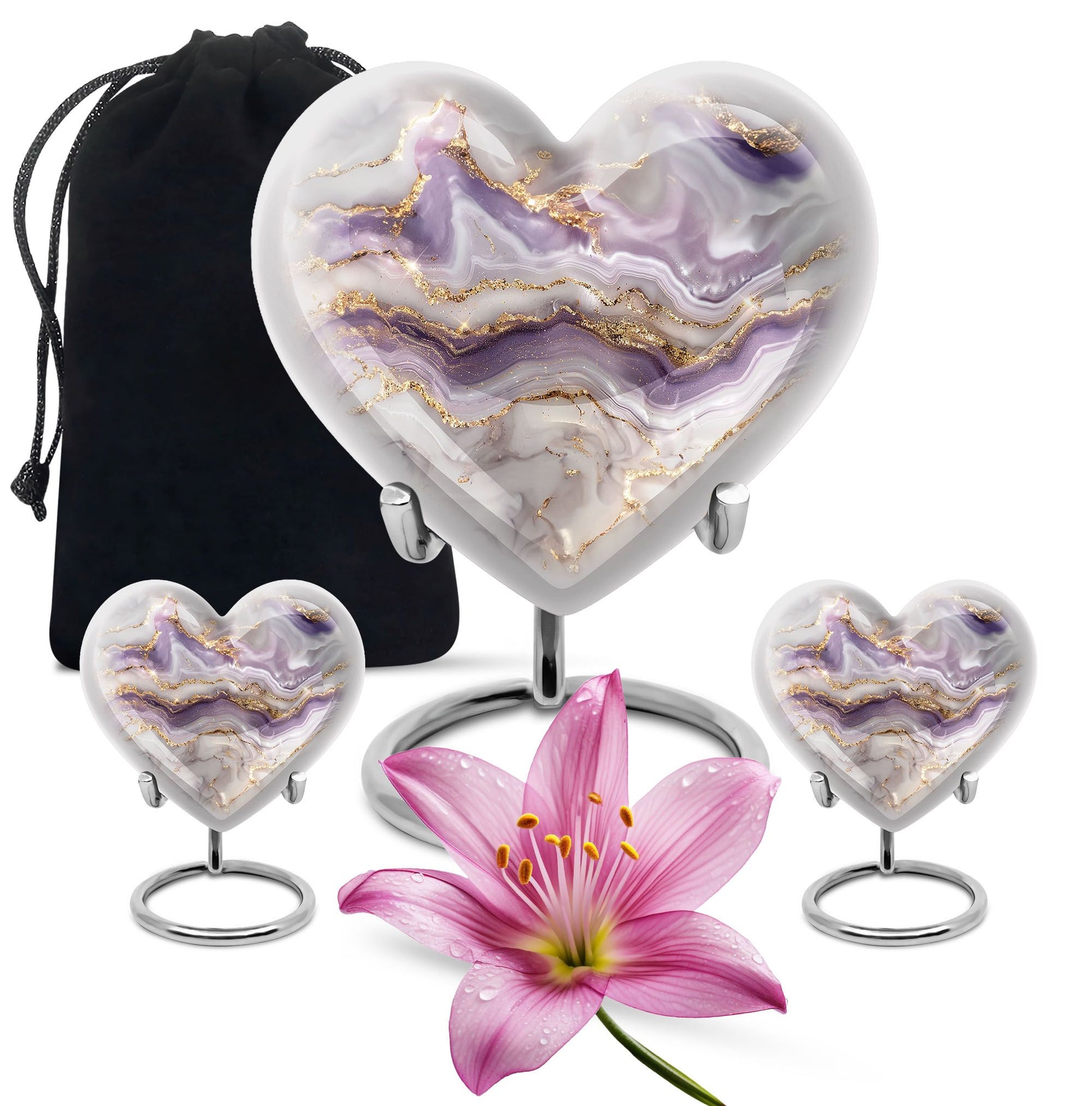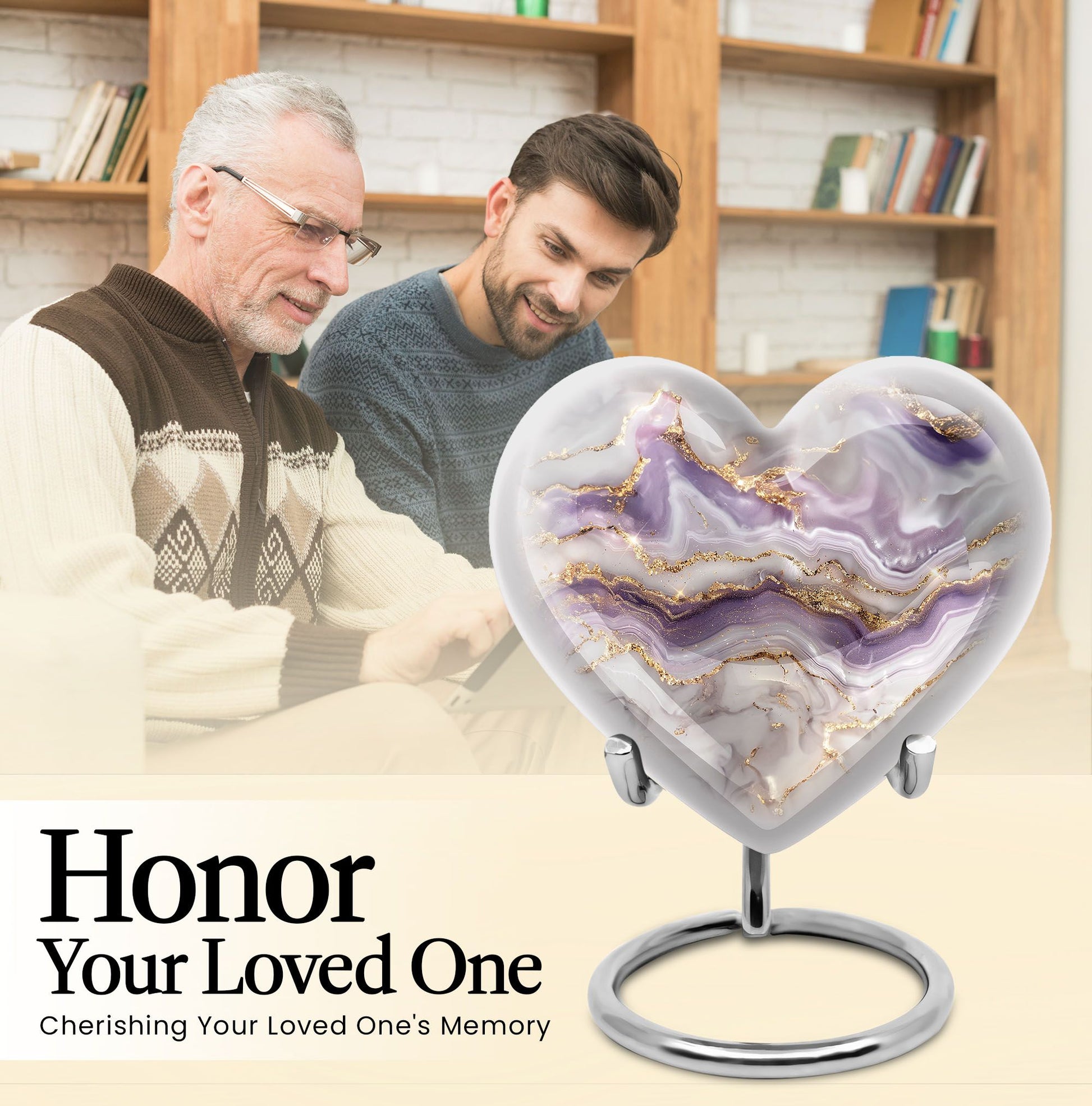 Introducing our unique, Abstract Urn, a graceful tribute to a remarkable life lived. This engaging, heart-shaped funeral urn is expertly crafted with your heartfelt memories in mind. It is 10 inches in height; this large urn proffers an outstanding capacity of 200 cubic inches, ideal for holding the remains of an adult female or male. It's meticulously structured with resilient aluminum for lasting durability, and carefully cocooned in a plush velvet pouch for dignified containment of ashes. It's easy to see why this beautifully sleek and weighted Urn at 3.3 pounds has become a favorite amongst memorial urns. Thoughtfully designed to offer you the possibility of personalizing your token of remembrance with engraved names. It uniquely brings an abstract theme to life, making it more than just a cremation urn for men & women. Its distinguishing character shines through in the elegant adult cremation urns arena. The sophisticated heart urn design doubles as an appealing, free-standing piece, beautifully contoured to serve as a poignant reminder of your treasured times with your loved one.