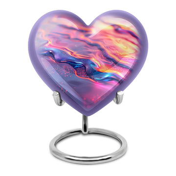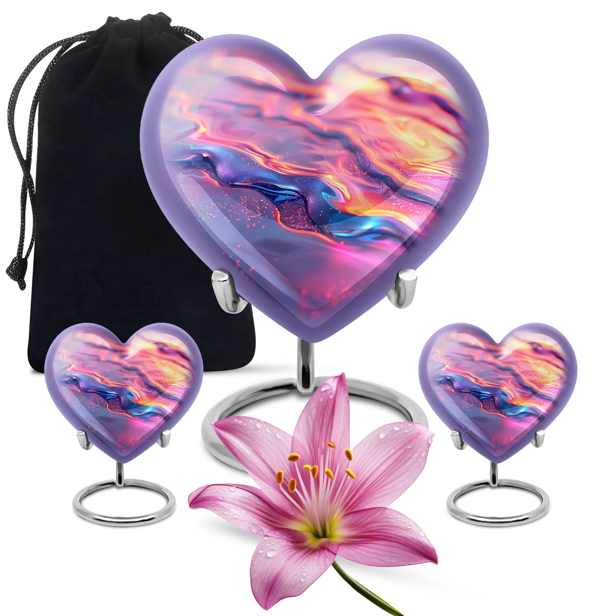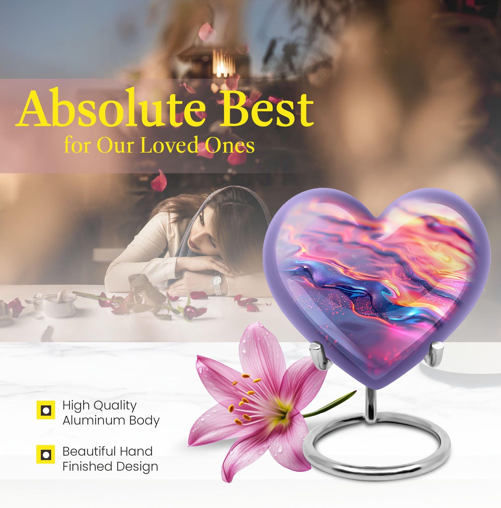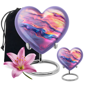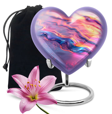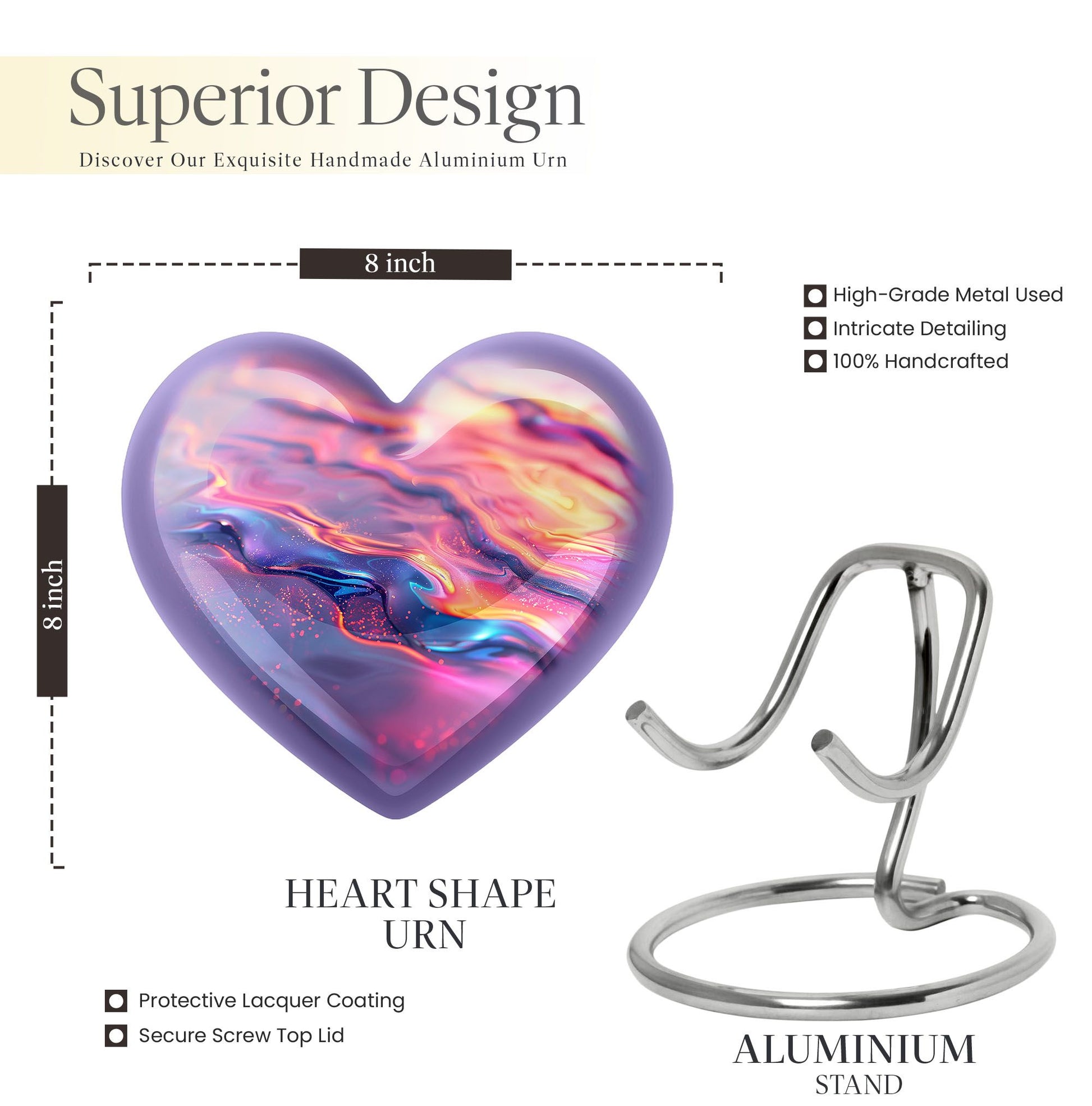Discover a tangible remembrance of your cherished loved one in this exquisite Abstract Urn. This distinctive burial cremation urn, meticulously realized from robust aluminium, boasts an engaging Heart Urn design. Sized at 10 inches, this large urn weighs 3.3 pounds and is capable of holding 200 cubic inches of ashes. It effortlessly combines aesthetics and functionality, a characteristic feature of cremation urns. The urn design is abstract, stark, and eclectic, bearing an artistic symbolism. Complementing the urn itself is an included velvet pouch for a respectful and secure containment of the ashes. Embrace the possibility of personalization, and customize the urn with engraved names, adding a personal touch to the memorial. This elegant urn is poised to serve as a touching tribute to your loved one. From adult female elegant urns in porcelain to metal urns for burial, the individuality of this product is unmistakably distinct in the realm of funeral urns for human ashes.