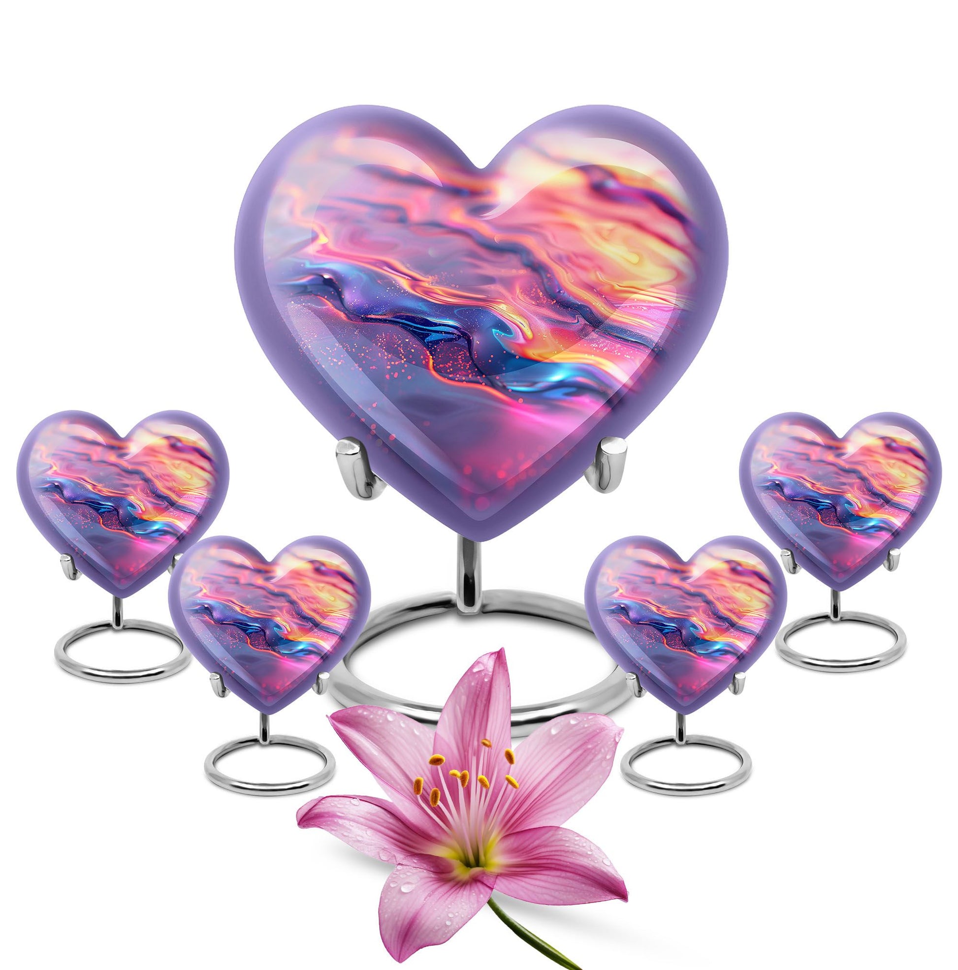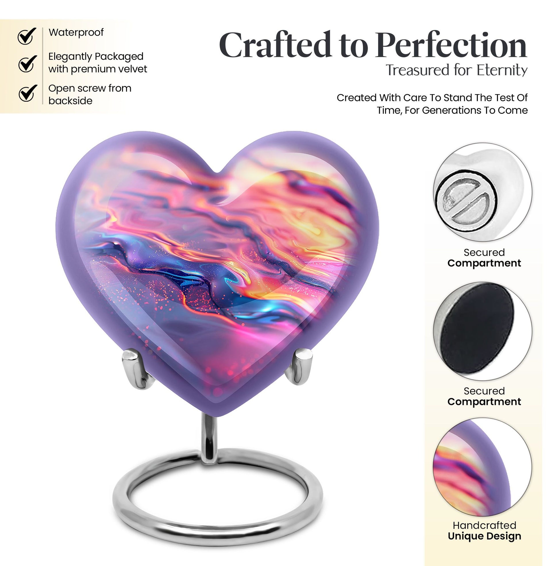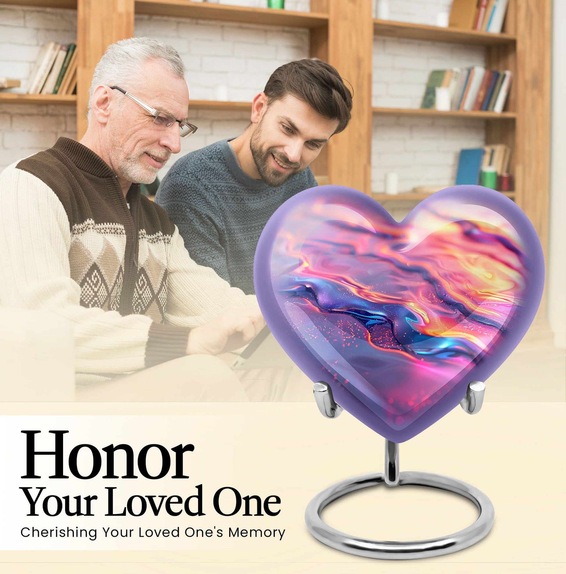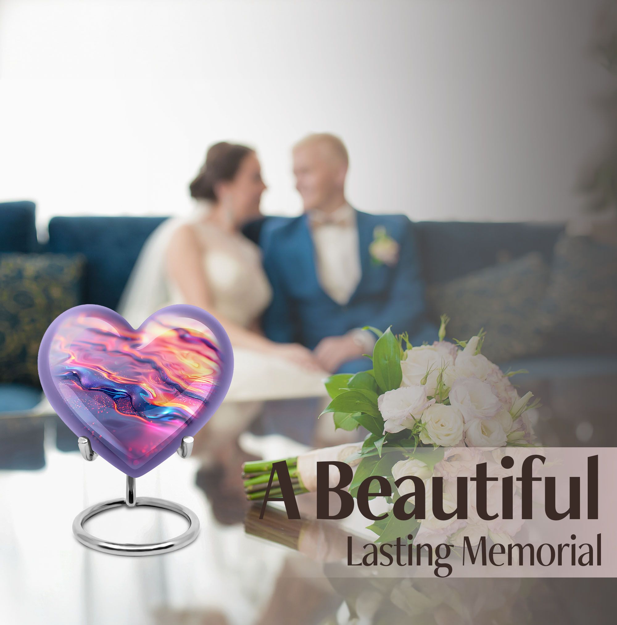 Discover a tangible remembrance of your cherished loved one in this exquisite Abstract Urn. This distinctive burial cremation urn, meticulously realized from robust aluminium, boasts an engaging Heart Urn design. Sized at 10 inches, this large urn weighs 3.3 pounds and is capable of holding 200 cubic inches of ashes. It effortlessly combines aesthetics and functionality, a characteristic feature of cremation urns. The urn design is abstract, stark, and eclectic, bearing an artistic symbolism. Complementing the urn itself is an included velvet pouch for a respectful and secure containment of the ashes. Embrace the possibility of personalization, and customize the urn with engraved names, adding a personal touch to the memorial. This elegant urn is poised to serve as a touching tribute to your loved one. From adult female elegant urns in porcelain to metal urns for burial, the individuality of this product is unmistakably distinct in the realm of funeral urns for human ashes.