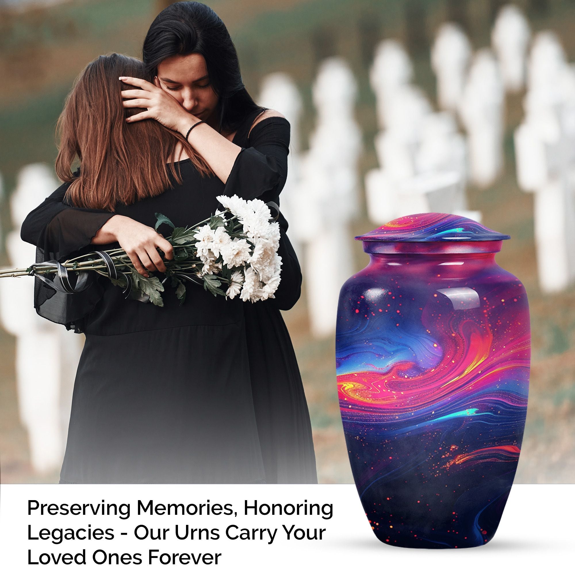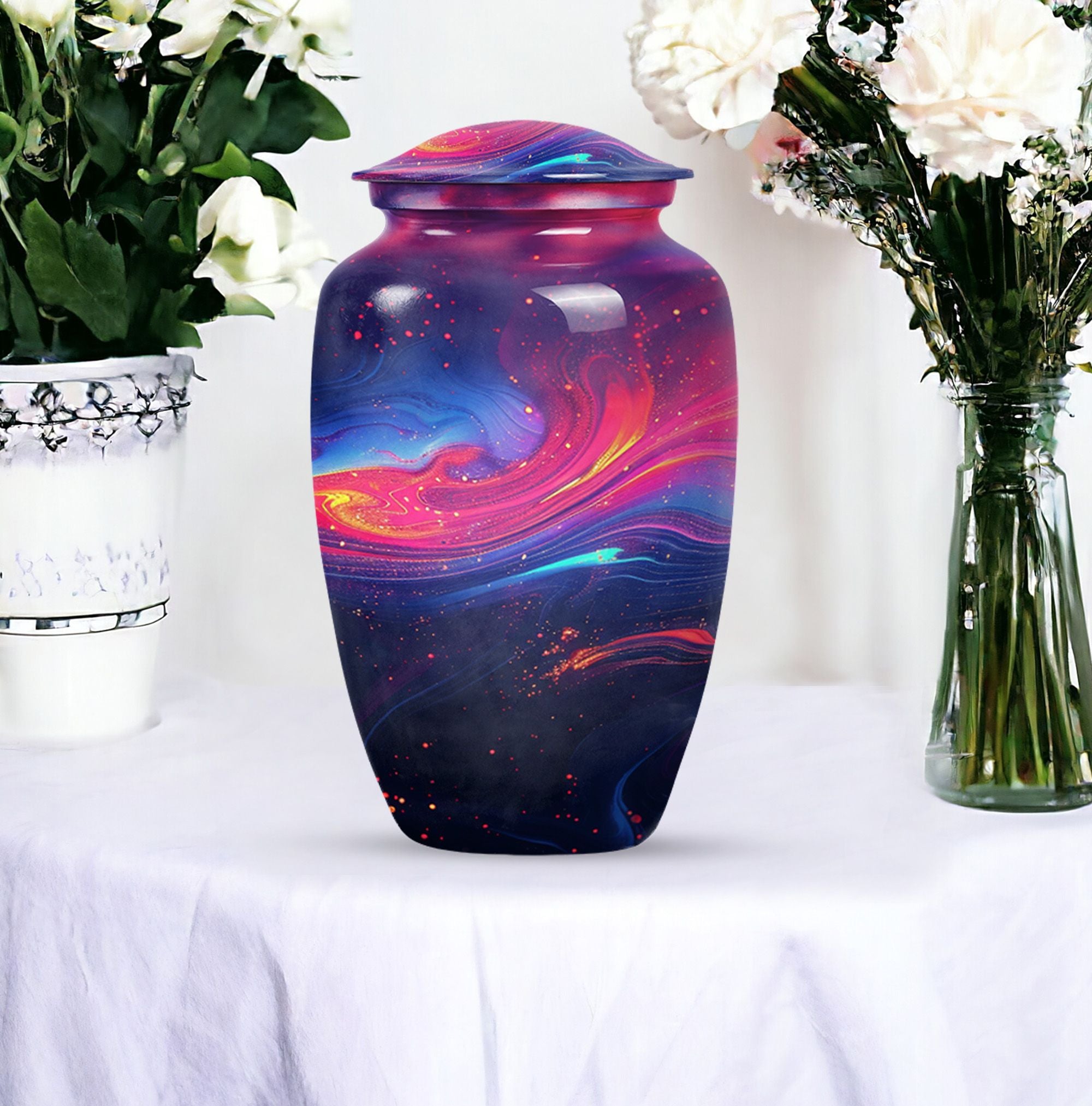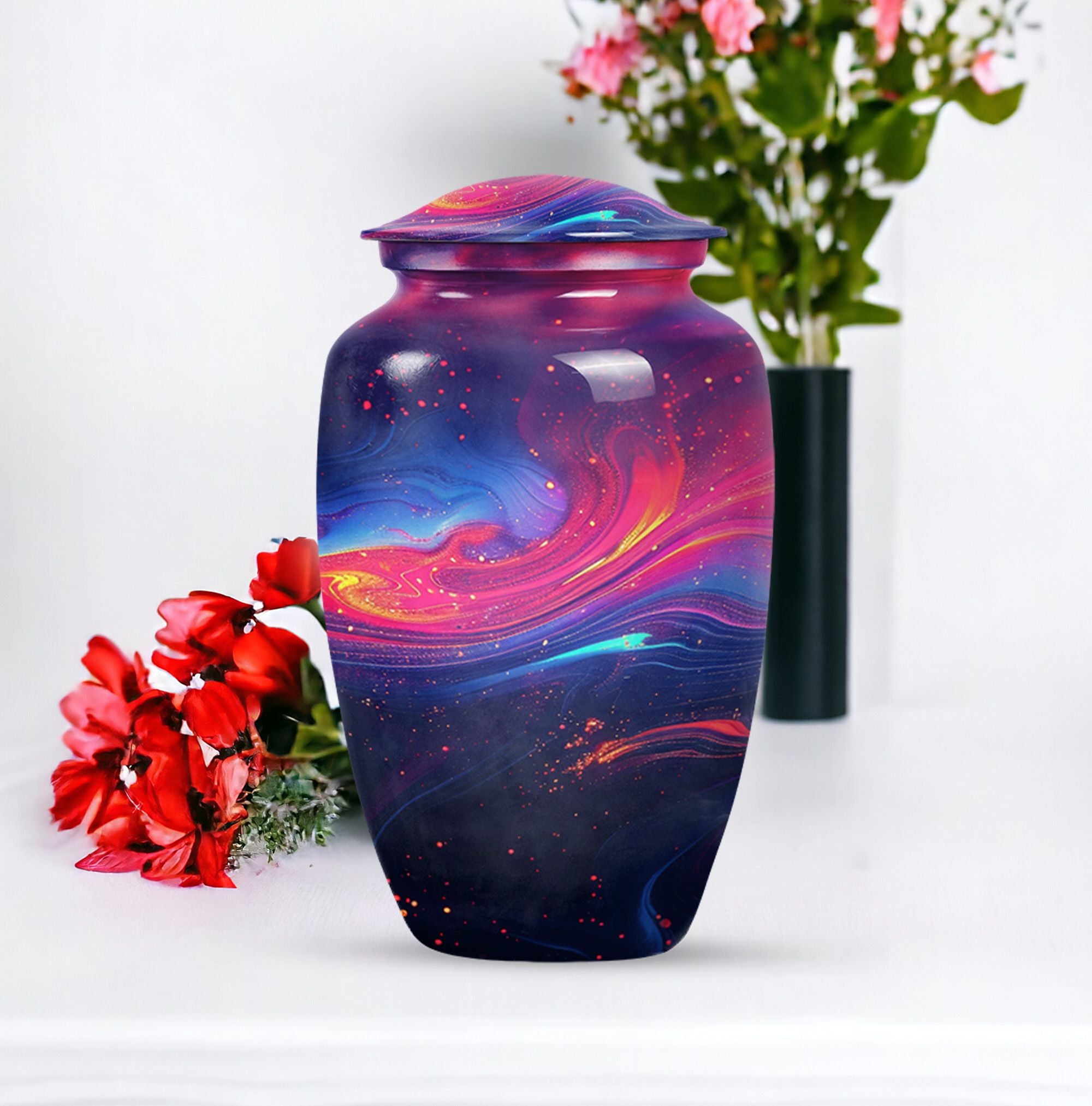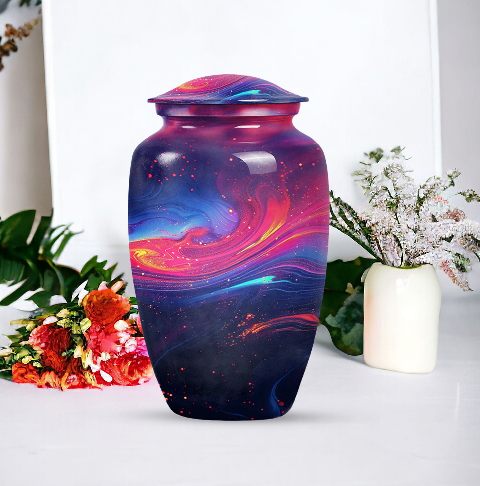 Crafted with utmost respect and dignity to honour loved ones, this Abstract Urn serves as a beautiful memorial medium. Specifically designed for ceremonial use, this large aluminium urn carries up to 200 cubic inches of ashes, its imposing 10-inch height subtly representing the strong presence your loved one had. Forged from high-quality Aluminium, ensuring its durability and longevity. This urn comes with customization options so that you may personalize it with engraved names, giving a personal and intimate touch to this vital memorial piece. Encased in a velvety pouch, it maintains the integrity of the ashes while adding an extra layer of protection. The classic-style abstract urn is a poignant piece, weighty at 3.3 pounds, yet instilling a sense of enduring love, and capturing indelible memories within its sacred walls. This urn is likely to be appreciated in searches involving keywords like 'funeral burial urn's', 'cremation urns for human ashes', and other similar phrases. Let's respect and remember our lost ones with this dignified ceremonial supply.